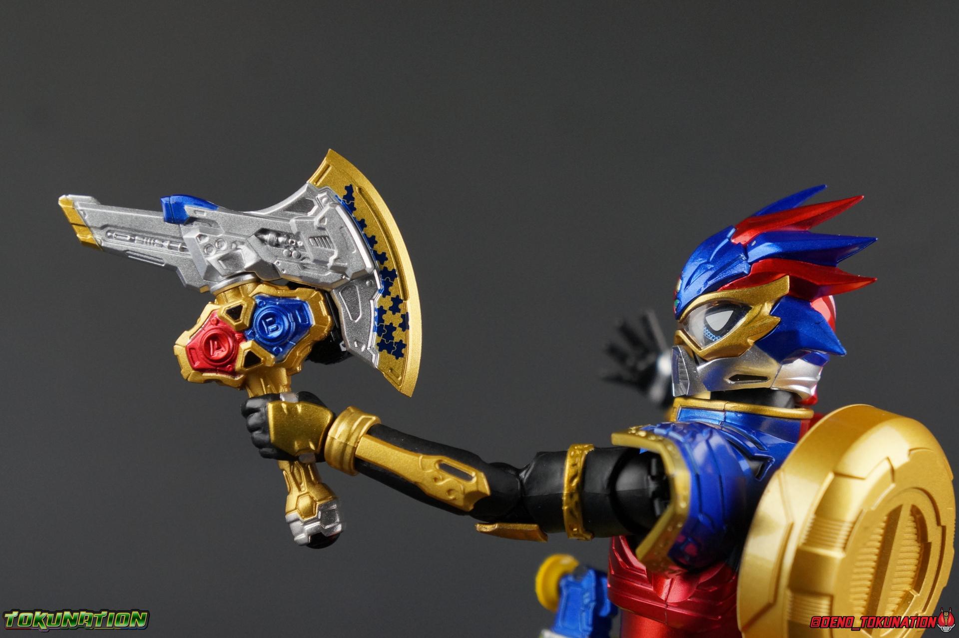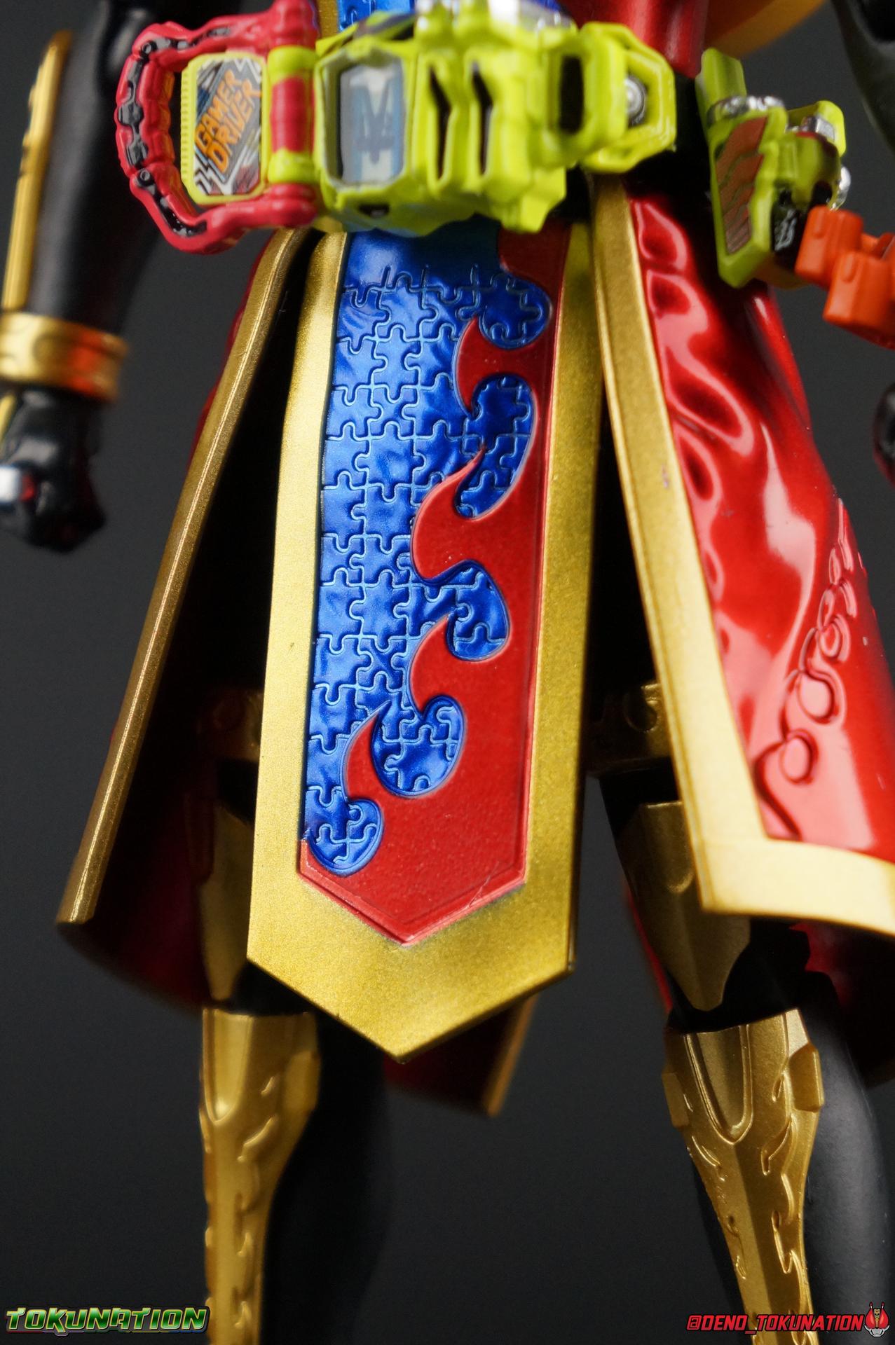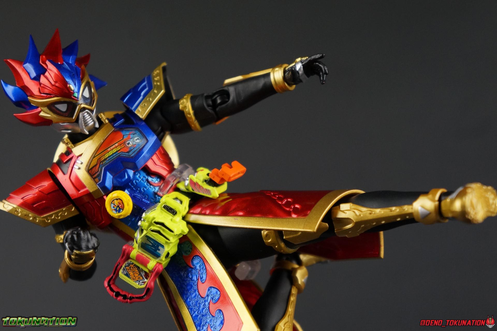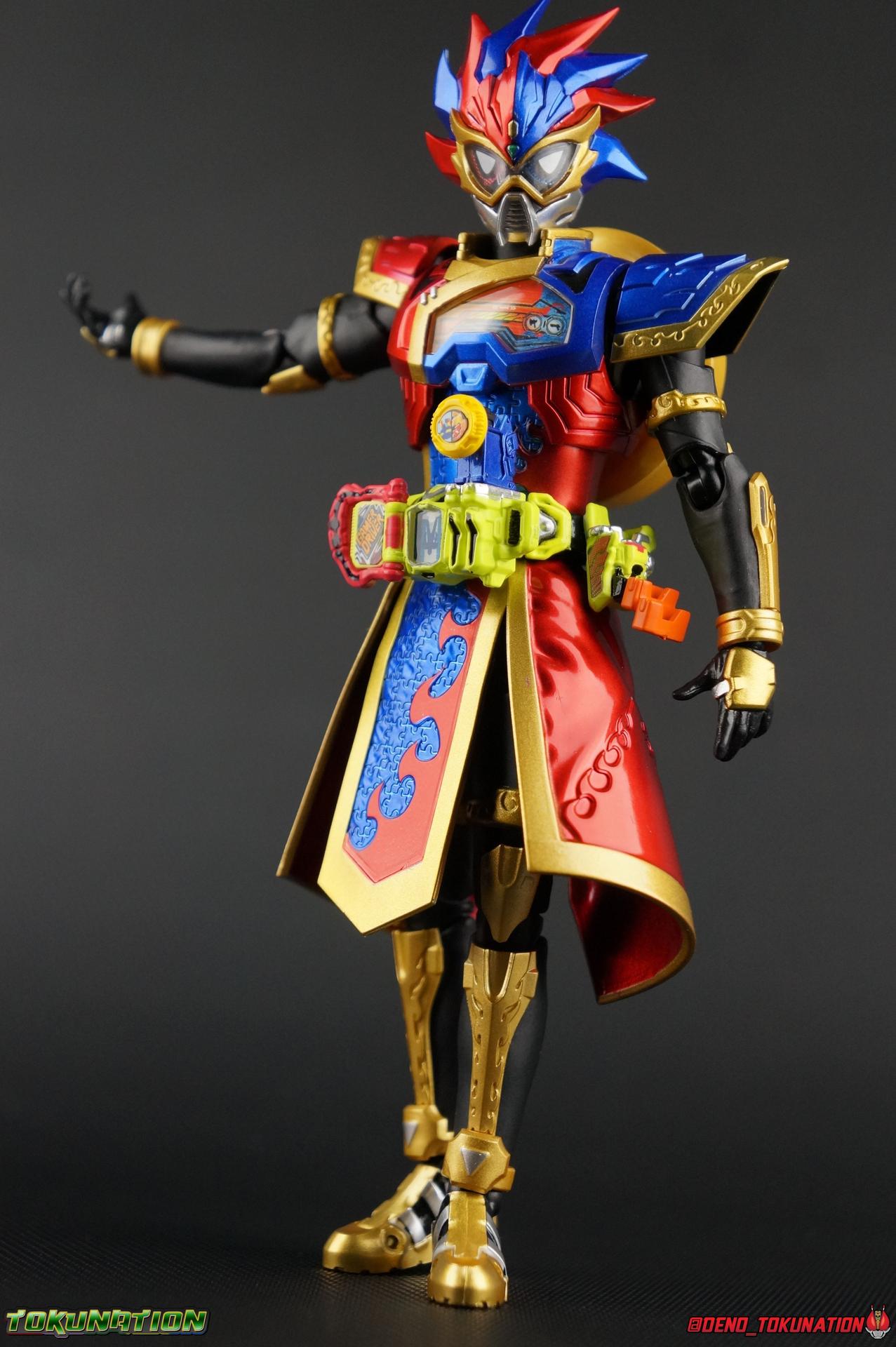 The Genius Gamer M or rather, the Bugster Parad whom'd given Emu those skills for years would eventually become Kamen Rider Para-DX. Using the Gashat Gear Dual he could alternate between two powerful Level 50 forms. In an attempt to stay relevant in Emu's life and surpass him, Parad would even go so far as to have himself be reprogrammed by Maximum Mighty X. This procedure allowed him to finally use a Gamer Driver like a human, in doing so giving him access to his most powerful form. Now we look at this pinnacle of strength & skill in our gallery of S.H. Figuarts Kamen rider Para-DX Perfect Knockout Gamer Level 99! Packaging As with previous releases, Para-DX Level 99's box is themed very similarly to the rest of the line. With it's bright, loud, packaging it's right at home with the rest of the Ex-Aid lineup. With no packaging window as all web exclusives are these days. As with the others the colors really pop and I like the character portrait on the front. And I'm always down for red/blue two-tone. That's about all there is to say on this one once again. Main Figure I'll be honest, it took me a long time to really care for Parad's Level 99 form in show. The design just did not work for me for some time. It felt very at odds with itself in my mind. But as the show continued it really became easier for me to digest the suit and I eventually really grew to like it overall. The figure won me over straight out of the box thanks to this. Para-DX Level 99 has a really strong and powerful sculpt that definitely showcases it's high level nature. This is a form that commands attention. And thanks to the 3-piece poseable skirt armor the figure can assume some really nice wide angled stances that are filled out a bit from these parts. Something about them helps contribute to the overall look of the figure and really bulks the lower body up quite nicely. Even if the legs themselves are still basically the Ex-Aid ones we've come to know so well, minor flaws and all, the whole package really works. And I absolutely LOVE the engraved puzzle piece design on the skirt. It's just top notch gorgeous as is the section on his abs. As with previous releases, the Gamer Driver is as always my favorite thing about these figures. This entire device is really intricately detailed for something at this scale. The Driver handle can still flip shut. Changes to this release include a new read out on the driver that pairs with this form. I'd never noticed before but it seems that the image is of Para-DX's Perfect Puzzle form. There's also the addition of the "dummy" Gashat Gear Dual, which is removable and compatible with all Gamer Drivers and double slotted Gashacon weapons. You can insert it into any other Gamer Driver with two open slots, much in the same way as Mighty Brothers XX or Snipe Level 50. At this scale I'm really impressed by the artwork on the front of the Gashat Gear Dual, it's a really good representation of the real deal. The Gashat Holster to the left of the Driver is empty. The upper body of the figure has a lot going on. Particularly on Parad's back. This is where the large Dial representing the Gashat Gear Dual sits. While pretty large this part doesn't detract from the design or hinder Parad's articulation. The chest detailing on the figure is also quite nice. As most always seems to be the case for Ex-Aid Riders, Para-DX has a nice crisp clear Rider Gauge in his chest as well. Honestly there's just a ton of great detailing on this fella. There's a lot of ornate engraving style details on the armor. The puzzle pieces I mentioned above are the best, but I love the sort of gold engraving done on the legs arms and shoulder pads. The shoulder pads while I'm on them, are a bit of a bother. The keep the figure from fully lifting his arms up perpendicular to the body. You can always rotate the shoulders back and angle things out as you need, but I'm always bothered when figures can't fully extend their arms out to the sides. That brings us to head, where the biggest fault of this release lies. Unfortunately the head was manufactured pretty inaccurately. The eyes within the visor are a bit misshapen compared to the actual show prop, but the bigger issue is their placement. They're supposed to touch the top edge of the visor and come down from there. Instead the eyes are almost centered within the visor. The look is both very off-putting and rather disappointing. The paint work on the rest of the helmet is brilliant but the issue with the eyes is just so irksome that it's difficult to enjoy it beyond that. The flared out alternating "hair" is very well done and definitely makes Para-DX seem just a 'tad' bit like a Yu-Gi-Oh character. Accessories Para-DX comes with pretty much all he really could. Even if it feels a bit on the lite side. 3 - Sets of hands. 2 splayed open hands, two more relaxed open hands, and two weapon holding hands. Nothing unique to speak of but enough hands to get the job done in most cases. 1 - Gashacon Parabladegun. This strange two form weapon has never felt like nearly as intuitive of a design as the Gashacon Breaker to me. And it feels just a bit awkward in toy form as well. It's detailed quite nicely so it at least looks good in that respect. But I almost do feel it's a little over-sized, maybe? The grip is just a hint too thick as well. It doesn't fit quite as well in Parad's hand as I'd like. To switch between the Ax & Gun modes you just rotate the blade back and forth. It's a little bit loose though. There's also a slot to accommodate any double sized Gashat to replicate a Critical Finish. I would really really hope that at some point in the future, an accurate head would be included with another Ex-Aid figuart, in much the same way that the original Accel figuart eventually got a new head with Booster. Para-DX's head is just kind of unforgivably off and we need a replacement for it ASAP. Toss it in with Perfect Puzzle or Knockout Fighter when and if those come out. Somethi