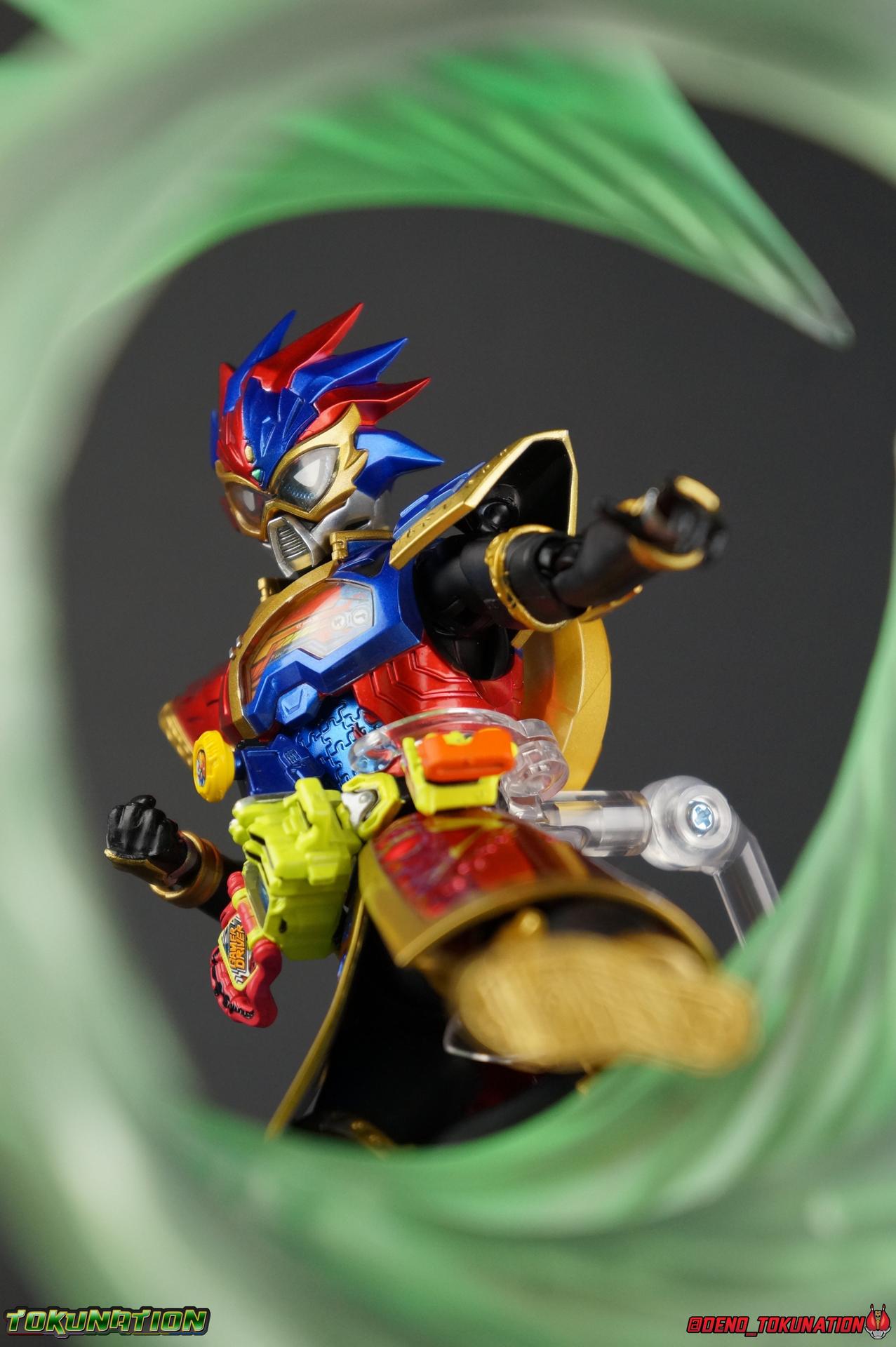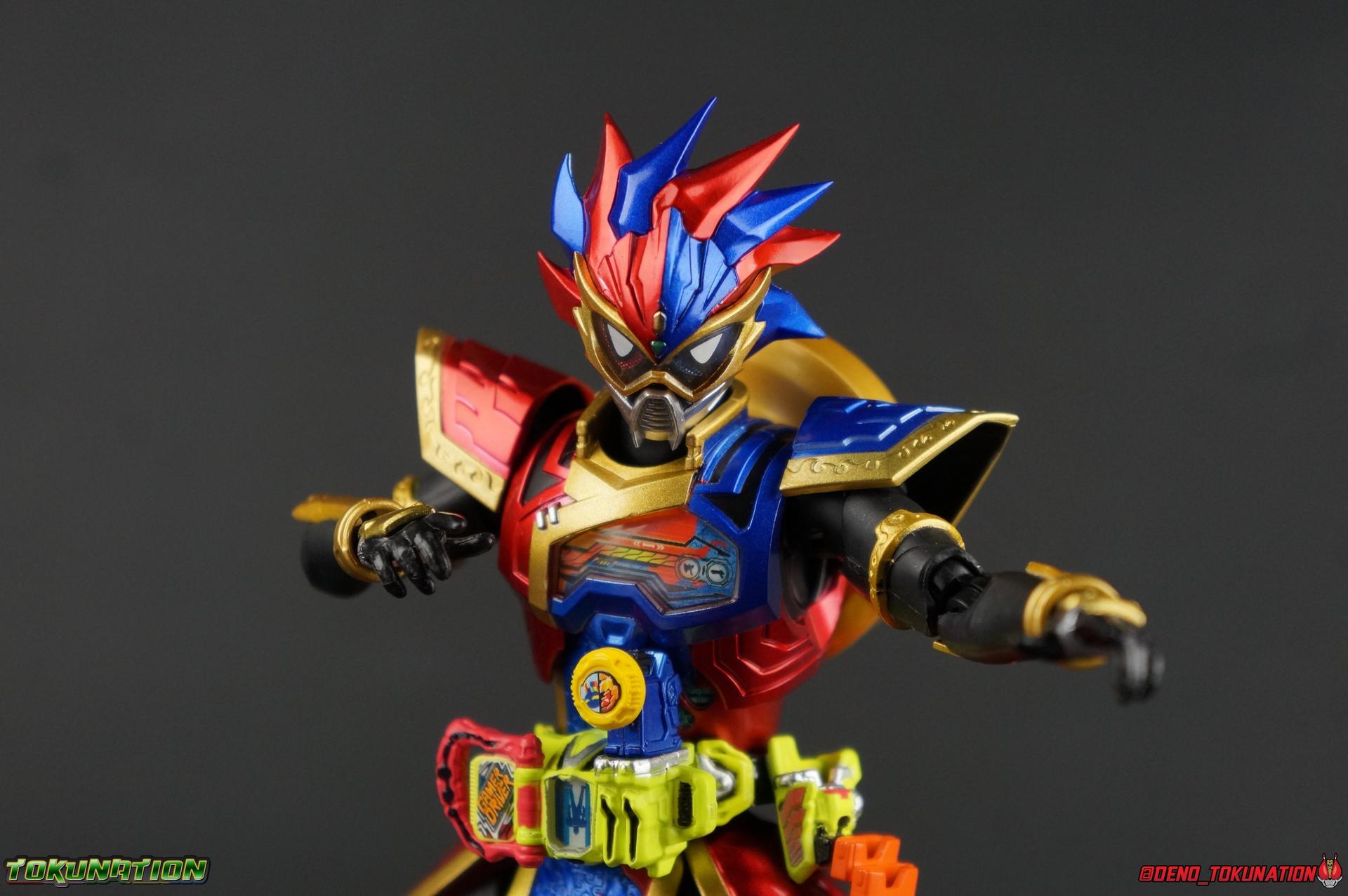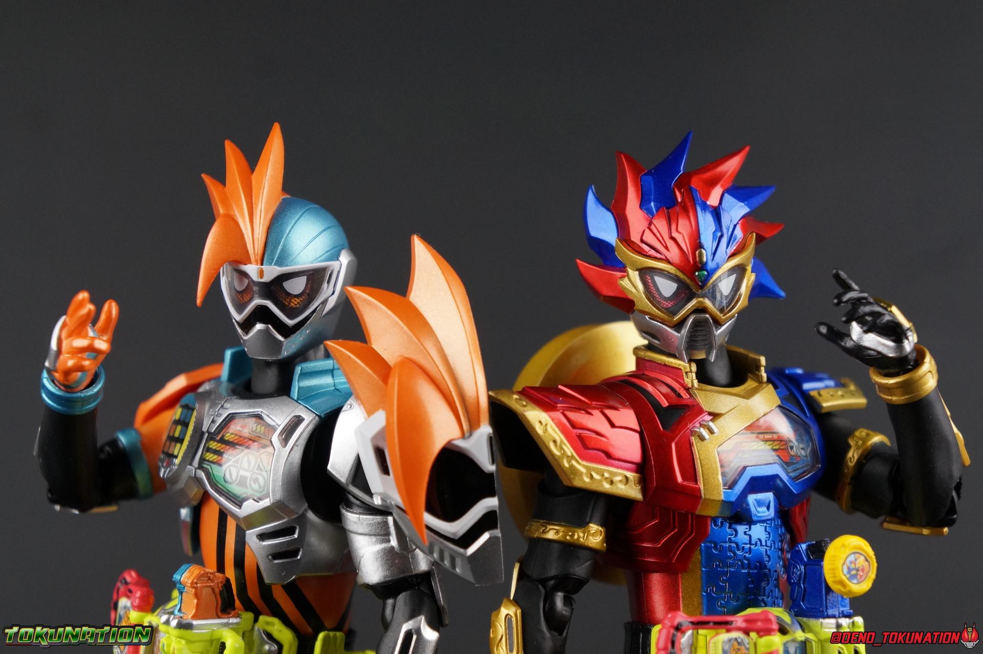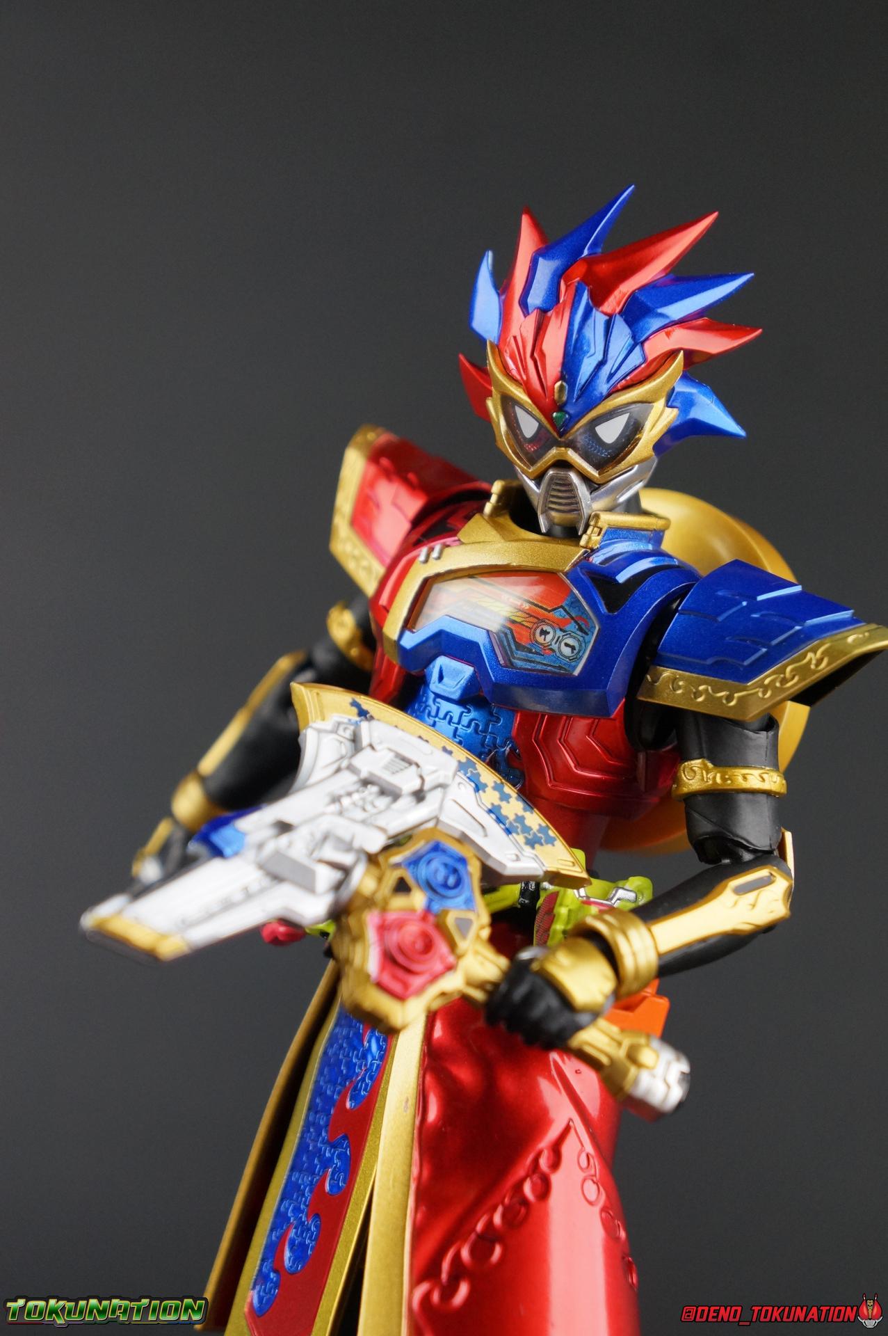 The Genius Gamer M or rather, the Bugster Parad whom'd given Emu those skills for years would eventually become Kamen Rider Para-DX. Using the Gashat Gear Dual he could alternate between two powerful Level 50 forms. In an attempt to stay relevant in Emu's life and surpass him, Parad would even go so far as to have himself be reprogrammed by Maximum Mighty X. This procedure allowed him to finally use a Gamer Driver like a human, in doing so giving him access to his most powerful form. Now we look at this pinnacle of strength & skill in our gallery of S.H. Figuarts Kamen rider Para-DX Perfect Knockout Gamer Level 99! Packaging As with previous releases, Para-DX Level 99's box is themed very similarly to the rest of the line. With it's bright, loud, packaging it's right at home with the rest of the Ex-Aid lineup. With no packaging window as all web exclusives are these days. As with the others the colors really pop and I like the character portrait on the front. And I'm always down for red/blue two-tone. That's about all there is to say on this one once again. Main Figure I'll be honest, it took me a long time to really care for Parad's Level 99 form in show. The design just did not work for me for some time. It felt very at odds with itself in my mind. But as the show continued it really became easier for me to digest the suit and I eventually really grew to like it overall. The figure won me over straight out of the box thanks to this. Para-DX Level 99 has a really strong and powerful sculpt that definitely showcases it's high level nature. This is a form that commands attention. And thanks to the 3-piece poseable skirt armor the figure can assume some really nice wide angled stances that are filled out a bit from these parts. Something about them helps contribute to the overall look of the figure and really bulks the lower body up quite nicely. Even if the legs themselves are still basically the Ex-Aid ones we've come to know so well, minor flaws and all, the whole package really works. And I absolutely LOVE the engraved puzzle piece design on the skirt. It's just top notch gorgeous as is the section on his abs. As with previous releases, the Gamer Driver is as always my favorite thing about these figures. This entire device is really intricately detailed for something at this scale. The Driver handle can still flip shut. Changes to this release include a new read out on the driver that pairs with this form. I'd never noticed before but it seems that the image is of Para-DX's Perfect Puzzle form. There's also the addition of the "dummy" Gashat Gear Dual, which is removable and compatible with all Gamer Drivers and double slotted Gashacon weapons. You can insert it into any other Gamer Driver with two open slots, much in the same way as Mighty Brothers XX or Snipe Level 50. At this scale I'm really impressed by the artwork on the front of the Gashat Gear Dual, it's a really good representation of the real deal. The Gashat Holster to the left of the Driver is empty. The upper body of the figure has a lot going on. Particularly on Parad's back. This is where the large Dial representing the Gashat Gear Dual sits. While pretty large this part doesn't detract from the design or hinder Parad's articulation. The chest detailing on the figure is also quite nice. As most always seems to be the case for Ex-Aid Riders, Para-DX has a nice crisp clear Rider Gauge in his chest as well. Honestly there's just a ton of great detailing on this fella. There's a lot of ornate engraving style details on the armor. The puzzle pieces I mentioned above are the best, but I love the sort of gold engraving done on the legs arms and shoulder pads. The shoulder pads while I'm on them, are a bit of a bother. The keep the figure from fully lifting his arms up perpendicular to the body. You can always rotate the shoulders back and angle things out as you need, but I'm always bothered when figures can't fully extend their arms out to the sides. That brings us to head, where the biggest fault of this release lies. Unfortunately the head was manufactured pretty inaccurately. The eyes within the visor are a bit misshapen compared to the actual show prop, but the bigger issue is their placement. They're supposed to touch the top edge of the visor and come down from there. Instead the eyes are almost centered within the visor. The look is both very off-putting and rather disappointing. The paint work on the rest of the helmet is brilliant but the issue with the eyes is just so irksome that it's difficult to enjoy it beyond that. The flared out alternating "hair" is very well done and definitely makes Para-DX seem just a 'tad' bit like a Yu-Gi-Oh character. Accessories Para-DX comes with pretty much all he really could. Even if it feels a bit on the lite side. 3 - Sets of hands. 2 splayed open hands, two more relaxed open hands, and two weapon holding hands. Nothing unique to speak of but enough hands to get the job done in most cases. 1 - Gashacon Parabladegun. This strange two form weapon has never felt like nearly as intuitive of a design as the Gashacon Breaker to me. And it feels just a bit awkward in toy form as well. It's detailed quite nicely so it at least looks good in that respect. But I almost do feel it's a little over-sized, maybe? The grip is just a hint too thick as well. It doesn't fit quite as well in Parad's hand as I'd like. To switch between the Ax & Gun modes you just rotate the blade back and forth. It's a little bit loose though. There's also a slot to accommodate any double sized Gashat to replicate a Critical Finish. I would really really hope that at some point in the future, an accurate head would be included with another Ex-Aid figuart, in much the same way that the original Accel figuart eventually got a new head with Booster. Para-DX's head is just kind of unforgivably off and we need a replacement for it ASAP. Toss it in with Perfect Puzzle or Knockout Fighter when and if those come out. Somethi