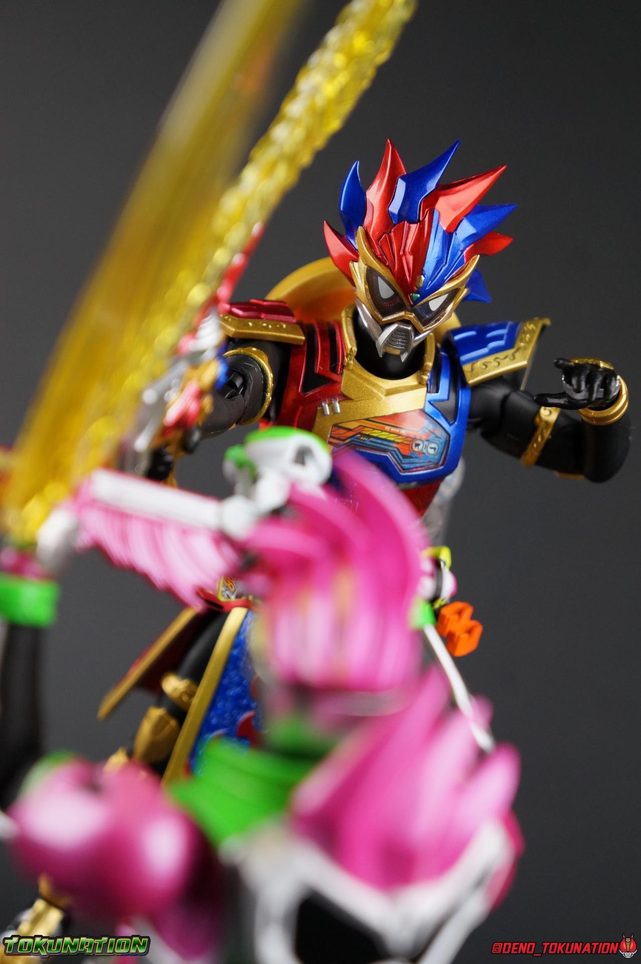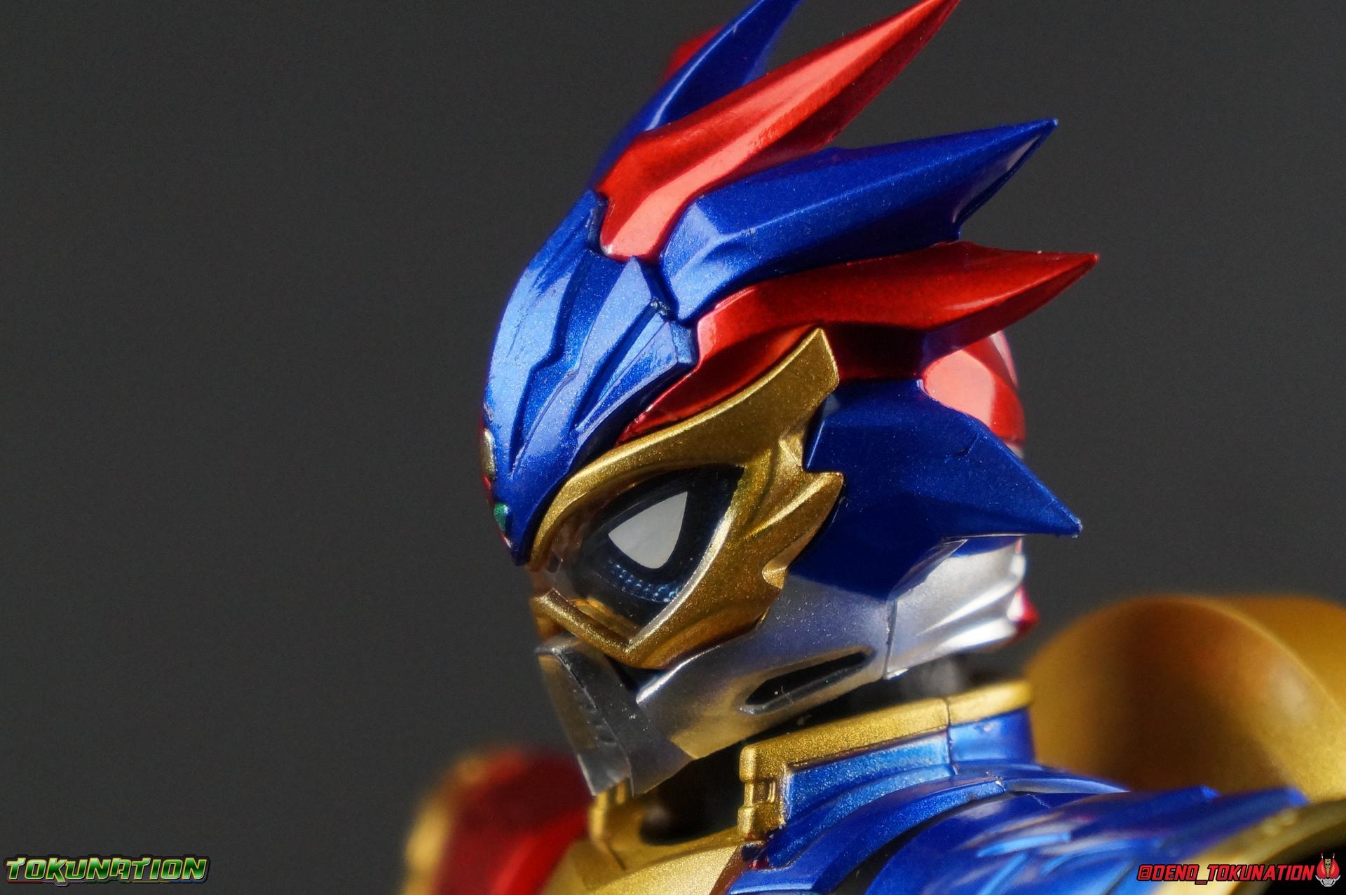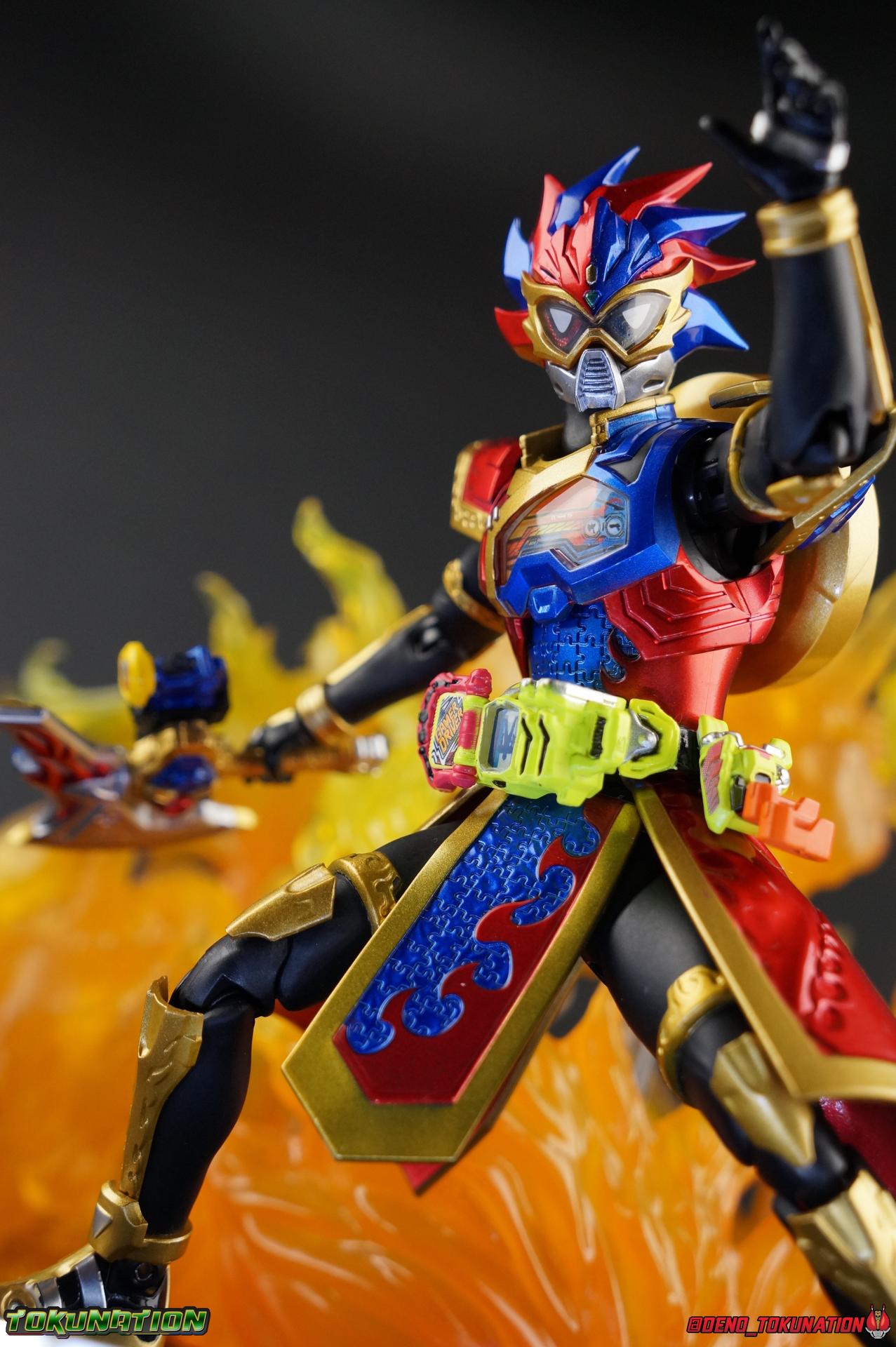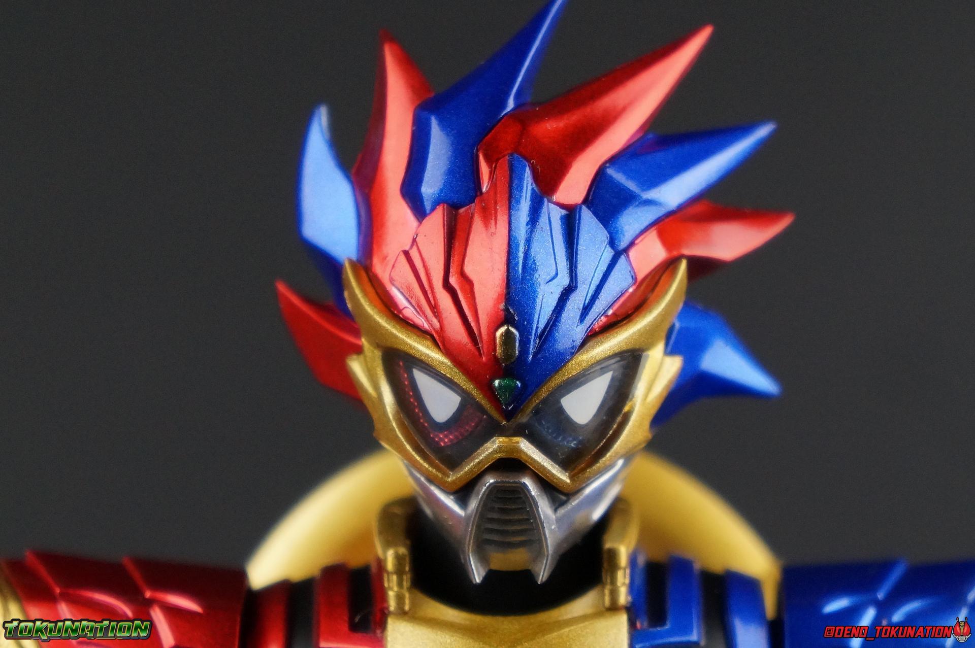 The Genius Gamer M or rather, the Bugster Parad whom'd given Emu those skills for years would eventually become Kamen Rider Para-DX. Using the Gashat Gear Dual he could alternate between two powerful Level 50 forms. In an attempt to stay relevant in Emu's life and surpass him, Parad would even go so far as to have himself be reprogrammed by Maximum Mighty X. This procedure allowed him to finally use a Gamer Driver like a human, in doing so giving him access to his most powerful form. Now we look at this pinnacle of strength & skill in our gallery of S.H. Figuarts Kamen rider Para-DX Perfect Knockout Gamer Level 99! Packaging As with previous releases, Para-DX Level 99's box is themed very similarly to the rest of the line. With it's bright, loud, packaging it's right at home with the rest of the Ex-Aid lineup. With no packaging window as all web exclusives are these days. As with the others the colors really pop and I like the character portrait on the front. And I'm always down for red/blue two-tone. That's about all there is to say on this one once again. Main Figure I'll be honest, it took me a long time to really care for Parad's Level 99 form in show. The design just did not work for me for some time. It felt very at odds with itself in my mind. But as the show continued it really became easier for me to digest the suit and I eventually really grew to like it overall. The figure won me over straight out of the box thanks to this. Para-DX Level 99 has a really strong and powerful sculpt that definitely showcases it's high level nature. This is a form that commands attention. And thanks to the 3-piece poseable skirt armor the figure can assume some really nice wide angled stances that are filled out a bit from these parts. Something about them helps contribute to the overall look of the figure and really bulks the lower body up quite nicely. Even if the legs themselves are still basically the Ex-Aid ones we've come to know so well, minor flaws and all, the whole package really works. And I absolutely LOVE the engraved puzzle piece design on the skirt. It's just top notch gorgeous as is the section on his abs. As with previous releases, the Gamer Driver is as always my favorite thing about these figures. This entire device is really intricately detailed for something at this scale. The Driver handle can still flip shut. Changes to this release include a new read out on the driver that pairs with this form. I'd never noticed before but it seems that the image is of Para-DX's Perfect Puzzle form. There's also the addition of the "dummy" Gashat Gear Dual, which is removable and compatible with all Gamer Drivers and double slotted Gashacon weapons. You can insert it into any other Gamer Driver with two open slots, much in the same way as Mighty Brothers XX or Snipe Level 50. At this scale I'm really impressed by the artwork on the front of the Gashat Gear Dual, it's a really good representation of the real deal. The Gashat Holster to the left of the Driver is empty. The upper body of the figure has a lot going on. Particularly on Parad's back. This is where the large Dial representing the Gashat Gear Dual sits. While pretty large this part doesn't detract from the design or hinder Parad's articulation. The chest detailing on the figure is also quite nice. As most always seems to be the case for Ex-Aid Riders, Para-DX has a nice crisp clear Rider Gauge in his chest as well. Honestly there's just a ton of great detailing on this fella. There's a lot of ornate engraving style details on the armor. The puzzle pieces I mentioned above are the best, but I love the sort of gold engraving done on the legs arms and shoulder pads. The shoulder pads while I'm on them, are a bit of a bother. The keep the figure from fully lifting his arms up perpendicular to the body. You can always rotate the shoulders back and angle things out as you need, but I'm always bothered when figures can't fully extend their arms out to the sides. That brings us to head, where the biggest fault of this release lies. Unfortunately the head was manufactured pretty inaccurately. The eyes within the visor are a bit misshapen compared to the actual show prop, but the bigger issue is their placement. They're supposed to touch the top edge of the visor and come down from there. Instead the eyes are almost centered within the visor. The look is both very off-putting and rather disappointing. The paint work on the rest of the helmet is brilliant but the issue with the eyes is just so irksome that it's difficult to enjoy it beyond that. The flared out alternating "hair" is very well done and definitely makes Para-DX seem just a 'tad' bit like a Yu-Gi-Oh character. Accessories Para-DX comes with pretty much all he really could. Even if it feels a bit on the lite side. 3 - Sets of hands. 2 splayed open hands, two more relaxed open hands, and two weapon holding hands. Nothing unique to speak of but enough hands to get the job done in most cases. 1 - Gashacon Parabladegun. This strange two form weapon has never felt like nearly as intuitive of a design as the Gashacon Breaker to me. And it feels just a bit awkward in toy form as well. It's detailed quite nicely so it at least looks good in that respect. But I almost do feel it's a little over-sized, maybe? The grip is just a hint too thick as well. It doesn't fit quite as well in Parad's hand as I'd like. To switch between the Ax & Gun modes you just rotate the blade back and forth. It's a little bit loose though. There's also a slot to accommodate any double sized Gashat to replicate a Critical Finish. I would really really hope that at some point in the future, an accurate head would be included with another Ex-Aid figuart, in much the same way that the original Accel figuart eventually got a new head with Booster. Para-DX's head is just kind of unforgivably off and we need a replacement for it ASAP. Toss it in with Perfect Puzzle or Knockout Fighter when and if those come out. Somethi