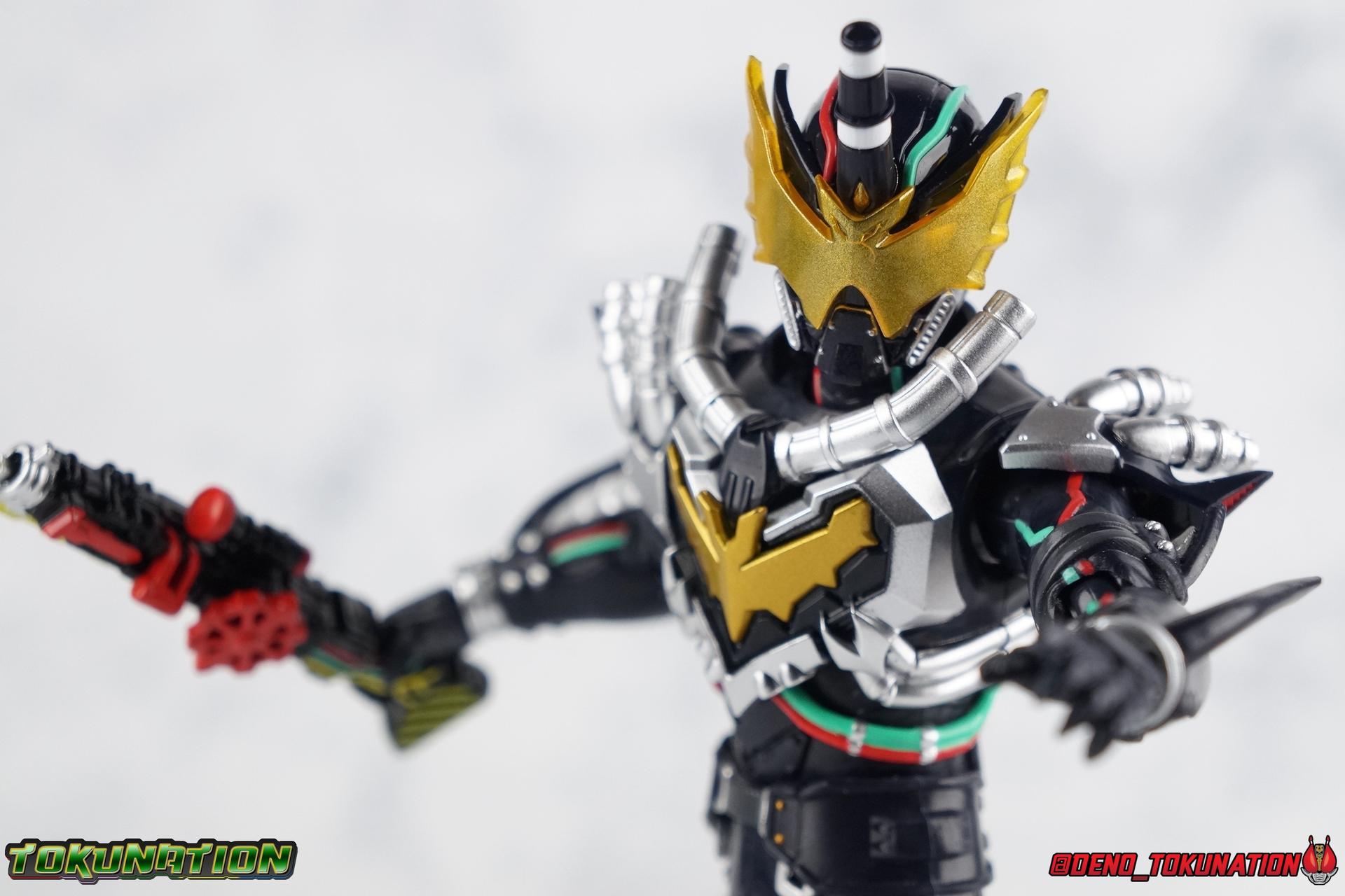 Hearkening back to Mashin Chaser from Kamen Rider Drive, Night Rogue & his frenemy Blood Stalk are both pseudo-rider like entities. They use a device to transform into an armored state, but aren't riders per se, though we obviously know that Night Rogue does go on to become Kamen Rider Rogue. The Transteam System Night Rogue's powers are based on is similar to the Rider System used by Sento & Banjou, but with one flaw. It can't evolve. It's Hazard Level can't increase. As our heroes grow, undoubtedly so will our villains. For now though, it's time to take a look at the entry level power that deputy prime-minister Gentoku Himuro began the series possessing with S.H. Figuarts Night Rogue! Packaging Only the 2nd release in the Build line, Night Rogue of course shares a similar style box to our hero. Night Rogue just swaps the red and blue for a bit more drab yellow and black. The stock photos of course look great and if I hadn't already pre-ordered the figure on princicple alone, the stock shots convince me. Main Figure One thing I want to get out straight away is in regards to the colors on this figure. Night Rogue went through some minor changes in show before the suit was discarded (for now). The original suit used for his first 3 or 4 appearances consisted of black armor overlaid on a black spandex under suit. Beyond these initial appearances the under suit was changed to a medium brown color. Now the colors represented by this figuart, are kind of different. I know what it looks like in stock photos, and what it might look like in the images you've seen online. What the figure actually looks like in hand is a very very, very dark blue. It's not really totally black, but more of a deep dark blue. It's kind of weird as this color isn't one that comes across in either version of the show suit. The type of plastic use seems like a dark grey & blue mixture, so I'm not sure that the way it looks is entirely intentional, but it is kind of odd. The blueness comes across mostly in the legs and waist area, the upper body definitely has more of the proper black looks to it. Now, with that out of the way, this figure looks good. Damn good. I see people variously complaining about small inaccuracies of the design. People have also said that Blood Stalk looks odd in stock photos. Look, these two are the same mold and handling Night Rogue in person, I see no reason why Blood Stalk will have issues. Night Rogue was a great suit design anyway, and it's actually translated quite well to figure form. One of the few flaws I've found with it personally, is the way in which the ankles are designed. Because of the way the cuff of the shin armor comes down around them, you do lose a small portion of movement. But as you can see in this gallery, that doesn't make it difficult to pose him. I was a bit worried about the way the hips and thigh swivels may not be useful as well just because of his bulk. I'm happy to report and show you that Night Rogue can cross his legs and sit in any number of chair varieties as intended. This is the best! There's plenty enough to work with in the legs to get Rogue down in a one knee pose and that's the standard bearer for quality as far as I'm concerned. Also I just want to mention how really cool and well defined all of the details on the lower body are. At first glance they're easy to miss because of the uniform color scheme. But ever rivet, zipper, strap, and seam is present that should be, and it looks very good. You mighty reasonably be thinking that the upper body would suffer from the bulk of the chest armor as well. In some bizarre way though Tamashii has managed to give Night Rogue and even more dynamic upper body than Build has. It's pretty wild that ab section has as much free rotation from the chest as it does. The chest can also arch way back and move quite a bit forward. You can contort his upper body in such a way, along with the neck joint (as seen in image #76) that the head isn't even in the same vertical line as the rest of the body! This is a crazy good kind of articulation that I love. The detailing around the bat emblem, silver lines, and the electrical red & green cables is just really well done. The whole upper body is kind of perfect. Why couldn't Build himself have been this good. The arms do leave just a little to be desired however. The bicep swivel is a bit tight and somewhat limited because of the shape of it's design. The elbow can hit about a 90 degree angle so that's all good as far as I'm concerned. The biggest issue with it is the wrists. Basically once you attach a hand, it's totally flush with the wrist cuff. So you lose a bit of the wrists joints built in swivel. You can still get some play out of them, but it's imperfect. The only other thing of note is the shoulder pads, which you'd think would really inhibit movement. But they've been designed in such a way with ball joints to move them down the shoulder some, that you don't lose much there at all. Finally that brings us to the head. I've seen a number of people both before & after this figure was released who thought it was inaccurate. I don't really see what they see. I hear complaints that you can't see Night Rogues eyes under the visor. I'm happy to report that they are totally visible from most angles and in proper lighting. The effect is just fantastic, they truly look great. The shape of the heads seems on point to me as well so again I don't really get the complaints I see intermittently. This is an excellent sculpt with very good detailing. Overall this is just a really fantastic figure. It's just got true presence in hand. If you don't believe me then check out the photos below. Accessories Unlike Build, Night Rogue at least comes with his primary weapon: 1 - Transteam Rifle. The trademark weapon used by both Night Rogue & Blood Stalk, this multi-form weapon is actually real well done in toy form. As the full Transteam Rifle it's a nice long range weapon that looks good and hef