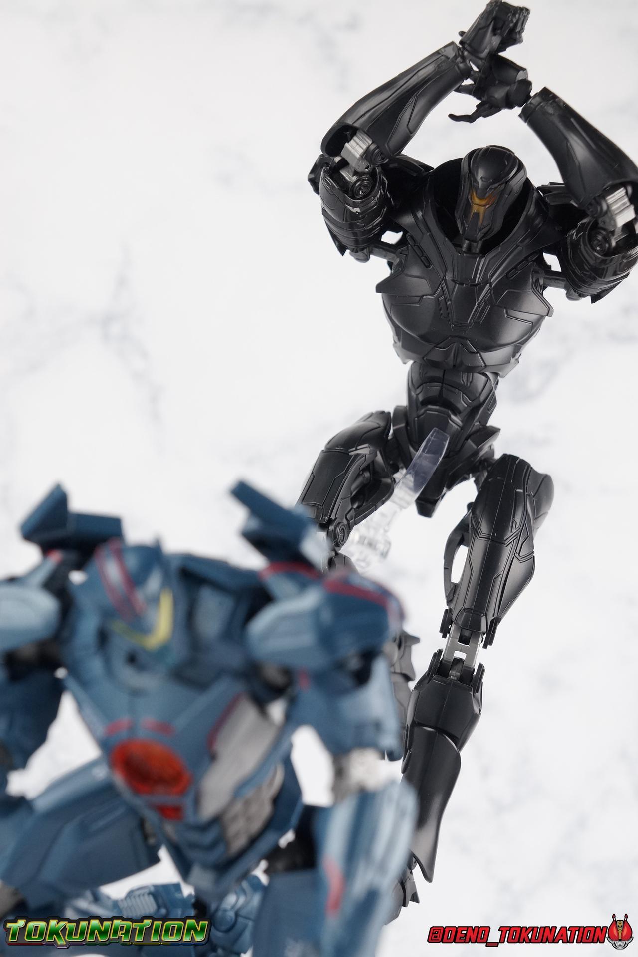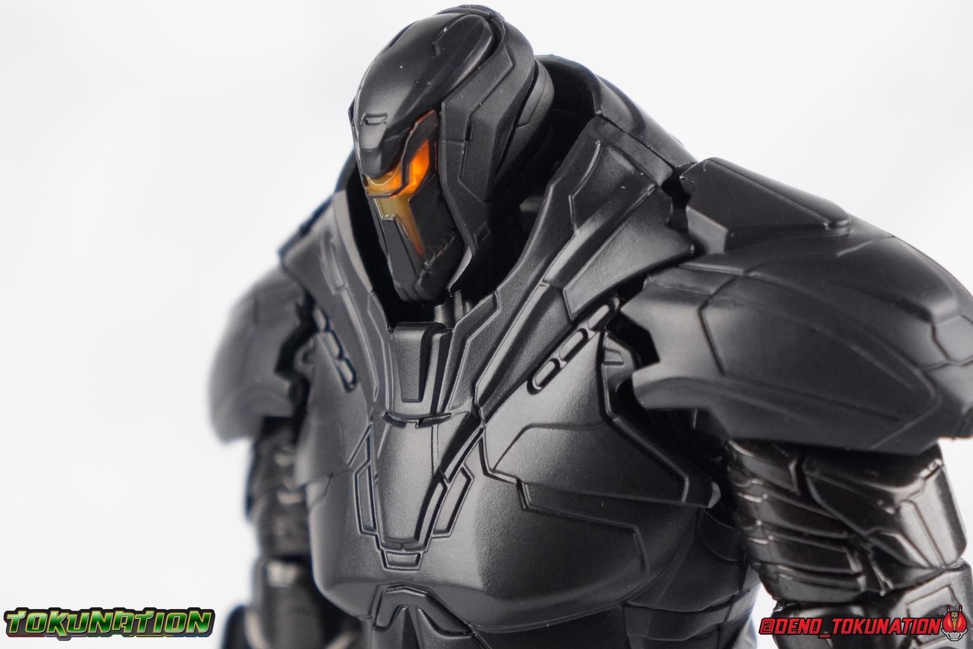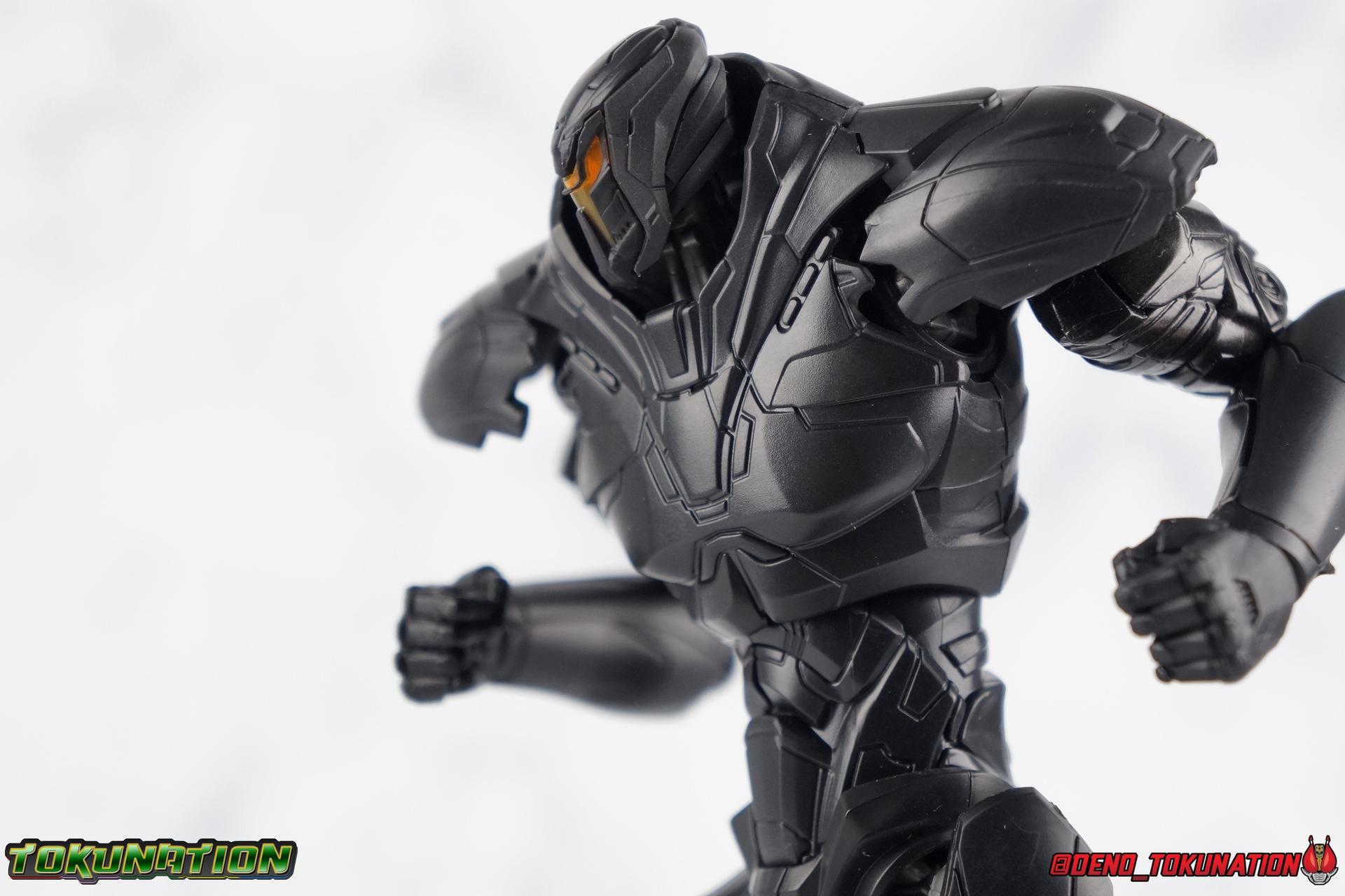 In the years' long war against the Precursors & their weapons of mass destruction, the Kaiju, the Pan Pacific Defense Corps has continued to develop newer and better Jaegers. And while a Drone program is also under development by Shao Industries to eventually replace the PPDC & it's pilots, the occasional rogue element does arise. Enter: Obsidian Fury. A mysterious Jaeger which rose from the ocean to battle Gipsy Avenger. Equipped with advanced weaponry and capable of entirely inhuman movement, this monstrous mech is a force for our heroes to reckon with. Can Jake & Nate uncover the secret truth of Obsidian Fury? You'll have to watch Pacific Rim Uprising to find out! ** Beware, there be spoilers ahead! If you'd rather not be spoiled on some minor elements of Pacific Rim Uprising then I wouldn't read my review too thoroughly. Packaging As I mentioned with Gipsy Avenger, Pacific Rim Robot Spirits have gone in a totally new direction this toyline hasn't really done before in terms of packaging. Each figure comes in a box with a punched tag to hang it on a retail store hook. It's definitely a new thing for Robot Spirits/Damashii to so openly market these figure at mass market retail. But perhaps their appeal and simultaneous release in both Western & Asian markets contributed to this decision? In either case these boxes are very unique and totally their own thing within the line. Even in regards to how slim and tall they are. I really like this new direction. Obsidian Fury is also the first, and so far only, evil Jaeger in the line so his packaging get's some extra red accenting that the others don't. Main Figure Literally and figuratively, Obsidian Fury is an entirely different beast from Gipsy Avenger. Gipsy served as a modernized update, a streamlined version, of the Gipsy Danger. Obsidian Fury isn't really bound by any such nostalgia and is therefore a bit more free to embrace it's alien nature. As a figure, this means that Obsidian is incredibly poseable and has very few of the limitations the other figures in the line have had. Like I said, Obsidian Fury is quite alien, and a lot of the design choices for the figure reflect it's inhuman nature. Much like Gipsy, Obsidian has really nice ball jointed ankles with plenty of range in all directions. They can even spin a full 360 degrees. I really really like the small details on this guy that set him apart from the more human like Jaegers, like his two-toed feet that remind me of like a mechanoid ninja. By far the thing that sells the alien-ness of Fury the most is the knee joint. It's designed in such a way that you can purposefully hyper extend it back, so far that the calfs wind up in an entirely different line of sight from the rest of the body when you look from the side. This kind of free movement makes for some insane posing potential. This guy cans trike a pose, and hold it. The waist & hip area is designed in much the same way as Gipsy. Each thigh has a rotating section within it attached to the hip ball joint. These rotating sections let you turn the leg in or out, but they themselves are also attached to another balljoint down within the thigh meaning they have even more play to them. Double jointed thighs are a welcome feature. The hip balljoints are aslo attached to the interior of the waist on a shared gray panel. One which move's independently of the black waist/crotch itself. This entire assembly can swing in and out of both sides of the waist allowing for maximum movement. Lining things back up perfectly can be a pain, but all of these features add up to some incredible legs as whole. The torso is also similarly designed to Gipsy. The lower half is one piece connected to the waist so there's no joint to make it move. Only the upper body floats on a ball joint. But thanks to how slender the lower half is, you can literally spin the upper body completely around, a full 360 degrees. The forward & back movement leaves a bit to be desired, but I'm not terribly displeased. As with Gipsy, Fury has some pretty poorly designed shoulders. In this case much more poorly. Underneath those giant shoulder pads is a very spindly looking balljoint that sticks out and attaches to the bicep. Weirdly enough, there's no true bicep swivel in the arm, but rather right above the bicep where it attaches to the balljoint, is a swivel. This can make using the arms a bit more awkward than I'd like. I'm assuming the joint was placed there because the giant shoulder pads make it look like there's more mass to the upper arm than actually exists. The movie's CG model could certainly make this work, but in physical toy form it's a bit more difficult to cheat that. The elbows are fairly standard like Gipsy, and the wrist joints are just the same. Though Obsidian's end to pull the joint completely out every time you change hands. And those big shoulder pads I keep mentioning? They're on some weird peg joint that lies on the tip of the shoulder blade. You would think this means they could rotate up and back to free up the arms some, but they actually don't function very well at all. This brings us to that beady little head of Obsidian Fury's. Set down a bit more into the shoulders of the figure it actually has a bit more range than I'd thought. Double jointed like Gipsy, Obsidian can angle his out to the sides quite nicely and stick his head out and forward menacingly as well. The only issue being backward movement where you always run into the neck cuff. Overall this is an exceptionally well articulated figure. But the lack of the neon orange light details that the movie model has can make this guy just blend together visually. There's a ton of uniquely sculpted detail everywhere that hasn't been painted properly and thus makes the figure seem really bland. Accessories Like Gipsy Avenger, Obsidian Fury comes with the bare minimum of what he needs, but thanks to the higher price point, it feels a bit less like a good deal. 2 - additional hands. Just a pair of