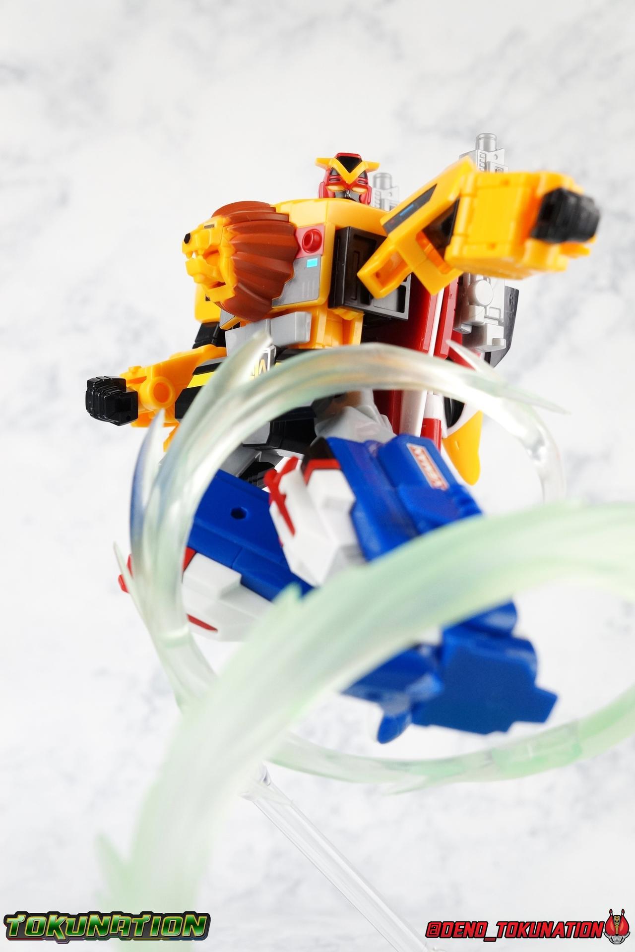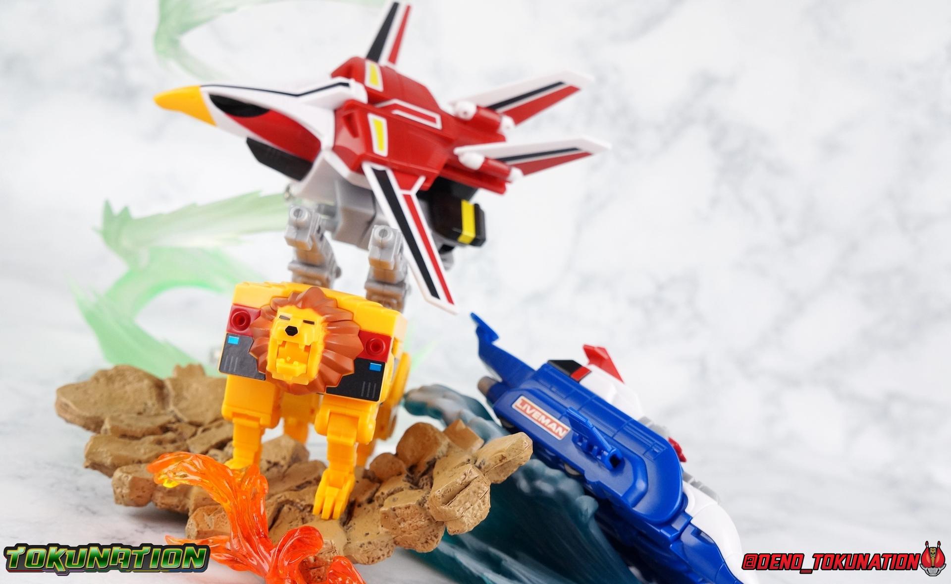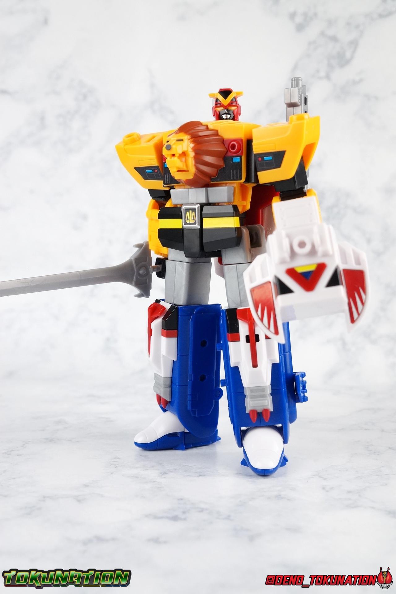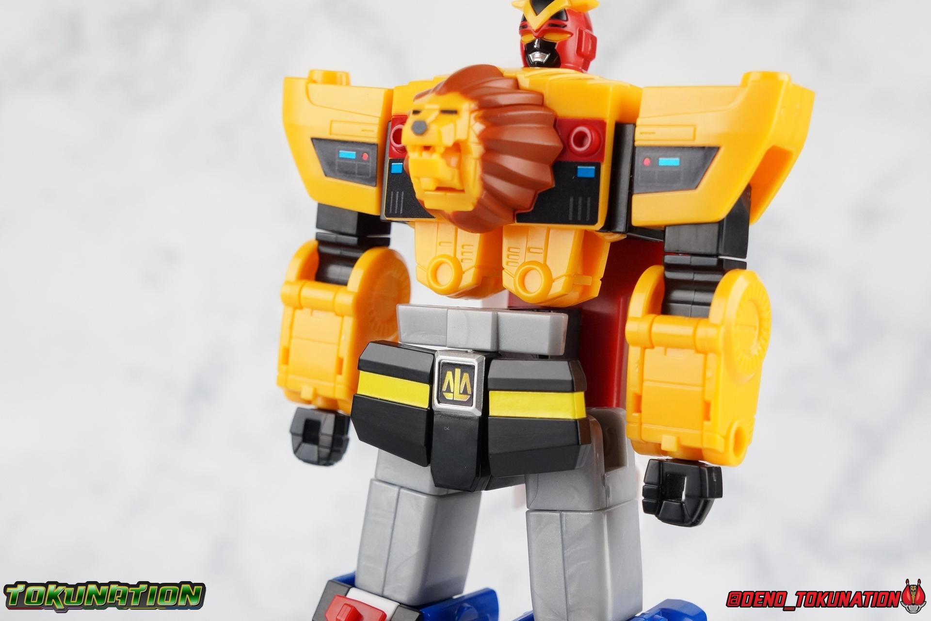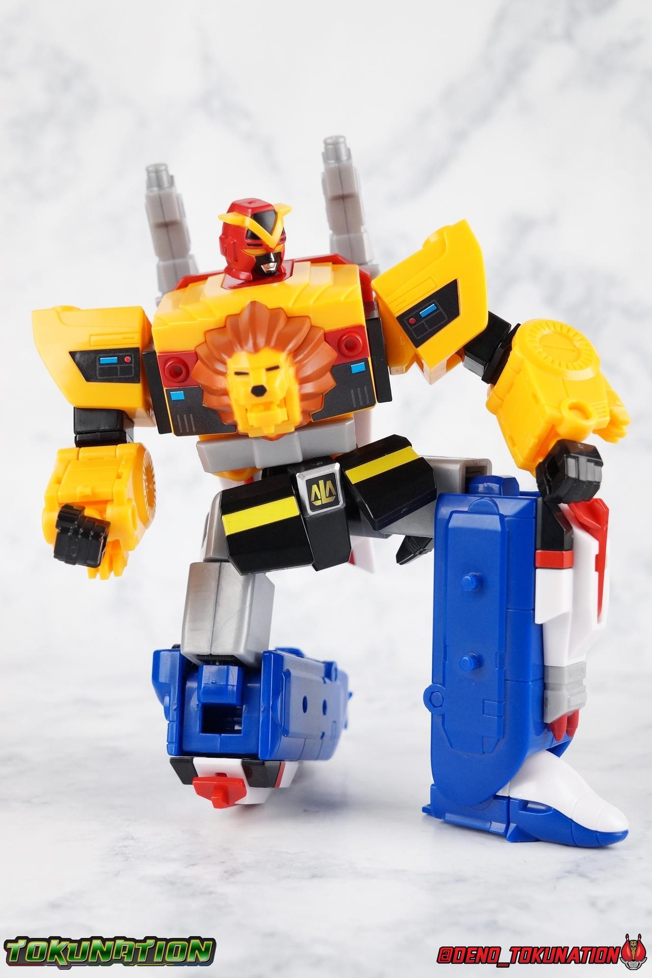 Now for the main event, Live Dimension! By far the greatest strength of the Super Minipla line is it's ability to recreate combined robots so excellently. You get a great functional toy with some fantastic proportions and accessories. Unlike many minipla of the past, you can also get around most part swapping for the transformations. In Live Robo's case, a mere 3 parts are removed and totally set aside for this transformation. Only the plugs that cover the knee plugs on Sky Machine and the tail from Land Machine are left over in the end. I've included step by step photos to show you how to get from each individual machine into the parts you need. While I think those images can speak for themselves I do want to mention a couple of fascinating things about the combination that I love. First, the way the lower half of Sky Machine slides down to accommodate the Land Machine chest, then slides back up to lock it in place and hide Land Machine's front legs just blows my mind. Likewise the way in which Land Machine's legs rotate out on that shared black joint within the chest is just incredible to me. The way it moves is just so fluid it's hard to believe this is a minipla. Once you've assembled Live Robo, you have one hell of a fun little figure. Without getting into the weapons yet, Live Robo is a great and poseable action figure in it's own right. The feet have side tilting joints thanks to how the feet are built, while the ankles can tilt forward and back too. Because of the nature of joints in the thighs we also get a nice knee joint connected to Aqua Machine that extends out it's main body. Then there's a mid-thigh swivel as well as a rotating hip joint. Now the hips are TIGHT, scary forceful on my Live Robo. Just be wary. All of this adds up to some extraordinary articulation in the lower body. This thing can stand on one leg with the other wrapped around it's back even. Despite it's complicated assembly even the torso can rotate pretty freely. The shoulders are each on a sort of butterfly joint that allows them to move very high up (at the cost of looking a bit inaccurate) but the arms can also swing out quite wide. Now for my one big complaint, the elbows have almost no range. Mostly because they have to accommodate the way the lion legs transform, they can only rotate forward about a quarter turn before they impact the opening forearm panel. The rotating biceps and fists can help alleviate some of this but it's still imperfect. Finally the head is on a small but useful balljoint that allows it to move a lot more than it appears at first glance. Able to spin around completely and angle up or down just a bit goes a long way to helping create personality for this mecha. Now for weapons. Live Robo comes with a shield formed from Sky Machine called the Live Shield. A square peg on the handle allows it to fit snugly into either hand of the Live Robo and it's hinged to pose it out of the way. We also get the mighty Chojuken or Super Beast Sword. Oddly this accessory isn't painted nor are there stickers included for it so the hilt remains in accurate. I don't paint or panel line or do anything outside of what the stock instructions give me for model kits. I like to straight build everything, that's just the way I am and I'll always be. If you've ever seen Gundam Build Fighters, think of me like Straight Build Shimon. I don't feel like I should have to recreate missing details they should simply be there, and I'm not particularly good at it either. So these little inaccuracies are frustrating, but not deal breaking. Final Thoughts Super Minipla is a revolutionary toyline for Super Sentai. As someone who typically collects DX toys, Robot Damashii, S.H. Figuarts, and Chogokin type figures, I was not prepared to be up for another toyline. But the chance to own a classic design like the Live Robo in an affordable way was something I couldn't pass up on. And I'm glad I didn't. If Bandai keeps it up and does more pre-Zyuranger mecha then I may actually be all in on this line. For now, I'm extremely please with how Super Minipla Live Robo has turned out.