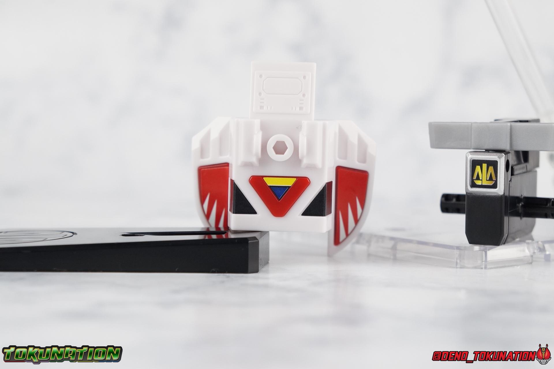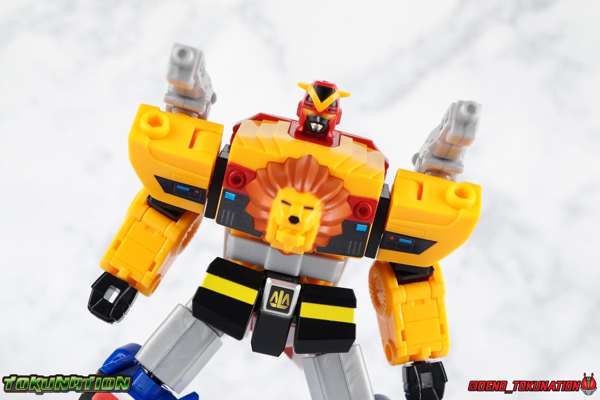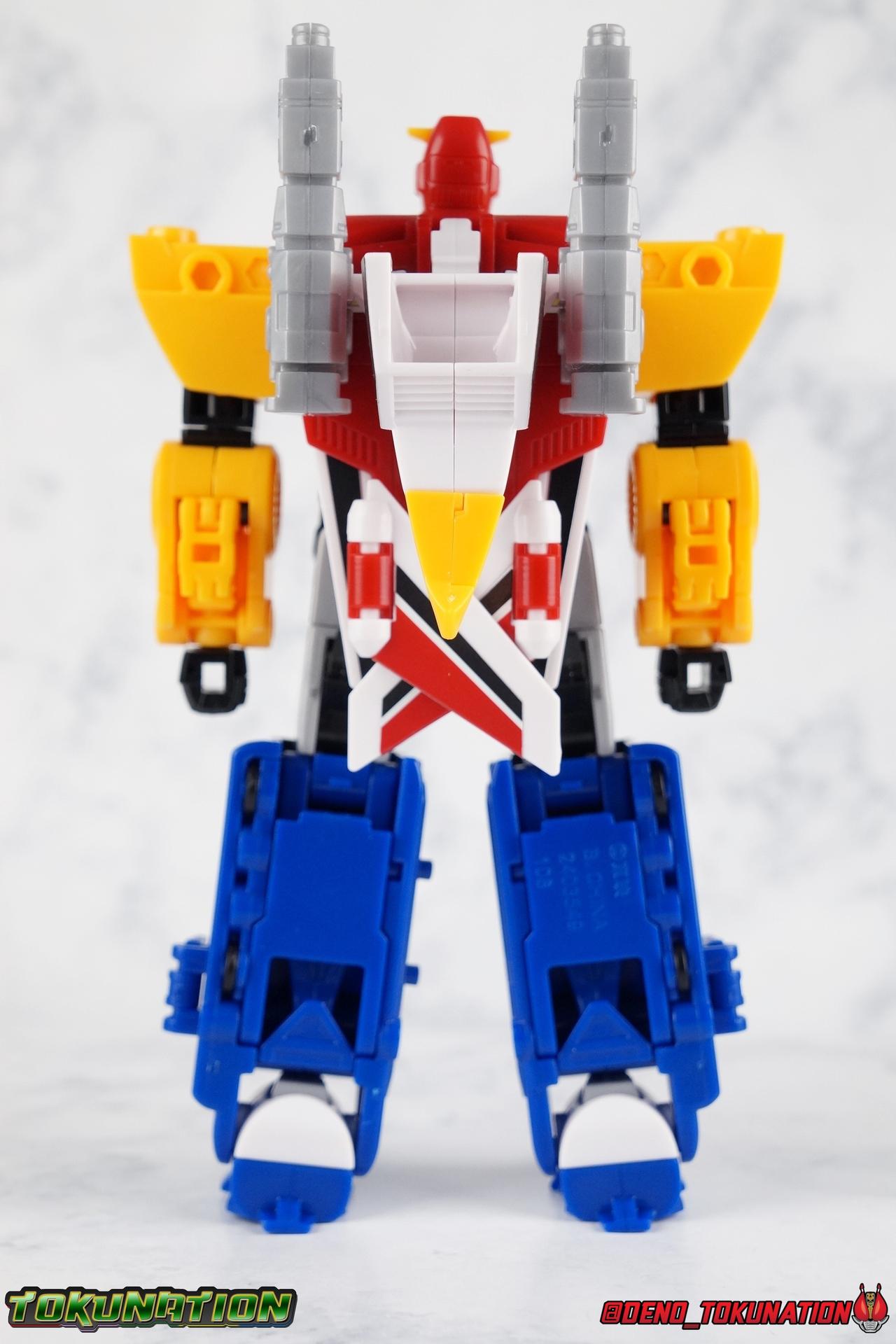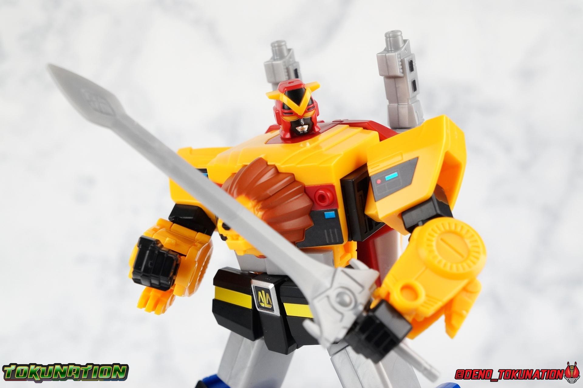 Now for the main event, Live Dimension! By far the greatest strength of the Super Minipla line is it's ability to recreate combined robots so excellently. You get a great functional toy with some fantastic proportions and accessories. Unlike many minipla of the past, you can also get around most part swapping for the transformations. In Live Robo's case, a mere 3 parts are removed and totally set aside for this transformation. Only the plugs that cover the knee plugs on Sky Machine and the tail from Land Machine are left over in the end. I've included step by step photos to show you how to get from each individual machine into the parts you need. While I think those images can speak for themselves I do want to mention a couple of fascinating things about the combination that I love. First, the way the lower half of Sky Machine slides down to accommodate the Land Machine chest, then slides back up to lock it in place and hide Land Machine's front legs just blows my mind. Likewise the way in which Land Machine's legs rotate out on that shared black joint within the chest is just incredible to me. The way it moves is just so fluid it's hard to believe this is a minipla. Once you've assembled Live Robo, you have one hell of a fun little figure. Without getting into the weapons yet, Live Robo is a great and poseable action figure in it's own right. The feet have side tilting joints thanks to how the feet are built, while the ankles can tilt forward and back too. Because of the nature of joints in the thighs we also get a nice knee joint connected to Aqua Machine that extends out it's main body. Then there's a mid-thigh swivel as well as a rotating hip joint. Now the hips are TIGHT, scary forceful on my Live Robo. Just be wary. All of this adds up to some extraordinary articulation in the lower body. This thing can stand on one leg with the other wrapped around it's back even. Despite it's complicated assembly even the torso can rotate pretty freely. The shoulders are each on a sort of butterfly joint that allows them to move very high up (at the cost of looking a bit inaccurate) but the arms can also swing out quite wide. Now for my one big complaint, the elbows have almost no range. Mostly because they have to accommodate the way the lion legs transform, they can only rotate forward about a quarter turn before they impact the opening forearm panel. The rotating biceps and fists can help alleviate some of this but it's still imperfect. Finally the head is on a small but useful balljoint that allows it to move a lot more than it appears at first glance. Able to spin around completely and angle up or down just a bit goes a long way to helping create personality for this mecha. Now for weapons. Live Robo comes with a shield formed from Sky Machine called the Live Shield. A square peg on the handle allows it to fit snugly into either hand of the Live Robo and it's hinged to pose it out of the way. We also get the mighty Chojuken or Super Beast Sword. Oddly this accessory isn't painted nor are there stickers included for it so the hilt remains in accurate. I don't paint or panel line or do anything outside of what the stock instructions give me for model kits. I like to straight build everything, that's just the way I am and I'll always be. If you've ever seen Gundam Build Fighters, think of me like Straight Build Shimon. I don't feel like I should have to recreate missing details they should simply be there, and I'm not particularly good at it either. So these little inaccuracies are frustrating, but not deal breaking. Final Thoughts Super Minipla is a revolutionary toyline for Super Sentai. As someone who typically collects DX toys, Robot Damashii, S.H. Figuarts, and Chogokin type figures, I was not prepared to be up for another toyline. But the chance to own a classic design like the Live Robo in an affordable way was something I couldn't pass up on. And I'm glad I didn't. If Bandai keeps it up and does more pre-Zyuranger mecha then I may actually be all in on this line. For now, I'm extremely please with how Super Minipla Live Robo has turned out.