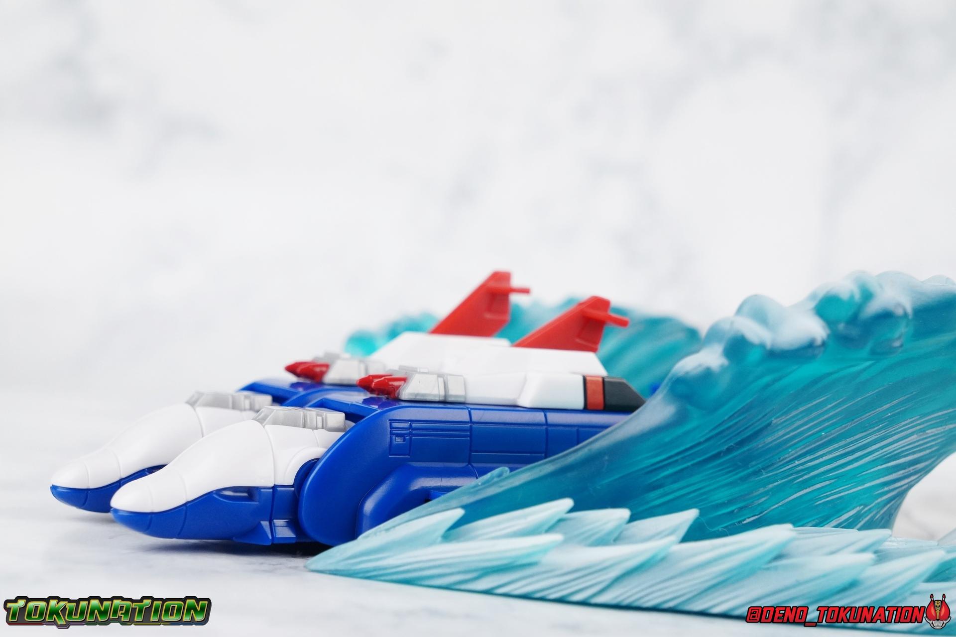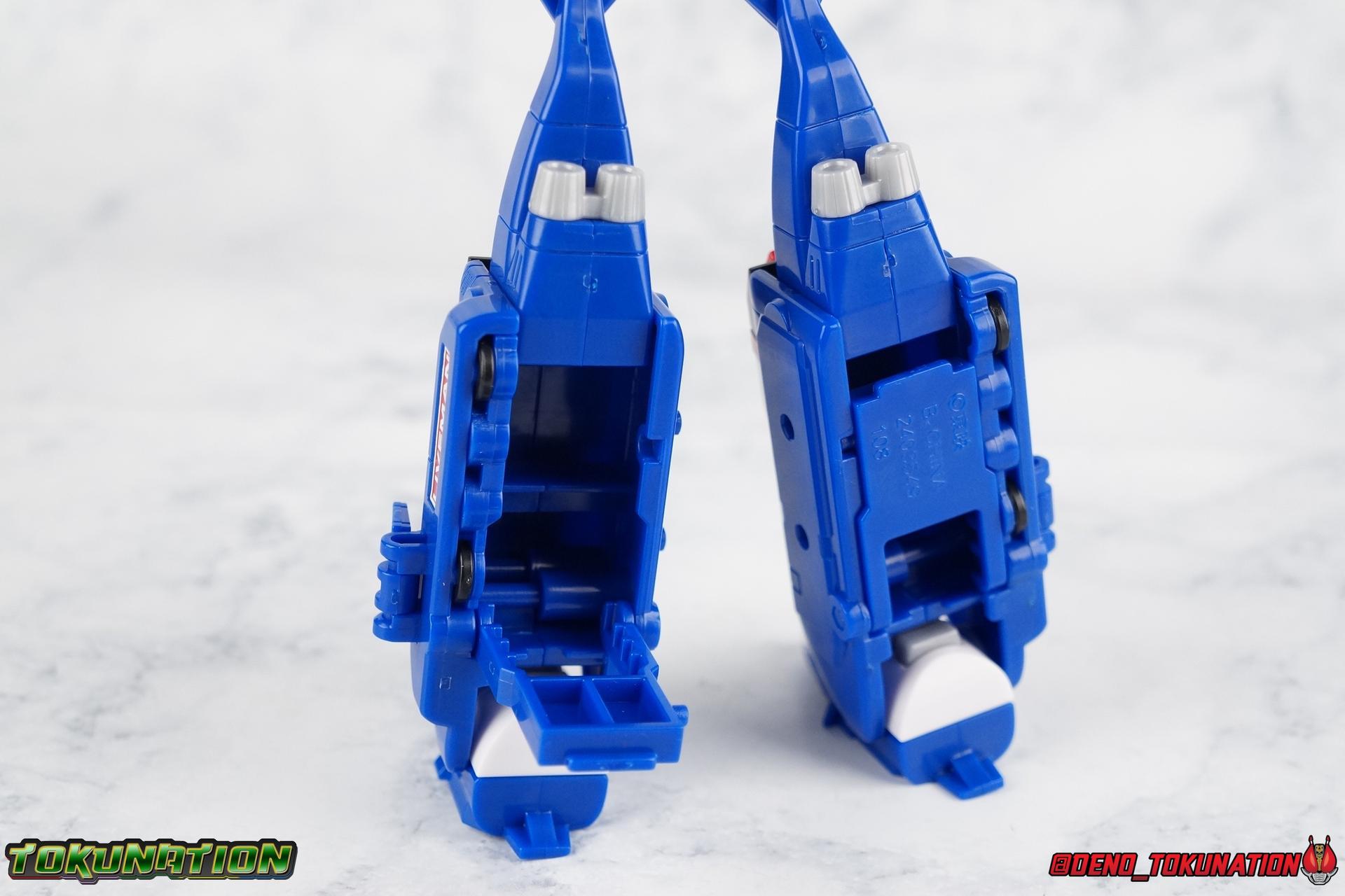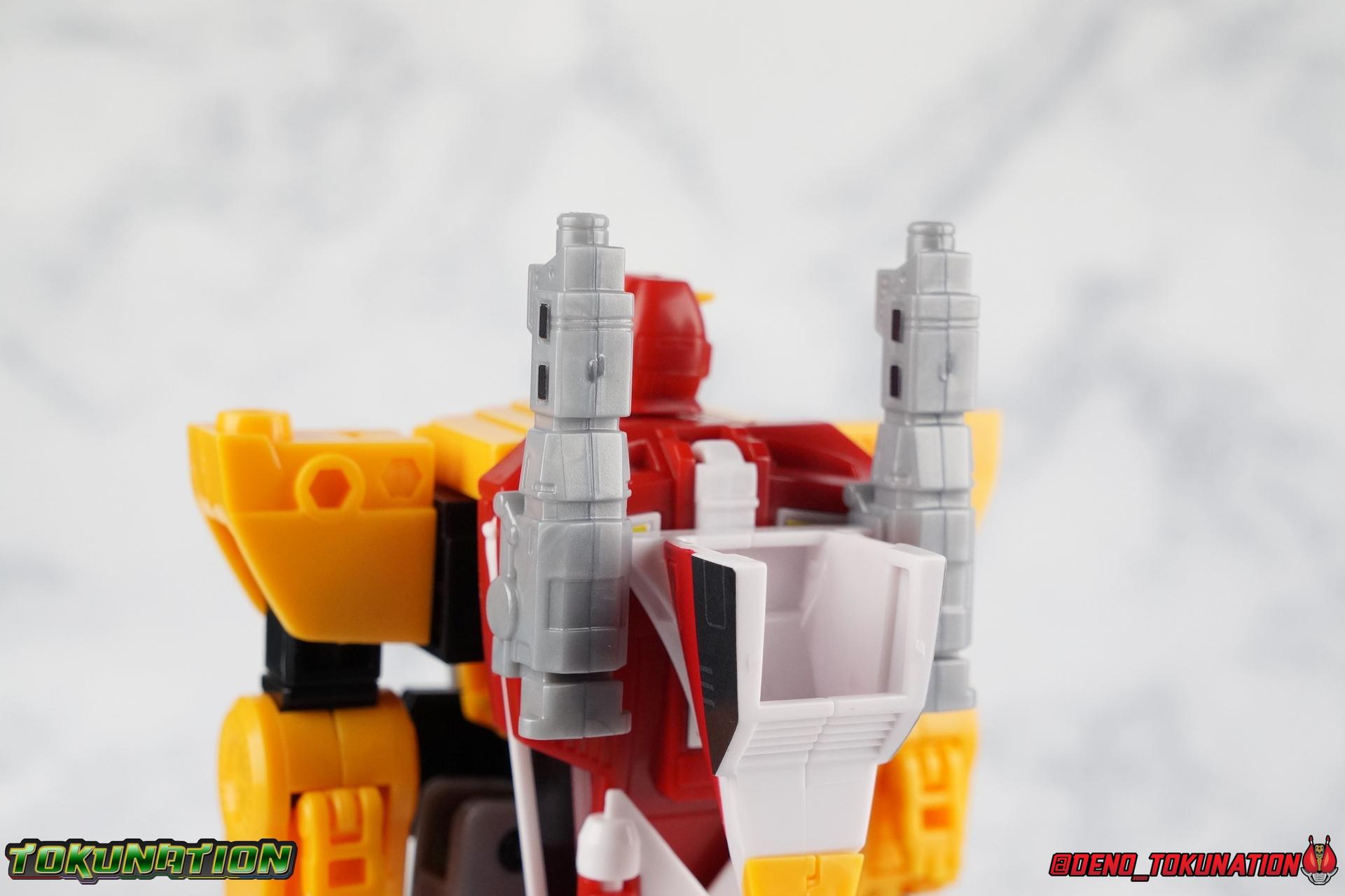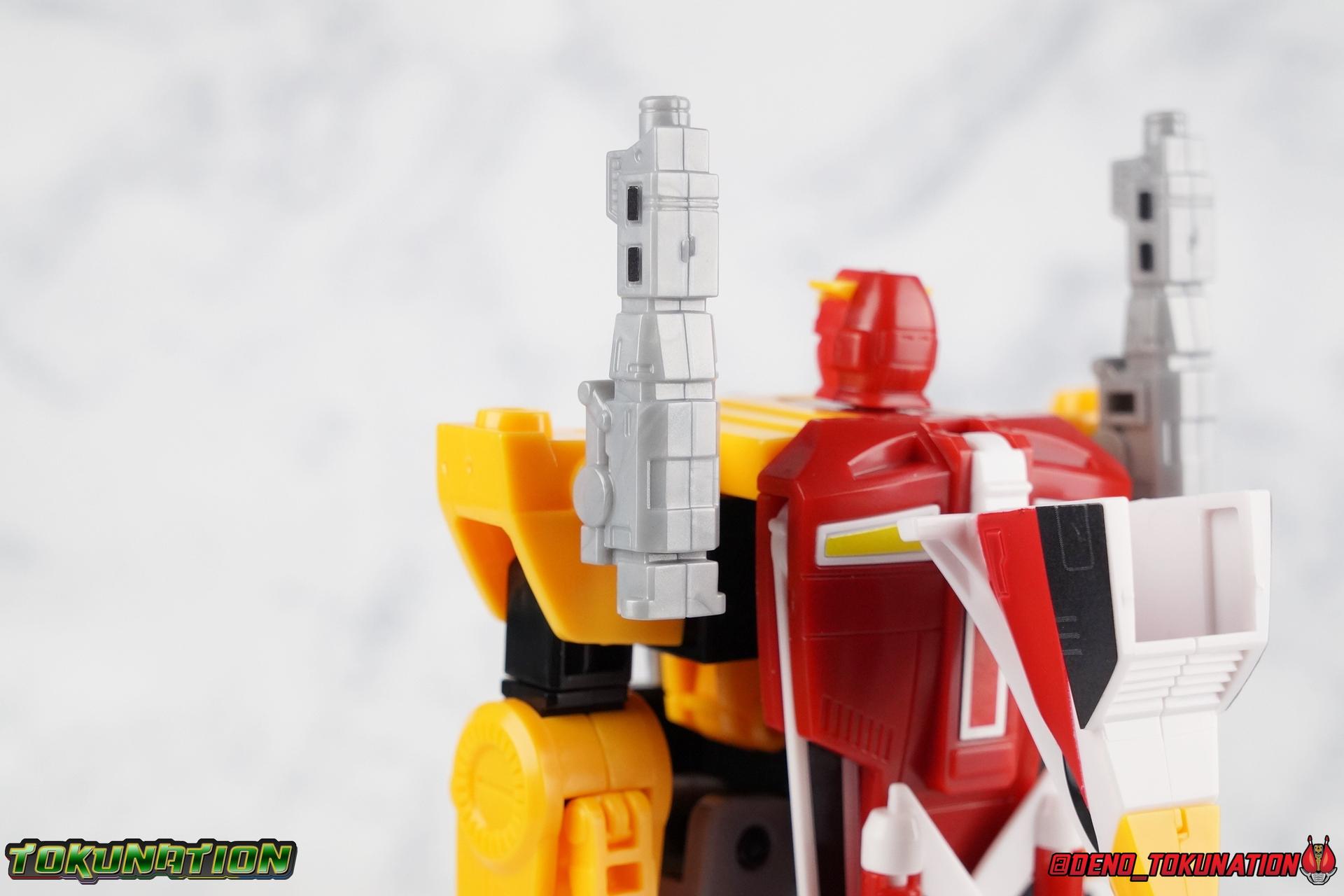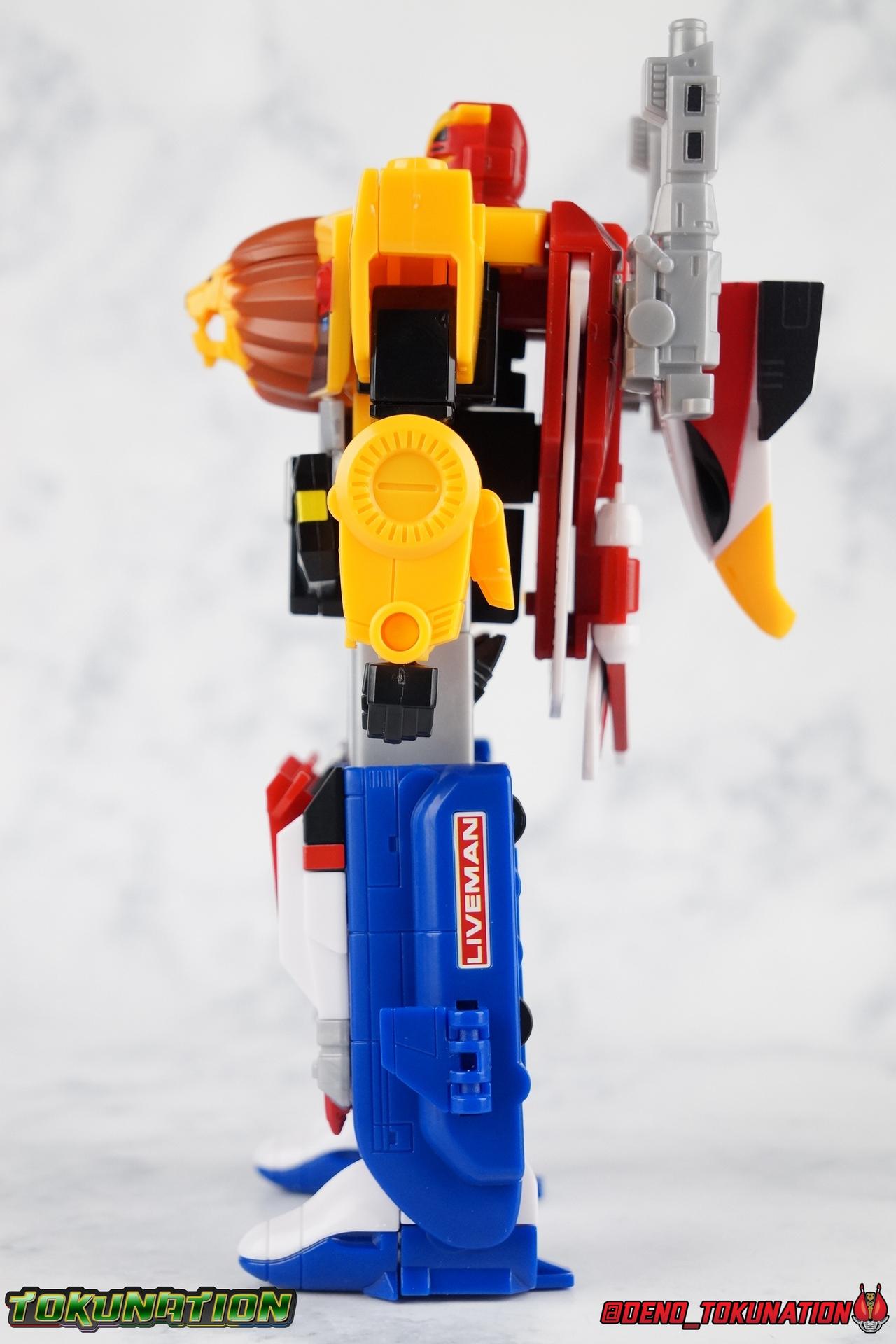 Now for the main event, Live Dimension! By far the greatest strength of the Super Minipla line is it's ability to recreate combined robots so excellently. You get a great functional toy with some fantastic proportions and accessories. Unlike many minipla of the past, you can also get around most part swapping for the transformations. In Live Robo's case, a mere 3 parts are removed and totally set aside for this transformation. Only the plugs that cover the knee plugs on Sky Machine and the tail from Land Machine are left over in the end. I've included step by step photos to show you how to get from each individual machine into the parts you need. While I think those images can speak for themselves I do want to mention a couple of fascinating things about the combination that I love. First, the way the lower half of Sky Machine slides down to accommodate the Land Machine chest, then slides back up to lock it in place and hide Land Machine's front legs just blows my mind. Likewise the way in which Land Machine's legs rotate out on that shared black joint within the chest is just incredible to me. The way it moves is just so fluid it's hard to believe this is a minipla. Once you've assembled Live Robo, you have one hell of a fun little figure. Without getting into the weapons yet, Live Robo is a great and poseable action figure in it's own right. The feet have side tilting joints thanks to how the feet are built, while the ankles can tilt forward and back too. Because of the nature of joints in the thighs we also get a nice knee joint connected to Aqua Machine that extends out it's main body. Then there's a mid-thigh swivel as well as a rotating hip joint. Now the hips are TIGHT, scary forceful on my Live Robo. Just be wary. All of this adds up to some extraordinary articulation in the lower body. This thing can stand on one leg with the other wrapped around it's back even. Despite it's complicated assembly even the torso can rotate pretty freely. The shoulders are each on a sort of butterfly joint that allows them to move very high up (at the cost of looking a bit inaccurate) but the arms can also swing out quite wide. Now for my one big complaint, the elbows have almost no range. Mostly because they have to accommodate the way the lion legs transform, they can only rotate forward about a quarter turn before they impact the opening forearm panel. The rotating biceps and fists can help alleviate some of this but it's still imperfect. Finally the head is on a small but useful balljoint that allows it to move a lot more than it appears at first glance. Able to spin around completely and angle up or down just a bit goes a long way to helping create personality for this mecha. Now for weapons. Live Robo comes with a shield formed from Sky Machine called the Live Shield. A square peg on the handle allows it to fit snugly into either hand of the Live Robo and it's hinged to pose it out of the way. We also get the mighty Chojuken or Super Beast Sword. Oddly this accessory isn't painted nor are there stickers included for it so the hilt remains in accurate. I don't paint or panel line or do anything outside of what the stock instructions give me for model kits. I like to straight build everything, that's just the way I am and I'll always be. If you've ever seen Gundam Build Fighters, think of me like Straight Build Shimon. I don't feel like I should have to recreate missing details they should simply be there, and I'm not particularly good at it either. So these little inaccuracies are frustrating, but not deal breaking. Final Thoughts Super Minipla is a revolutionary toyline for Super Sentai. As someone who typically collects DX toys, Robot Damashii, S.H. Figuarts, and Chogokin type figures, I was not prepared to be up for another toyline. But the chance to own a classic design like the Live Robo in an affordable way was something I couldn't pass up on. And I'm glad I didn't. If Bandai keeps it up and does more pre-Zyuranger mecha then I may actually be all in on this line. For now, I'm extremely please with how Super Minipla Live Robo has turned out.