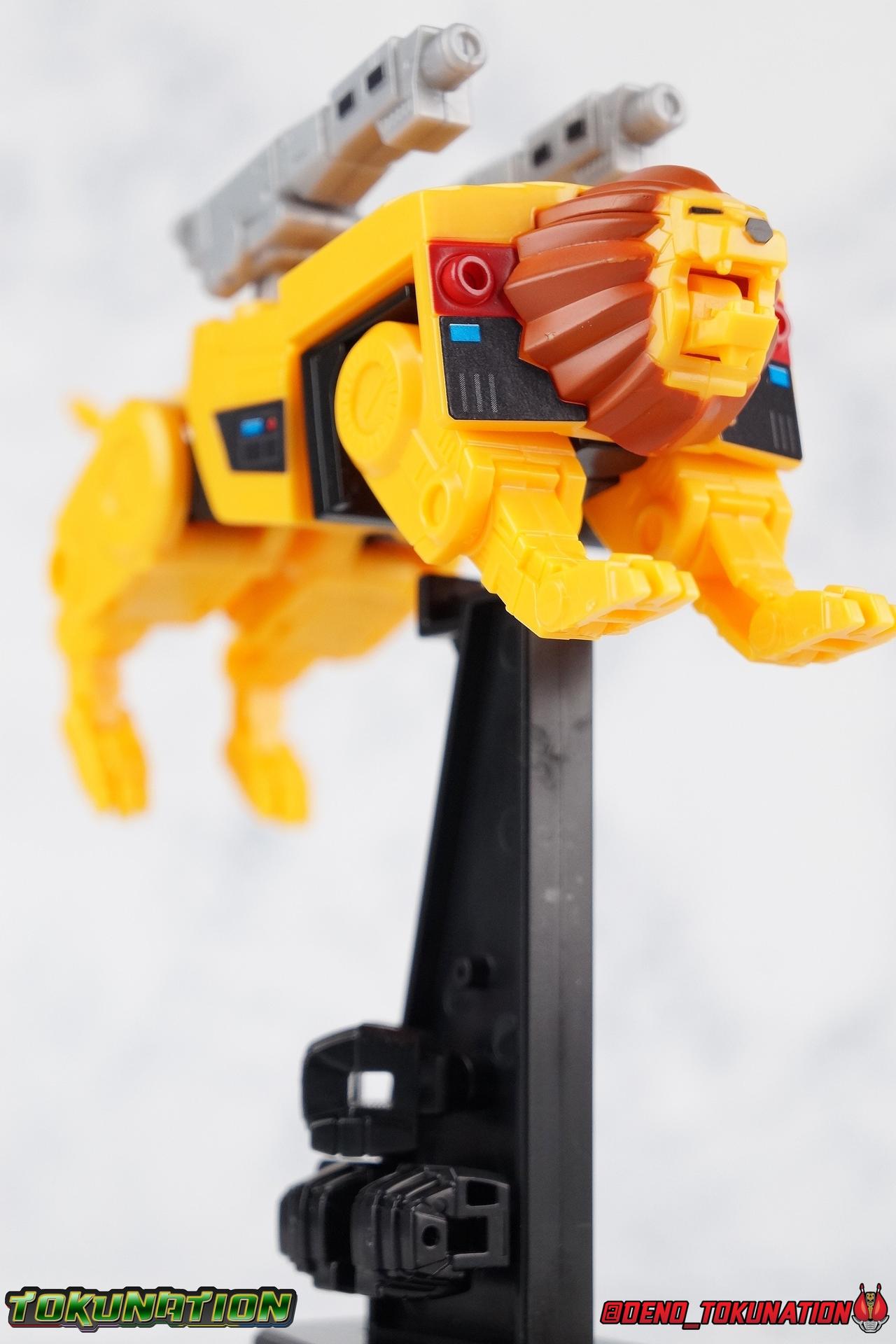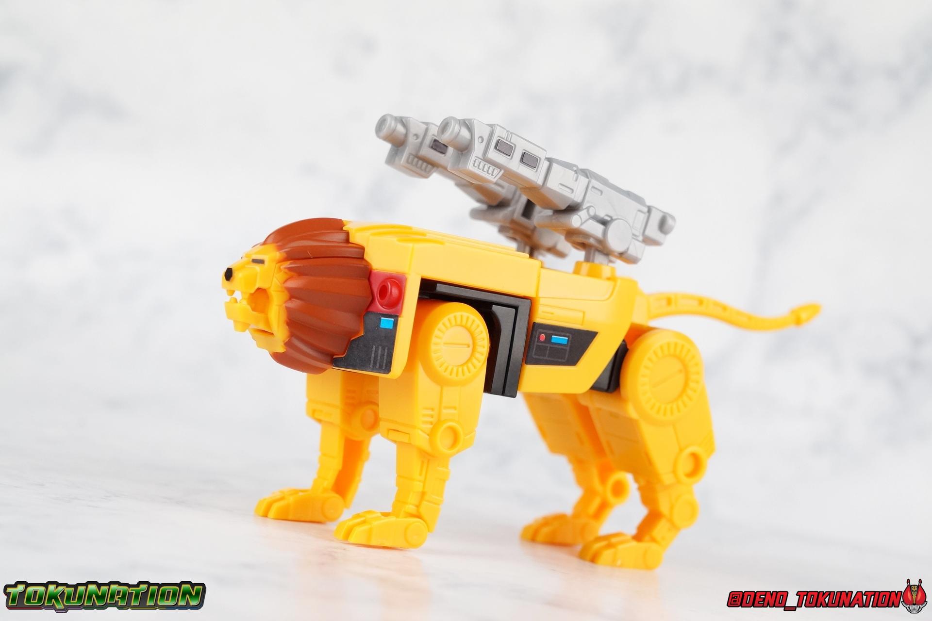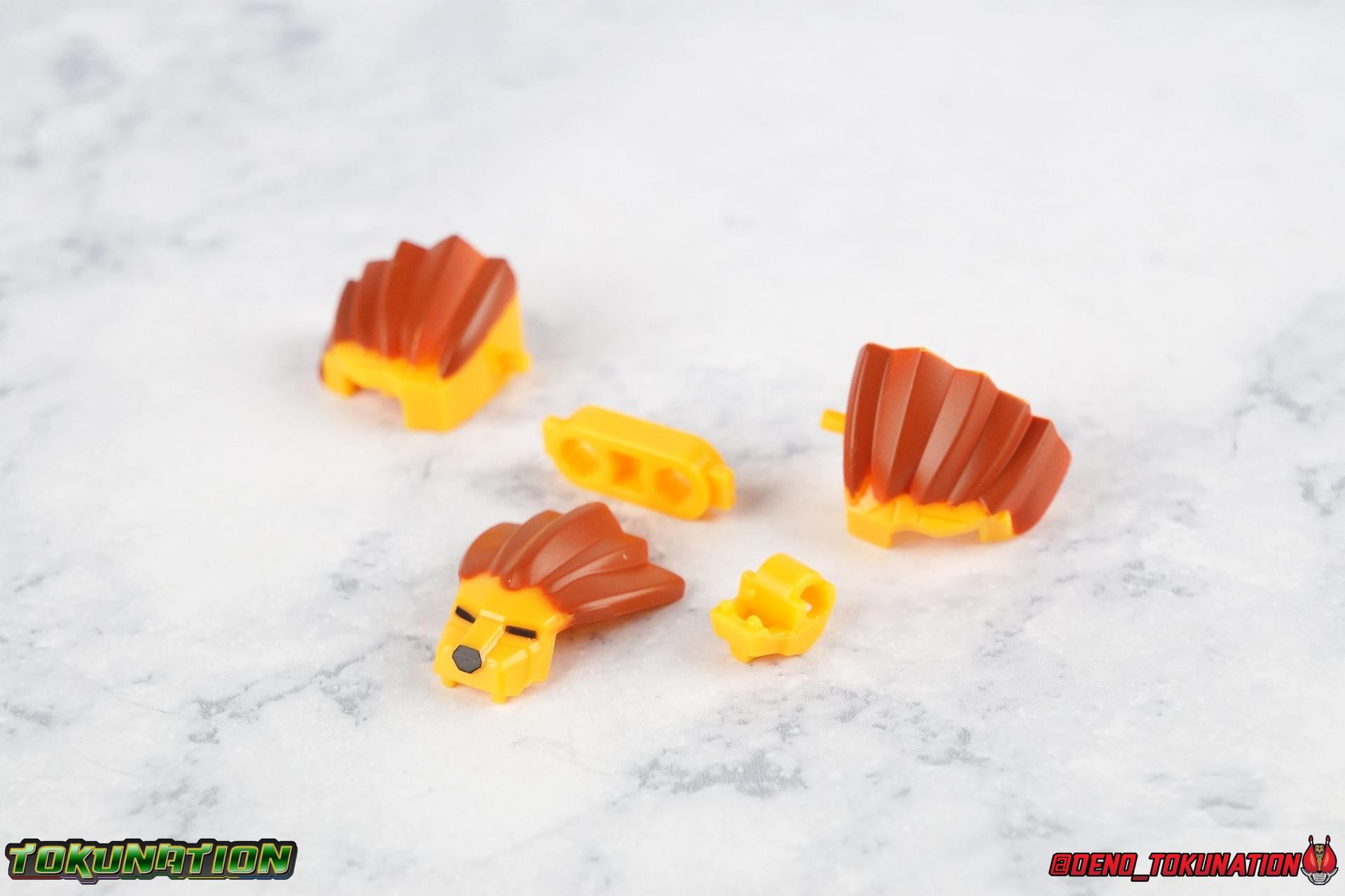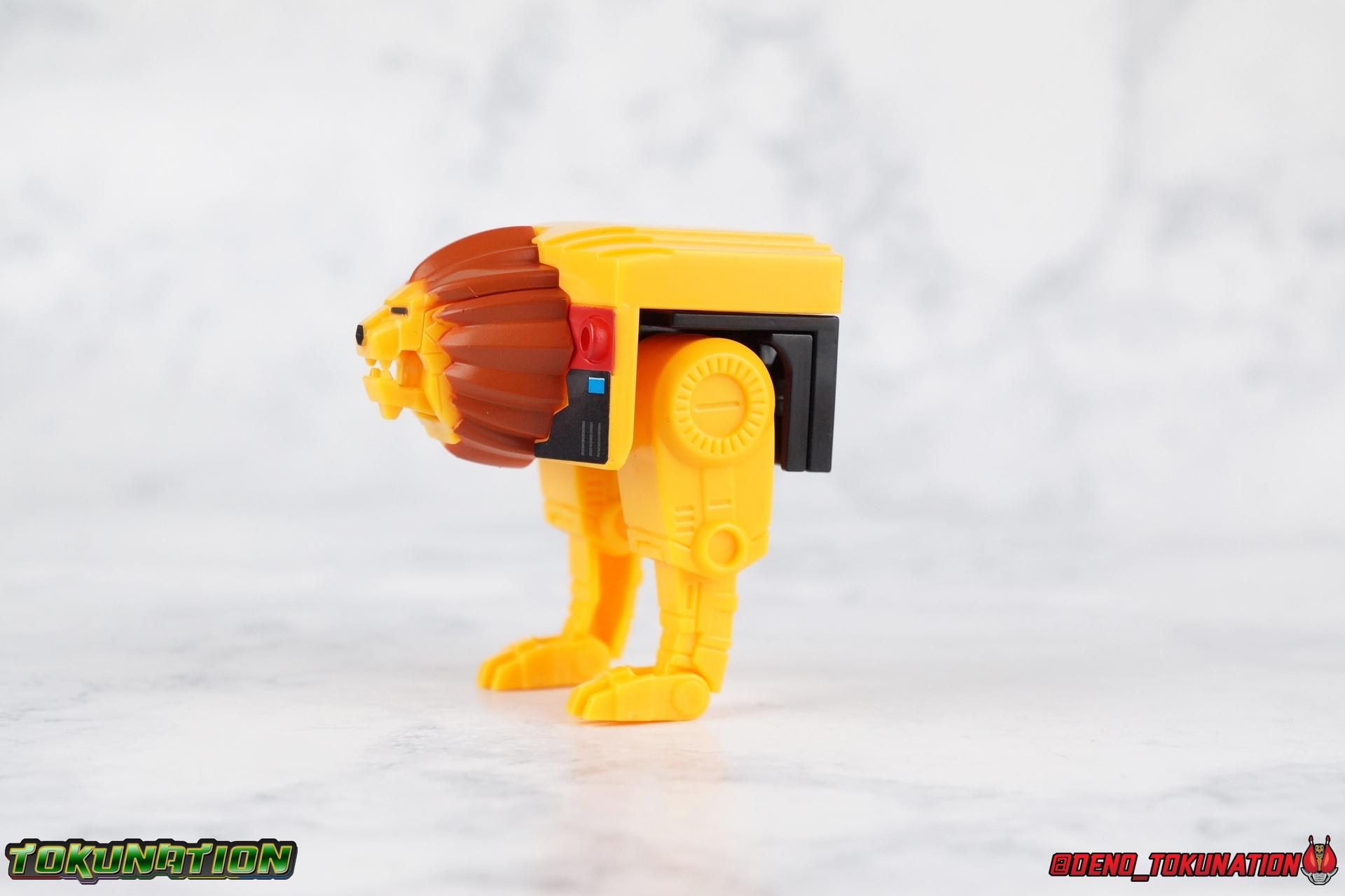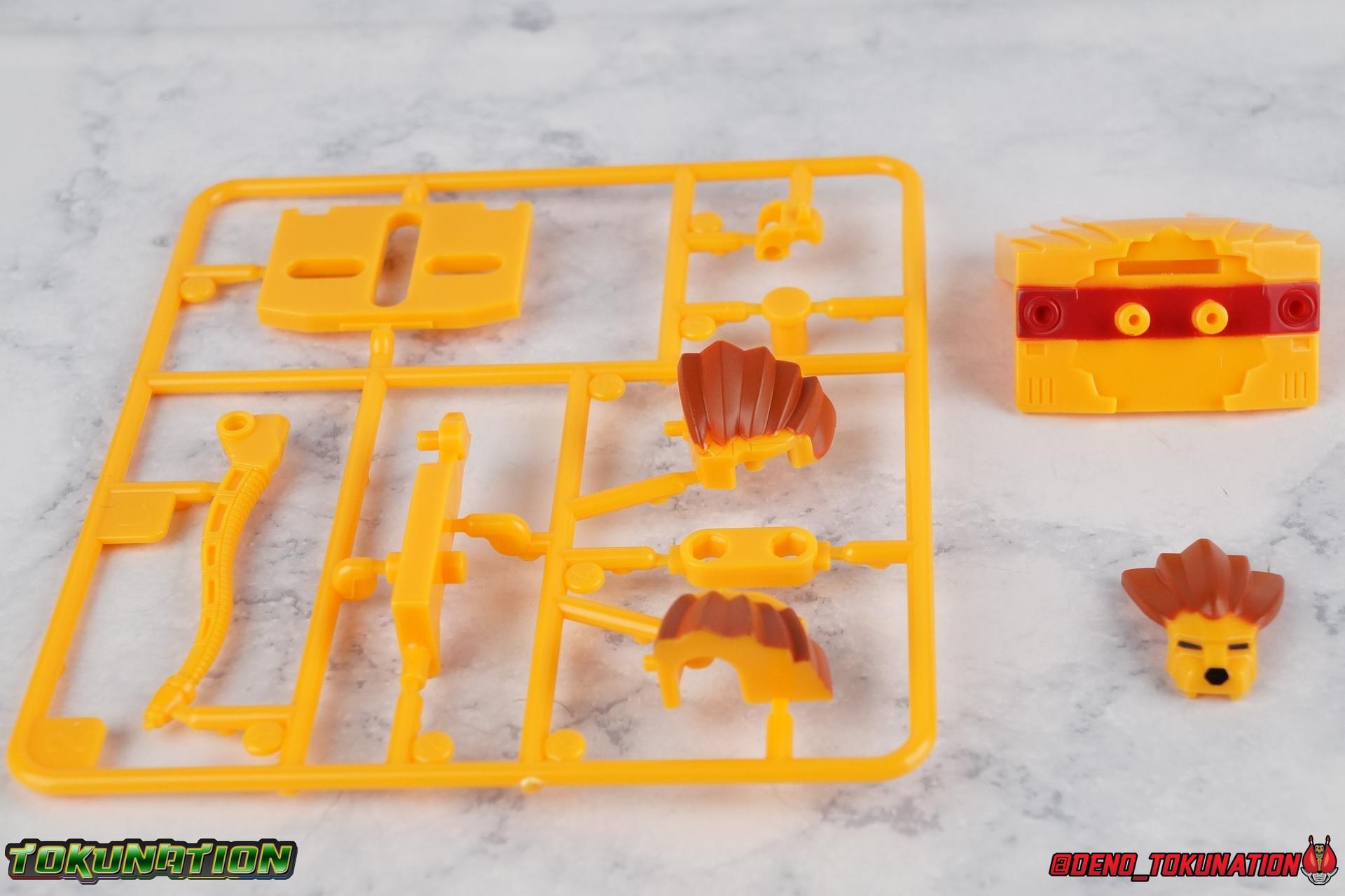 As with Sky Machine, either of these names is acceptable, both having been used interchangeably by Toei & Bandai to describe the unit. Like Sky Machine, Land Machine is a really complex and interesting little figure when fully assembled. And also like it, a number of pre-painted parts are included! In this case it's 3 chunks of the Lion's head as well as the component that will eventually become Live Robo's chest. Like the others this one comes with my favorite weird Minipla Candy too! A label sheet is included to add some minor details such as the black square on the cannons. You can see from the parts breakdown photos that there's a decent amount going on in the construction of this figure, and most of that complexity comes into play with the Live Robo formation. But as an individual, Land Machine is fairly basic. We get an opening jaw, a moving tail, the Lion Cannons positioned in the rear can angle up or down and spin just a bit side to side though it's tight. The front legs have two usable joints, the upper one inside the chest doesn't have much play to it, while the lower leg mostly moves backward, with a hinged paw on the end. Each piece won't move much on it's own, but together they do a decent amount. The hind legs are the same really, albeit with a little more to 'em thanks to the parts that will become the bicep for Live Robo. Land Machine also comes with 3 additional fists for Live Robo. 2 of which are bulkier versions of the regular fists stored within the Land Machine's hind legs. The bulkier fists can't be used for transformation but do give the Robo a more accurate look for posing. The third hand is an angled down right fist meant for holding the Chojuken/Super Beast Sword. Also included is a small peg adapter for the Display Base that Sky Machine came with. It plugs into two slots directly underneath the forward legs on Land Machine to give it the effect of jumping forward. Of the 3 Machines on their own, Land Machine is by far the best. Just a really cool little lion mecha.