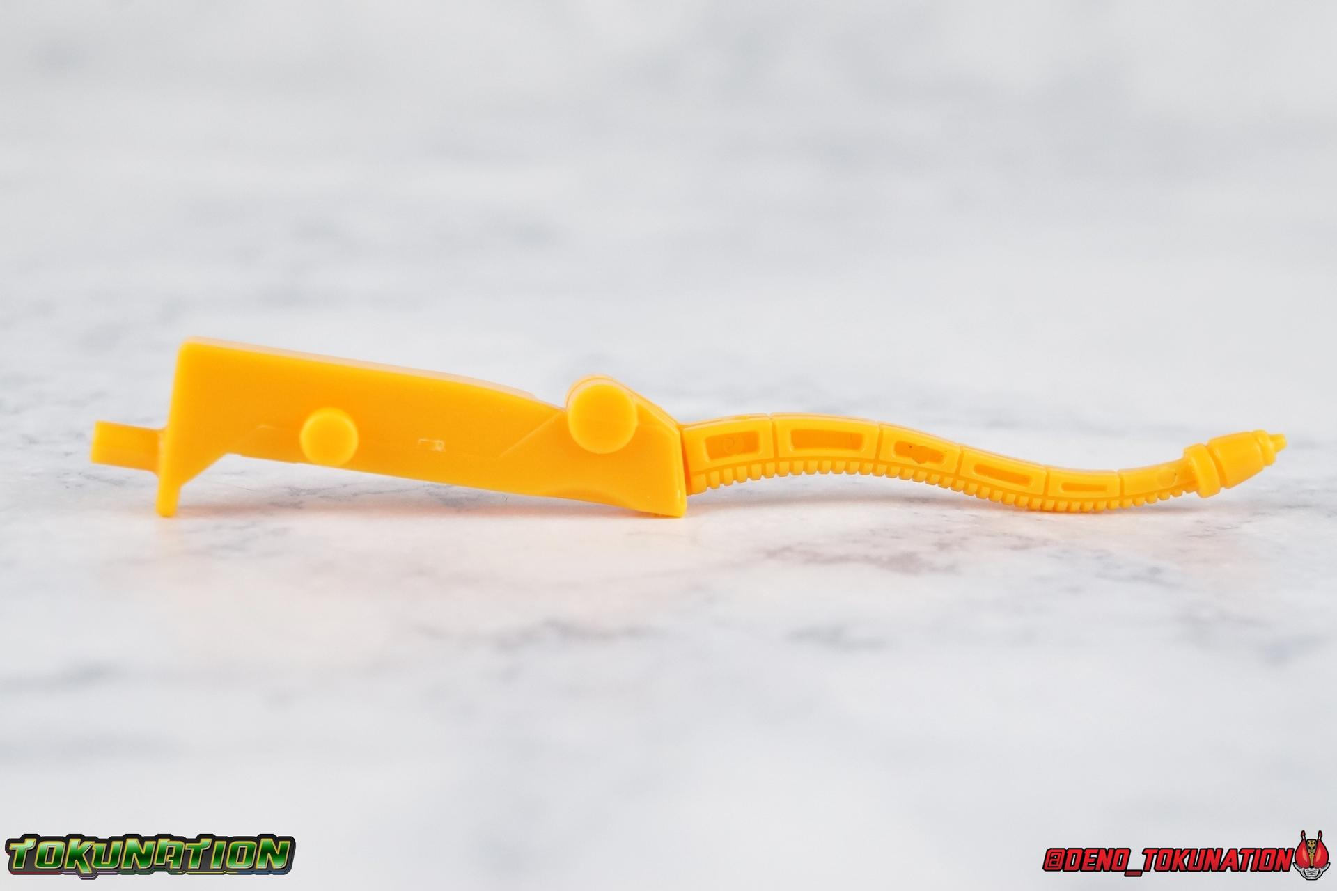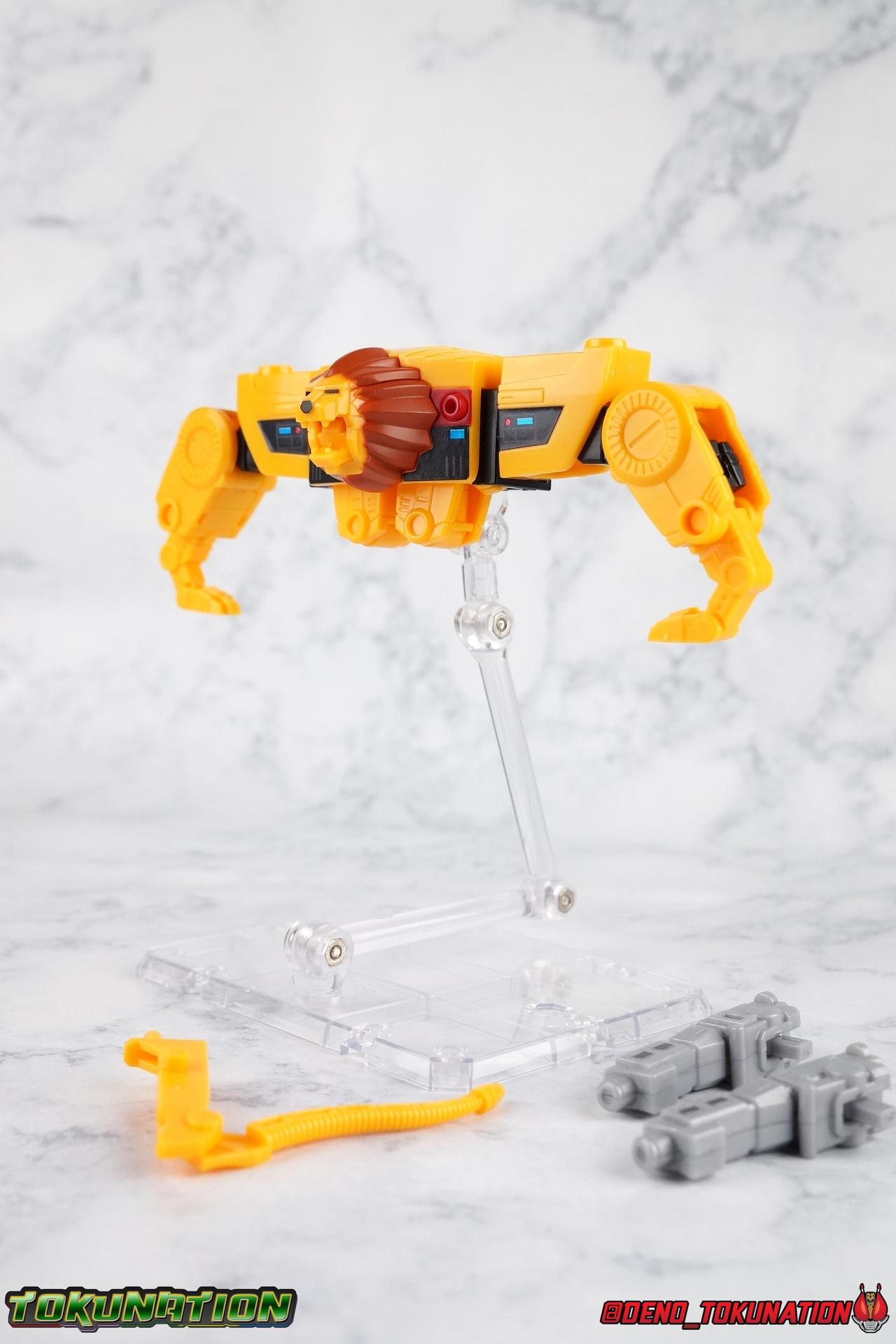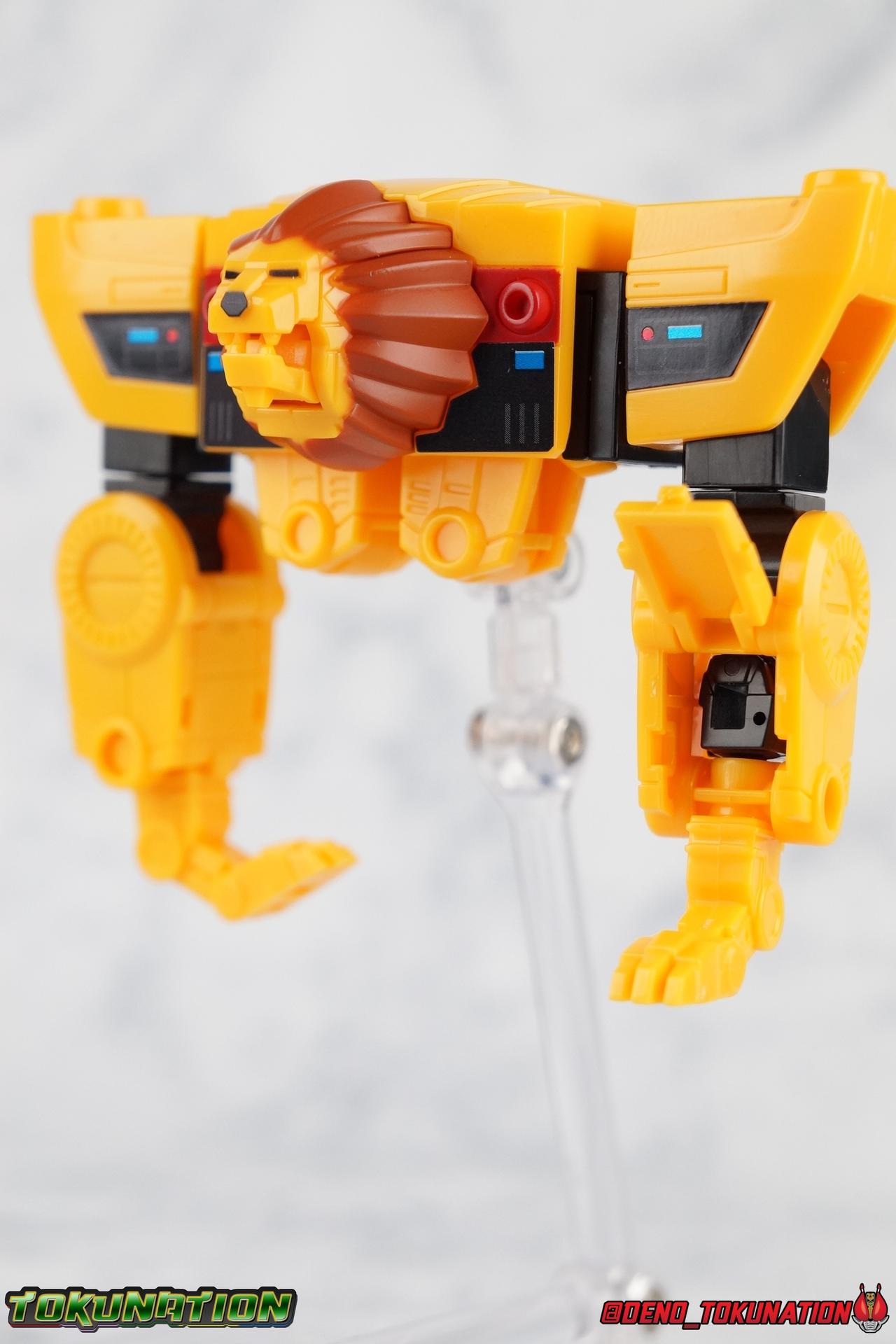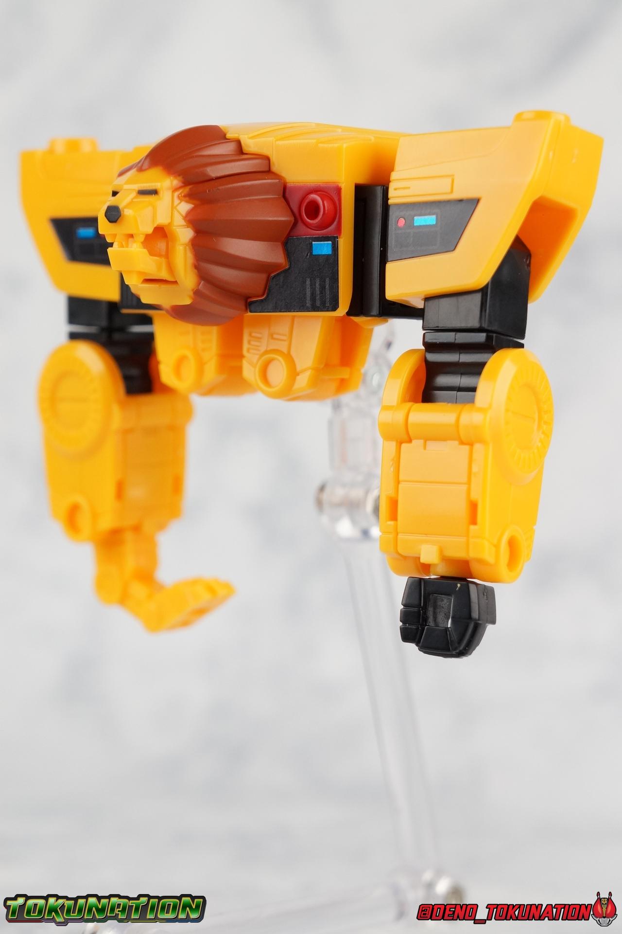 As with Sky Machine, either of these names is acceptable, both having been used interchangeably by Toei & Bandai to describe the unit. Like Sky Machine, Land Machine is a really complex and interesting little figure when fully assembled. And also like it, a number of pre-painted parts are included! In this case it's 3 chunks of the Lion's head as well as the component that will eventually become Live Robo's chest. Like the others this one comes with my favorite weird Minipla Candy too! A label sheet is included to add some minor details such as the black square on the cannons. You can see from the parts breakdown photos that there's a decent amount going on in the construction of this figure, and most of that complexity comes into play with the Live Robo formation. But as an individual, Land Machine is fairly basic. We get an opening jaw, a moving tail, the Lion Cannons positioned in the rear can angle up or down and spin just a bit side to side though it's tight. The front legs have two usable joints, the upper one inside the chest doesn't have much play to it, while the lower leg mostly moves backward, with a hinged paw on the end. Each piece won't move much on it's own, but together they do a decent amount. The hind legs are the same really, albeit with a little more to 'em thanks to the parts that will become the bicep for Live Robo. Land Machine also comes with 3 additional fists for Live Robo. 2 of which are bulkier versions of the regular fists stored within the Land Machine's hind legs. The bulkier fists can't be used for transformation but do give the Robo a more accurate look for posing. The third hand is an angled down right fist meant for holding the Chojuken/Super Beast Sword. Also included is a small peg adapter for the Display Base that Sky Machine came with. It plugs into two slots directly underneath the forward legs on Land Machine to give it the effect of jumping forward. Of the 3 Machines on their own, Land Machine is by far the best. Just a really cool little lion mecha.