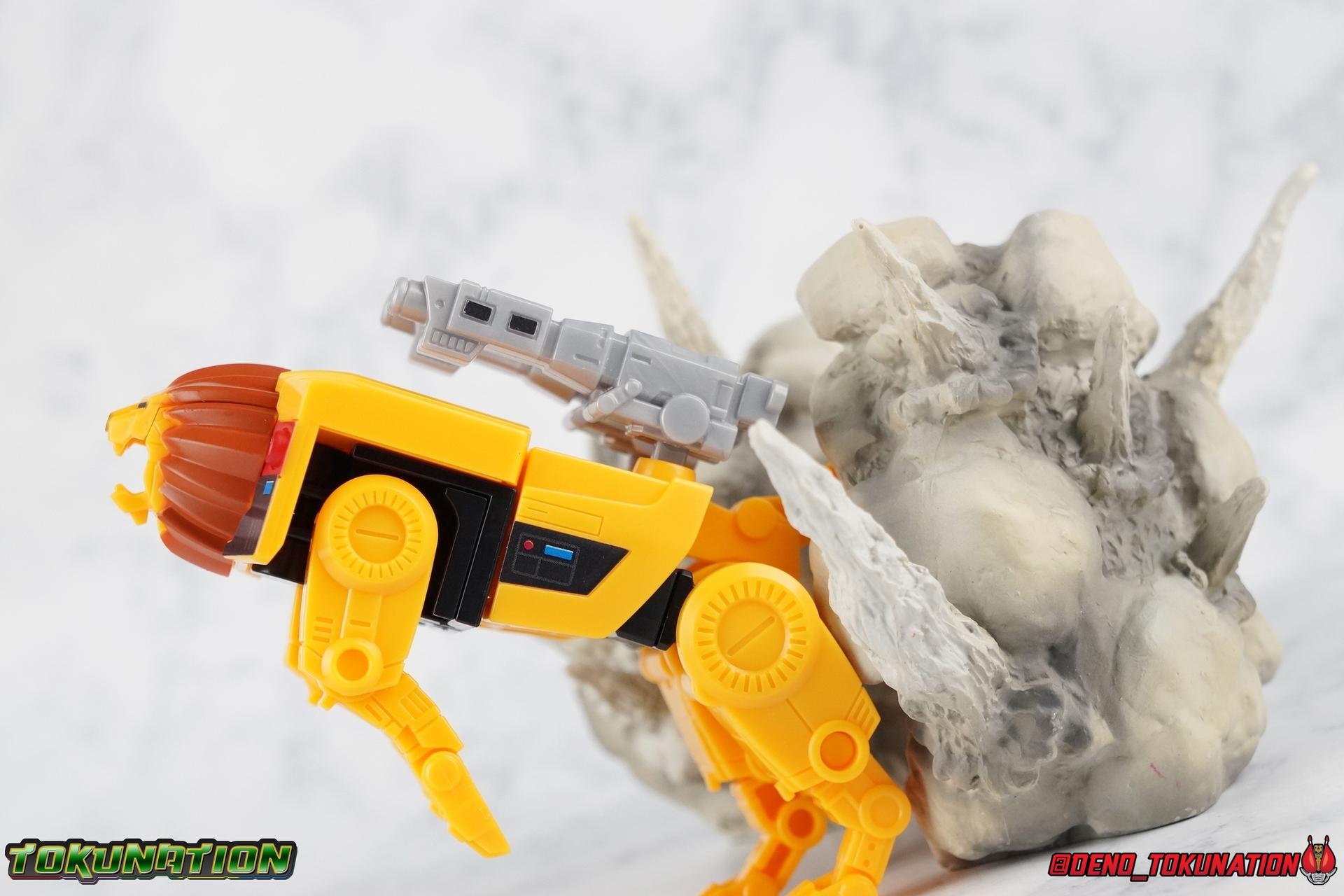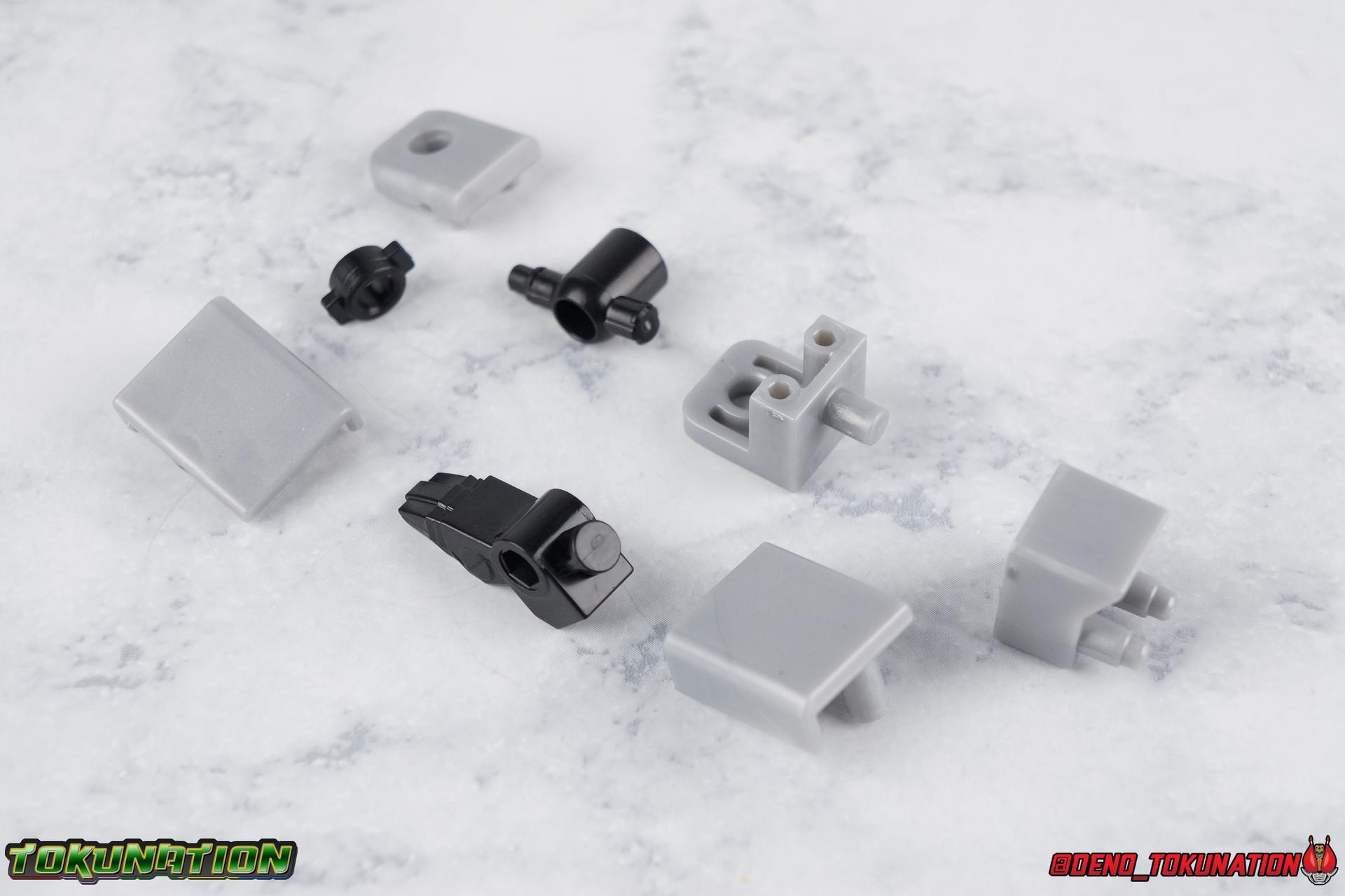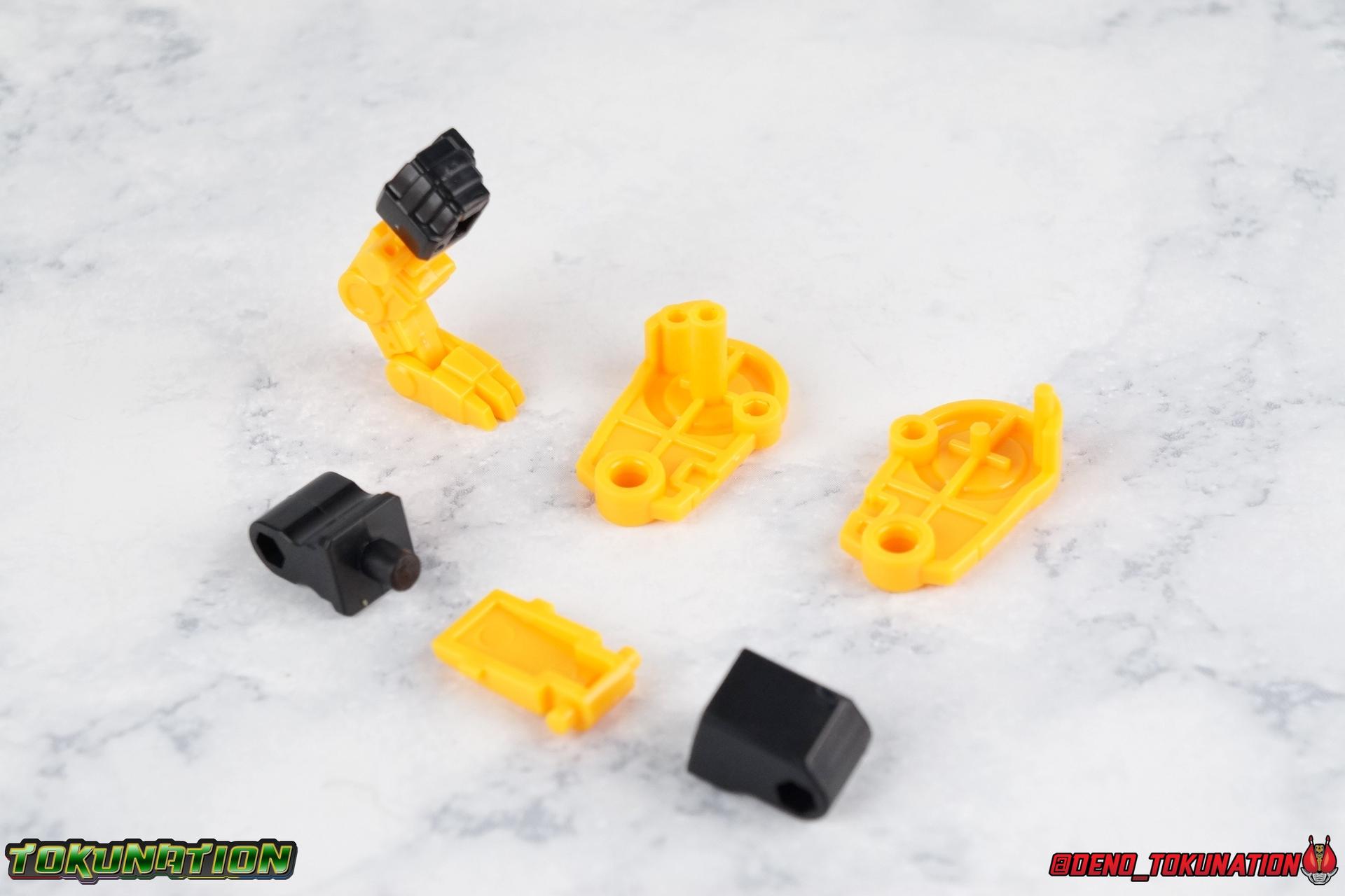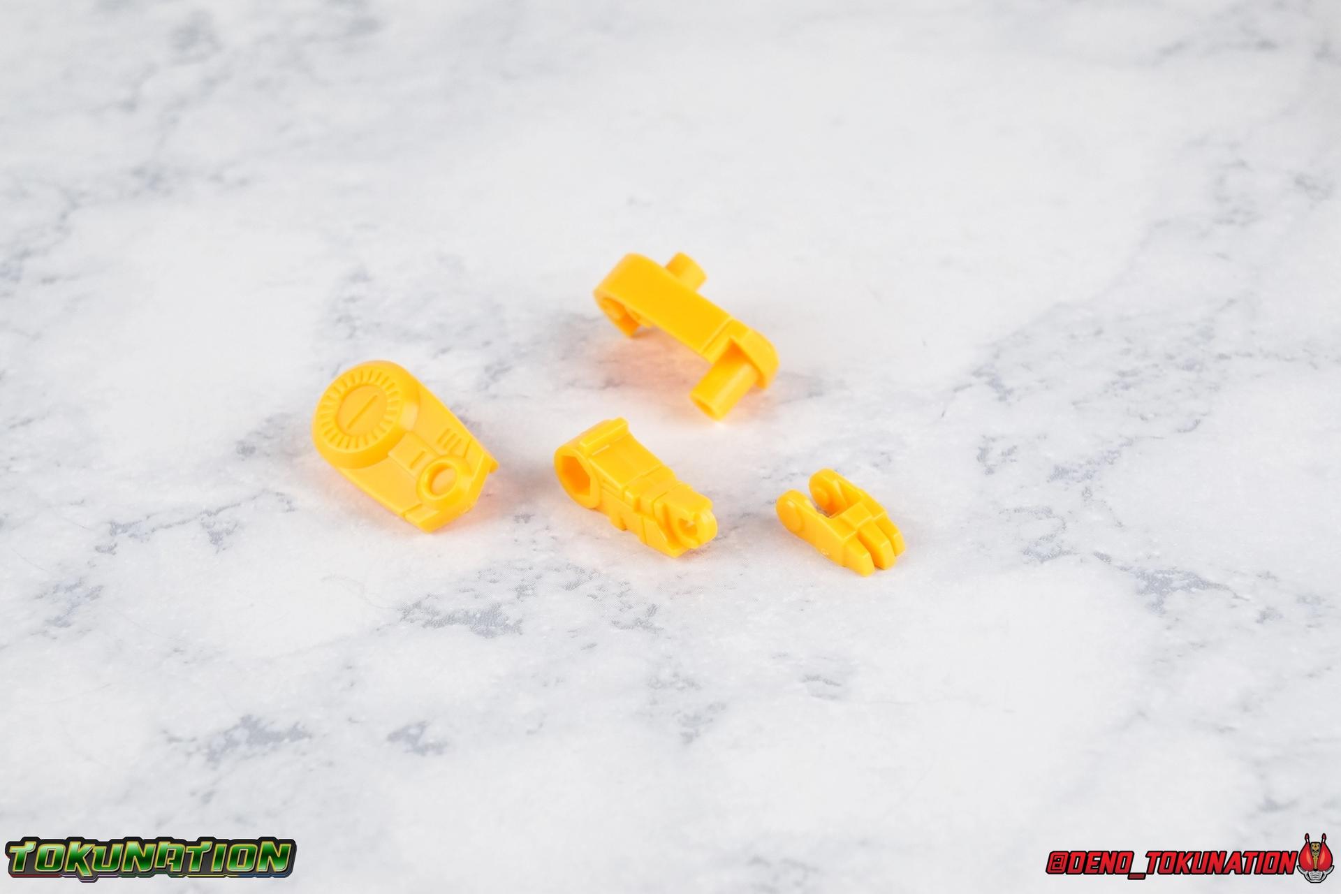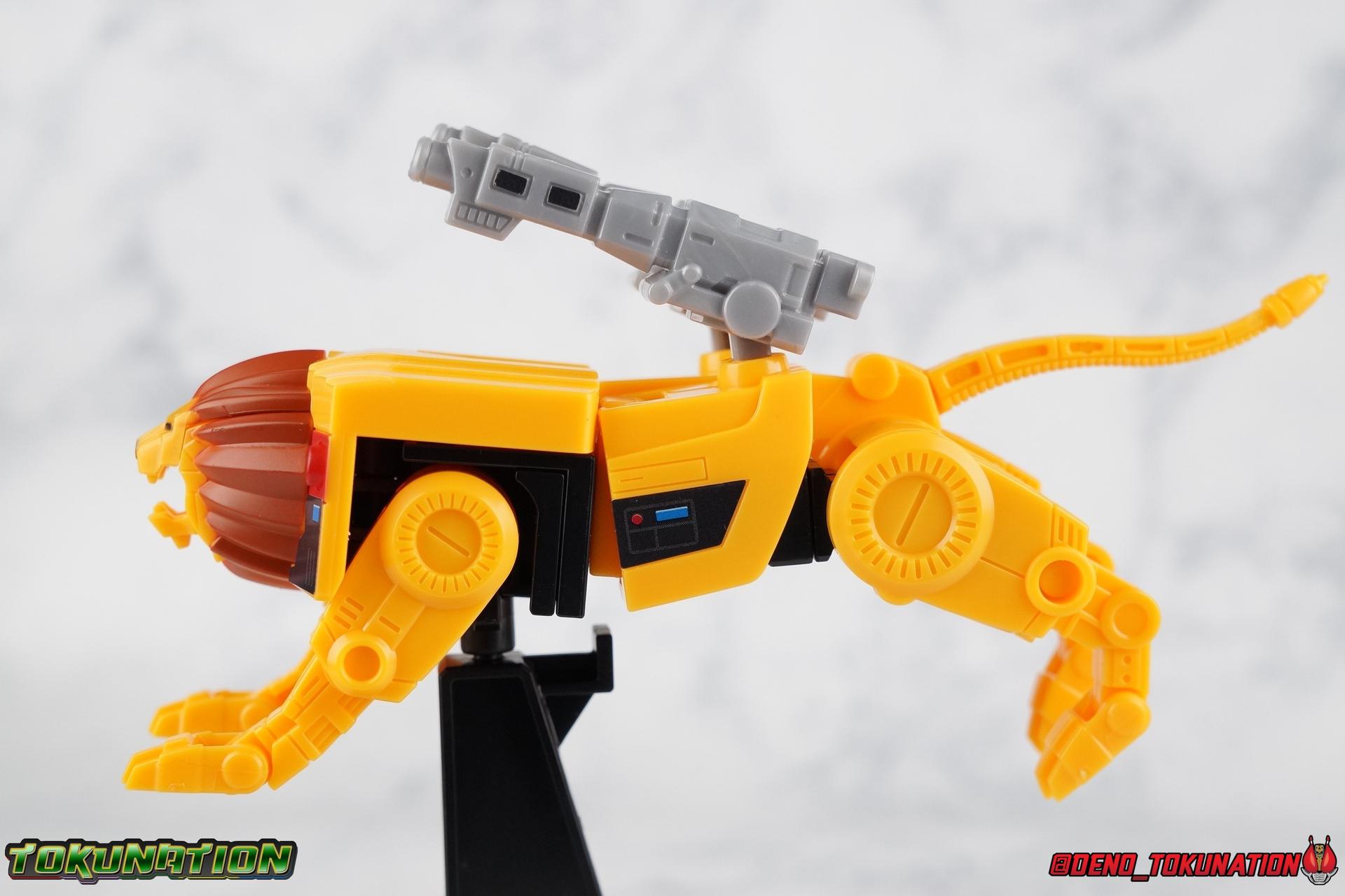 As with Sky Machine, either of these names is acceptable, both having been used interchangeably by Toei & Bandai to describe the unit. Like Sky Machine, Land Machine is a really complex and interesting little figure when fully assembled. And also like it, a number of pre-painted parts are included! In this case it's 3 chunks of the Lion's head as well as the component that will eventually become Live Robo's chest. Like the others this one comes with my favorite weird Minipla Candy too! A label sheet is included to add some minor details such as the black square on the cannons. You can see from the parts breakdown photos that there's a decent amount going on in the construction of this figure, and most of that complexity comes into play with the Live Robo formation. But as an individual, Land Machine is fairly basic. We get an opening jaw, a moving tail, the Lion Cannons positioned in the rear can angle up or down and spin just a bit side to side though it's tight. The front legs have two usable joints, the upper one inside the chest doesn't have much play to it, while the lower leg mostly moves backward, with a hinged paw on the end. Each piece won't move much on it's own, but together they do a decent amount. The hind legs are the same really, albeit with a little more to 'em thanks to the parts that will become the bicep for Live Robo. Land Machine also comes with 3 additional fists for Live Robo. 2 of which are bulkier versions of the regular fists stored within the Land Machine's hind legs. The bulkier fists can't be used for transformation but do give the Robo a more accurate look for posing. The third hand is an angled down right fist meant for holding the Chojuken/Super Beast Sword. Also included is a small peg adapter for the Display Base that Sky Machine came with. It plugs into two slots directly underneath the forward legs on Land Machine to give it the effect of jumping forward. Of the 3 Machines on their own, Land Machine is by far the best. Just a really cool little lion mecha.