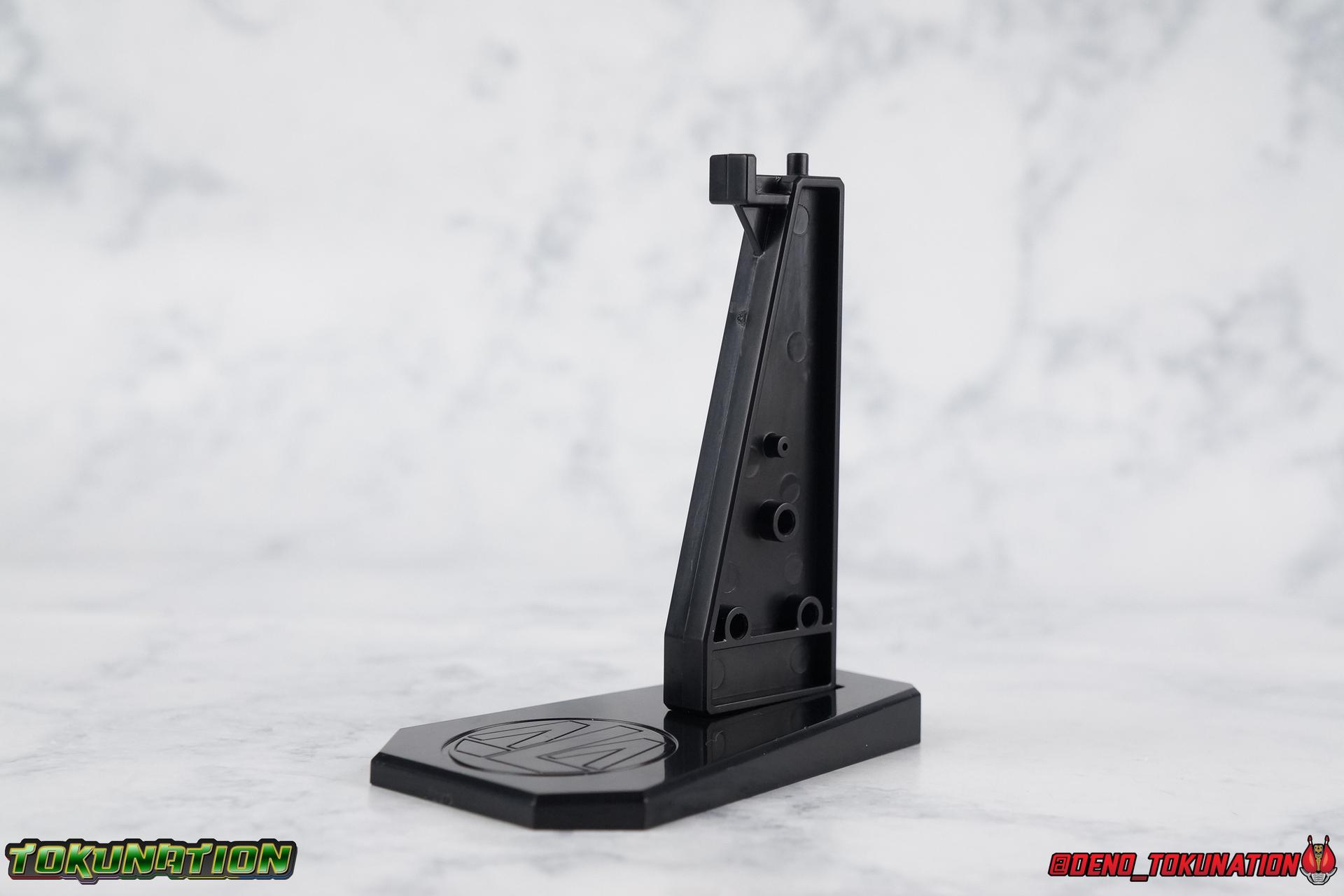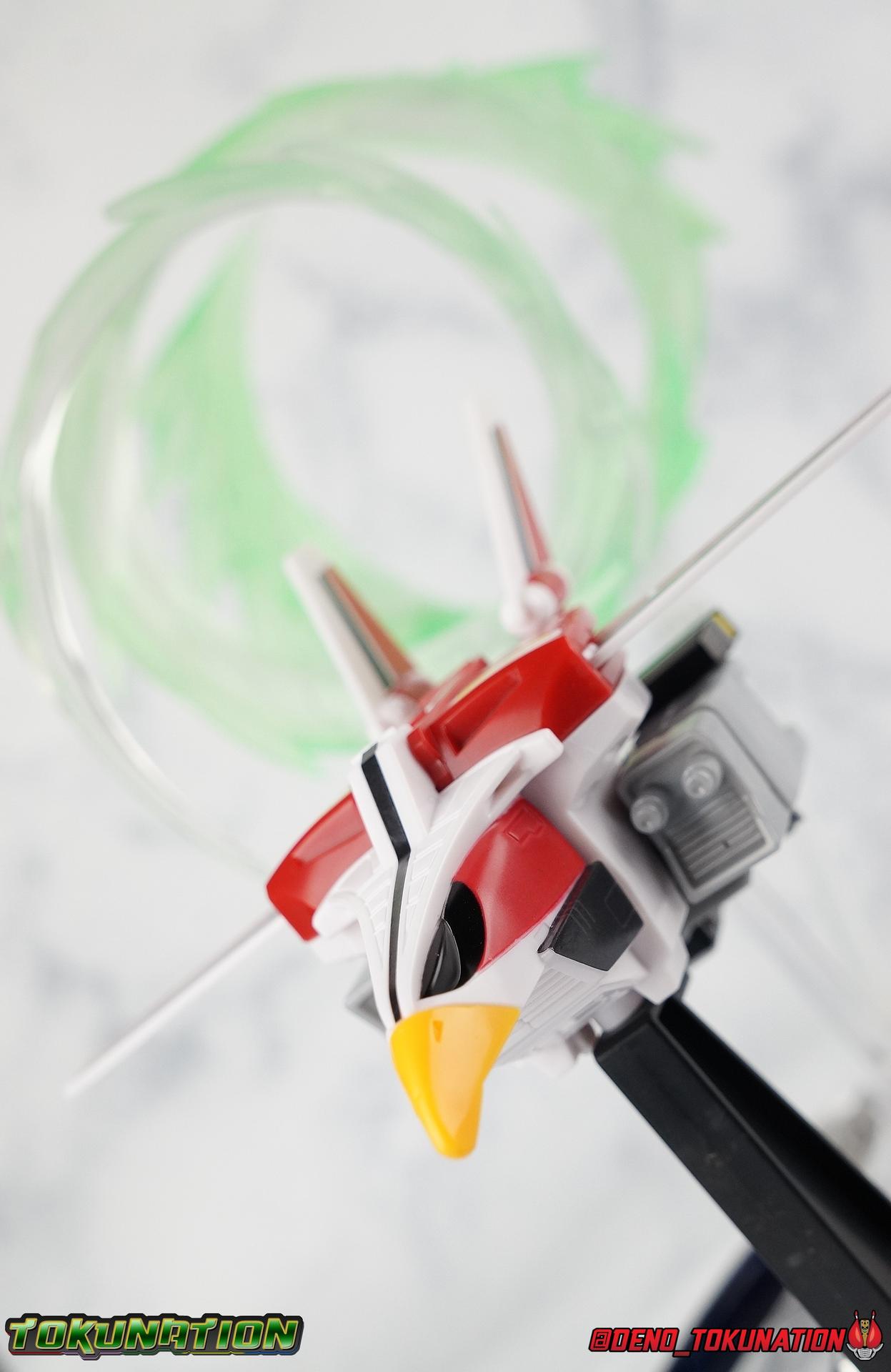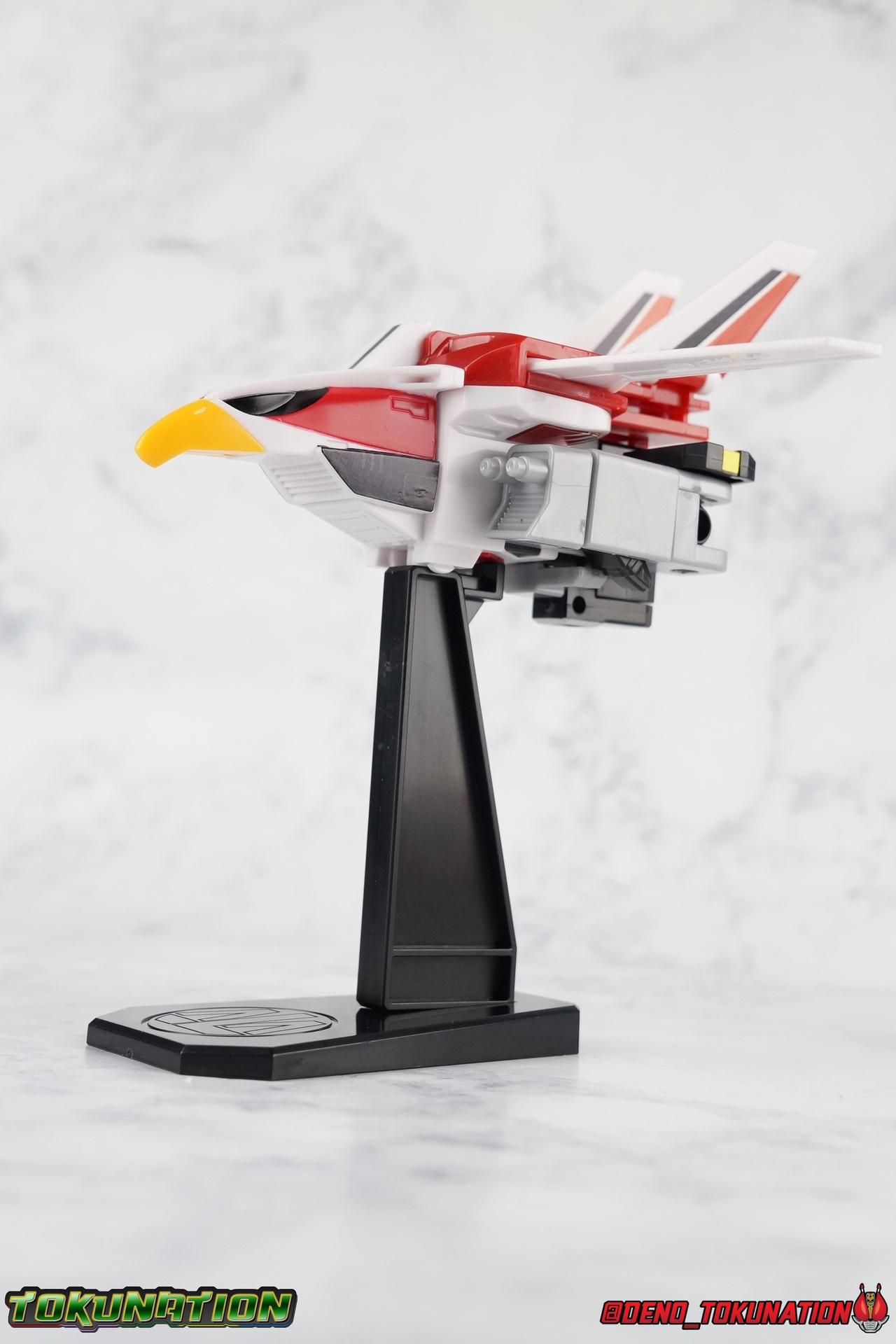 Either of the names Sky Machine or Jet Falcon are acceptable and they've been used interchangeably by Bandai over the years to refer to this machine. The Super Minipla packaging uses the name Sky Machine though so for consistency I'll be using that from here on. I won't be focusing on describing the process to build this figure so much as just it's functionality as an individual once built. I've included extensive step by step photos to build each of the 3 machines so hopefully that should do a better job of explaining the building process than I could. Now like I said in the first post, these Super Minipla are a lot more complex than what customers of the old line have become accustomed to. That means a larger number of parts and a more complex build. However it ALSO means fewer stickers. Because of the line's more collector oriented nature it means that some parts come pre-painted from the factory for you! Often Minipla collector's either choose to paint certain parts (or entire kits) or in order to get that little bit of accuracy that was missing they have to. Thankfully with this line Bandai is opting to paint relevant parts that otherwise be very difficult to sticker up, for you. In Sky Machine's case that means you get both halves of the Jet's bird face as well as the combined Live Robo head. There is a small sticker sheet included to finish detailing up this bad boy, much of which gets applied to the wings and back plate. Sky Machine by far needs more stickers than the other two components but just get yourself some fine tipped tweezers and you'll manage. On it's own the Sky Machine doesn't do much honestly. The tail fins and wings do move, though that's more a by-product of it's transformation than any thing else. The figure actually does have extending bird talons it can stand on too. The grey chunks that become the Live Robo's thighs in combined mode have caps on the end that can be removed, when done you can extend these bird legs out. Though they don't serve a ton of purpose, you have to lean Sky Machine pretty far back to make use of them. However, this piece of the set also includes the parts to make a Display Base! This simple single arm base does wonders for displaying any of the 3 Machines but is primarily meant for Sky Machine. It's a simple plug type base with no poseable arm, but each of the 3 machines has a port that fits it. A port that is also the same size as a Tamashii Stage arm, so you have options. Thankfully the Live Robo Base also has peg hole storage on the side to store the extra fists that come with Land Machine.