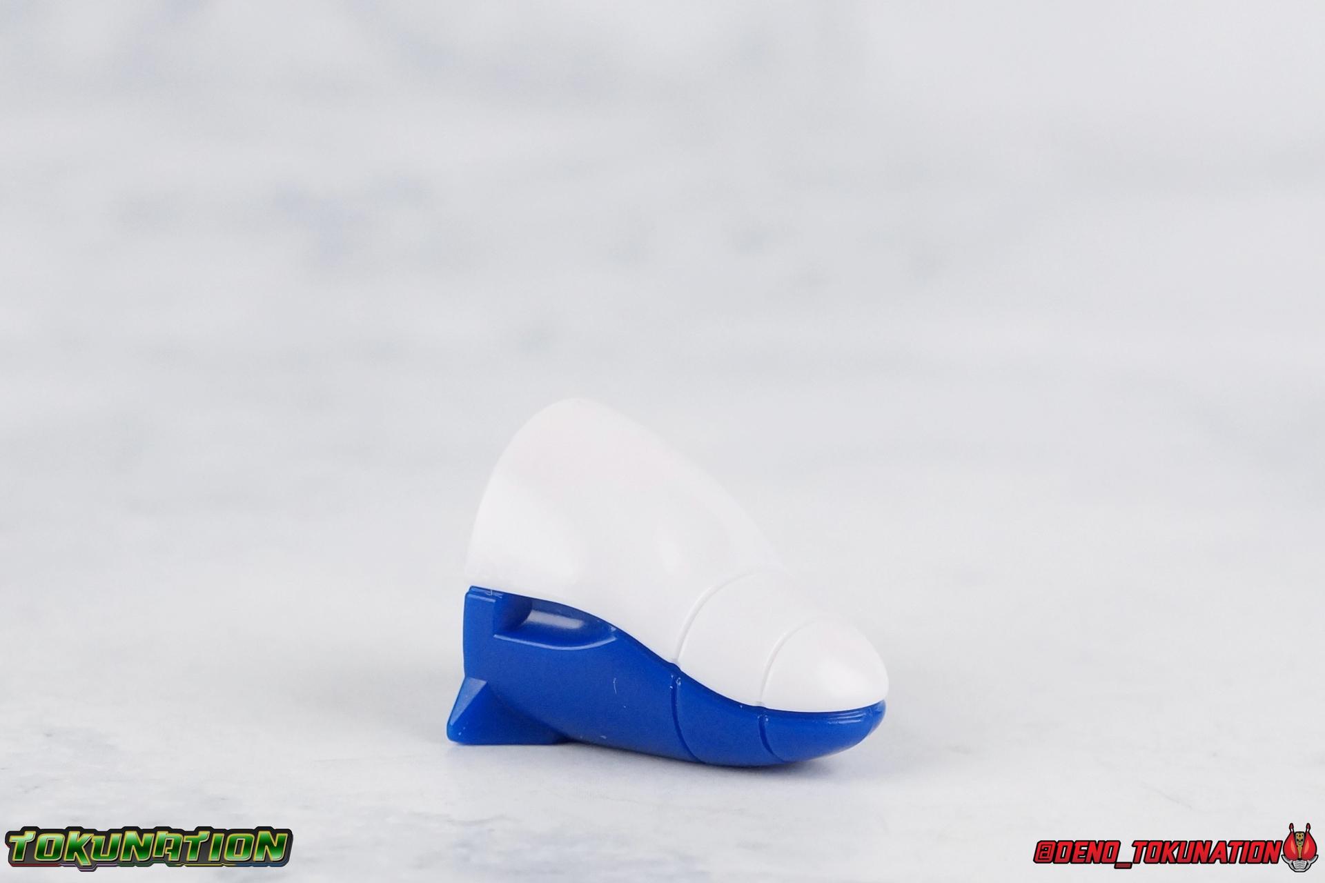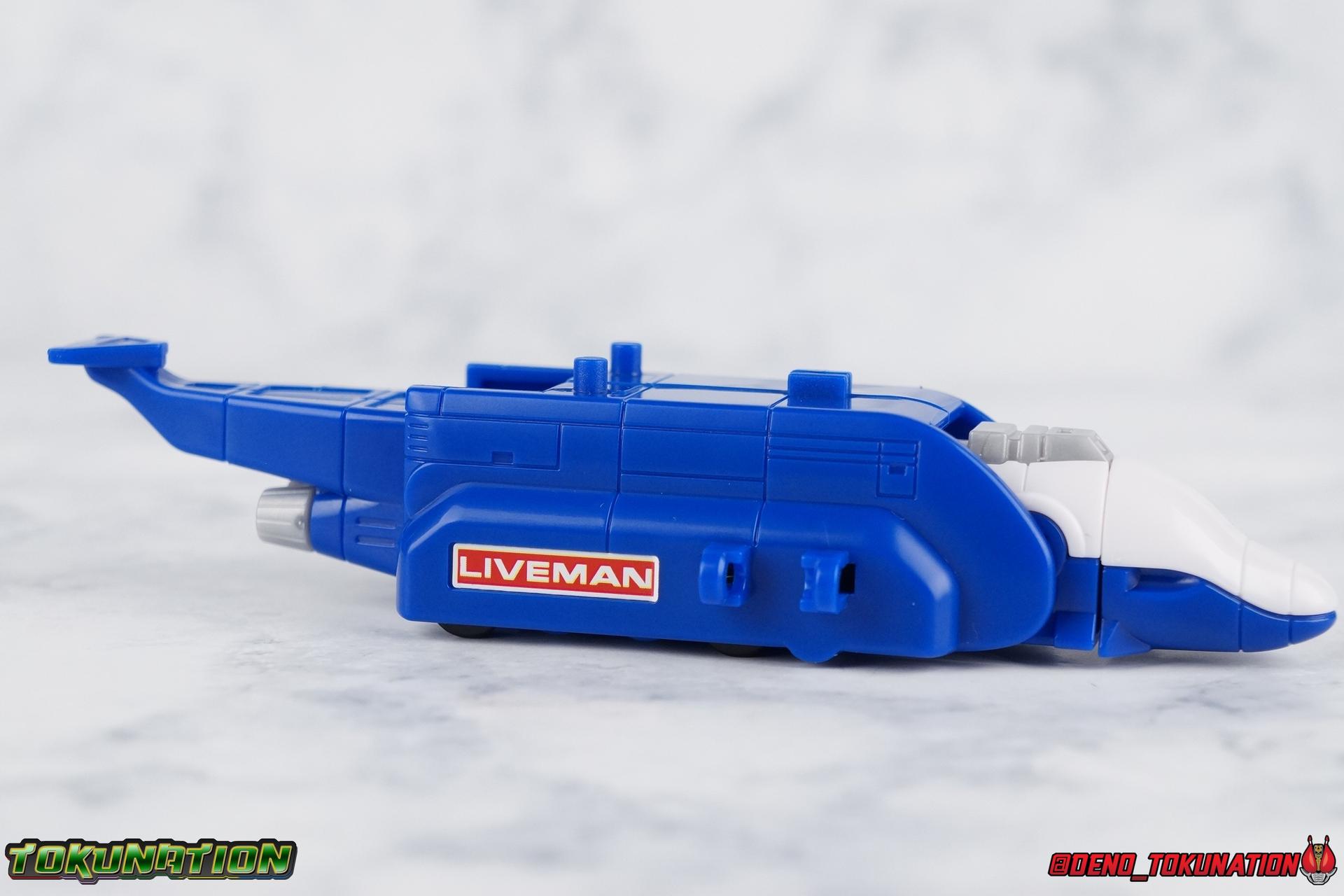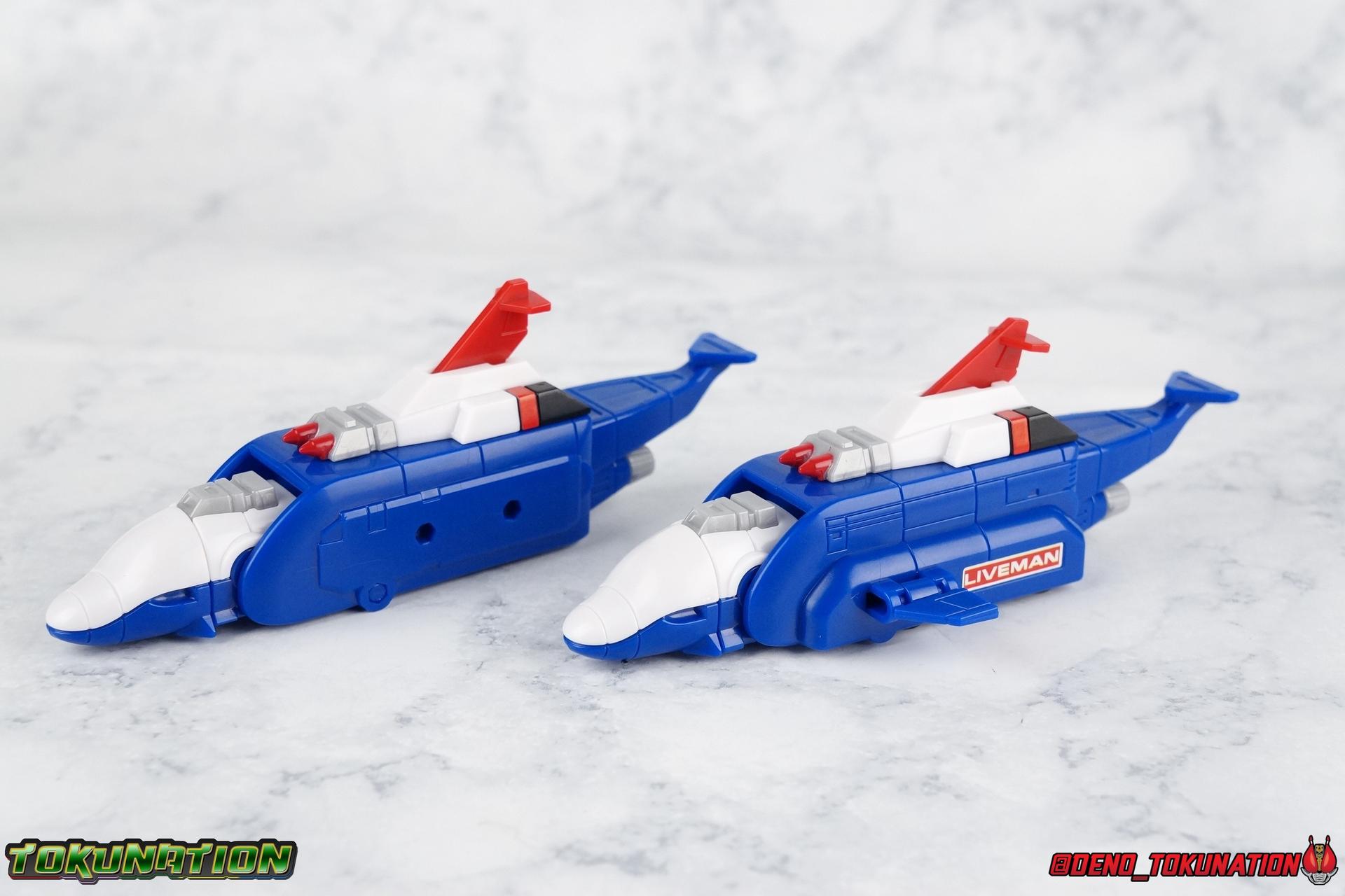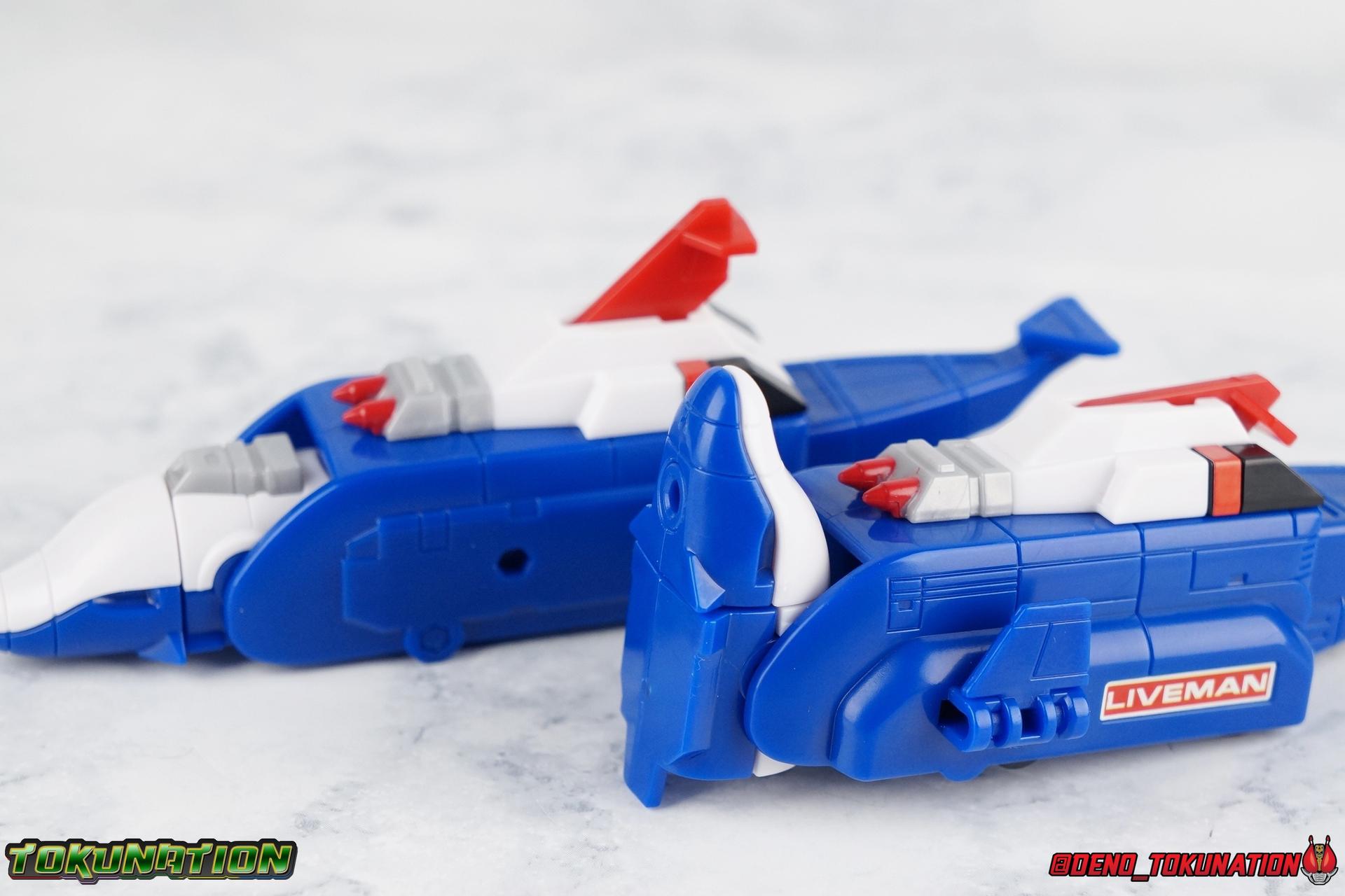 Another case of interchangeable names, use the one you prefer. Perhaps the least exciting of the 3 Machines, Aqua Dolphin was still a really fun build. Like the other two this Machine has some more pre-painted parts, though not nearly as many as the other. Just a couple of red painted missiles on the gray parts sprue. And of course, more candy! Like the others Aqua Machine also comes with another small label sheet, the best of which being the "Liveman" logos for the sides. For Aqua Machine you're basically building two identical dolphin subs that link up with pegs in the center. Some small rolling wheels on each half allow you roll the whole Aqua Machine around a bit when they're connected too. Though there isn't much else to this figure on it's own. Even the hinged fins on the sides are really only for Live Robo. But there's something charming about Aqua as well. It probably has to do with my love for Megumi/Blue Dolphin. By far one of my favorite female rangers ever. You can get Aqua Machine on the Display Base by using the plug hole under the nose of either dolphin as well. The box with Aqua's parts in it also includes the sword for Live Robo but I'll get to that in our final section!
