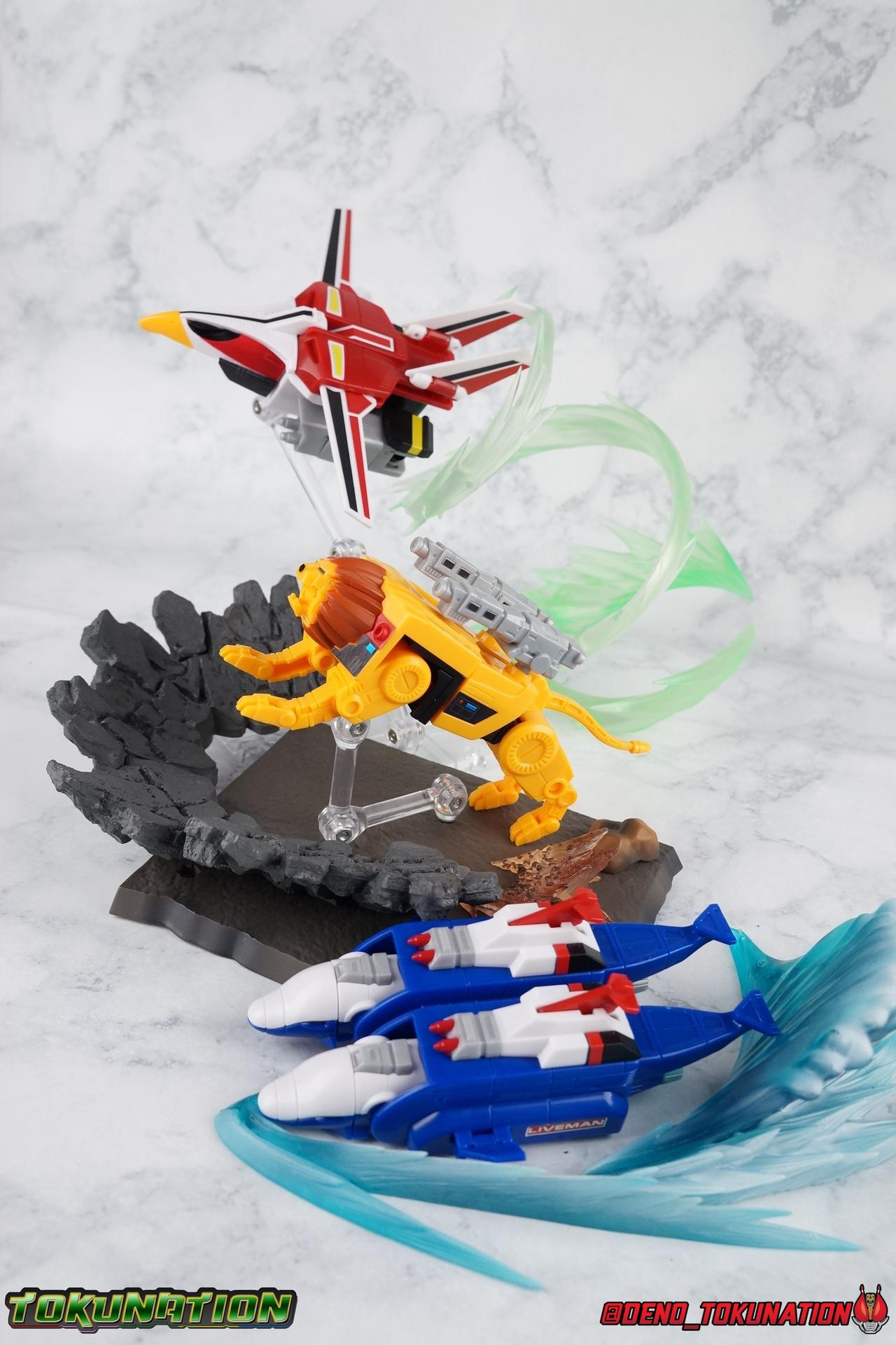 When Bandai originally kicked off it's now incredibly popular Super Minipla line, many fans were suspect about when or if it would move on from Zyuranger. Those releases of courses were made possible because of some demand from western fans and sold very well. But before that line up was even completed we got confirmation that Choujuu Sentai Liveman would be the new line's 2nd series to tackle! Now we even know that the next series up for the treatment is Ninja Sentai Kakuranger! What we're here to look at today however, is what Bandai's brought to the table for Liveman with the Super Minipla Live Robo! ** This thread is broken down into 5 full posts. The review portions will be broken down with each post as well. Scroll through to the one you want to see at any time and enjoy the pics along the way! Now, some preface about what's so "super" about Super Minipla. Traditionally, Minipla have always been a nice cheap alternative to the big DX mecha for kids. These are inexpensive model kit representations of their favorite giant robots that approximate the mecha's looks quite well. Minipla have been produced in one form or another for practically as long as sentai has had giant robos in it. Though the complexity and quality of the main Minipla line we see today, really only began to take shape in the early 2000's, around Dekaranger. Minipla before that era were largely not poseable, only sparsely accessorized, and often gang molded in incredibly simple colors, often missing the mark of the actual suits. In the last decade or so though they've become quite a bit more complex, striking proper balances between show accuracy and playability. But Super Minipla, is a whole different ball game. This line revolutionizes the idea of what Minipla is by making it a high quality and fully complex collector's line. Dedicated to as close to show accuracy as possible, to re-creating transformations as close to show model as possible, and to giving collector's super poseable mini representations of DX toys that would otherwise be impossible to afford. Super Minipla has also covered many things not relating to Super Senai from anime such as GaoGaiGar, Xabungle, Ideon, and more. Essentially this line exists to allows many collectors the chance to own mecha that haven't been available for decades as DX toys, and whose original Minipla are so dated now that they wouldn't even begin to be enjoyable. By tackling these types of figures for Sentai, Bandai has practically struck a gold mine. Collector's are nearly guaranteed to buy poseable and affordable alternatives to toys they don't own but want to. It's genius really. Also, I don't paint or panel line or do anything outside of what the stock instructions give me for model kits. I like to straight build everything, that's just the way I am and I'll always be. If you've ever seen Gundam Build Fighters, think of me like Straight Build Shimon. It's just my thing. Part 1: Packaging Where standard minipla releases will come in case assortment waves with duplicate parts and such, Super Minipla comes in a full series case. Each is divided into an exact number of boxes to complete one full set of the robo you've bought. In the Live Robo's case, that means we get one complete 3 box set packed inside one display shipper. Traditionally a retail store would open a case of standard Minipla and sell each individual box for a set retail price, often only a few hundred yen. So kids could pick and choose which pieces they wanted or needed to finish their mecha of choice. With Super Minipla, this new distribution means you can just buy the whole display and get one complete toy like that. You can still see the perforated markings on the side of the Live Robo Case where it can be opened to sell these components individually, though that won't often be the case with a set like this. The shipper case is just a black & white version of what packaging art we see featured on each of the individual boxes. So it's nice to pull those out and see just how much the color pops after having seen the outer case. Each of the individual boxes is identical save for a tiny number on the top flap of the box denoting which Machine parts it contains. The back side of each box shows off half the combined form of Super Live Robo, a really cool little extra since the individual boxes for the separately sold Live Boxer set, features the other half of this combined form. Each box can be torn open withe the perforated edge on the top or you can just pull the glued flaps apart like I have. It's all in whether you care to keep the boxes or not, I do keep them. Each box contains the instructions needed to build each component of Live Robo and transform it from it's Animal Form to it's piece in the Live Robo Combination. Each box also contains the infamous Minipla Candy. Super sweet and tart white candy in the shape of a clover that's been included in Minipla for as long as I can remember. Honestly I've always liked eating them. Next up, Live Machines!