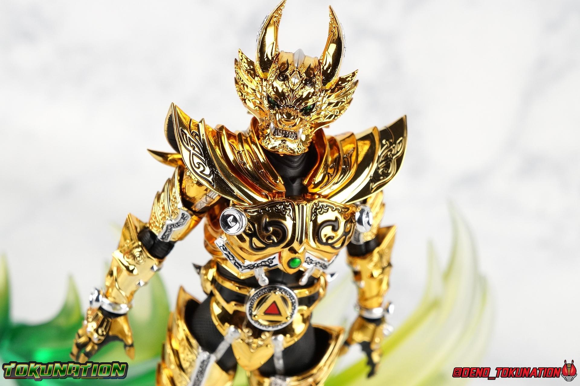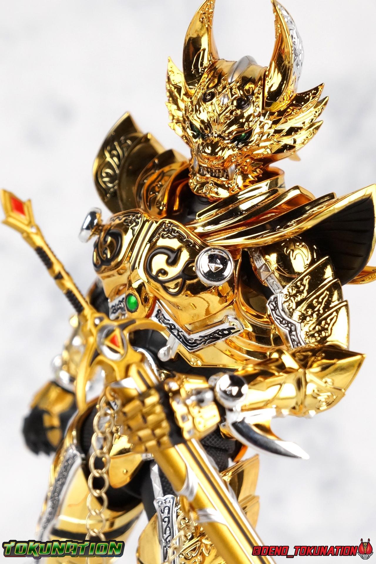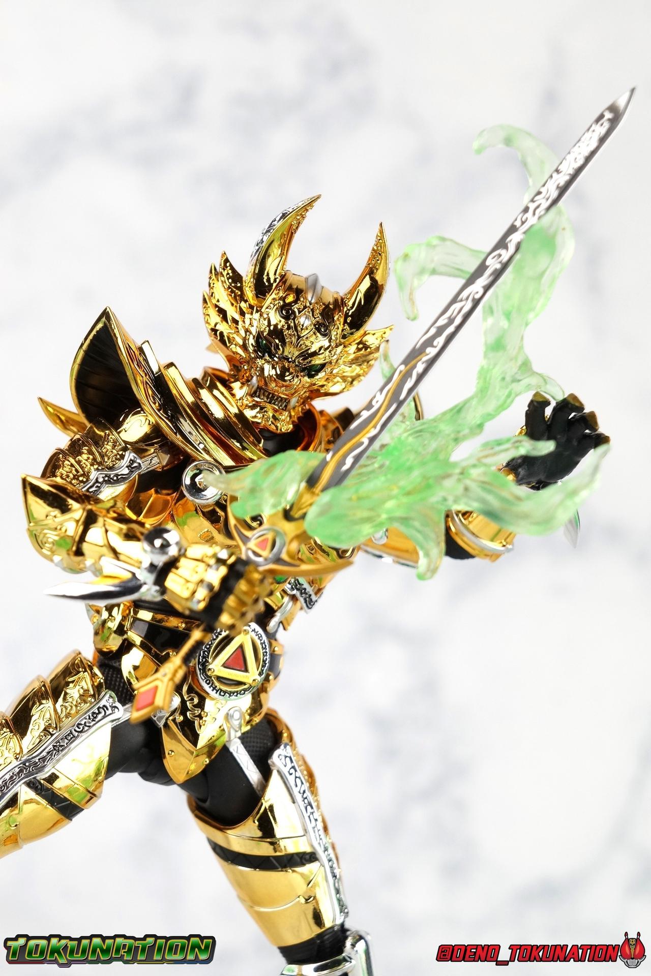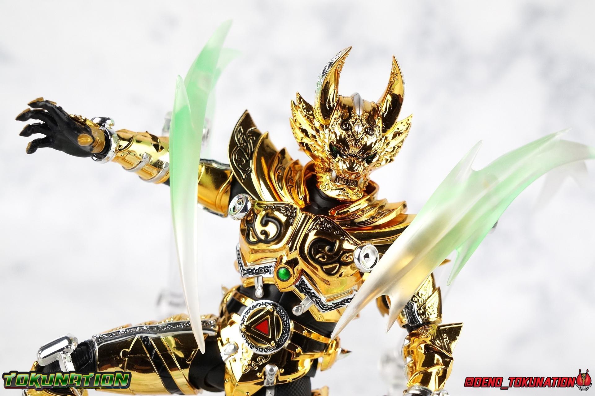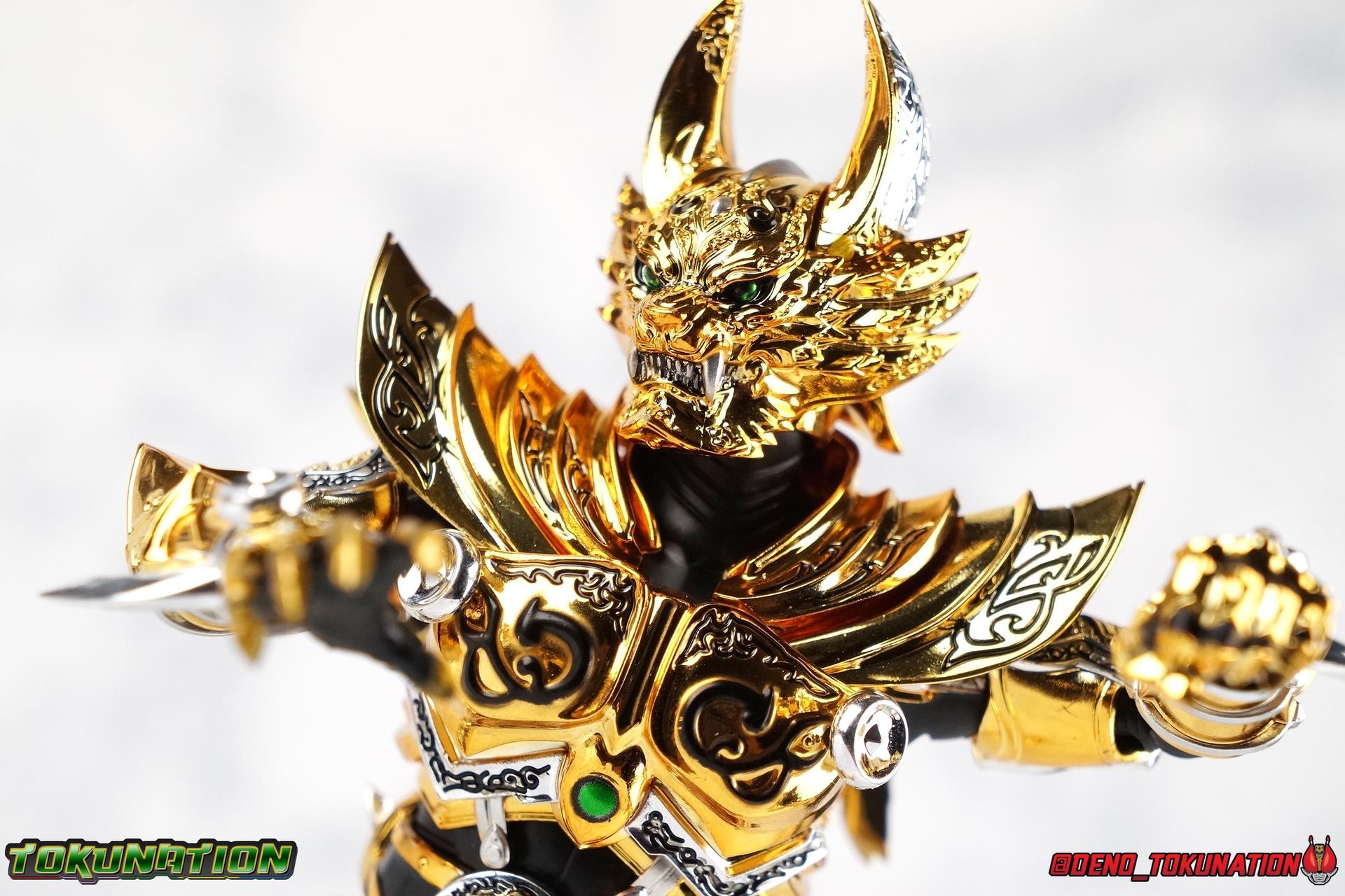 And now, after 7 years, collectors have been given hope with a brand new rendition of the iconic Golden Knight Garo! The original S.H. Figuarts Garo was released in 2011, but it was a terribly flawed and inaccurate release which collector's have complained about for years. Given the insane popularity of Tamashii Nation's high end Kamen Rider renewals in the last few years, it was perhaps only a matter of time before the treatment was applied elsewhere. Now, the first S.H. Figuarts Shinkocchou Seihou release for the Garo franchise has arrived! Packaging Being that Garo is the first non-Kamen Rider to be released in the Shinkocchou Seihou line, his packaging is a really great departure from the norm while keeping the same style. The slipcover box has returned but thankfully we've lost the dull white/black design and gotten a sleek glossy black box this time around. The character art on the front is absolutely gorgeous and the green flames accent it very well. I'm very much in love with the gold foil lettering on the spines of the box as well. While this box is clearly the same as what we've seen before, the presentation of it is greatly improved and really sets this release apart from the others. Main Figure Can I just say "wow"? I haven't been quite this impressed by a new figuart in some time. I've never been a huge fan of the Garo franchise personally. I have so many friends that love it and the various Makai Knights within it. I have attempted to immerse myself in it more than once over the last decade as well. But I have never found a compelling reason to actively like these shows. Bearing that in mind, can I admit that Shinkocchou Seihou Garo is one of my favorite figures ever? Because it actually really is. If that's not a winning endorsement, I doubt you'll find one better. Seihou Garo truly is the renewal collectors and fans have waited for over the better part of a decade. Functionally the old figure was pretty lackluster, but it wasn't even just that, visually the details were wrong, the armor the wrong color, some features were just missing entirely. The Seihou fixes all of the issues. The most striking change is of course the glorious golden chrome paint application over the entire armor, along with some extra silver accents. The armor is extremely shiny and the finish is very crisp. Every surface detail that can be covered in this gold is. Connecting moving joints are not where necessary. But literally anything else that can be, is. The entire armor is also ornately detailed. Every single detail is immaculately recreated here. Every etching, every line, everything. I'm just so massively impressed by it. On to a bit of how the figure works, it's imperfect, but a vast improvement on the original. The armor is big and bulky, but surprisingly there's much more flexibility to the joints than you'd imagine. The ankles are fantastically unhindered, while the knees can only bend about 90 degrees. The hips leave a little bit to be desired though. They can angle out just fine, but pulling them forward and back inevitably hits the waist armor meaning you lose a small bit of movement. I appreciate that the silver details on the hips are not painted chrome but molded in silver along with the black parts so there won't be any chrome where there. However the actual waist is two separate pieces of armor, chrome on top of chrome, so that really scares me for the future. As mentioned before, the details on this thing are indescribably nice. The upper body is just a spectacle, especially the back plate. And while it may not look like it, the upper bod floats on the lower torso quite well, and luckily the details on the interior part are painted in flat silver and gold rather than chrome so no scraping concerns. The arms are actually pretty ingenious as well, despite having so many protrusions you aren't going to draw blood trying to put new hands on him. The wrists are nice and unrestricted, the elbows actually bend very nicely and have a weird rotational joint built in so they can swivel a bit too. The bicep also features a swivel and the shoulder joint itself is wide open so the arms can freely move. And why are they so free? The shoulder armor is hinged. The plates that make up the shoulder and neck armor are jointed and can move up and down depending on where you need them in relation ot the actual shoulder. It's frankly brilliant. At one time Bandai even stated that this sliding armor gimmick is what had kept the figure in limbo for a while as they perfected it. Well damn they perfected it alright. Finally, Garo's head is a magnificent recreation of this hero's fierce visage. Thanks to the chrome gold and silver applications, punctuated by those piercing green eyes, and the black paint wash that brings out the minor details, Garo's face has come alive. Accessories Garo comes with most of what he needs, missing at least one key item that I'm disappointed about: 3 - sets of hands. That's one open set for action poses, 1 set used to hold the sword, and 1 set specifically for holding the sword scabbard instead. 1 - Garoken Scabbard. This is a bit of a dummy accessory which is disappointing. The scabbard has a nice metal chain which I appreciate, but the sword grip sticking out of it is a dummy accessory. The grip can be removed to simulate the sword being removed. But the sword itself cannot actually be put in the scabbard. I'm kind of baffled as to why. Numerous, *numerous*, Garo figures in the long running Makai Kado line from Bandai have had fully functional scabbards. It's just silly that this one isn't despite it clearly being the right size to house a sword. 1 - Garoken. Garo's signature weapon is ornately detailed along the handle and blade. While many counterparts to this weapon in the Makai Kado line feature die cast for weight, I'm quite glad this one doesn't. The wrists are fairly strong but they couldn't hold up to that kind of weight. I've included a couple images of Seihou Garo h