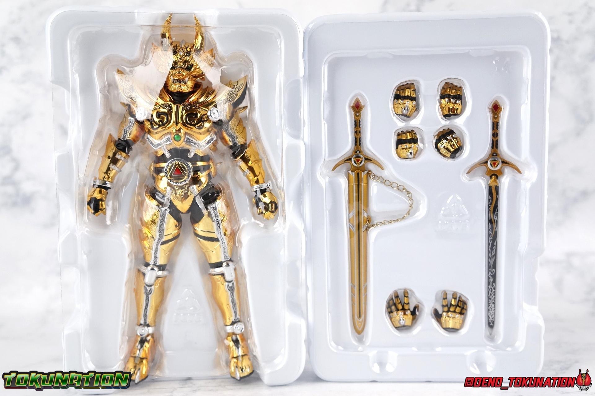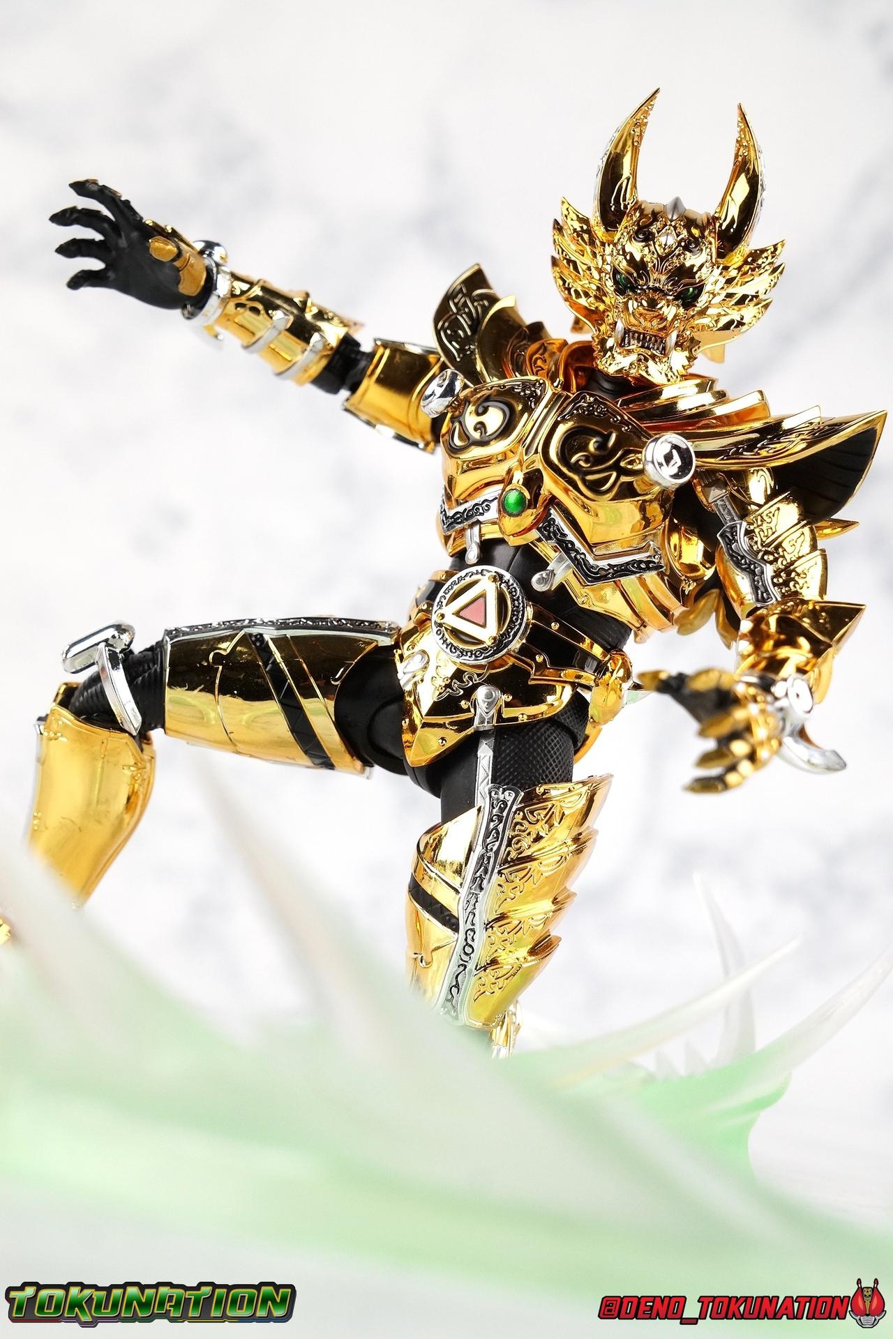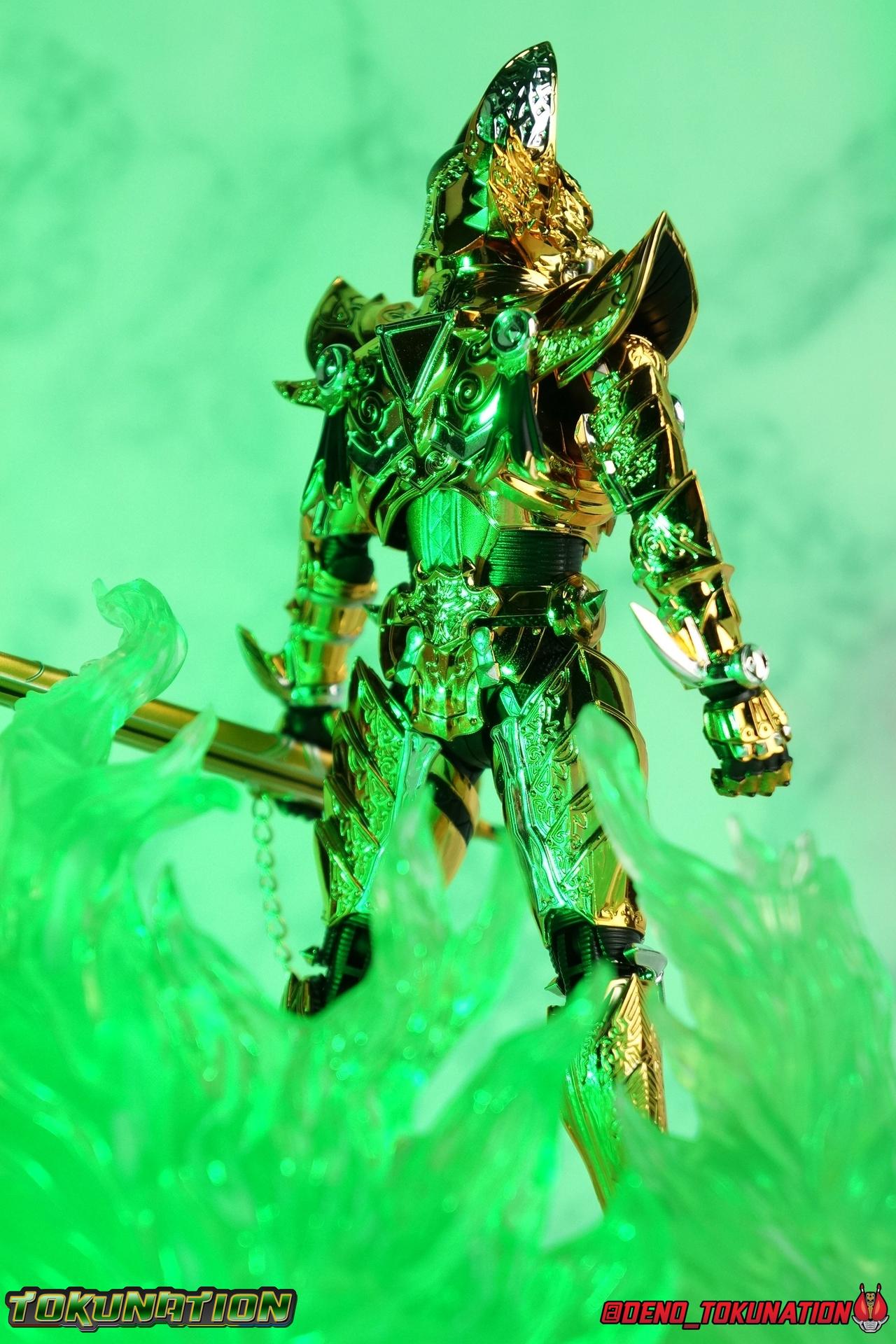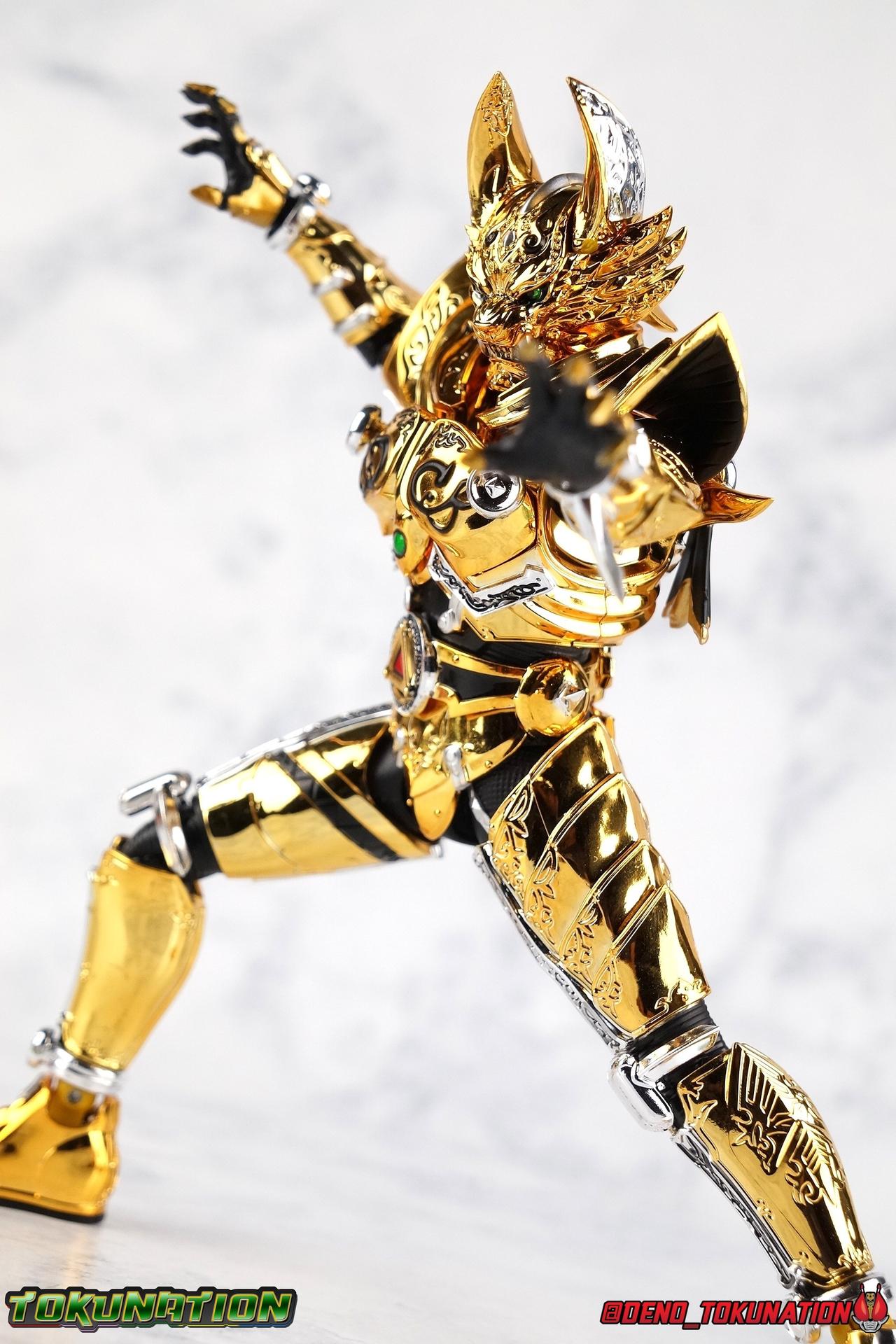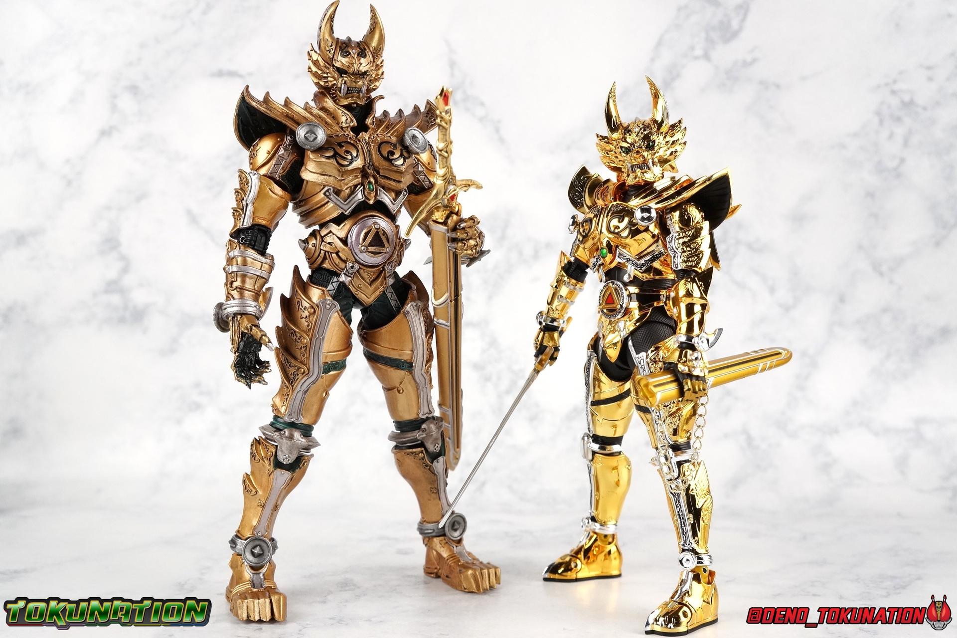 And now, after 7 years, collectors have been given hope with a brand new rendition of the iconic Golden Knight Garo! The original S.H. Figuarts Garo was released in 2011, but it was a terribly flawed and inaccurate release which collector's have complained about for years. Given the insane popularity of Tamashii Nation's high end Kamen Rider renewals in the last few years, it was perhaps only a matter of time before the treatment was applied elsewhere. Now, the first S.H. Figuarts Shinkocchou Seihou release for the Garo franchise has arrived! Packaging Being that Garo is the first non-Kamen Rider to be released in the Shinkocchou Seihou line, his packaging is a really great departure from the norm while keeping the same style. The slipcover box has returned but thankfully we've lost the dull white/black design and gotten a sleek glossy black box this time around. The character art on the front is absolutely gorgeous and the green flames accent it very well. I'm very much in love with the gold foil lettering on the spines of the box as well. While this box is clearly the same as what we've seen before, the presentation of it is greatly improved and really sets this release apart from the others. Main Figure Can I just say "wow"? I haven't been quite this impressed by a new figuart in some time. I've never been a huge fan of the Garo franchise personally. I have so many friends that love it and the various Makai Knights within it. I have attempted to immerse myself in it more than once over the last decade as well. But I have never found a compelling reason to actively like these shows. Bearing that in mind, can I admit that Shinkocchou Seihou Garo is one of my favorite figures ever? Because it actually really is. If that's not a winning endorsement, I doubt you'll find one better. Seihou Garo truly is the renewal collectors and fans have waited for over the better part of a decade. Functionally the old figure was pretty lackluster, but it wasn't even just that, visually the details were wrong, the armor the wrong color, some features were just missing entirely. The Seihou fixes all of the issues. The most striking change is of course the glorious golden chrome paint application over the entire armor, along with some extra silver accents. The armor is extremely shiny and the finish is very crisp. Every surface detail that can be covered in this gold is. Connecting moving joints are not where necessary. But literally anything else that can be, is. The entire armor is also ornately detailed. Every single detail is immaculately recreated here. Every etching, every line, everything. I'm just so massively impressed by it. On to a bit of how the figure works, it's imperfect, but a vast improvement on the original. The armor is big and bulky, but surprisingly there's much more flexibility to the joints than you'd imagine. The ankles are fantastically unhindered, while the knees can only bend about 90 degrees. The hips leave a little bit to be desired though. They can angle out just fine, but pulling them forward and back inevitably hits the waist armor meaning you lose a small bit of movement. I appreciate that the silver details on the hips are not painted chrome but molded in silver along with the black parts so there won't be any chrome where there. However the actual waist is two separate pieces of armor, chrome on top of chrome, so that really scares me for the future. As mentioned before, the details on this thing are indescribably nice. The upper body is just a spectacle, especially the back plate. And while it may not look like it, the upper bod floats on the lower torso quite well, and luckily the details on the interior part are painted in flat silver and gold rather than chrome so no scraping concerns. The arms are actually pretty ingenious as well, despite having so many protrusions you aren't going to draw blood trying to put new hands on him. The wrists are nice and unrestricted, the elbows actually bend very nicely and have a weird rotational joint built in so they can swivel a bit too. The bicep also features a swivel and the shoulder joint itself is wide open so the arms can freely move. And why are they so free? The shoulder armor is hinged. The plates that make up the shoulder and neck armor are jointed and can move up and down depending on where you need them in relation ot the actual shoulder. It's frankly brilliant. At one time Bandai even stated that this sliding armor gimmick is what had kept the figure in limbo for a while as they perfected it. Well damn they perfected it alright. Finally, Garo's head is a magnificent recreation of this hero's fierce visage. Thanks to the chrome gold and silver applications, punctuated by those piercing green eyes, and the black paint wash that brings out the minor details, Garo's face has come alive. Accessories Garo comes with most of what he needs, missing at least one key item that I'm disappointed about: 3 - sets of hands. That's one open set for action poses, 1 set used to hold the sword, and 1 set specifically for holding the sword scabbard instead. 1 - Garoken Scabbard. This is a bit of a dummy accessory which is disappointing. The scabbard has a nice metal chain which I appreciate, but the sword grip sticking out of it is a dummy accessory. The grip can be removed to simulate the sword being removed. But the sword itself cannot actually be put in the scabbard. I'm kind of baffled as to why. Numerous, *numerous*, Garo figures in the long running Makai Kado line from Bandai have had fully functional scabbards. It's just silly that this one isn't despite it clearly being the right size to house a sword. 1 - Garoken. Garo's signature weapon is ornately detailed along the handle and blade. While many counterparts to this weapon in the Makai Kado line feature die cast for weight, I'm quite glad this one doesn't. The wrists are fairly strong but they couldn't hold up to that kind of weight. I've included a couple images of Seihou Garo h