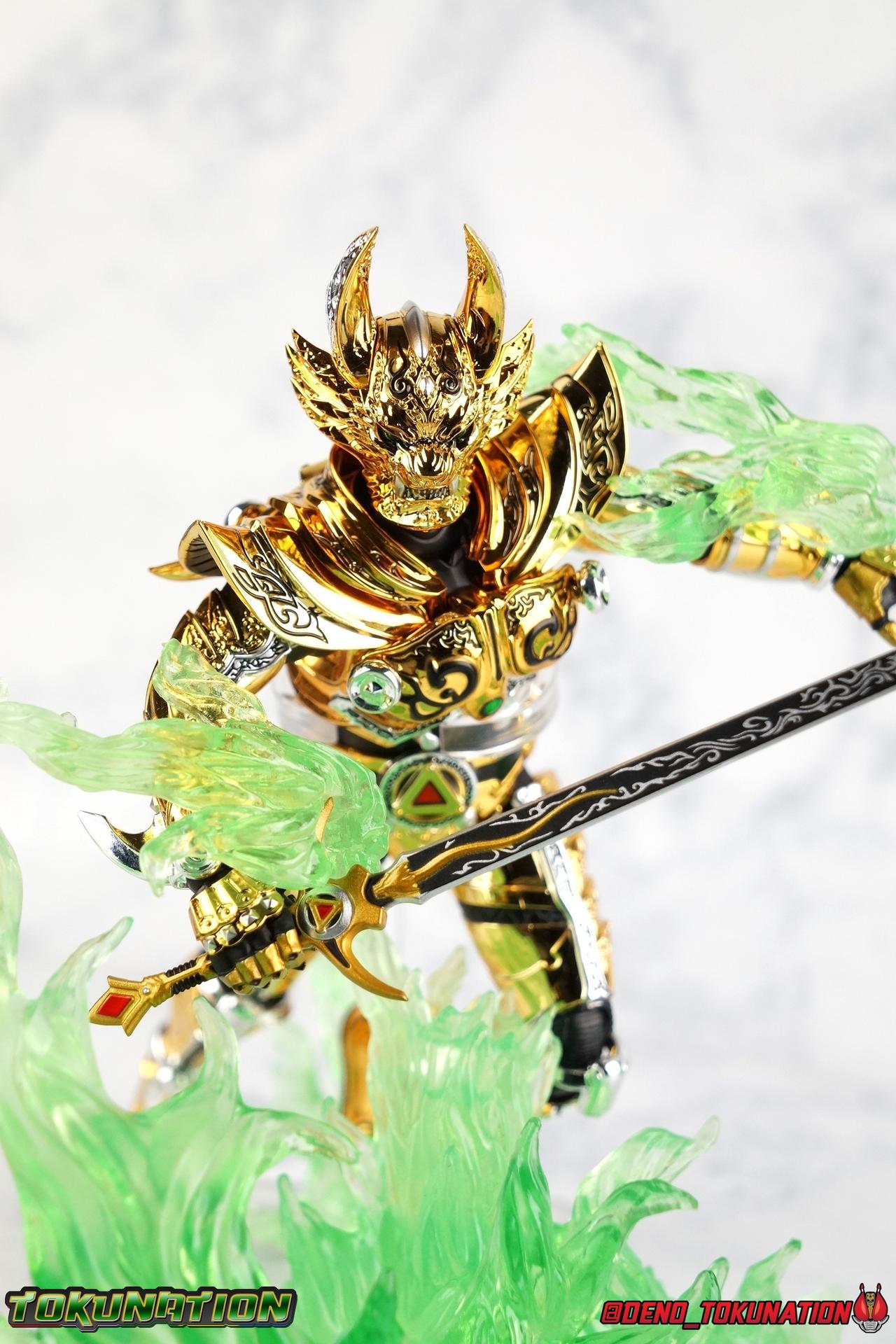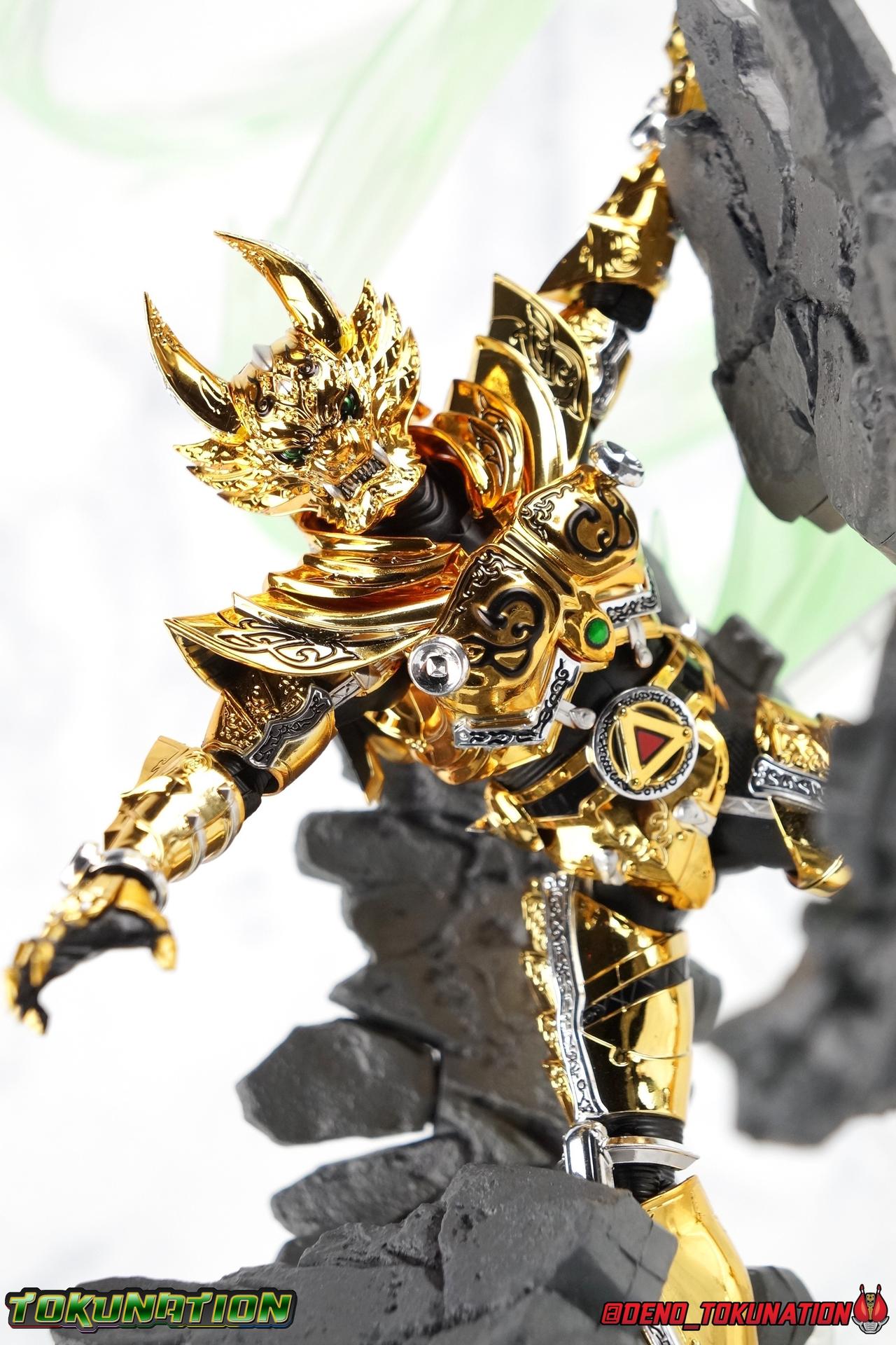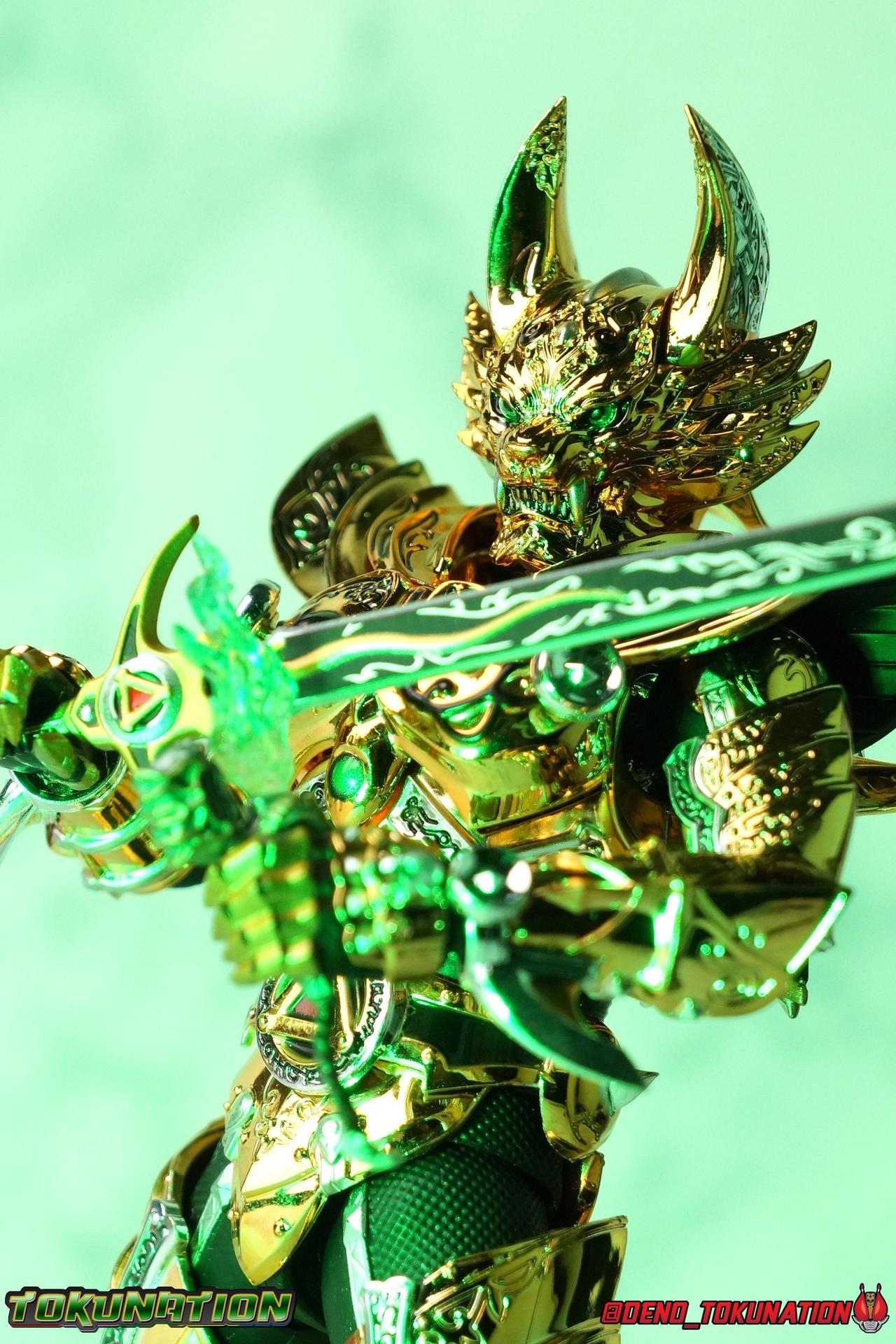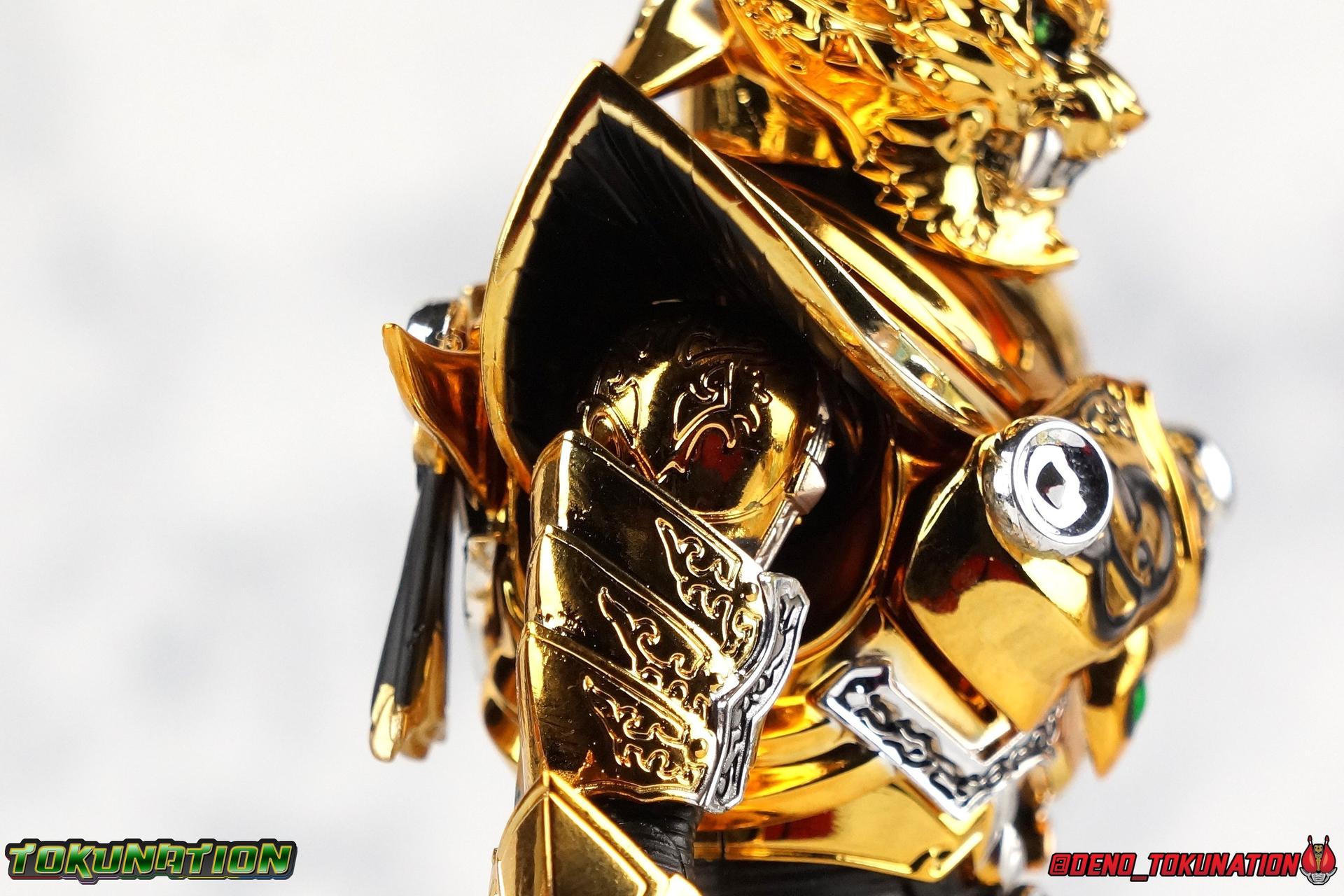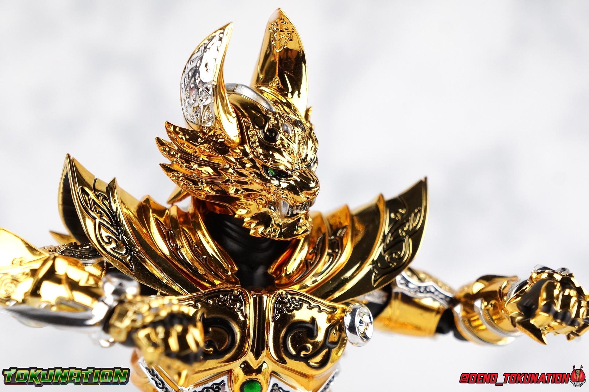 And now, after 7 years, collectors have been given hope with a brand new rendition of the iconic Golden Knight Garo! The original S.H. Figuarts Garo was released in 2011, but it was a terribly flawed and inaccurate release which collector's have complained about for years. Given the insane popularity of Tamashii Nation's high end Kamen Rider renewals in the last few years, it was perhaps only a matter of time before the treatment was applied elsewhere. Now, the first S.H. Figuarts Shinkocchou Seihou release for the Garo franchise has arrived! Packaging Being that Garo is the first non-Kamen Rider to be released in the Shinkocchou Seihou line, his packaging is a really great departure from the norm while keeping the same style. The slipcover box has returned but thankfully we've lost the dull white/black design and gotten a sleek glossy black box this time around. The character art on the front is absolutely gorgeous and the green flames accent it very well. I'm very much in love with the gold foil lettering on the spines of the box as well. While this box is clearly the same as what we've seen before, the presentation of it is greatly improved and really sets this release apart from the others. Main Figure Can I just say "wow"? I haven't been quite this impressed by a new figuart in some time. I've never been a huge fan of the Garo franchise personally. I have so many friends that love it and the various Makai Knights within it. I have attempted to immerse myself in it more than once over the last decade as well. But I have never found a compelling reason to actively like these shows. Bearing that in mind, can I admit that Shinkocchou Seihou Garo is one of my favorite figures ever? Because it actually really is. If that's not a winning endorsement, I doubt you'll find one better. Seihou Garo truly is the renewal collectors and fans have waited for over the better part of a decade. Functionally the old figure was pretty lackluster, but it wasn't even just that, visually the details were wrong, the armor the wrong color, some features were just missing entirely. The Seihou fixes all of the issues. The most striking change is of course the glorious golden chrome paint application over the entire armor, along with some extra silver accents. The armor is extremely shiny and the finish is very crisp. Every surface detail that can be covered in this gold is. Connecting moving joints are not where necessary. But literally anything else that can be, is. The entire armor is also ornately detailed. Every single detail is immaculately recreated here. Every etching, every line, everything. I'm just so massively impressed by it. On to a bit of how the figure works, it's imperfect, but a vast improvement on the original. The armor is big and bulky, but surprisingly there's much more flexibility to the joints than you'd imagine. The ankles are fantastically unhindered, while the knees can only bend about 90 degrees. The hips leave a little bit to be desired though. They can angle out just fine, but pulling them forward and back inevitably hits the waist armor meaning you lose a small bit of movement. I appreciate that the silver details on the hips are not painted chrome but molded in silver along with the black parts so there won't be any chrome where there. However the actual waist is two separate pieces of armor, chrome on top of chrome, so that really scares me for the future. As mentioned before, the details on this thing are indescribably nice. The upper body is just a spectacle, especially the back plate. And while it may not look like it, the upper bod floats on the lower torso quite well, and luckily the details on the interior part are painted in flat silver and gold rather than chrome so no scraping concerns. The arms are actually pretty ingenious as well, despite having so many protrusions you aren't going to draw blood trying to put new hands on him. The wrists are nice and unrestricted, the elbows actually bend very nicely and have a weird rotational joint built in so they can swivel a bit too. The bicep also features a swivel and the shoulder joint itself is wide open so the arms can freely move. And why are they so free? The shoulder armor is hinged. The plates that make up the shoulder and neck armor are jointed and can move up and down depending on where you need them in relation ot the actual shoulder. It's frankly brilliant. At one time Bandai even stated that this sliding armor gimmick is what had kept the figure in limbo for a while as they perfected it. Well damn they perfected it alright. Finally, Garo's head is a magnificent recreation of this hero's fierce visage. Thanks to the chrome gold and silver applications, punctuated by those piercing green eyes, and the black paint wash that brings out the minor details, Garo's face has come alive. Accessories Garo comes with most of what he needs, missing at least one key item that I'm disappointed about: 3 - sets of hands. That's one open set for action poses, 1 set used to hold the sword, and 1 set specifically for holding the sword scabbard instead. 1 - Garoken Scabbard. This is a bit of a dummy accessory which is disappointing. The scabbard has a nice metal chain which I appreciate, but the sword grip sticking out of it is a dummy accessory. The grip can be removed to simulate the sword being removed. But the sword itself cannot actually be put in the scabbard. I'm kind of baffled as to why. Numerous, *numerous*, Garo figures in the long running Makai Kado line from Bandai have had fully functional scabbards. It's just silly that this one isn't despite it clearly being the right size to house a sword. 1 - Garoken. Garo's signature weapon is ornately detailed along the handle and blade. While many counterparts to this weapon in the Makai Kado line feature die cast for weight, I'm quite glad this one doesn't. The wrists are fairly strong but they couldn't hold up to that kind of weight. I've included a couple images of Seihou Garo h