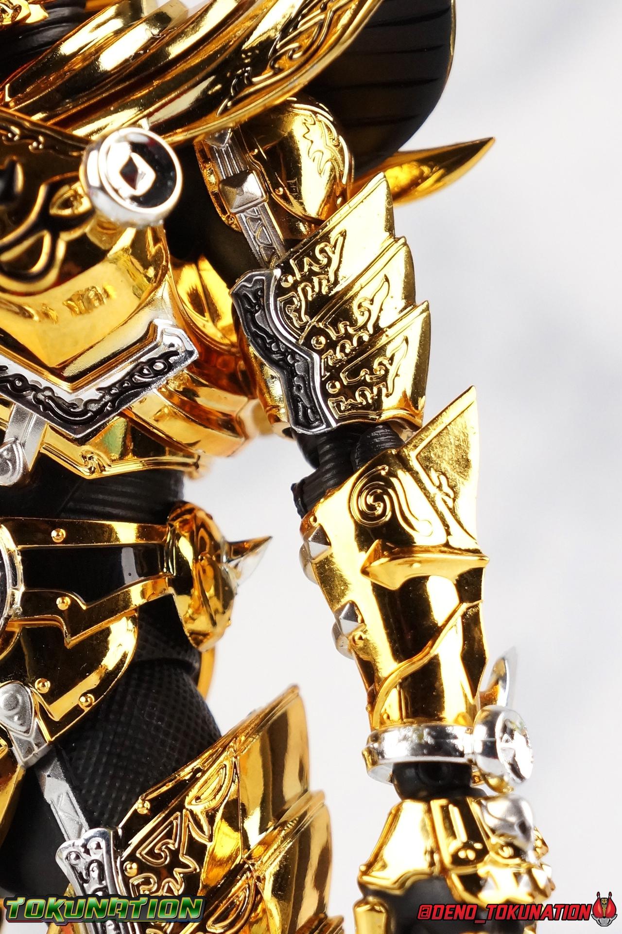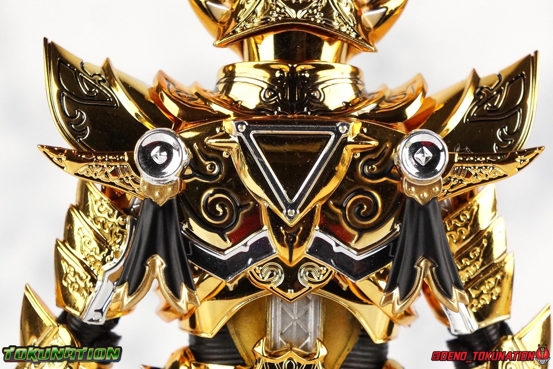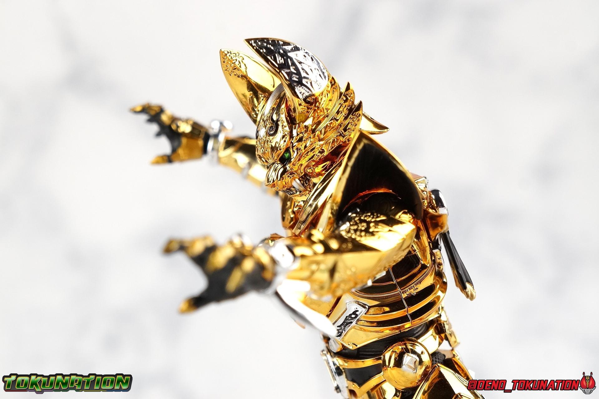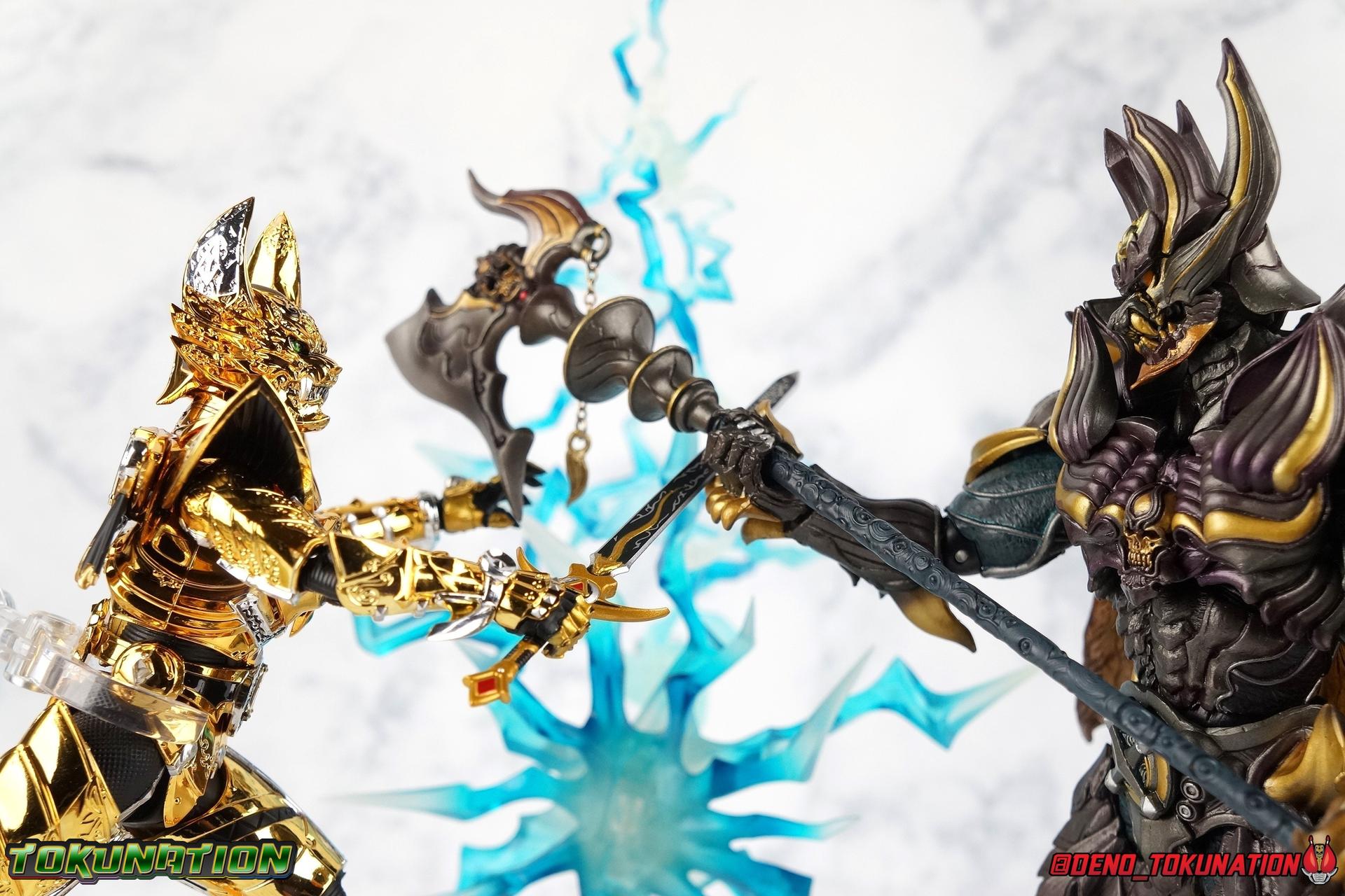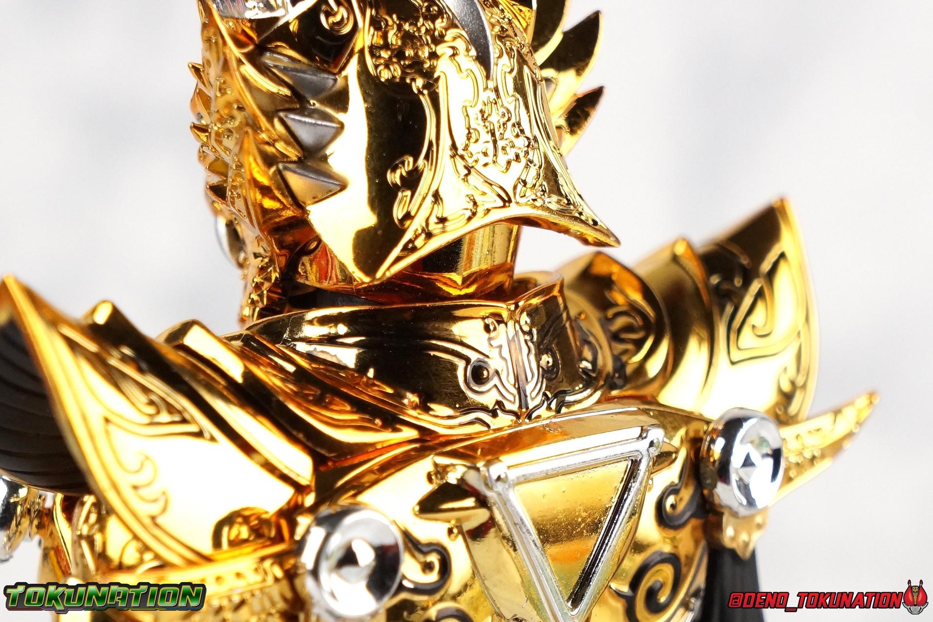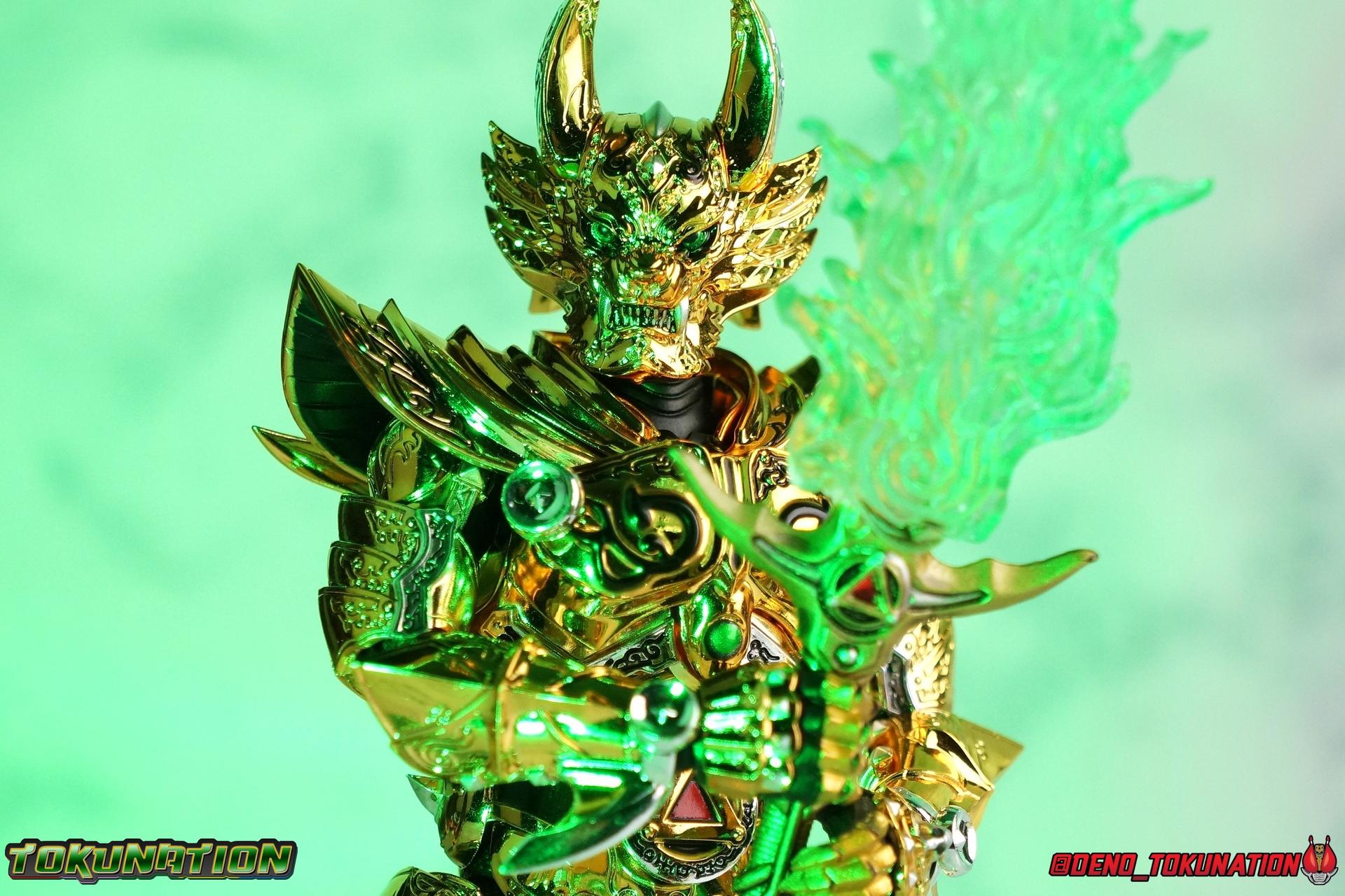 And now, after 7 years, collectors have been given hope with a brand new rendition of the iconic Golden Knight Garo! The original S.H. Figuarts Garo was released in 2011, but it was a terribly flawed and inaccurate release which collector's have complained about for years. Given the insane popularity of Tamashii Nation's high end Kamen Rider renewals in the last few years, it was perhaps only a matter of time before the treatment was applied elsewhere. Now, the first S.H. Figuarts Shinkocchou Seihou release for the Garo franchise has arrived! Packaging Being that Garo is the first non-Kamen Rider to be released in the Shinkocchou Seihou line, his packaging is a really great departure from the norm while keeping the same style. The slipcover box has returned but thankfully we've lost the dull white/black design and gotten a sleek glossy black box this time around. The character art on the front is absolutely gorgeous and the green flames accent it very well. I'm very much in love with the gold foil lettering on the spines of the box as well. While this box is clearly the same as what we've seen before, the presentation of it is greatly improved and really sets this release apart from the others. Main Figure Can I just say "wow"? I haven't been quite this impressed by a new figuart in some time. I've never been a huge fan of the Garo franchise personally. I have so many friends that love it and the various Makai Knights within it. I have attempted to immerse myself in it more than once over the last decade as well. But I have never found a compelling reason to actively like these shows. Bearing that in mind, can I admit that Shinkocchou Seihou Garo is one of my favorite figures ever? Because it actually really is. If that's not a winning endorsement, I doubt you'll find one better. Seihou Garo truly is the renewal collectors and fans have waited for over the better part of a decade. Functionally the old figure was pretty lackluster, but it wasn't even just that, visually the details were wrong, the armor the wrong color, some features were just missing entirely. The Seihou fixes all of the issues. The most striking change is of course the glorious golden chrome paint application over the entire armor, along with some extra silver accents. The armor is extremely shiny and the finish is very crisp. Every surface detail that can be covered in this gold is. Connecting moving joints are not where necessary. But literally anything else that can be, is. The entire armor is also ornately detailed. Every single detail is immaculately recreated here. Every etching, every line, everything. I'm just so massively impressed by it. On to a bit of how the figure works, it's imperfect, but a vast improvement on the original. The armor is big and bulky, but surprisingly there's much more flexibility to the joints than you'd imagine. The ankles are fantastically unhindered, while the knees can only bend about 90 degrees. The hips leave a little bit to be desired though. They can angle out just fine, but pulling them forward and back inevitably hits the waist armor meaning you lose a small bit of movement. I appreciate that the silver details on the hips are not painted chrome but molded in silver along with the black parts so there won't be any chrome where there. However the actual waist is two separate pieces of armor, chrome on top of chrome, so that really scares me for the future. As mentioned before, the details on this thing are indescribably nice. The upper body is just a spectacle, especially the back plate. And while it may not look like it, the upper bod floats on the lower torso quite well, and luckily the details on the interior part are painted in flat silver and gold rather than chrome so no scraping concerns. The arms are actually pretty ingenious as well, despite having so many protrusions you aren't going to draw blood trying to put new hands on him. The wrists are nice and unrestricted, the elbows actually bend very nicely and have a weird rotational joint built in so they can swivel a bit too. The bicep also features a swivel and the shoulder joint itself is wide open so the arms can freely move. And why are they so free? The shoulder armor is hinged. The plates that make up the shoulder and neck armor are jointed and can move up and down depending on where you need them in relation ot the actual shoulder. It's frankly brilliant. At one time Bandai even stated that this sliding armor gimmick is what had kept the figure in limbo for a while as they perfected it. Well damn they perfected it alright. Finally, Garo's head is a magnificent recreation of this hero's fierce visage. Thanks to the chrome gold and silver applications, punctuated by those piercing green eyes, and the black paint wash that brings out the minor details, Garo's face has come alive. Accessories Garo comes with most of what he needs, missing at least one key item that I'm disappointed about: 3 - sets of hands. That's one open set for action poses, 1 set used to hold the sword, and 1 set specifically for holding the sword scabbard instead. 1 - Garoken Scabbard. This is a bit of a dummy accessory which is disappointing. The scabbard has a nice metal chain which I appreciate, but the sword grip sticking out of it is a dummy accessory. The grip can be removed to simulate the sword being removed. But the sword itself cannot actually be put in the scabbard. I'm kind of baffled as to why. Numerous, *numerous*, Garo figures in the long running Makai Kado line from Bandai have had fully functional scabbards. It's just silly that this one isn't despite it clearly being the right size to house a sword. 1 - Garoken. Garo's signature weapon is ornately detailed along the handle and blade. While many counterparts to this weapon in the Makai Kado line feature die cast for weight, I'm quite glad this one doesn't. The wrists are fairly strong but they couldn't hold up to that kind of weight. I've included a couple images of Seihou Garo h