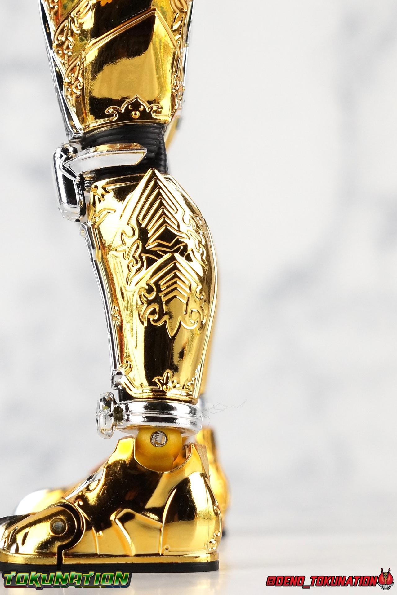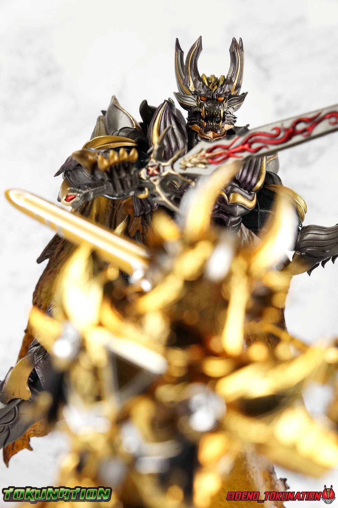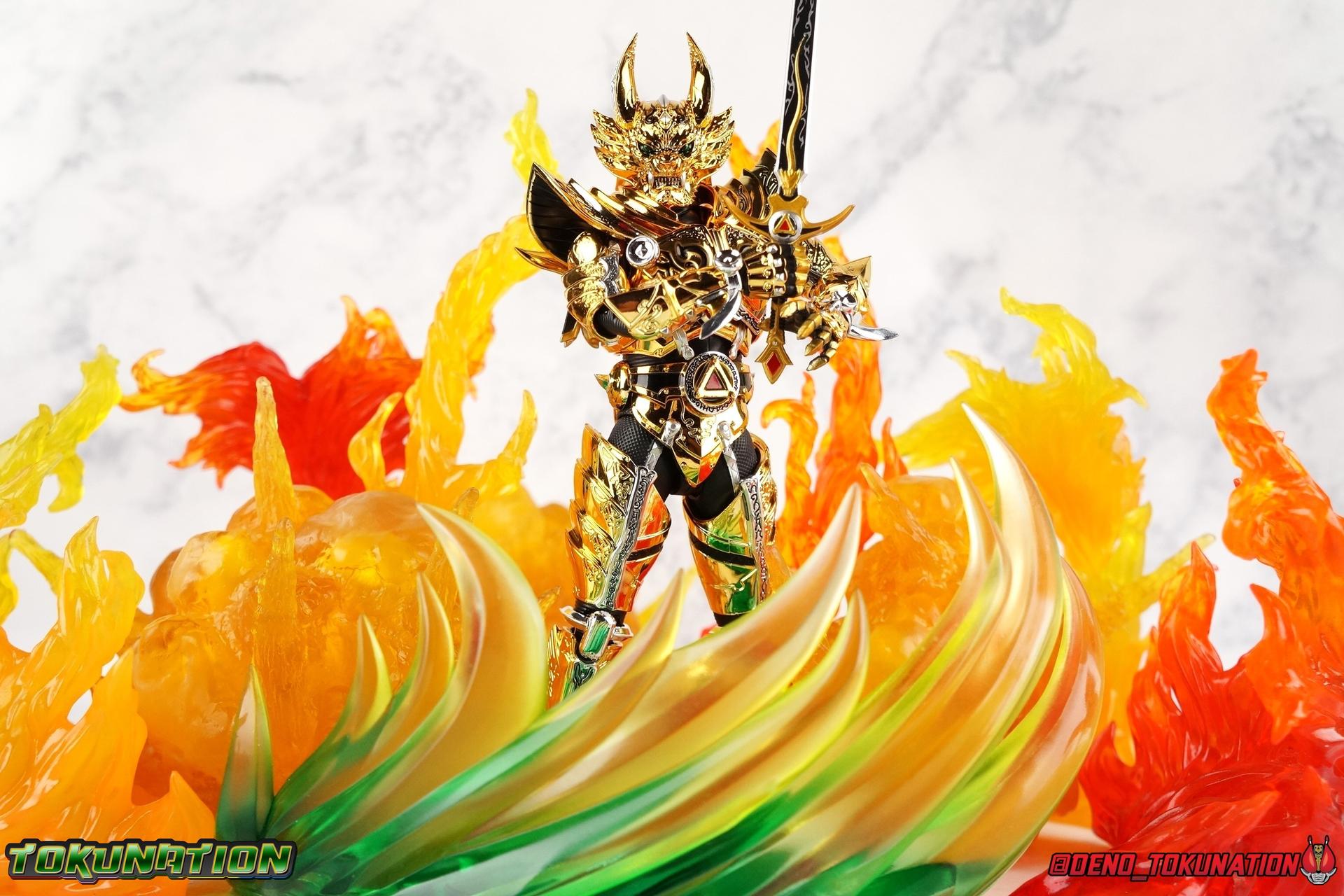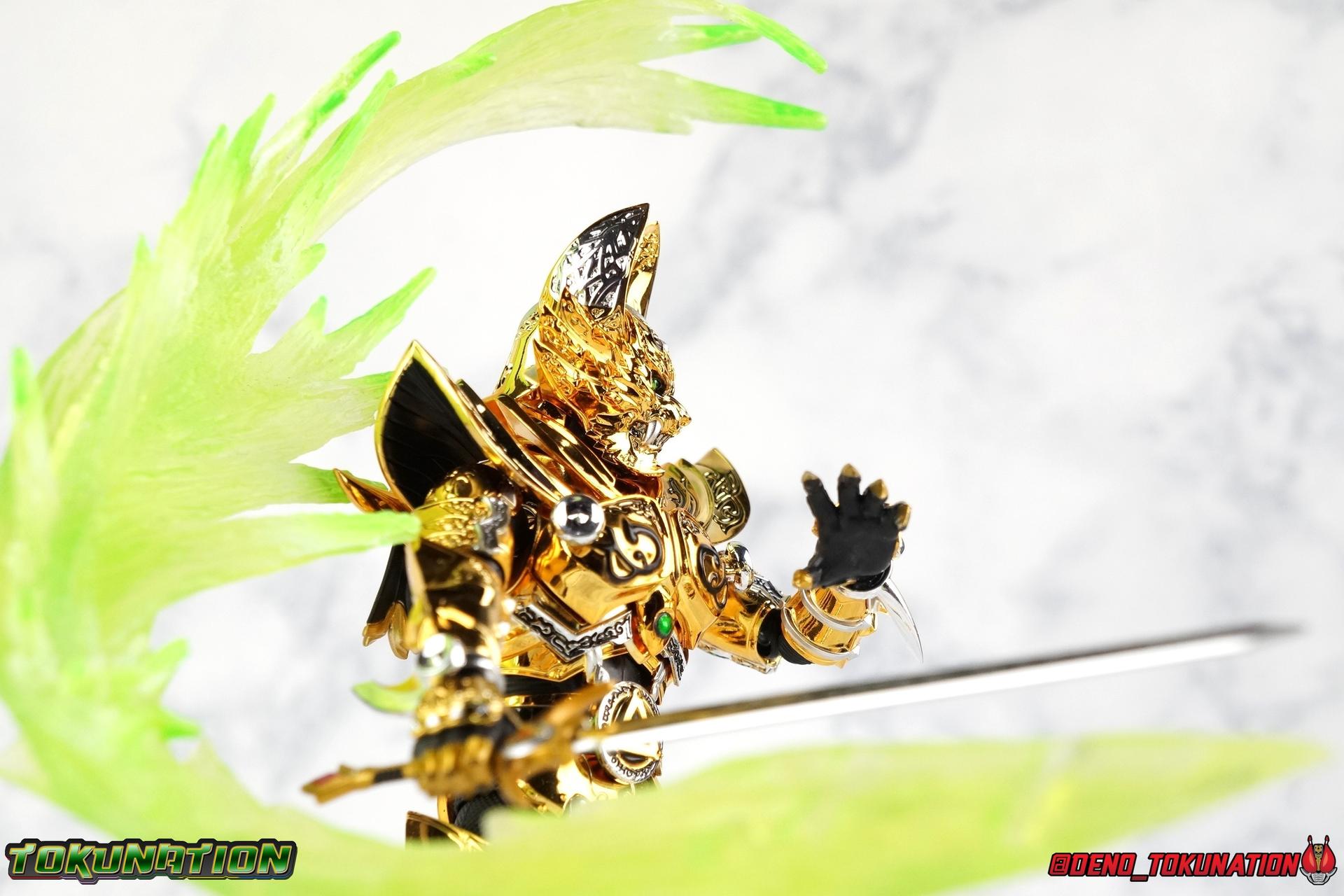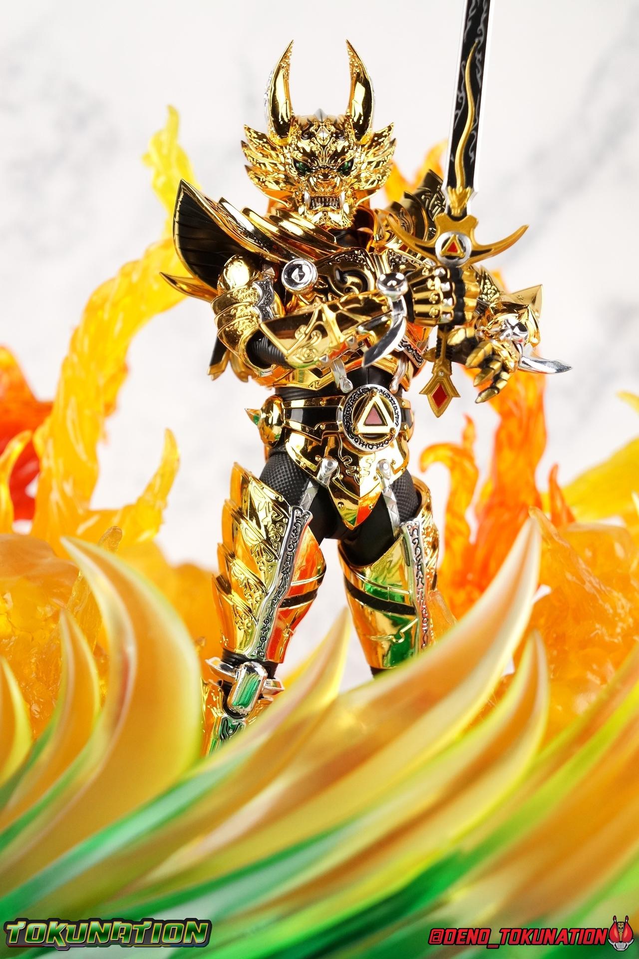 And now, after 7 years, collectors have been given hope with a brand new rendition of the iconic Golden Knight Garo! The original S.H. Figuarts Garo was released in 2011, but it was a terribly flawed and inaccurate release which collector's have complained about for years. Given the insane popularity of Tamashii Nation's high end Kamen Rider renewals in the last few years, it was perhaps only a matter of time before the treatment was applied elsewhere. Now, the first S.H. Figuarts Shinkocchou Seihou release for the Garo franchise has arrived! Packaging Being that Garo is the first non-Kamen Rider to be released in the Shinkocchou Seihou line, his packaging is a really great departure from the norm while keeping the same style. The slipcover box has returned but thankfully we've lost the dull white/black design and gotten a sleek glossy black box this time around. The character art on the front is absolutely gorgeous and the green flames accent it very well. I'm very much in love with the gold foil lettering on the spines of the box as well. While this box is clearly the same as what we've seen before, the presentation of it is greatly improved and really sets this release apart from the others. Main Figure Can I just say "wow"? I haven't been quite this impressed by a new figuart in some time. I've never been a huge fan of the Garo franchise personally. I have so many friends that love it and the various Makai Knights within it. I have attempted to immerse myself in it more than once over the last decade as well. But I have never found a compelling reason to actively like these shows. Bearing that in mind, can I admit that Shinkocchou Seihou Garo is one of my favorite figures ever? Because it actually really is. If that's not a winning endorsement, I doubt you'll find one better. Seihou Garo truly is the renewal collectors and fans have waited for over the better part of a decade. Functionally the old figure was pretty lackluster, but it wasn't even just that, visually the details were wrong, the armor the wrong color, some features were just missing entirely. The Seihou fixes all of the issues. The most striking change is of course the glorious golden chrome paint application over the entire armor, along with some extra silver accents. The armor is extremely shiny and the finish is very crisp. Every surface detail that can be covered in this gold is. Connecting moving joints are not where necessary. But literally anything else that can be, is. The entire armor is also ornately detailed. Every single detail is immaculately recreated here. Every etching, every line, everything. I'm just so massively impressed by it. On to a bit of how the figure works, it's imperfect, but a vast improvement on the original. The armor is big and bulky, but surprisingly there's much more flexibility to the joints than you'd imagine. The ankles are fantastically unhindered, while the knees can only bend about 90 degrees. The hips leave a little bit to be desired though. They can angle out just fine, but pulling them forward and back inevitably hits the waist armor meaning you lose a small bit of movement. I appreciate that the silver details on the hips are not painted chrome but molded in silver along with the black parts so there won't be any chrome where there. However the actual waist is two separate pieces of armor, chrome on top of chrome, so that really scares me for the future. As mentioned before, the details on this thing are indescribably nice. The upper body is just a spectacle, especially the back plate. And while it may not look like it, the upper bod floats on the lower torso quite well, and luckily the details on the interior part are painted in flat silver and gold rather than chrome so no scraping concerns. The arms are actually pretty ingenious as well, despite having so many protrusions you aren't going to draw blood trying to put new hands on him. The wrists are nice and unrestricted, the elbows actually bend very nicely and have a weird rotational joint built in so they can swivel a bit too. The bicep also features a swivel and the shoulder joint itself is wide open so the arms can freely move. And why are they so free? The shoulder armor is hinged. The plates that make up the shoulder and neck armor are jointed and can move up and down depending on where you need them in relation ot the actual shoulder. It's frankly brilliant. At one time Bandai even stated that this sliding armor gimmick is what had kept the figure in limbo for a while as they perfected it. Well damn they perfected it alright. Finally, Garo's head is a magnificent recreation of this hero's fierce visage. Thanks to the chrome gold and silver applications, punctuated by those piercing green eyes, and the black paint wash that brings out the minor details, Garo's face has come alive. Accessories Garo comes with most of what he needs, missing at least one key item that I'm disappointed about: 3 - sets of hands. That's one open set for action poses, 1 set used to hold the sword, and 1 set specifically for holding the sword scabbard instead. 1 - Garoken Scabbard. This is a bit of a dummy accessory which is disappointing. The scabbard has a nice metal chain which I appreciate, but the sword grip sticking out of it is a dummy accessory. The grip can be removed to simulate the sword being removed. But the sword itself cannot actually be put in the scabbard. I'm kind of baffled as to why. Numerous, *numerous*, Garo figures in the long running Makai Kado line from Bandai have had fully functional scabbards. It's just silly that this one isn't despite it clearly being the right size to house a sword. 1 - Garoken. Garo's signature weapon is ornately detailed along the handle and blade. While many counterparts to this weapon in the Makai Kado line feature die cast for weight, I'm quite glad this one doesn't. The wrists are fairly strong but they couldn't hold up to that kind of weight. I've included a couple images of Seihou Garo h
