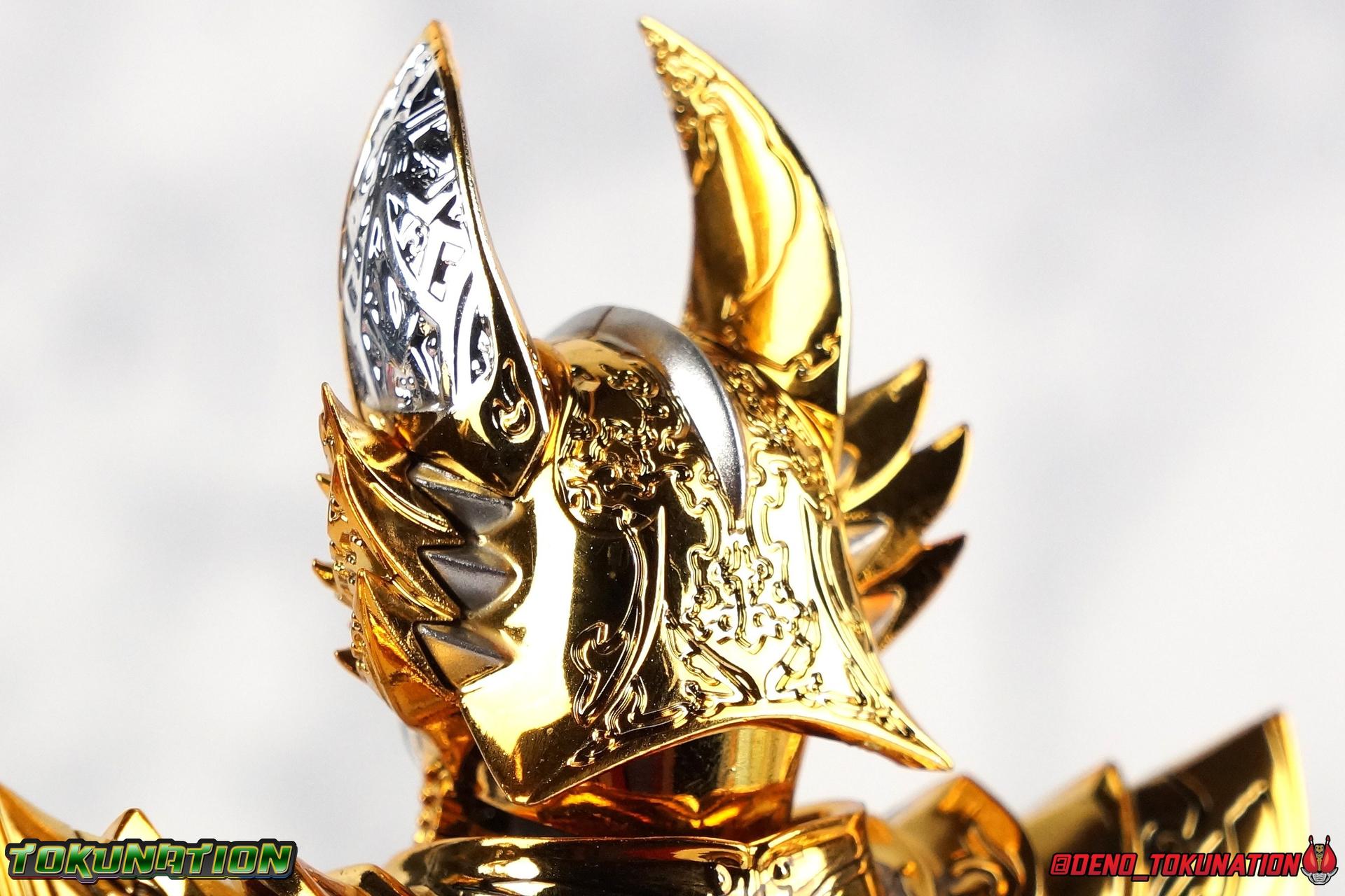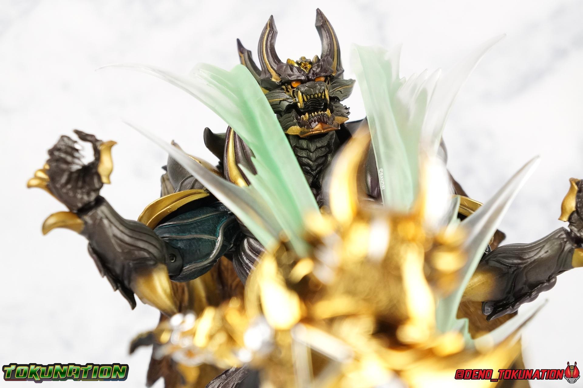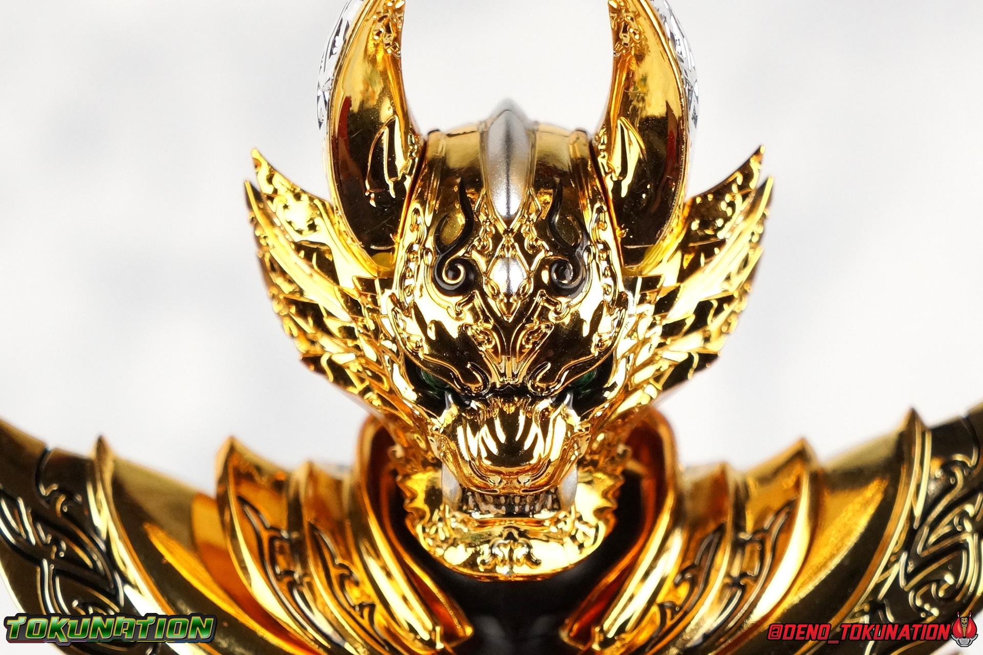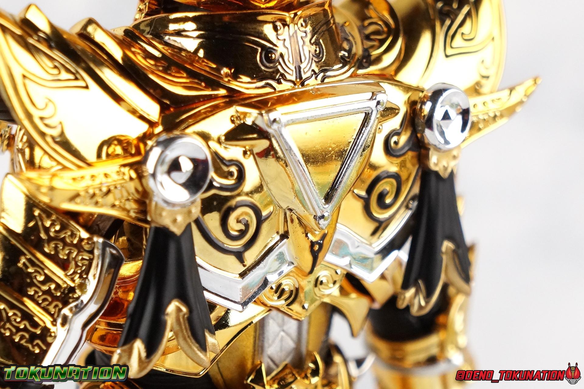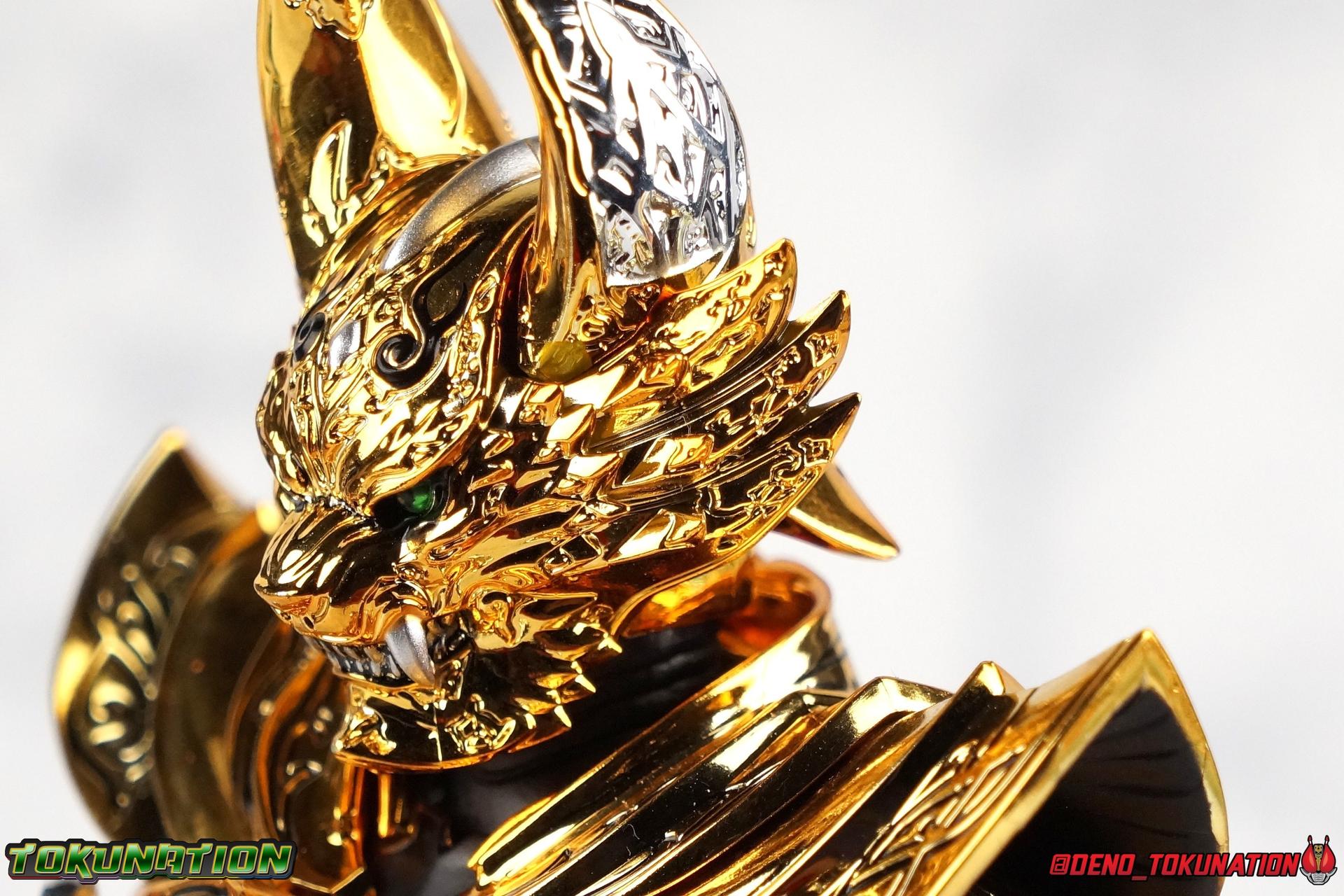 And now, after 7 years, collectors have been given hope with a brand new rendition of the iconic Golden Knight Garo! The original S.H. Figuarts Garo was released in 2011, but it was a terribly flawed and inaccurate release which collector's have complained about for years. Given the insane popularity of Tamashii Nation's high end Kamen Rider renewals in the last few years, it was perhaps only a matter of time before the treatment was applied elsewhere. Now, the first S.H. Figuarts Shinkocchou Seihou release for the Garo franchise has arrived! Packaging Being that Garo is the first non-Kamen Rider to be released in the Shinkocchou Seihou line, his packaging is a really great departure from the norm while keeping the same style. The slipcover box has returned but thankfully we've lost the dull white/black design and gotten a sleek glossy black box this time around. The character art on the front is absolutely gorgeous and the green flames accent it very well. I'm very much in love with the gold foil lettering on the spines of the box as well. While this box is clearly the same as what we've seen before, the presentation of it is greatly improved and really sets this release apart from the others. Main Figure Can I just say "wow"? I haven't been quite this impressed by a new figuart in some time. I've never been a huge fan of the Garo franchise personally. I have so many friends that love it and the various Makai Knights within it. I have attempted to immerse myself in it more than once over the last decade as well. But I have never found a compelling reason to actively like these shows. Bearing that in mind, can I admit that Shinkocchou Seihou Garo is one of my favorite figures ever? Because it actually really is. If that's not a winning endorsement, I doubt you'll find one better. Seihou Garo truly is the renewal collectors and fans have waited for over the better part of a decade. Functionally the old figure was pretty lackluster, but it wasn't even just that, visually the details were wrong, the armor the wrong color, some features were just missing entirely. The Seihou fixes all of the issues. The most striking change is of course the glorious golden chrome paint application over the entire armor, along with some extra silver accents. The armor is extremely shiny and the finish is very crisp. Every surface detail that can be covered in this gold is. Connecting moving joints are not where necessary. But literally anything else that can be, is. The entire armor is also ornately detailed. Every single detail is immaculately recreated here. Every etching, every line, everything. I'm just so massively impressed by it. On to a bit of how the figure works, it's imperfect, but a vast improvement on the original. The armor is big and bulky, but surprisingly there's much more flexibility to the joints than you'd imagine. The ankles are fantastically unhindered, while the knees can only bend about 90 degrees. The hips leave a little bit to be desired though. They can angle out just fine, but pulling them forward and back inevitably hits the waist armor meaning you lose a small bit of movement. I appreciate that the silver details on the hips are not painted chrome but molded in silver along with the black parts so there won't be any chrome where there. However the actual waist is two separate pieces of armor, chrome on top of chrome, so that really scares me for the future. As mentioned before, the details on this thing are indescribably nice. The upper body is just a spectacle, especially the back plate. And while it may not look like it, the upper bod floats on the lower torso quite well, and luckily the details on the interior part are painted in flat silver and gold rather than chrome so no scraping concerns. The arms are actually pretty ingenious as well, despite having so many protrusions you aren't going to draw blood trying to put new hands on him. The wrists are nice and unrestricted, the elbows actually bend very nicely and have a weird rotational joint built in so they can swivel a bit too. The bicep also features a swivel and the shoulder joint itself is wide open so the arms can freely move. And why are they so free? The shoulder armor is hinged. The plates that make up the shoulder and neck armor are jointed and can move up and down depending on where you need them in relation ot the actual shoulder. It's frankly brilliant. At one time Bandai even stated that this sliding armor gimmick is what had kept the figure in limbo for a while as they perfected it. Well damn they perfected it alright. Finally, Garo's head is a magnificent recreation of this hero's fierce visage. Thanks to the chrome gold and silver applications, punctuated by those piercing green eyes, and the black paint wash that brings out the minor details, Garo's face has come alive. Accessories Garo comes with most of what he needs, missing at least one key item that I'm disappointed about: 3 - sets of hands. That's one open set for action poses, 1 set used to hold the sword, and 1 set specifically for holding the sword scabbard instead. 1 - Garoken Scabbard. This is a bit of a dummy accessory which is disappointing. The scabbard has a nice metal chain which I appreciate, but the sword grip sticking out of it is a dummy accessory. The grip can be removed to simulate the sword being removed. But the sword itself cannot actually be put in the scabbard. I'm kind of baffled as to why. Numerous, *numerous*, Garo figures in the long running Makai Kado line from Bandai have had fully functional scabbards. It's just silly that this one isn't despite it clearly being the right size to house a sword. 1 - Garoken. Garo's signature weapon is ornately detailed along the handle and blade. While many counterparts to this weapon in the Makai Kado line feature die cast for weight, I'm quite glad this one doesn't. The wrists are fairly strong but they couldn't hold up to that kind of weight. I've included a couple images of Seihou Garo h