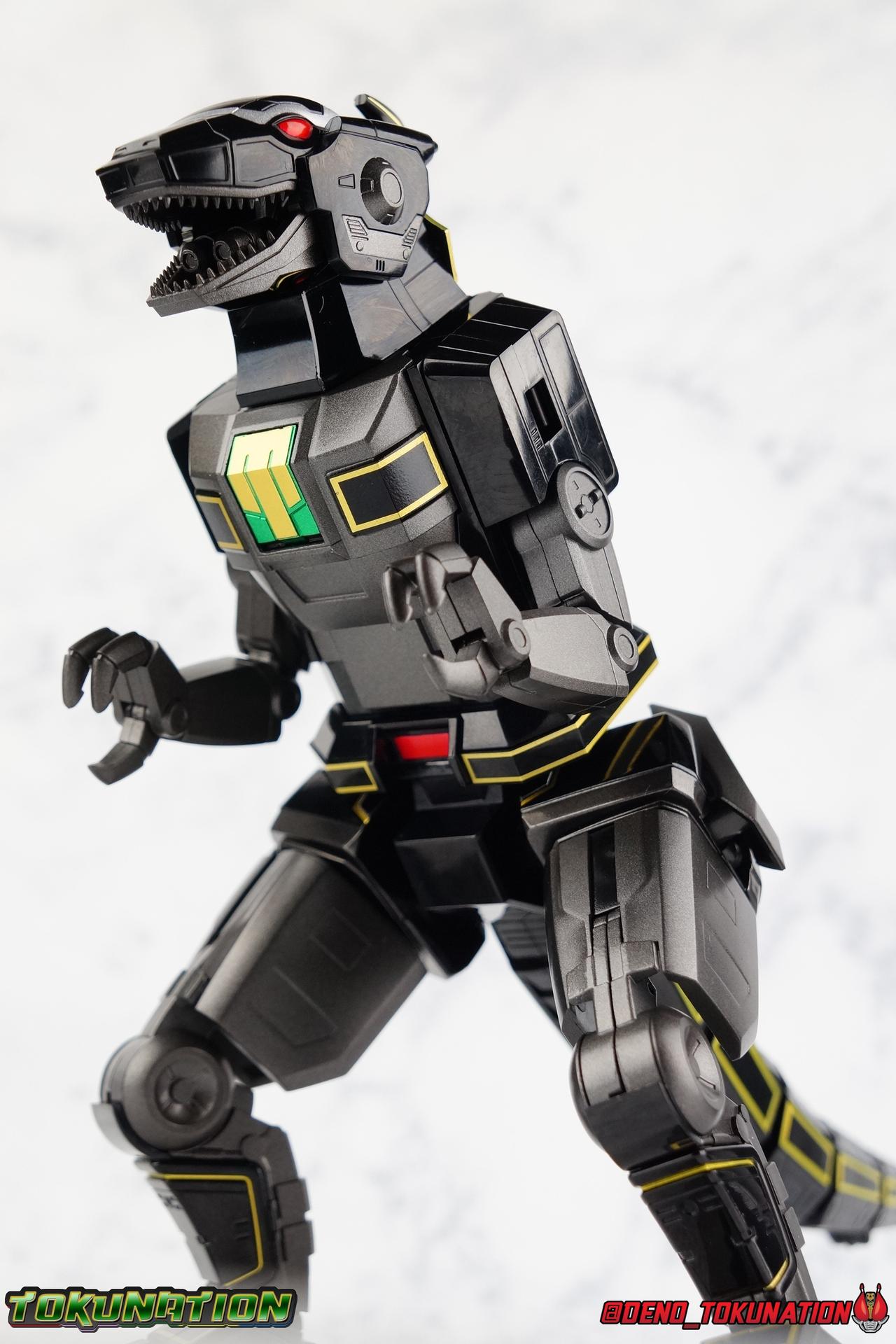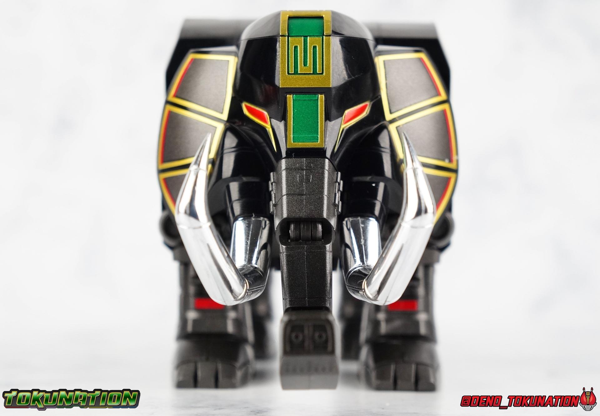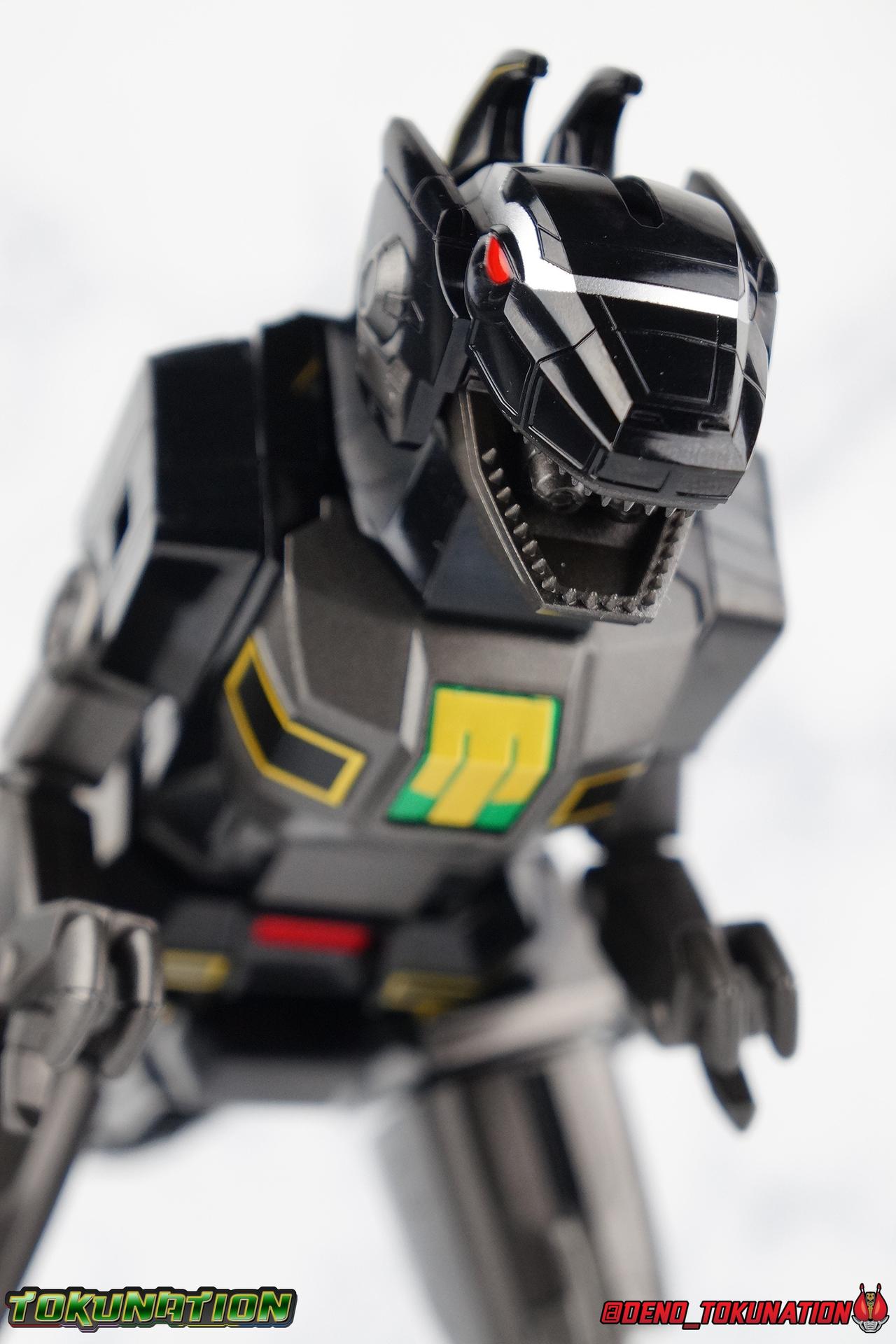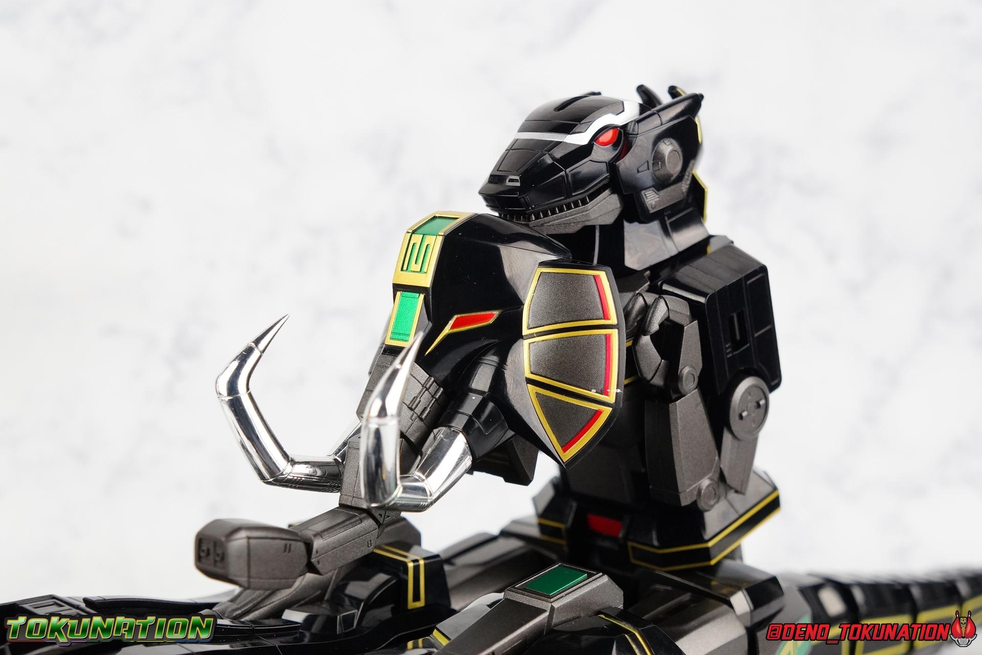 Today we tackle the gorgeous SDCC 2018 exclusive Black repaint of the SOC Megazord Daizyujin! Originally sold exclusively at SDCC, it has since been made available to pick up at NYCC as well, and will even be sold through the Tamashii Web Shop by Tamashii Nations as a web exclusive in Japan, next year. Sadly that means the exclusivity of this release, as well as it's value, are diminished. With that in mind, let's go! ***We've broken the review portion down into 7 individual sections. 1 for each Zord/Guardian Beast with a rundown of what they can do individually, then one for Megazord Tank Mode/Dino Tanker, and finally Megazord/Daizyujin itself. There will be 4 posts with images in this thread containing a total of over 120 images of this gorgeous set. Be sure to check them all out! But to kick things off: Packaging The packaging that you'll see in this gallery is actually that of the western market Bluefin release of this set, made available at SDCC & NYCC 2018. Thankfully a new trend has begun with Bluefin dual-branding their Power Rangers releases with Zyuranger markings as well. Making the differences between the two market releases minimal, such as the SOC Dragon Caeasr/Zord. Unlike the original release of this set, which unfortunately had radically different box art from it's native Japanese release. Since these are more dual releases I'll refer to everything in the set by both American & Japanese names as well. The packaging itself is quite a departure from Bluefin's own original release of the SOC, featuring the toy, rather than new art this go around. But the stock photography is indeed gorgeous and far exceeds any of my work. Stock photos can be kind of magically nice. I actually really enjoy this packaging quite a bit as well. The interior is identical to the previous Megazord/Daizyujin release. I always love styrofoam trays, and Soul of Chogokin almost always feature these. It's a nice throwback that I appreciate more than is necessary I think. The functionality I discuss in this review is identical to my first gallery of the SOC molds, there's no physical difference between this release and that one whatsoever. Though I will talk about paint app differences. This color scheme by the way, is meant to match the SOC Dragon Caesar/Dragonzord. The black/gold/green colors go perfectly with that figure, one I sadly do not have yet at the moment but will soon. If you'd like to see some comparisons, we did galleries of the original vintage DX Black Daizyujin as well as the Legacy Black & Gold Megazord in the past. Tyrannosaurus Zord/Guardian Beast Tyrannosaurus Tyrannosaurus kicks things off for us. For starters this big dino is a very impressive looking beast. It was a dynamic design for it's original time anyway, but the SOC has overhauled it in all the best ways to make it look a bit more proportional and (as much as a robotic dinosaur spirit thing can be) believable. With this new take on the figure we get the expected levels of SOC articulation to really hammer home it's high end nature, as well as that gokin heft to give it real weight. Tyranno has an opening mouth that functions in such a way as to make it appear there's a real neck joint, much like the original. Inside the mouth are sculpted in blasters to replicate Tyranno's sonic attacks. Making a vast improvement on the original DX, this go around Tyranno also has poseable arms. These tiny vestigial arms may not look like much on the original, but here the shoulder and elbow have lots of range to them. The shoulder can even angle out a bit away from the body. The claws are also articulated in 2 sections per hand. When combined with the lower body articulation you can get some dynamic results. That's largely thanks in part to the torso joint. While this joint get's lost in the fully combined modes, Tyranno can make use of it to turn about 45 degrees to each side. The hips, while not quite as dynamic, can also angle out and back/forth on some really strong hinges for stable posing. The diamond shaped chunk of armor on the outside of each hip needs to be angled correctly to give the hips the room they need though. Surprisingly there is also a sliding thigh joint. When pushed outward it gives him a wider stance, and is primarily meant for the Megazord/Daizyujin combo. We also get a swiveling thigh joint just below here that allows each leg to turn completely outward. Again primarily meant for combined mode, but still a really welcome addition. Sadly the knees don't bend very far forward, most of their use comes into play for the combined mode where they fold backwards. The same can be said for the ankles which only tilt back and forth and don't have a side to side rocker. The hips and thigh joints mostly alleviate that though. Finally we have a segmented and articulated tail. Each of the 6 segments is on a nice tight floating joint so they have room to move up or down slightly as well as side to side. Just enough to cover what you'd need. Tyrannosaurus could definitely get physical with this thing in the series, and I think the SOC accurately represents the range he had with it. As probably the most memorable and iconic of the Zords/Guardians, he's the one they needed to nail individually. The new color scheme for this set really makes the Tyrannosaurus look very imposing, and even a little sinister. Though we lose a lot of that gorgeous painted silver from before, the new gunmetal and black are accented by perfectly gold outlines and some hints of metallic green that really set this thing off. Gotta love those red eyes as well. Mastodon Zord/Guardian Beast Zyumammoth Of all the beasts it's the Mastodon/Mammoth (and Pterodactyl/Pteranodon) that are by far the most simplistic still, and largely similar to their original toys. With Mastodon it's just the design. There's not a lot to make more dynamic for it's individual mode. Now it's transformation process has been greatly enhanced to get to both modes. But as an individual, it