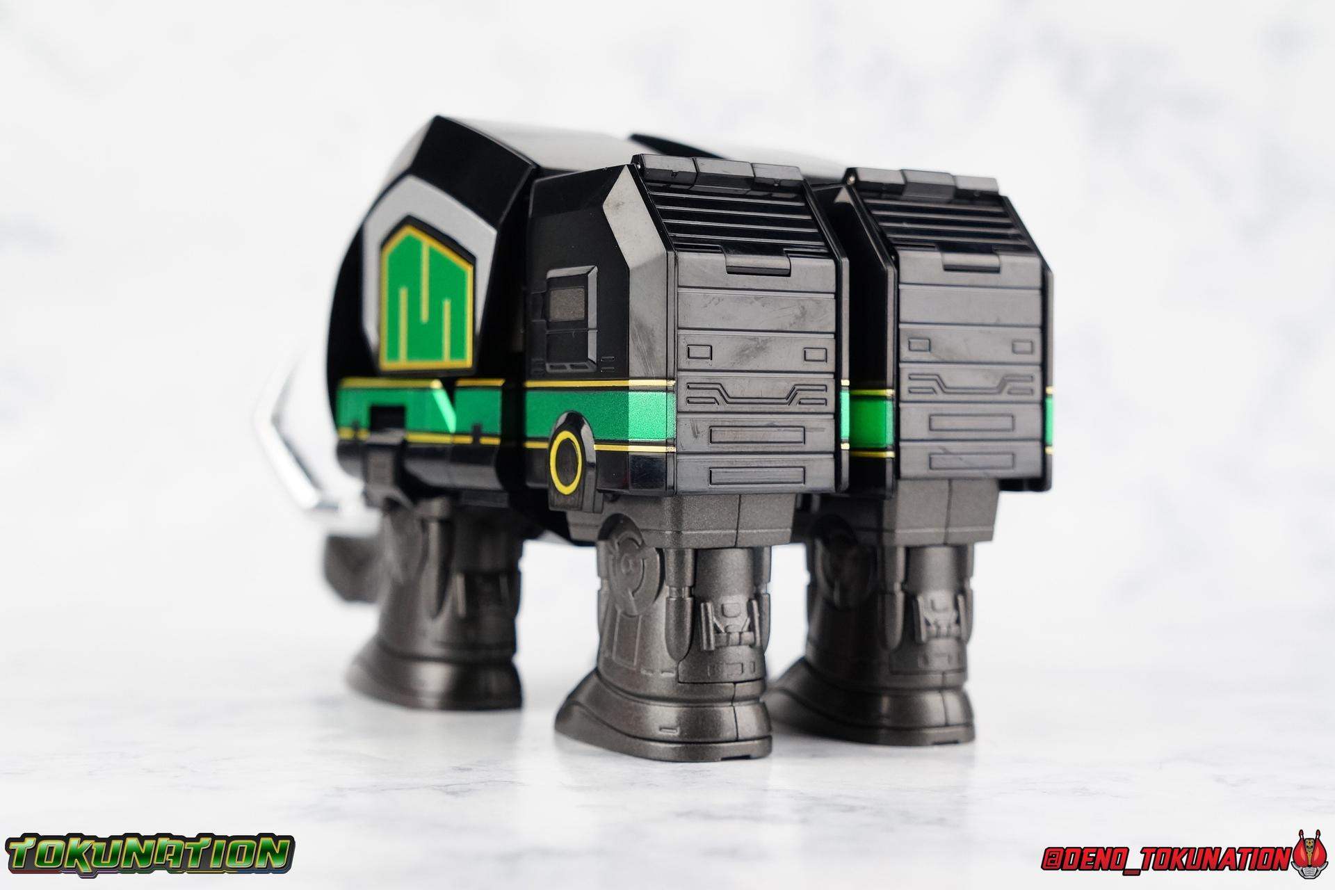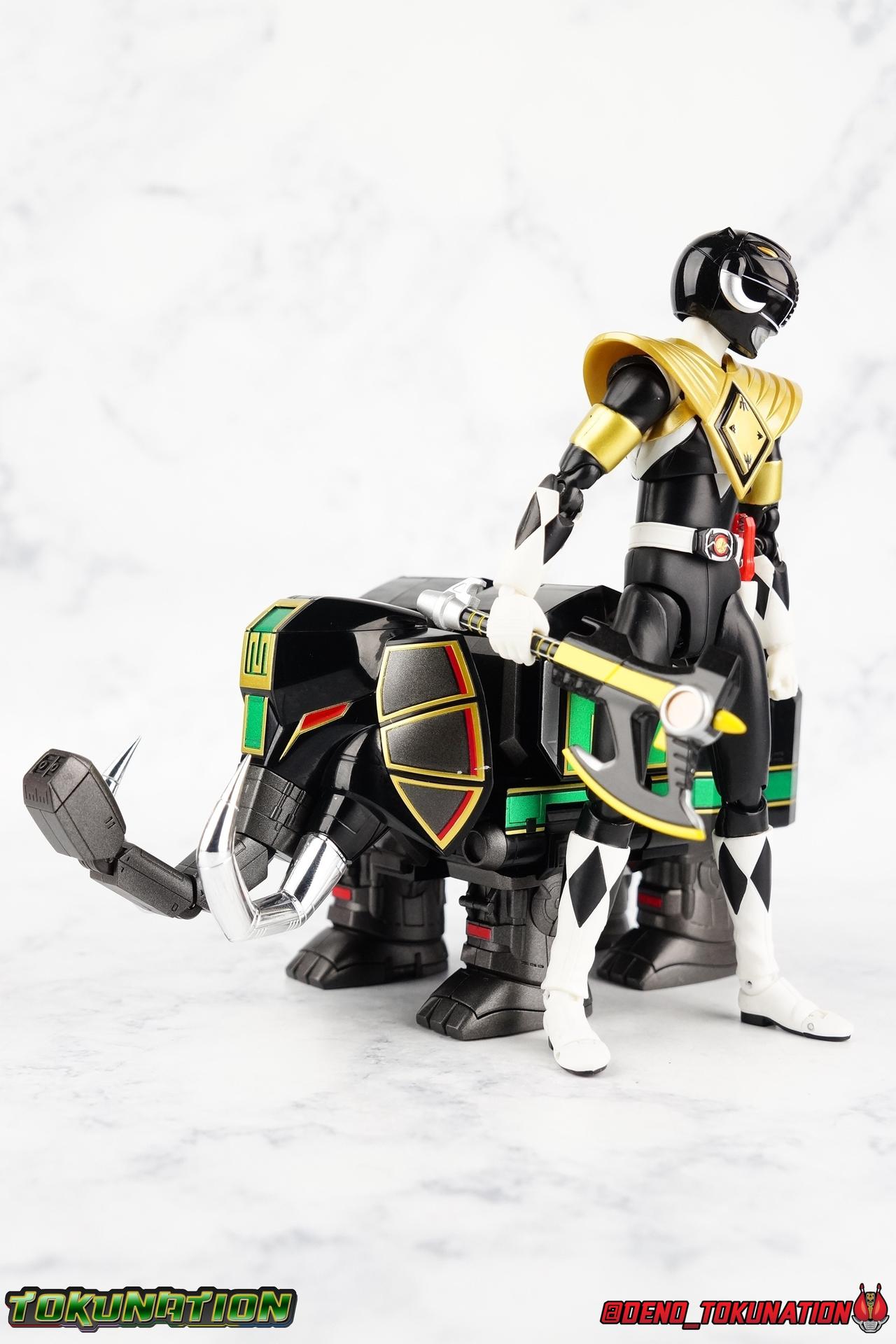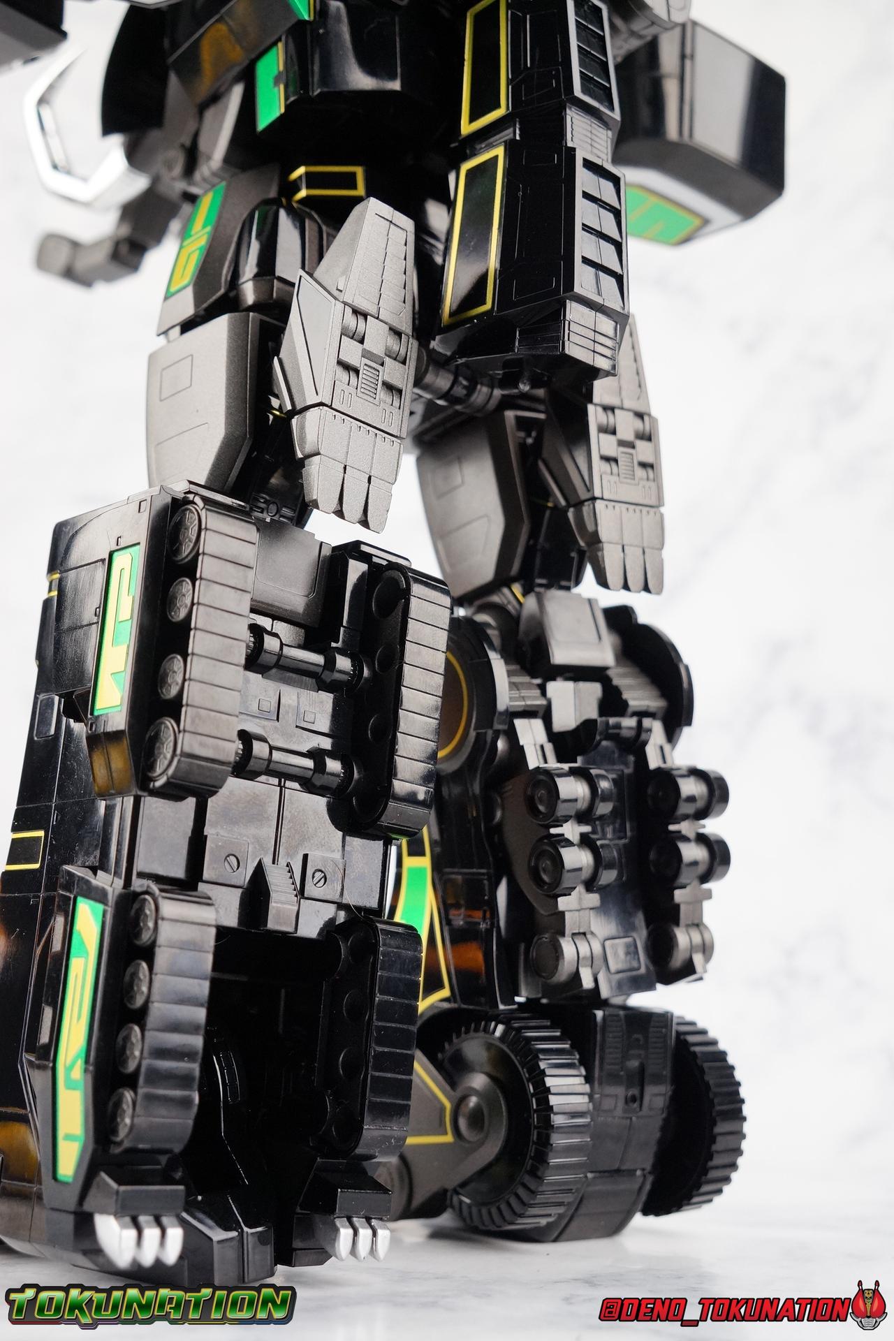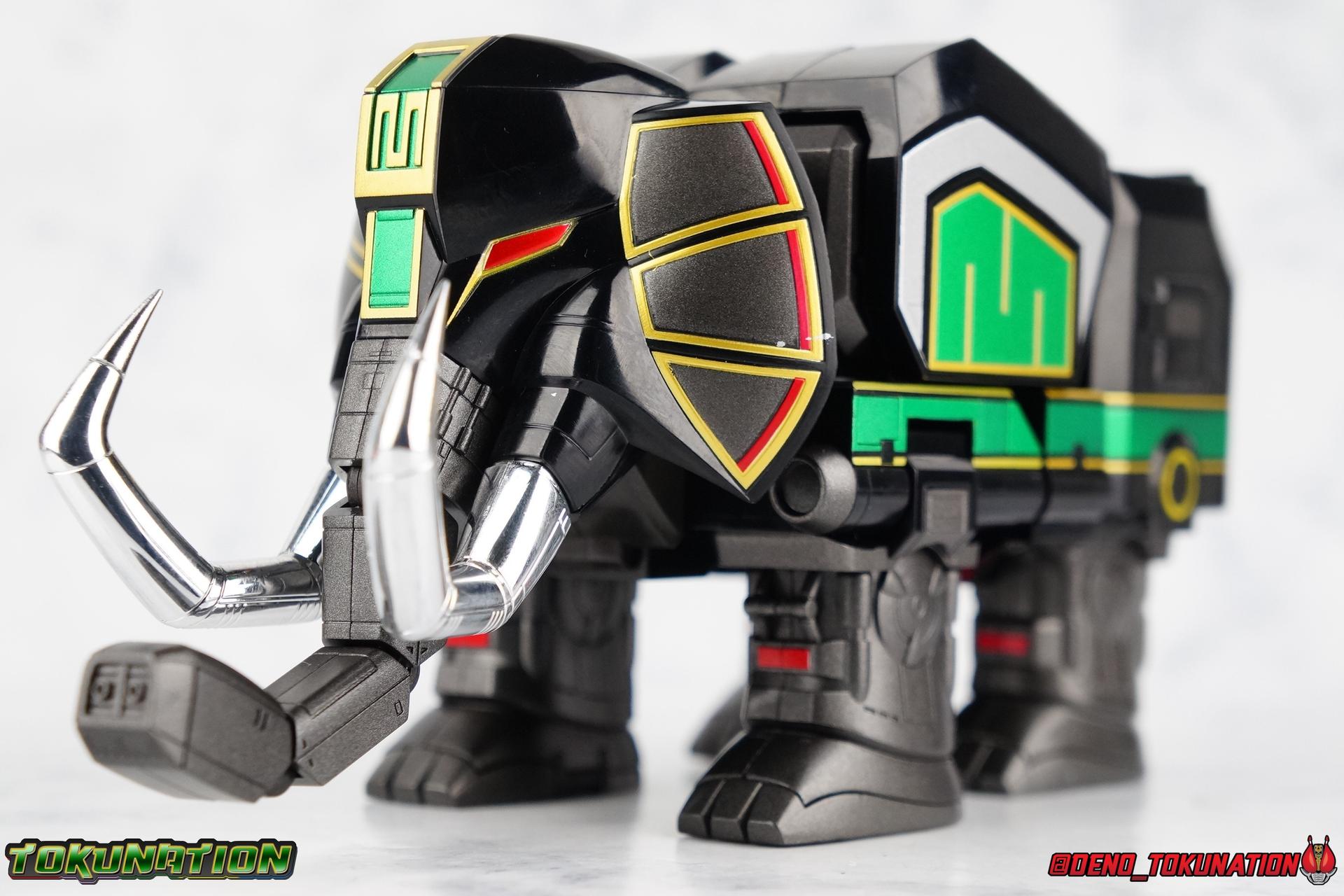 Today we tackle the gorgeous SDCC 2018 exclusive Black repaint of the SOC Megazord Daizyujin! Originally sold exclusively at SDCC, it has since been made available to pick up at NYCC as well, and will even be sold through the Tamashii Web Shop by Tamashii Nations as a web exclusive in Japan, next year. Sadly that means the exclusivity of this release, as well as it's value, are diminished. With that in mind, let's go! ***We've broken the review portion down into 7 individual sections. 1 for each Zord/Guardian Beast with a rundown of what they can do individually, then one for Megazord Tank Mode/Dino Tanker, and finally Megazord/Daizyujin itself. There will be 4 posts with images in this thread containing a total of over 120 images of this gorgeous set. Be sure to check them all out! But to kick things off: Packaging The packaging that you'll see in this gallery is actually that of the western market Bluefin release of this set, made available at SDCC & NYCC 2018. Thankfully a new trend has begun with Bluefin dual-branding their Power Rangers releases with Zyuranger markings as well. Making the differences between the two market releases minimal, such as the SOC Dragon Caeasr/Zord. Unlike the original release of this set, which unfortunately had radically different box art from it's native Japanese release. Since these are more dual releases I'll refer to everything in the set by both American & Japanese names as well. The packaging itself is quite a departure from Bluefin's own original release of the SOC, featuring the toy, rather than new art this go around. But the stock photography is indeed gorgeous and far exceeds any of my work. Stock photos can be kind of magically nice. I actually really enjoy this packaging quite a bit as well. The interior is identical to the previous Megazord/Daizyujin release. I always love styrofoam trays, and Soul of Chogokin almost always feature these. It's a nice throwback that I appreciate more than is necessary I think. The functionality I discuss in this review is identical to my first gallery of the SOC molds, there's no physical difference between this release and that one whatsoever. Though I will talk about paint app differences. This color scheme by the way, is meant to match the SOC Dragon Caesar/Dragonzord. The black/gold/green colors go perfectly with that figure, one I sadly do not have yet at the moment but will soon. If you'd like to see some comparisons, we did galleries of the original vintage DX Black Daizyujin as well as the Legacy Black & Gold Megazord in the past. Tyrannosaurus Zord/Guardian Beast Tyrannosaurus Tyrannosaurus kicks things off for us. For starters this big dino is a very impressive looking beast. It was a dynamic design for it's original time anyway, but the SOC has overhauled it in all the best ways to make it look a bit more proportional and (as much as a robotic dinosaur spirit thing can be) believable. With this new take on the figure we get the expected levels of SOC articulation to really hammer home it's high end nature, as well as that gokin heft to give it real weight. Tyranno has an opening mouth that functions in such a way as to make it appear there's a real neck joint, much like the original. Inside the mouth are sculpted in blasters to replicate Tyranno's sonic attacks. Making a vast improvement on the original DX, this go around Tyranno also has poseable arms. These tiny vestigial arms may not look like much on the original, but here the shoulder and elbow have lots of range to them. The shoulder can even angle out a bit away from the body. The claws are also articulated in 2 sections per hand. When combined with the lower body articulation you can get some dynamic results. That's largely thanks in part to the torso joint. While this joint get's lost in the fully combined modes, Tyranno can make use of it to turn about 45 degrees to each side. The hips, while not quite as dynamic, can also angle out and back/forth on some really strong hinges for stable posing. The diamond shaped chunk of armor on the outside of each hip needs to be angled correctly to give the hips the room they need though. Surprisingly there is also a sliding thigh joint. When pushed outward it gives him a wider stance, and is primarily meant for the Megazord/Daizyujin combo. We also get a swiveling thigh joint just below here that allows each leg to turn completely outward. Again primarily meant for combined mode, but still a really welcome addition. Sadly the knees don't bend very far forward, most of their use comes into play for the combined mode where they fold backwards. The same can be said for the ankles which only tilt back and forth and don't have a side to side rocker. The hips and thigh joints mostly alleviate that though. Finally we have a segmented and articulated tail. Each of the 6 segments is on a nice tight floating joint so they have room to move up or down slightly as well as side to side. Just enough to cover what you'd need. Tyrannosaurus could definitely get physical with this thing in the series, and I think the SOC accurately represents the range he had with it. As probably the most memorable and iconic of the Zords/Guardians, he's the one they needed to nail individually. The new color scheme for this set really makes the Tyrannosaurus look very imposing, and even a little sinister. Though we lose a lot of that gorgeous painted silver from before, the new gunmetal and black are accented by perfectly gold outlines and some hints of metallic green that really set this thing off. Gotta love those red eyes as well. Mastodon Zord/Guardian Beast Zyumammoth Of all the beasts it's the Mastodon/Mammoth (and Pterodactyl/Pteranodon) that are by far the most simplistic still, and largely similar to their original toys. With Mastodon it's just the design. There's not a lot to make more dynamic for it's individual mode. Now it's transformation process has been greatly enhanced to get to both modes. But as an individual, it