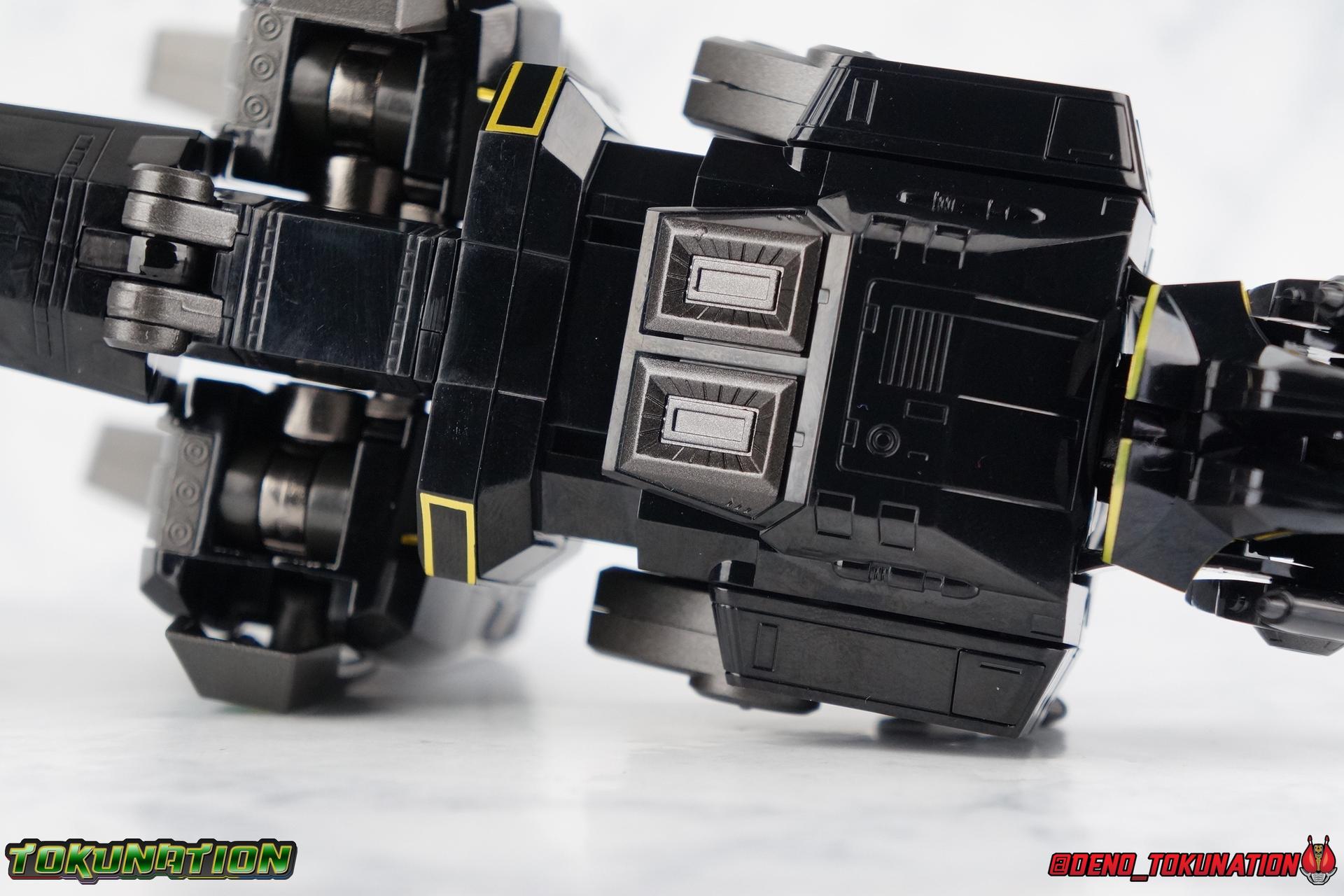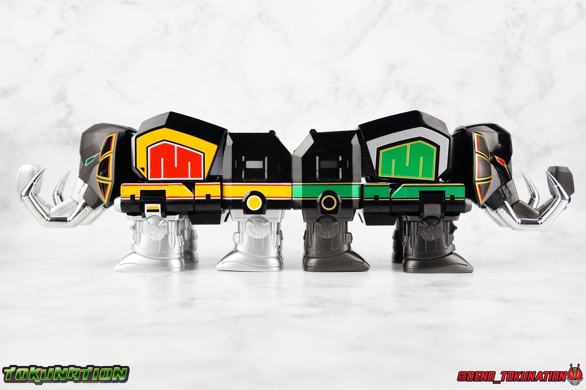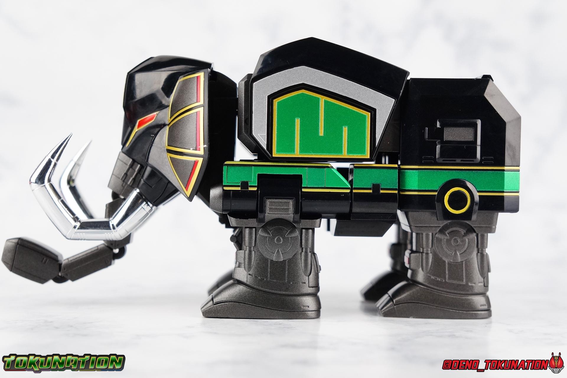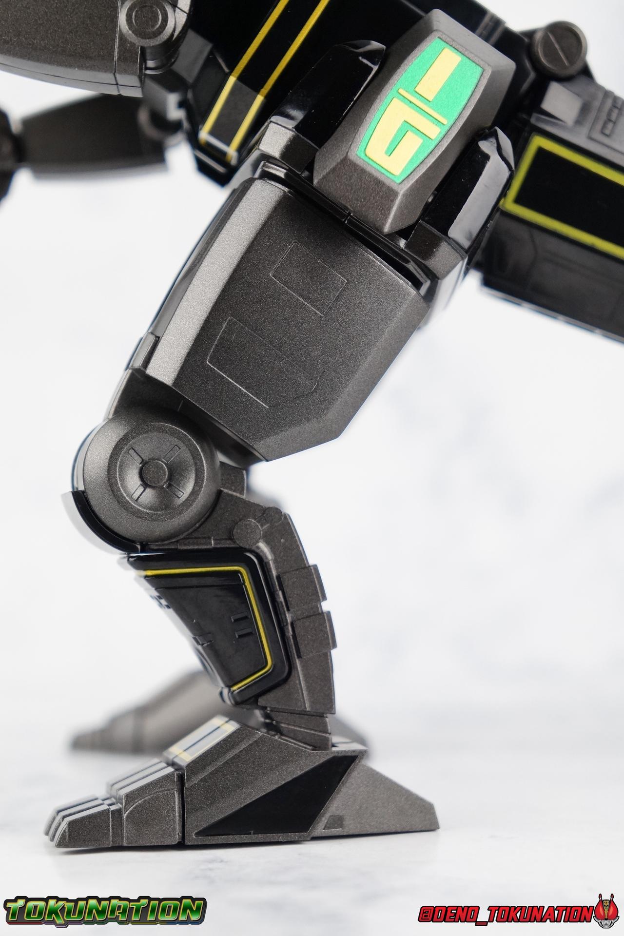 Today we tackle the gorgeous SDCC 2018 exclusive Black repaint of the SOC Megazord Daizyujin! Originally sold exclusively at SDCC, it has since been made available to pick up at NYCC as well, and will even be sold through the Tamashii Web Shop by Tamashii Nations as a web exclusive in Japan, next year. Sadly that means the exclusivity of this release, as well as it's value, are diminished. With that in mind, let's go! ***We've broken the review portion down into 7 individual sections. 1 for each Zord/Guardian Beast with a rundown of what they can do individually, then one for Megazord Tank Mode/Dino Tanker, and finally Megazord/Daizyujin itself. There will be 4 posts with images in this thread containing a total of over 120 images of this gorgeous set. Be sure to check them all out! But to kick things off: Packaging The packaging that you'll see in this gallery is actually that of the western market Bluefin release of this set, made available at SDCC & NYCC 2018. Thankfully a new trend has begun with Bluefin dual-branding their Power Rangers releases with Zyuranger markings as well. Making the differences between the two market releases minimal, such as the SOC Dragon Caeasr/Zord. Unlike the original release of this set, which unfortunately had radically different box art from it's native Japanese release. Since these are more dual releases I'll refer to everything in the set by both American & Japanese names as well. The packaging itself is quite a departure from Bluefin's own original release of the SOC, featuring the toy, rather than new art this go around. But the stock photography is indeed gorgeous and far exceeds any of my work. Stock photos can be kind of magically nice. I actually really enjoy this packaging quite a bit as well. The interior is identical to the previous Megazord/Daizyujin release. I always love styrofoam trays, and Soul of Chogokin almost always feature these. It's a nice throwback that I appreciate more than is necessary I think. The functionality I discuss in this review is identical to my first gallery of the SOC molds, there's no physical difference between this release and that one whatsoever. Though I will talk about paint app differences. This color scheme by the way, is meant to match the SOC Dragon Caesar/Dragonzord. The black/gold/green colors go perfectly with that figure, one I sadly do not have yet at the moment but will soon. If you'd like to see some comparisons, we did galleries of the original vintage DX Black Daizyujin as well as the Legacy Black & Gold Megazord in the past. Tyrannosaurus Zord/Guardian Beast Tyrannosaurus Tyrannosaurus kicks things off for us. For starters this big dino is a very impressive looking beast. It was a dynamic design for it's original time anyway, but the SOC has overhauled it in all the best ways to make it look a bit more proportional and (as much as a robotic dinosaur spirit thing can be) believable. With this new take on the figure we get the expected levels of SOC articulation to really hammer home it's high end nature, as well as that gokin heft to give it real weight. Tyranno has an opening mouth that functions in such a way as to make it appear there's a real neck joint, much like the original. Inside the mouth are sculpted in blasters to replicate Tyranno's sonic attacks. Making a vast improvement on the original DX, this go around Tyranno also has poseable arms. These tiny vestigial arms may not look like much on the original, but here the shoulder and elbow have lots of range to them. The shoulder can even angle out a bit away from the body. The claws are also articulated in 2 sections per hand. When combined with the lower body articulation you can get some dynamic results. That's largely thanks in part to the torso joint. While this joint get's lost in the fully combined modes, Tyranno can make use of it to turn about 45 degrees to each side. The hips, while not quite as dynamic, can also angle out and back/forth on some really strong hinges for stable posing. The diamond shaped chunk of armor on the outside of each hip needs to be angled correctly to give the hips the room they need though. Surprisingly there is also a sliding thigh joint. When pushed outward it gives him a wider stance, and is primarily meant for the Megazord/Daizyujin combo. We also get a swiveling thigh joint just below here that allows each leg to turn completely outward. Again primarily meant for combined mode, but still a really welcome addition. Sadly the knees don't bend very far forward, most of their use comes into play for the combined mode where they fold backwards. The same can be said for the ankles which only tilt back and forth and don't have a side to side rocker. The hips and thigh joints mostly alleviate that though. Finally we have a segmented and articulated tail. Each of the 6 segments is on a nice tight floating joint so they have room to move up or down slightly as well as side to side. Just enough to cover what you'd need. Tyrannosaurus could definitely get physical with this thing in the series, and I think the SOC accurately represents the range he had with it. As probably the most memorable and iconic of the Zords/Guardians, he's the one they needed to nail individually. The new color scheme for this set really makes the Tyrannosaurus look very imposing, and even a little sinister. Though we lose a lot of that gorgeous painted silver from before, the new gunmetal and black are accented by perfectly gold outlines and some hints of metallic green that really set this thing off. Gotta love those red eyes as well. Mastodon Zord/Guardian Beast Zyumammoth Of all the beasts it's the Mastodon/Mammoth (and Pterodactyl/Pteranodon) that are by far the most simplistic still, and largely similar to their original toys. With Mastodon it's just the design. There's not a lot to make more dynamic for it's individual mode. Now it's transformation process has been greatly enhanced to get to both modes. But as an individual, it