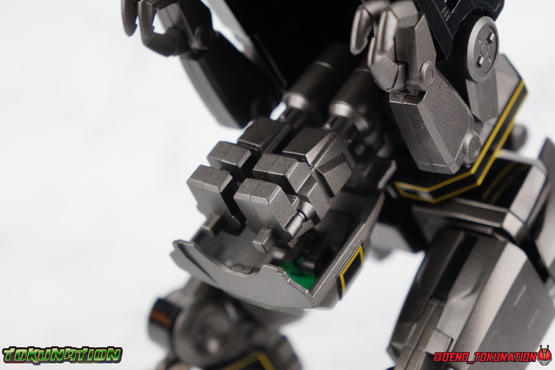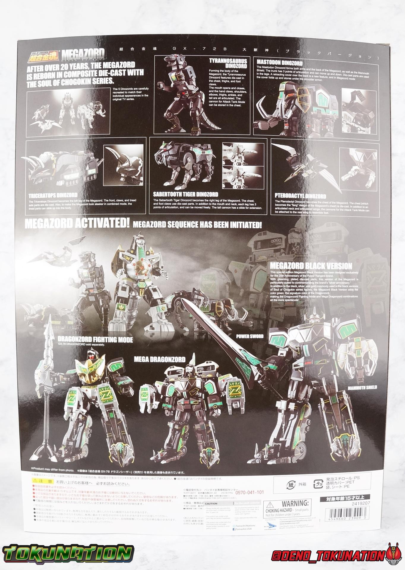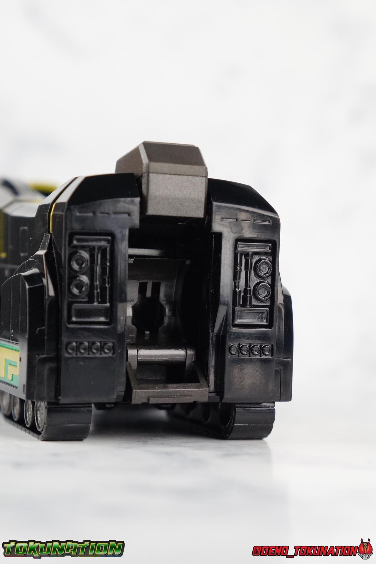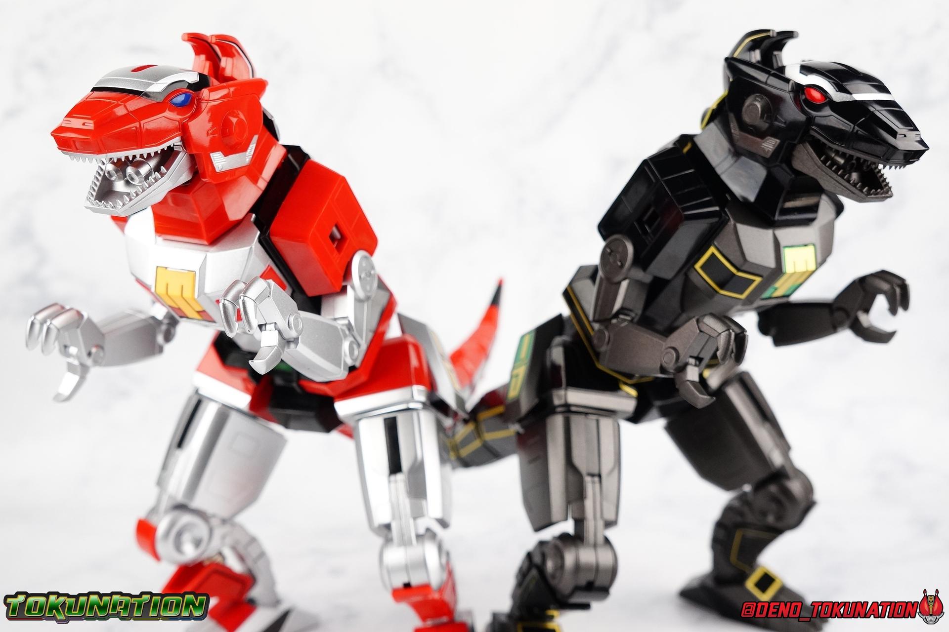 Today we tackle the gorgeous SDCC 2018 exclusive Black repaint of the SOC Megazord Daizyujin! Originally sold exclusively at SDCC, it has since been made available to pick up at NYCC as well, and will even be sold through the Tamashii Web Shop by Tamashii Nations as a web exclusive in Japan, next year. Sadly that means the exclusivity of this release, as well as it's value, are diminished. With that in mind, let's go! ***We've broken the review portion down into 7 individual sections. 1 for each Zord/Guardian Beast with a rundown of what they can do individually, then one for Megazord Tank Mode/Dino Tanker, and finally Megazord/Daizyujin itself. There will be 4 posts with images in this thread containing a total of over 120 images of this gorgeous set. Be sure to check them all out! But to kick things off: Packaging The packaging that you'll see in this gallery is actually that of the western market Bluefin release of this set, made available at SDCC & NYCC 2018. Thankfully a new trend has begun with Bluefin dual-branding their Power Rangers releases with Zyuranger markings as well. Making the differences between the two market releases minimal, such as the SOC Dragon Caeasr/Zord. Unlike the original release of this set, which unfortunately had radically different box art from it's native Japanese release. Since these are more dual releases I'll refer to everything in the set by both American & Japanese names as well. The packaging itself is quite a departure from Bluefin's own original release of the SOC, featuring the toy, rather than new art this go around. But the stock photography is indeed gorgeous and far exceeds any of my work. Stock photos can be kind of magically nice. I actually really enjoy this packaging quite a bit as well. The interior is identical to the previous Megazord/Daizyujin release. I always love styrofoam trays, and Soul of Chogokin almost always feature these. It's a nice throwback that I appreciate more than is necessary I think. The functionality I discuss in this review is identical to my first gallery of the SOC molds, there's no physical difference between this release and that one whatsoever. Though I will talk about paint app differences. This color scheme by the way, is meant to match the SOC Dragon Caesar/Dragonzord. The black/gold/green colors go perfectly with that figure, one I sadly do not have yet at the moment but will soon. If you'd like to see some comparisons, we did galleries of the original vintage DX Black Daizyujin as well as the Legacy Black & Gold Megazord in the past. Tyrannosaurus Zord/Guardian Beast Tyrannosaurus Tyrannosaurus kicks things off for us. For starters this big dino is a very impressive looking beast. It was a dynamic design for it's original time anyway, but the SOC has overhauled it in all the best ways to make it look a bit more proportional and (as much as a robotic dinosaur spirit thing can be) believable. With this new take on the figure we get the expected levels of SOC articulation to really hammer home it's high end nature, as well as that gokin heft to give it real weight. Tyranno has an opening mouth that functions in such a way as to make it appear there's a real neck joint, much like the original. Inside the mouth are sculpted in blasters to replicate Tyranno's sonic attacks. Making a vast improvement on the original DX, this go around Tyranno also has poseable arms. These tiny vestigial arms may not look like much on the original, but here the shoulder and elbow have lots of range to them. The shoulder can even angle out a bit away from the body. The claws are also articulated in 2 sections per hand. When combined with the lower body articulation you can get some dynamic results. That's largely thanks in part to the torso joint. While this joint get's lost in the fully combined modes, Tyranno can make use of it to turn about 45 degrees to each side. The hips, while not quite as dynamic, can also angle out and back/forth on some really strong hinges for stable posing. The diamond shaped chunk of armor on the outside of each hip needs to be angled correctly to give the hips the room they need though. Surprisingly there is also a sliding thigh joint. When pushed outward it gives him a wider stance, and is primarily meant for the Megazord/Daizyujin combo. We also get a swiveling thigh joint just below here that allows each leg to turn completely outward. Again primarily meant for combined mode, but still a really welcome addition. Sadly the knees don't bend very far forward, most of their use comes into play for the combined mode where they fold backwards. The same can be said for the ankles which only tilt back and forth and don't have a side to side rocker. The hips and thigh joints mostly alleviate that though. Finally we have a segmented and articulated tail. Each of the 6 segments is on a nice tight floating joint so they have room to move up or down slightly as well as side to side. Just enough to cover what you'd need. Tyrannosaurus could definitely get physical with this thing in the series, and I think the SOC accurately represents the range he had with it. As probably the most memorable and iconic of the Zords/Guardians, he's the one they needed to nail individually. The new color scheme for this set really makes the Tyrannosaurus look very imposing, and even a little sinister. Though we lose a lot of that gorgeous painted silver from before, the new gunmetal and black are accented by perfectly gold outlines and some hints of metallic green that really set this thing off. Gotta love those red eyes as well. Mastodon Zord/Guardian Beast Zyumammoth Of all the beasts it's the Mastodon/Mammoth (and Pterodactyl/Pteranodon) that are by far the most simplistic still, and largely similar to their original toys. With Mastodon it's just the design. There's not a lot to make more dynamic for it's individual mode. Now it's transformation process has been greatly enhanced to get to both modes. But as an individual, it