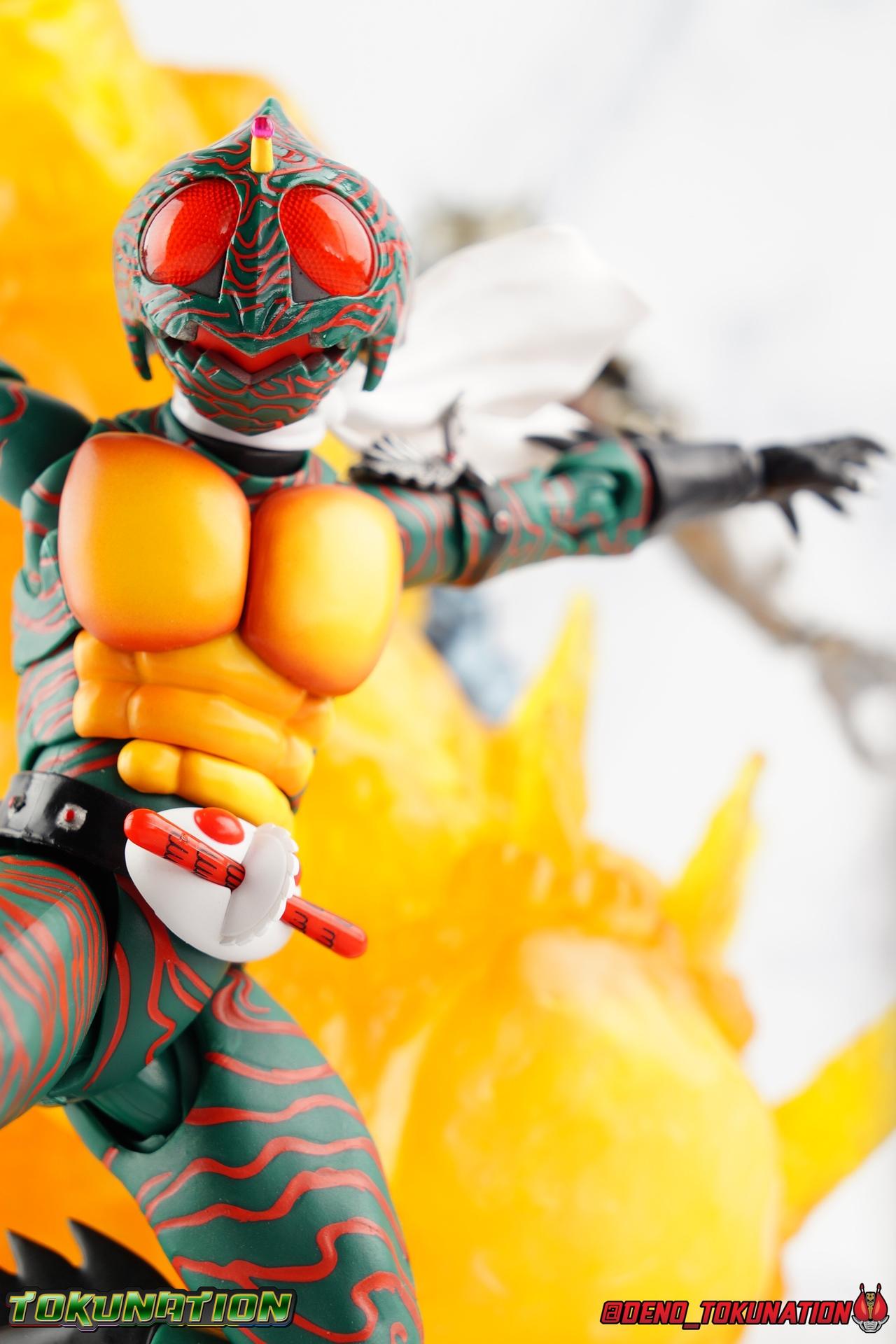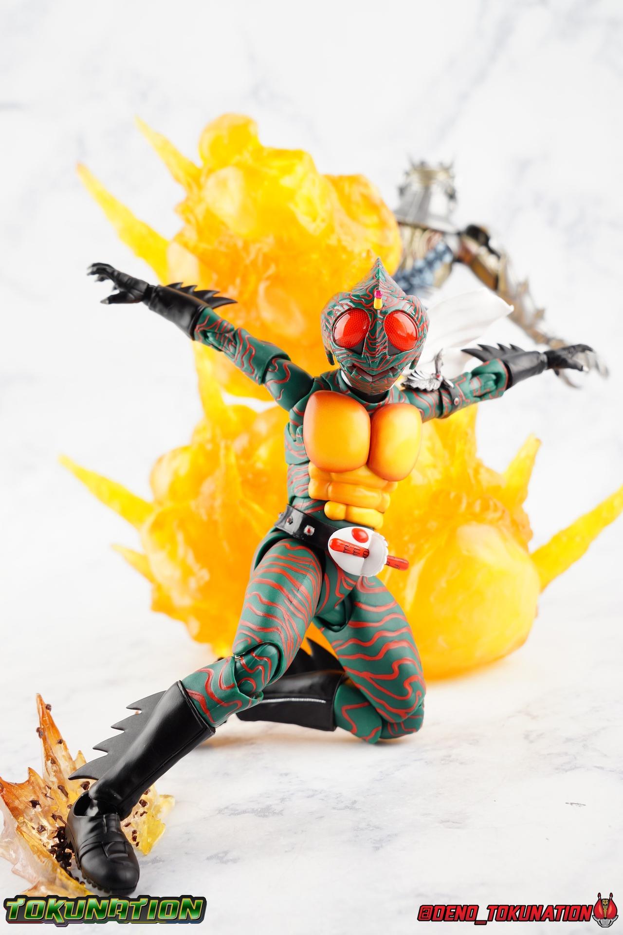 When the village Elder Bago passed the Incan GiGi Armlet to the wild boy Daisuke Yamamoto, he also performed an ancient ritual to save his life. In order to battle against the Ten-Faced Demon Gorgos, Daisuke would learn to use the ancient artifact he'd been entrusted with and master it's powers as Kamen Rider Amazon! Today, we see how Daisuke has evolved with a brand new figure, and the Amazon Series' first foray into the renewal era with S.H. Figuarts Shinkkocchou Seihou Kamen Rider Amazon! Packaging The familiar Shinkocchou Seihou slip cover box makes another appearance! Not much can be said about it this time that hasn't been said before. It's gotten a bit stale over time but it's still a pleasing type of collector's box. For Amazon we do have some cosmetic changes however. The new Bandai Spirits blue logo is featured on the box, as well as a new holofoil Tamashii Nations brand sticker. Main Figure 7 years ago, the original S.H. Figuarts Amazon was released, we reviewed it in 2016. At the time of it's release, this Amazon was already beginning to shift the quality of Showa figuarts, though it would be some time before real change came about with the Black & RX Renewals. Looking back now, Amazon is an extremely dated figure. But for it's time, it really was something else. The functionality & detail presented in it's sculpt was unprecedented. But things change, and now we have something of a next leap in the decade+ long history of S.H. Figuarts. Shinkocchou Seihou has slowly, but much more rapidly in the last 3 years, reshaped what figuarts are. Redesigning characters from the ground up with engineering that takes into account what these suits really looked like on screen, while accommodating the fact that there would be an actual person inside. As the first figure in the line, Kabuto really set the bar high, and I was highly impressed then. When Seihou W was released I found it easily to be the greatest release in the line thus far. Rider 1 was also an incredibly impressive change from it's original counterpart. With ALL of that being said, Shinkocchou Seihou Amazon is absolutely the best the line has to offer so far. Bar none. This version of Amazon, finally puts the original Figuart to shame. Just seeing the two side by side, it's evident just how short, wrongly colored, disproportionate, small overall, and frankly emaciated looking that figure was. The entire shape of it is just wrong. The Seihou is a thing of pure beauty to me. From the ground up, the suit has been fully realized and given the absolute best articulation possible given the design. Where the original had hollow ankles you could see straight through, the Seihou has fully formed feet on wide angle ball joints that provide plenty of posing opportunities. The knees are likewise just about perfect, they have far more range than the original, but like it, the calve spikes will impact the back of the leg when bent far enough. The hips also feature that wonderful interlaced style joint we've come to appreciate in recent years. Some people call it a diaper, but I greatly appreciate the separation of parts and joints in these hips. This complex design allows Amazon to assume some of his moist savage and acrobatic poses. Aside from functionality, the legs are detailed *perfectly*. Every red stripe is sculpted into the body of the figure, and this applies to their placement on the entire body. Then it's painted over. The sculpt is shallow as well, allowing the paint to look like red color on green fabric as with the actual suit. But the detailing isn't limited to just the body and appendages, Bandai has gone the extra mile and made sure that even the connecting joints of the figure feature this detail. Gone are the days of miscolored joints holding limbs together. This is perhaps my favorite minute detail. Moving up, we see Amazon's belt, the Condorer. Though not his henshin device, the Condorer is still just as iconic. The Seihou's belt is a bit more properly round, and has the black detailing the original lacked, while also being more proportionate to the body. Like the original it can be replaced with an open Condorer accessory. As huge an improvement as the legs are, the arms may be more so. The original figure suffered from long scrawny arms that lacked girth. Seihou Amazon is kind of jacked. Thankfully these arms also have a wealth of articulation. Fully unencumbered wrists, a natural elbow joint that fills in the gap as it moves, in much the same way as the knees. A full 360 bicep swivel, and possibly the best shoulder joint I've ever handled. More so than some other Seihou's (looking at you Rider 1), Amazon can bring his arms down to his sides a bit better, though still not totally flat. The trade-off is the excellent shoulder which allows full movement of the arms up and down in nearly any direction. The left arm features the GiGi Armlet, which looks a lot more natural this go around than with the original, as it actually goes around the entire bicep. The sculpt for it is phenomenally better as well. The abdomen and chest now are really something else. The original figure was separated into two chunks, with the pectoral section rotating a little above the lower half. The Seihou takes a cue from Rider 1 and separates this into 3 sections, which can each move independently. There are 3 rows of "abs", the lower most one being it's own ring on the torso, plugged into the waist itself. The middle section has the most movement, then the pecs can rotate a bit as well, but are actually more for arching the back or bending forward. Sometimes this can expose an ugly gap on the side, but it also just goes to show how much this figure can move. This section of the suit is just so much more accurate than the original, and thankfully doesn't have those wacky articulated pecs it did either. While these can move on the Seihou, you don't have giant gaps in them that expose the plastic underneath. And on Amazon's back is a finned spine