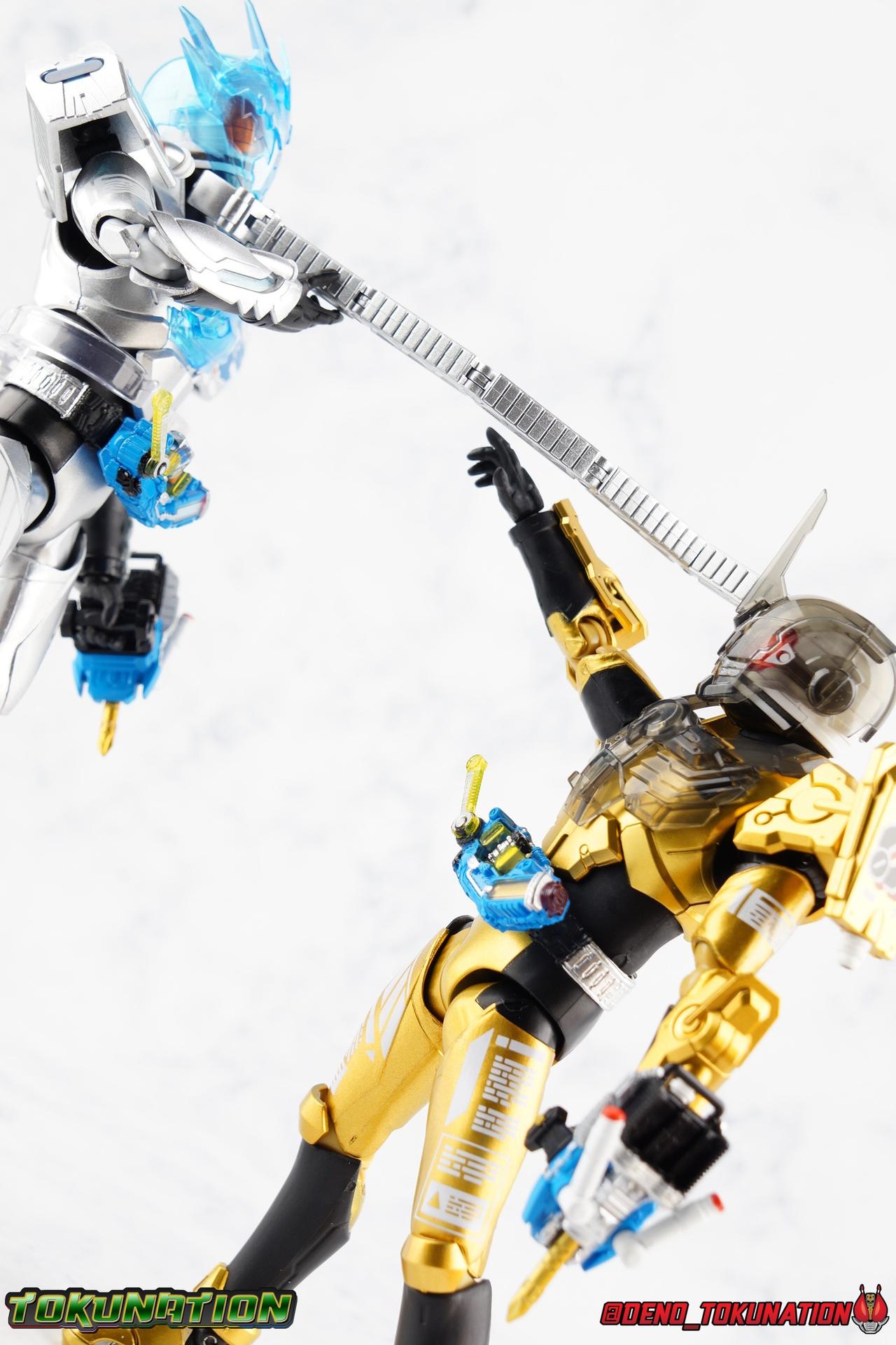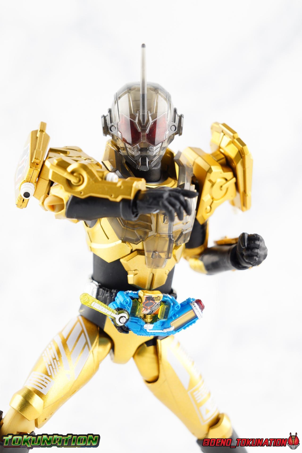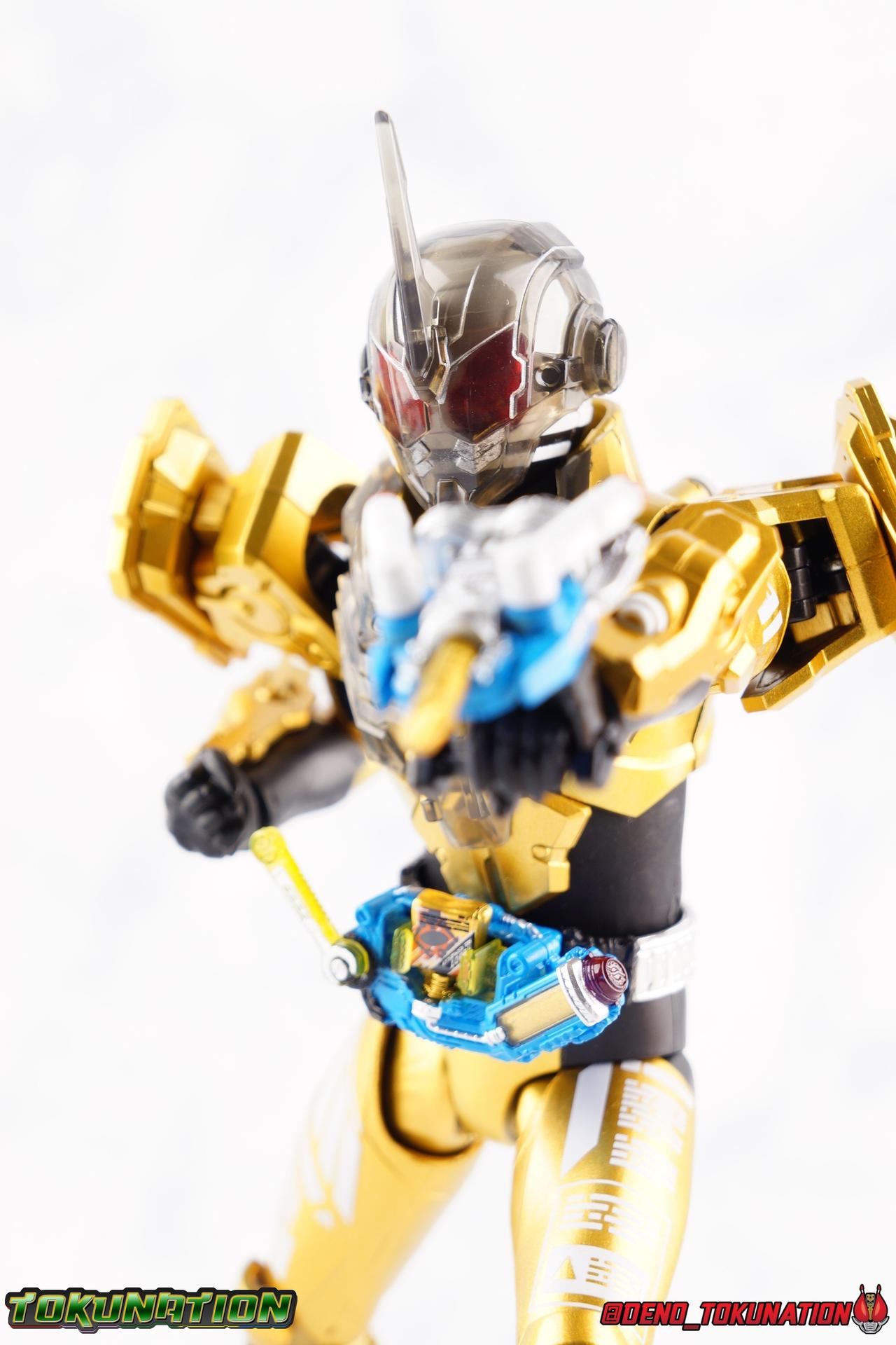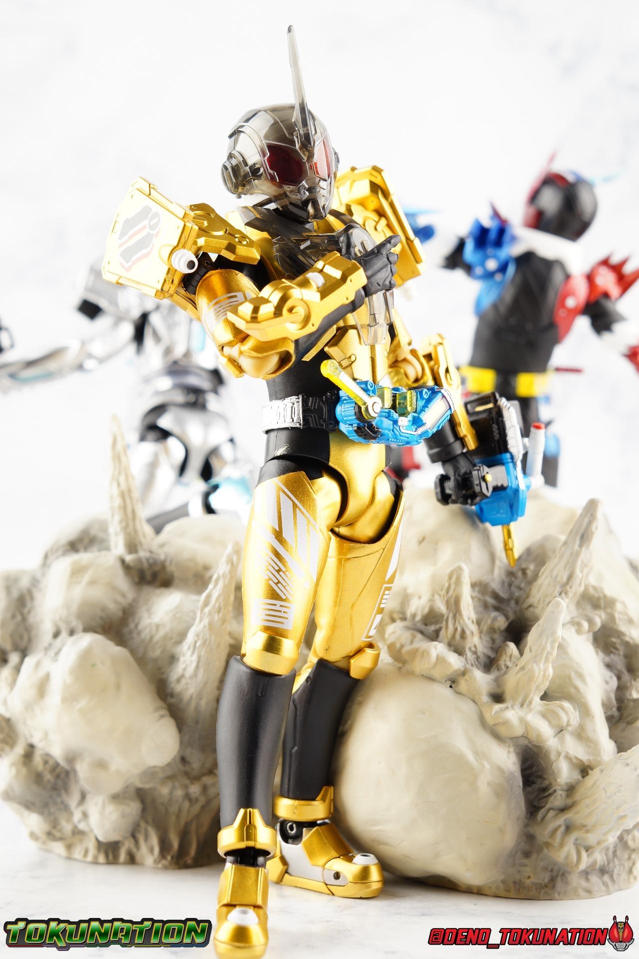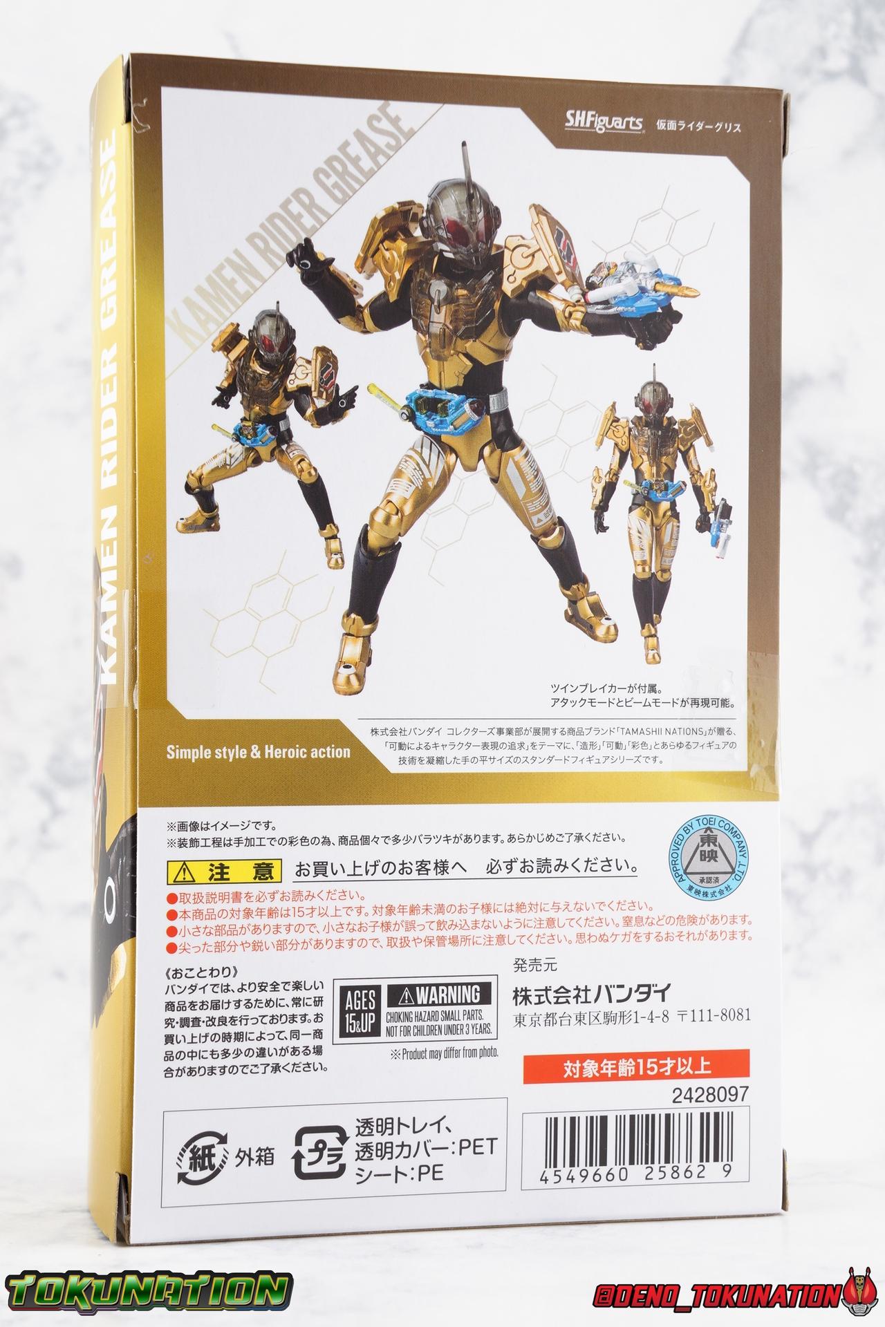 Kazumi Sawatari, was a humble farmer once. But the 3 sided war to unite or conquer Japan would change his destiny. At one time a foil to Sento Kiryu and his friends, Kazumi would come to find his greatest allies in this cobbled together cafe' crew. As Kamen Rider Grease, Kazumi would help defend Japan from the threats of industrialist Juzaburo Nanba, cybernetic aide turned insane rider Utsumi Nariaki, and the alien evil of Evolt. Driver in hand, Kazumi sacrificed everything to be a hero and stand up for those he lost, and those he loved. It's no wonder that the first collector figure of his rider form is already selling for huge markups now. Today's gallery will be a focus on S.H. Figuarts Kamen Rider Grease! Packaging As with previous Build releases, Grease has a bit of a two-tone package, themed on the "best match" aspect of the series. With Grease of course he only uses a Sclash Jelly to transform, so the two tones used are gold and brown. Not a lot of gradation between the two. So the box looks a bit boring, but does have some great stock photos adorning it. Main Figure Grease shares much of his body's basic tooling with the previously released Cross-Z Charge. While there are undeniable cosmetic differences, particularly in the upper body, if you've handled Charge. You can expect much of the same from Grease. The striking color scheme is what I'd like to touch on first. Grease is almost fully painted in a really gorgeous metallic gold. The only notable exceptions being the shins, abdomen and some of the hips, and of course the translucent parts. The finish on this is really excellent, I've only noticed a few iffy spots where the application is either over sprayed or a little under applied. The legs are accented by some silver applications on the feet, and some very sharp white techy detailing on the thighs. In fact this is all identical paint application and placement to Charge. The legs still feel like they have a much greater range of movement than the standard Build/Cross-Z or Night Rogue/Stalk molds. I do wish the ankles had a little more clearance, but the overall performance of the legs is nice. The waist features a brand new driver as well, the [B]Sclash Driver.[B] I always really dug this driver even if it was ultimately underused and completely replaced. Originally billed as the "big upgrade" near the middle of the series, and certainly used to great effect by Grease, Rogue, & Cross-Z Charge, it has been outclassed. To the point that by the series finale, only Rogue was still using it and even now, he's about to get a Build Driver based upgrade "Prime Rogue" in an upcoming DVD/V-Cinema. That's all beside the point. This driver works very well at this scale. The Wrench handle can move up and down and the included Robot Sclash Jelly can be removed as well as inserted into the Twin Breaker weapon. The upper body has an elaborate translucent black robot/mechanical design stretched across it that I really dig. The sculpt for this part is very well defined and the black plastic just the right opacity. The arms are pretty much standard, though the elbows aren't hindered in the same way as Charge. They do look quite nice thanks to that gold paint application and the white tamphographed details on the biceps. The shoulder pads have fantastic airbrushed style Robot art that would look very much at home on the side of a van I would love to drive. And these are on brand shoulders, totally different from Charge's. The pads on the shoulders can fully rotate to recreate Grease's rider kick. The forearms have been similarly remolded, though these parts make resting the Twin Breaker against the arm even more difficult than on Charge. Finally, the head, which is made with the same clear plastic as the chest. I really love how well the effect turned out on Charge, and the opacity of the helmet here is just spot on as well. The faceplate is sharp and well defined, while the features underneath it shine through in almost any lighting. There are very minor gray paint details on the face that draw out just a bit more detail as well. As with Charge, I really feel like they nailed it on this one. Overall this is another really great figure that while absolutely not perfect, is absolutely something of a must own for fans. Accessories Kazumi comes with everything he could really need: 4.5 - sets of hands. 1 left hand specifically meant for holding the Twin Breaker, 1 of each for holding Full Bottles, bike handlebars etc, and one pair of open palms for action poses. 1 - Twin Breaker. A straight repack of the one that came with Cross-Z Charge. This dual mode weapon always looked a bit clumsy to me in the show, but I like it for the most part here. The hand meant to grip it, holds it an angle but that can help navigate around the forearm a bit. I wish it could rest flush against the arm but that wouldn't be entirely accurate. The twin breaker comes packaged in Beam Mode with the gun barrels pointed forward. You can easily transition it to Attack Mode by rotating them back and extending the golden spear point in the middle. This locks nice and snugly in place, just be careful not to scratch it. It can accommodate two Full Bottles are Sclash Jellies as needed. 1 - Robot Full Bottle. Mine is molded a little crooked so it can't stand straight up but the real point of it is to interact with the Sclash Driver, Twin Breaker, or any other Full Bottle compatible device. 1 - Phoenix Full Bottle. Molded better than my Robot one, you can see the above for it's uses. Just be careful when trying to exchange any of these items. They are tiny and easy to lose and quite easy to scratch as well. I'm almost a little surprised that Grease doesn't included two Twin Breakers for the Double mode he gets when using the Dragon Sclash Jelly. Another item which could have been easily repacked here. But that's not Bandai's MO with this kind of stuff. Were it not cost prohibitive I'd actually pick up another Cross-Z Charge or Grease
