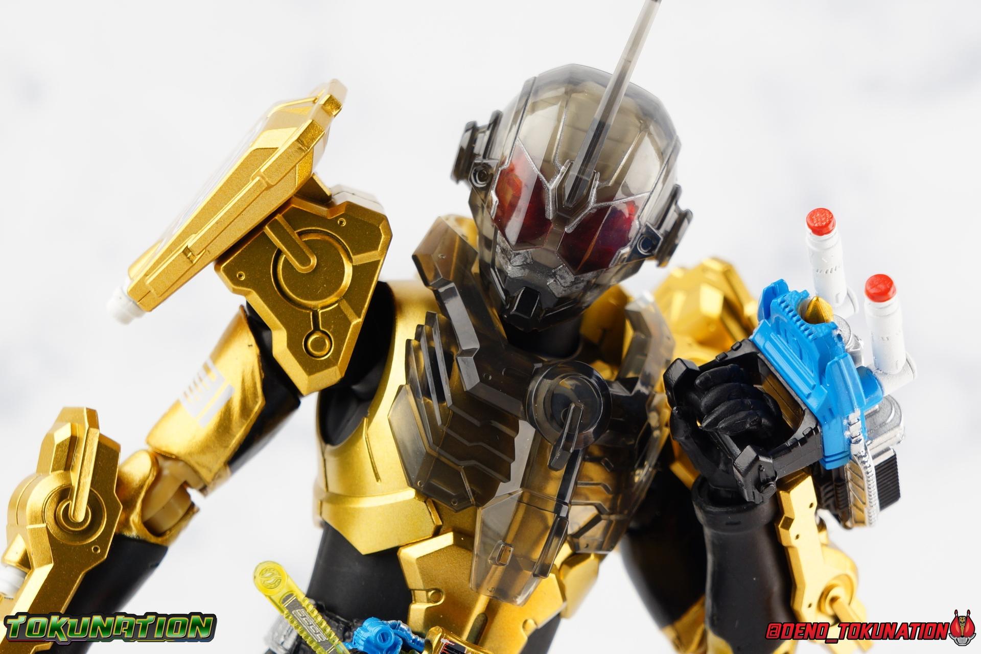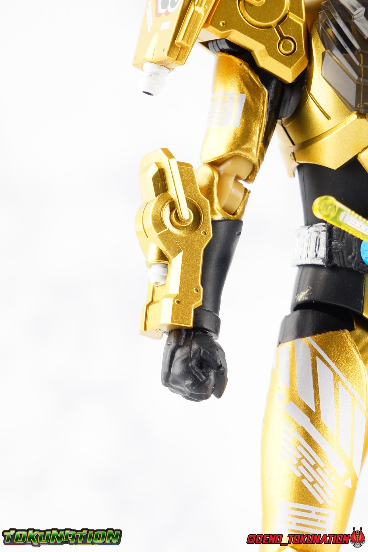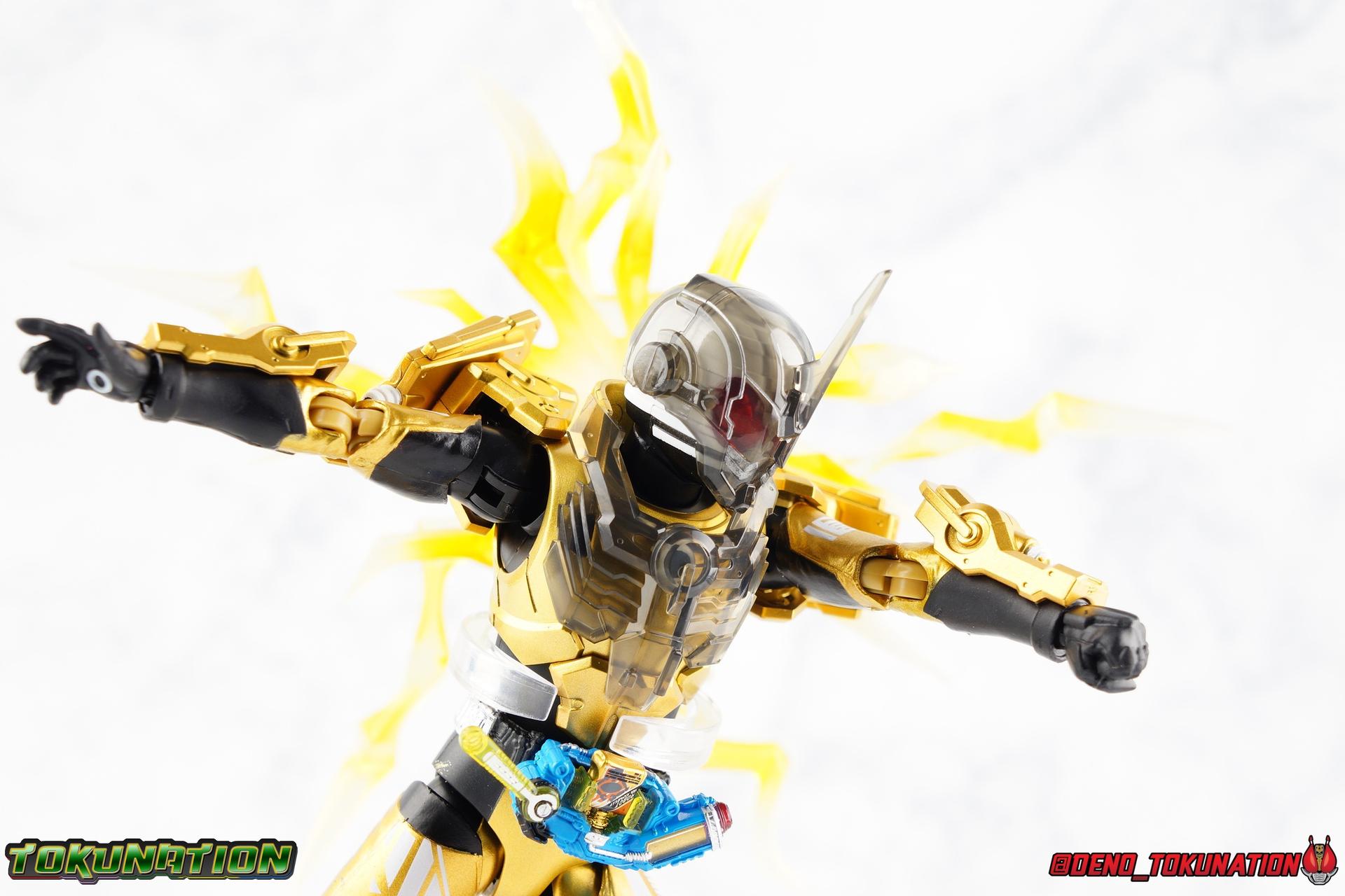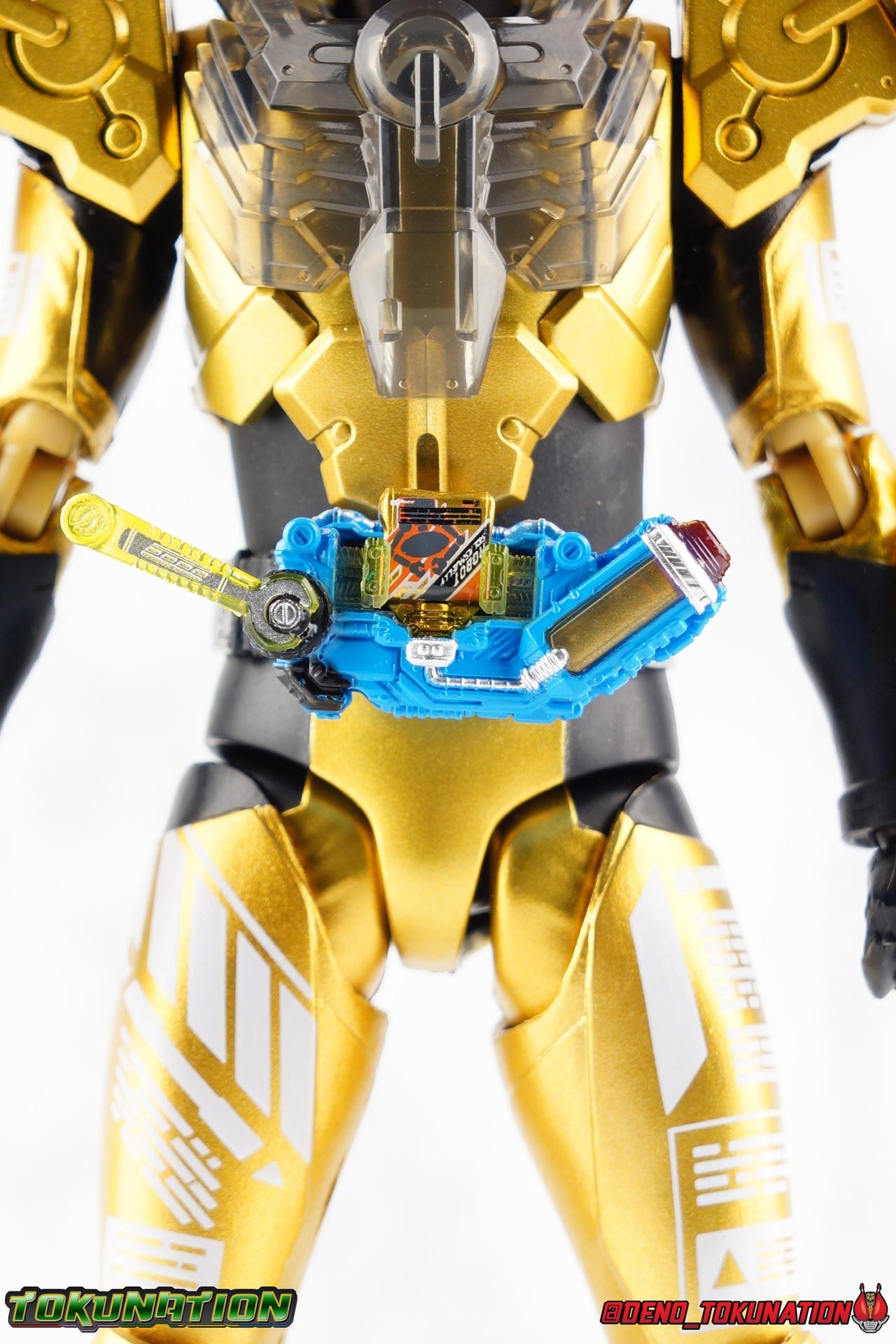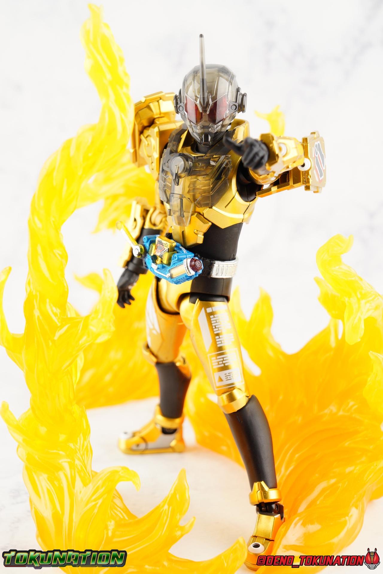 Kazumi Sawatari, was a humble farmer once. But the 3 sided war to unite or conquer Japan would change his destiny. At one time a foil to Sento Kiryu and his friends, Kazumi would come to find his greatest allies in this cobbled together cafe' crew. As Kamen Rider Grease, Kazumi would help defend Japan from the threats of industrialist Juzaburo Nanba, cybernetic aide turned insane rider Utsumi Nariaki, and the alien evil of Evolt. Driver in hand, Kazumi sacrificed everything to be a hero and stand up for those he lost, and those he loved. It's no wonder that the first collector figure of his rider form is already selling for huge markups now. Today's gallery will be a focus on S.H. Figuarts Kamen Rider Grease! Packaging As with previous Build releases, Grease has a bit of a two-tone package, themed on the "best match" aspect of the series. With Grease of course he only uses a Sclash Jelly to transform, so the two tones used are gold and brown. Not a lot of gradation between the two. So the box looks a bit boring, but does have some great stock photos adorning it. Main Figure Grease shares much of his body's basic tooling with the previously released Cross-Z Charge. While there are undeniable cosmetic differences, particularly in the upper body, if you've handled Charge. You can expect much of the same from Grease. The striking color scheme is what I'd like to touch on first. Grease is almost fully painted in a really gorgeous metallic gold. The only notable exceptions being the shins, abdomen and some of the hips, and of course the translucent parts. The finish on this is really excellent, I've only noticed a few iffy spots where the application is either over sprayed or a little under applied. The legs are accented by some silver applications on the feet, and some very sharp white techy detailing on the thighs. In fact this is all identical paint application and placement to Charge. The legs still feel like they have a much greater range of movement than the standard Build/Cross-Z or Night Rogue/Stalk molds. I do wish the ankles had a little more clearance, but the overall performance of the legs is nice. The waist features a brand new driver as well, the [B]Sclash Driver.[B] I always really dug this driver even if it was ultimately underused and completely replaced. Originally billed as the "big upgrade" near the middle of the series, and certainly used to great effect by Grease, Rogue, & Cross-Z Charge, it has been outclassed. To the point that by the series finale, only Rogue was still using it and even now, he's about to get a Build Driver based upgrade "Prime Rogue" in an upcoming DVD/V-Cinema. That's all beside the point. This driver works very well at this scale. The Wrench handle can move up and down and the included Robot Sclash Jelly can be removed as well as inserted into the Twin Breaker weapon. The upper body has an elaborate translucent black robot/mechanical design stretched across it that I really dig. The sculpt for this part is very well defined and the black plastic just the right opacity. The arms are pretty much standard, though the elbows aren't hindered in the same way as Charge. They do look quite nice thanks to that gold paint application and the white tamphographed details on the biceps. The shoulder pads have fantastic airbrushed style Robot art that would look very much at home on the side of a van I would love to drive. And these are on brand shoulders, totally different from Charge's. The pads on the shoulders can fully rotate to recreate Grease's rider kick. The forearms have been similarly remolded, though these parts make resting the Twin Breaker against the arm even more difficult than on Charge. Finally, the head, which is made with the same clear plastic as the chest. I really love how well the effect turned out on Charge, and the opacity of the helmet here is just spot on as well. The faceplate is sharp and well defined, while the features underneath it shine through in almost any lighting. There are very minor gray paint details on the face that draw out just a bit more detail as well. As with Charge, I really feel like they nailed it on this one. Overall this is another really great figure that while absolutely not perfect, is absolutely something of a must own for fans. Accessories Kazumi comes with everything he could really need: 4.5 - sets of hands. 1 left hand specifically meant for holding the Twin Breaker, 1 of each for holding Full Bottles, bike handlebars etc, and one pair of open palms for action poses. 1 - Twin Breaker. A straight repack of the one that came with Cross-Z Charge. This dual mode weapon always looked a bit clumsy to me in the show, but I like it for the most part here. The hand meant to grip it, holds it an angle but that can help navigate around the forearm a bit. I wish it could rest flush against the arm but that wouldn't be entirely accurate. The twin breaker comes packaged in Beam Mode with the gun barrels pointed forward. You can easily transition it to Attack Mode by rotating them back and extending the golden spear point in the middle. This locks nice and snugly in place, just be careful not to scratch it. It can accommodate two Full Bottles are Sclash Jellies as needed. 1 - Robot Full Bottle. Mine is molded a little crooked so it can't stand straight up but the real point of it is to interact with the Sclash Driver, Twin Breaker, or any other Full Bottle compatible device. 1 - Phoenix Full Bottle. Molded better than my Robot one, you can see the above for it's uses. Just be careful when trying to exchange any of these items. They are tiny and easy to lose and quite easy to scratch as well. I'm almost a little surprised that Grease doesn't included two Twin Breakers for the Double mode he gets when using the Dragon Sclash Jelly. Another item which could have been easily repacked here. But that's not Bandai's MO with this kind of stuff. Were it not cost prohibitive I'd actually pick up another Cross-Z Charge or Grease