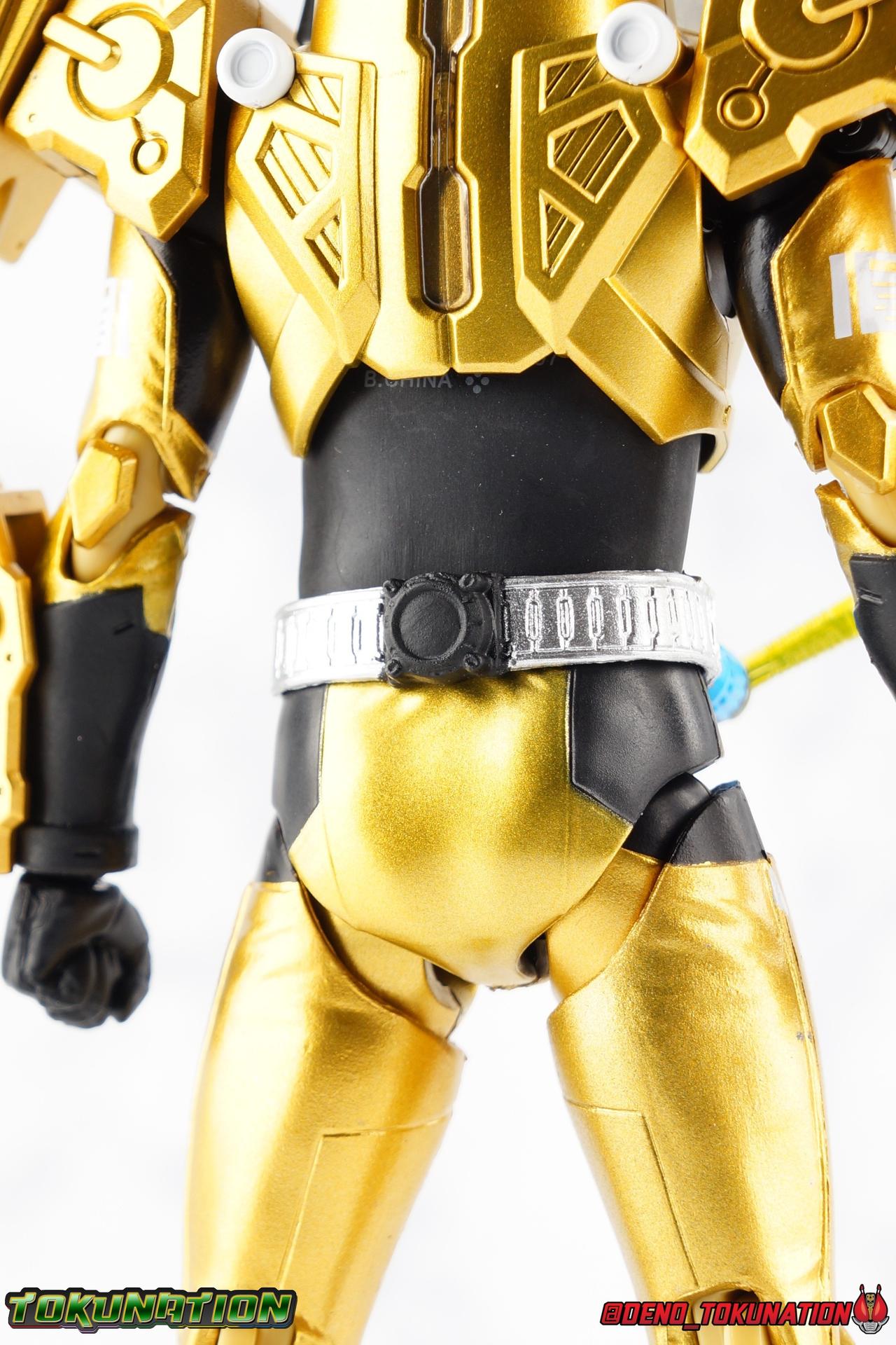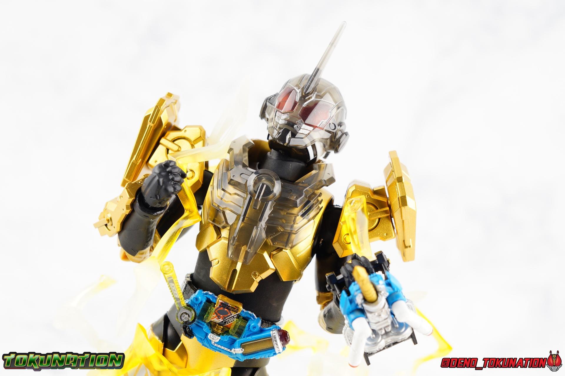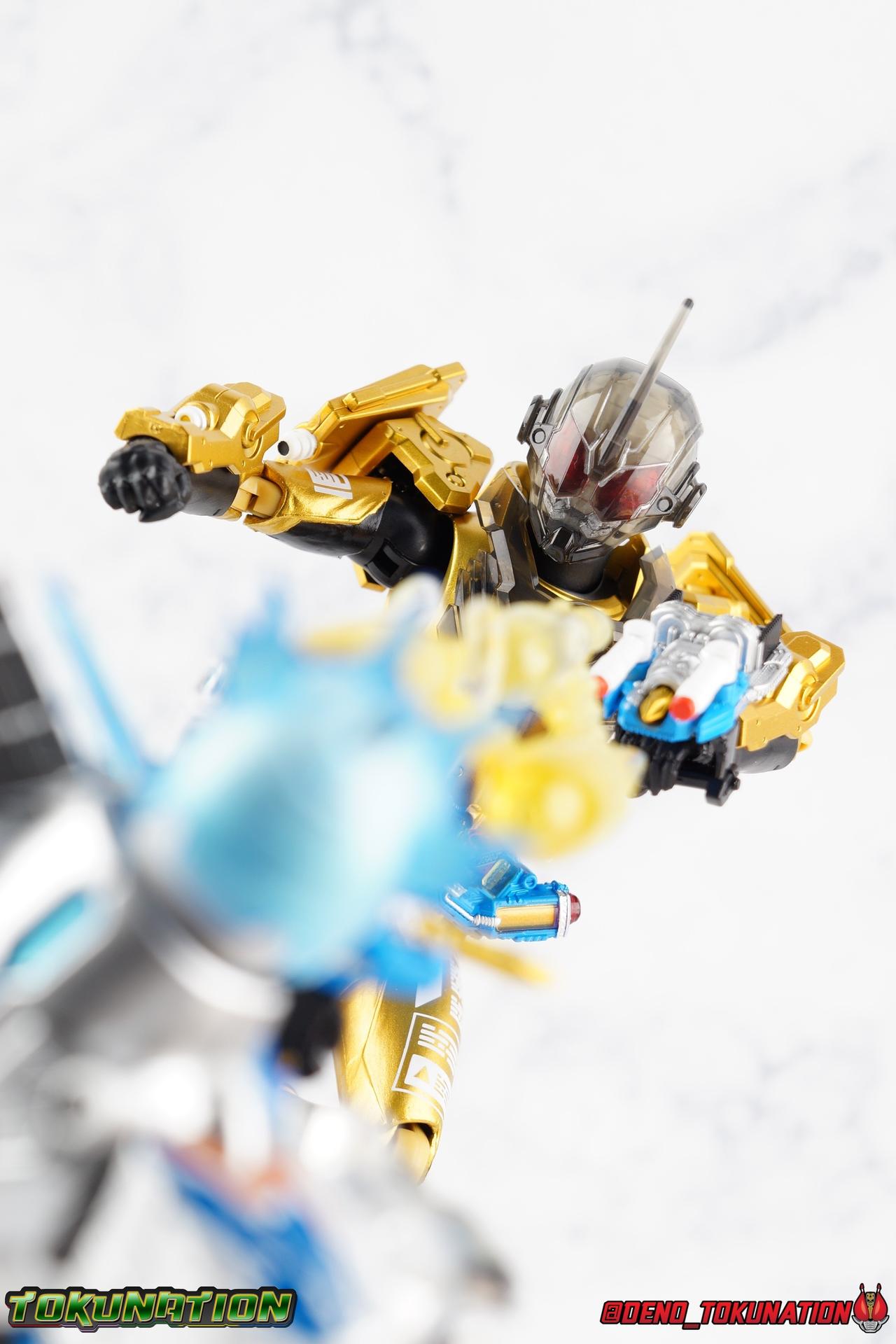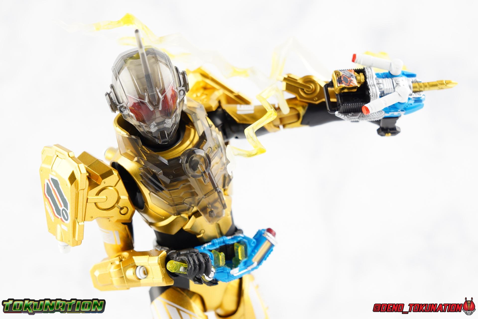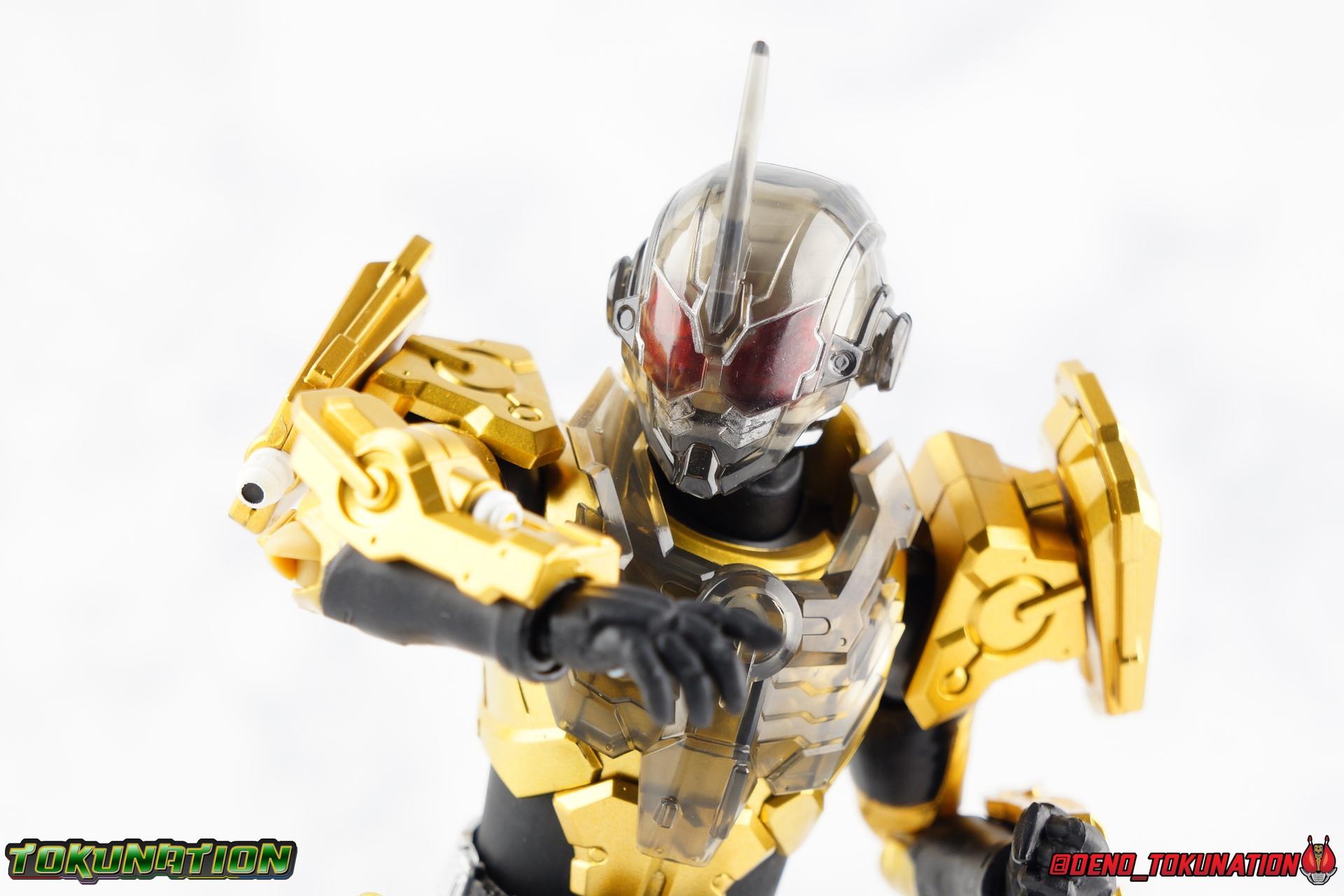 Kazumi Sawatari, was a humble farmer once. But the 3 sided war to unite or conquer Japan would change his destiny. At one time a foil to Sento Kiryu and his friends, Kazumi would come to find his greatest allies in this cobbled together cafe' crew. As Kamen Rider Grease, Kazumi would help defend Japan from the threats of industrialist Juzaburo Nanba, cybernetic aide turned insane rider Utsumi Nariaki, and the alien evil of Evolt. Driver in hand, Kazumi sacrificed everything to be a hero and stand up for those he lost, and those he loved. It's no wonder that the first collector figure of his rider form is already selling for huge markups now. Today's gallery will be a focus on S.H. Figuarts Kamen Rider Grease! Packaging As with previous Build releases, Grease has a bit of a two-tone package, themed on the "best match" aspect of the series. With Grease of course he only uses a Sclash Jelly to transform, so the two tones used are gold and brown. Not a lot of gradation between the two. So the box looks a bit boring, but does have some great stock photos adorning it. Main Figure Grease shares much of his body's basic tooling with the previously released Cross-Z Charge. While there are undeniable cosmetic differences, particularly in the upper body, if you've handled Charge. You can expect much of the same from Grease. The striking color scheme is what I'd like to touch on first. Grease is almost fully painted in a really gorgeous metallic gold. The only notable exceptions being the shins, abdomen and some of the hips, and of course the translucent parts. The finish on this is really excellent, I've only noticed a few iffy spots where the application is either over sprayed or a little under applied. The legs are accented by some silver applications on the feet, and some very sharp white techy detailing on the thighs. In fact this is all identical paint application and placement to Charge. The legs still feel like they have a much greater range of movement than the standard Build/Cross-Z or Night Rogue/Stalk molds. I do wish the ankles had a little more clearance, but the overall performance of the legs is nice. The waist features a brand new driver as well, the [B]Sclash Driver.[B] I always really dug this driver even if it was ultimately underused and completely replaced. Originally billed as the "big upgrade" near the middle of the series, and certainly used to great effect by Grease, Rogue, & Cross-Z Charge, it has been outclassed. To the point that by the series finale, only Rogue was still using it and even now, he's about to get a Build Driver based upgrade "Prime Rogue" in an upcoming DVD/V-Cinema. That's all beside the point. This driver works very well at this scale. The Wrench handle can move up and down and the included Robot Sclash Jelly can be removed as well as inserted into the Twin Breaker weapon. The upper body has an elaborate translucent black robot/mechanical design stretched across it that I really dig. The sculpt for this part is very well defined and the black plastic just the right opacity. The arms are pretty much standard, though the elbows aren't hindered in the same way as Charge. They do look quite nice thanks to that gold paint application and the white tamphographed details on the biceps. The shoulder pads have fantastic airbrushed style Robot art that would look very much at home on the side of a van I would love to drive. And these are on brand shoulders, totally different from Charge's. The pads on the shoulders can fully rotate to recreate Grease's rider kick. The forearms have been similarly remolded, though these parts make resting the Twin Breaker against the arm even more difficult than on Charge. Finally, the head, which is made with the same clear plastic as the chest. I really love how well the effect turned out on Charge, and the opacity of the helmet here is just spot on as well. The faceplate is sharp and well defined, while the features underneath it shine through in almost any lighting. There are very minor gray paint details on the face that draw out just a bit more detail as well. As with Charge, I really feel like they nailed it on this one. Overall this is another really great figure that while absolutely not perfect, is absolutely something of a must own for fans. Accessories Kazumi comes with everything he could really need: 4.5 - sets of hands. 1 left hand specifically meant for holding the Twin Breaker, 1 of each for holding Full Bottles, bike handlebars etc, and one pair of open palms for action poses. 1 - Twin Breaker. A straight repack of the one that came with Cross-Z Charge. This dual mode weapon always looked a bit clumsy to me in the show, but I like it for the most part here. The hand meant to grip it, holds it an angle but that can help navigate around the forearm a bit. I wish it could rest flush against the arm but that wouldn't be entirely accurate. The twin breaker comes packaged in Beam Mode with the gun barrels pointed forward. You can easily transition it to Attack Mode by rotating them back and extending the golden spear point in the middle. This locks nice and snugly in place, just be careful not to scratch it. It can accommodate two Full Bottles are Sclash Jellies as needed. 1 - Robot Full Bottle. Mine is molded a little crooked so it can't stand straight up but the real point of it is to interact with the Sclash Driver, Twin Breaker, or any other Full Bottle compatible device. 1 - Phoenix Full Bottle. Molded better than my Robot one, you can see the above for it's uses. Just be careful when trying to exchange any of these items. They are tiny and easy to lose and quite easy to scratch as well. I'm almost a little surprised that Grease doesn't included two Twin Breakers for the Double mode he gets when using the Dragon Sclash Jelly. Another item which could have been easily repacked here. But that's not Bandai's MO with this kind of stuff. Were it not cost prohibitive I'd actually pick up another Cross-Z Charge or Grease