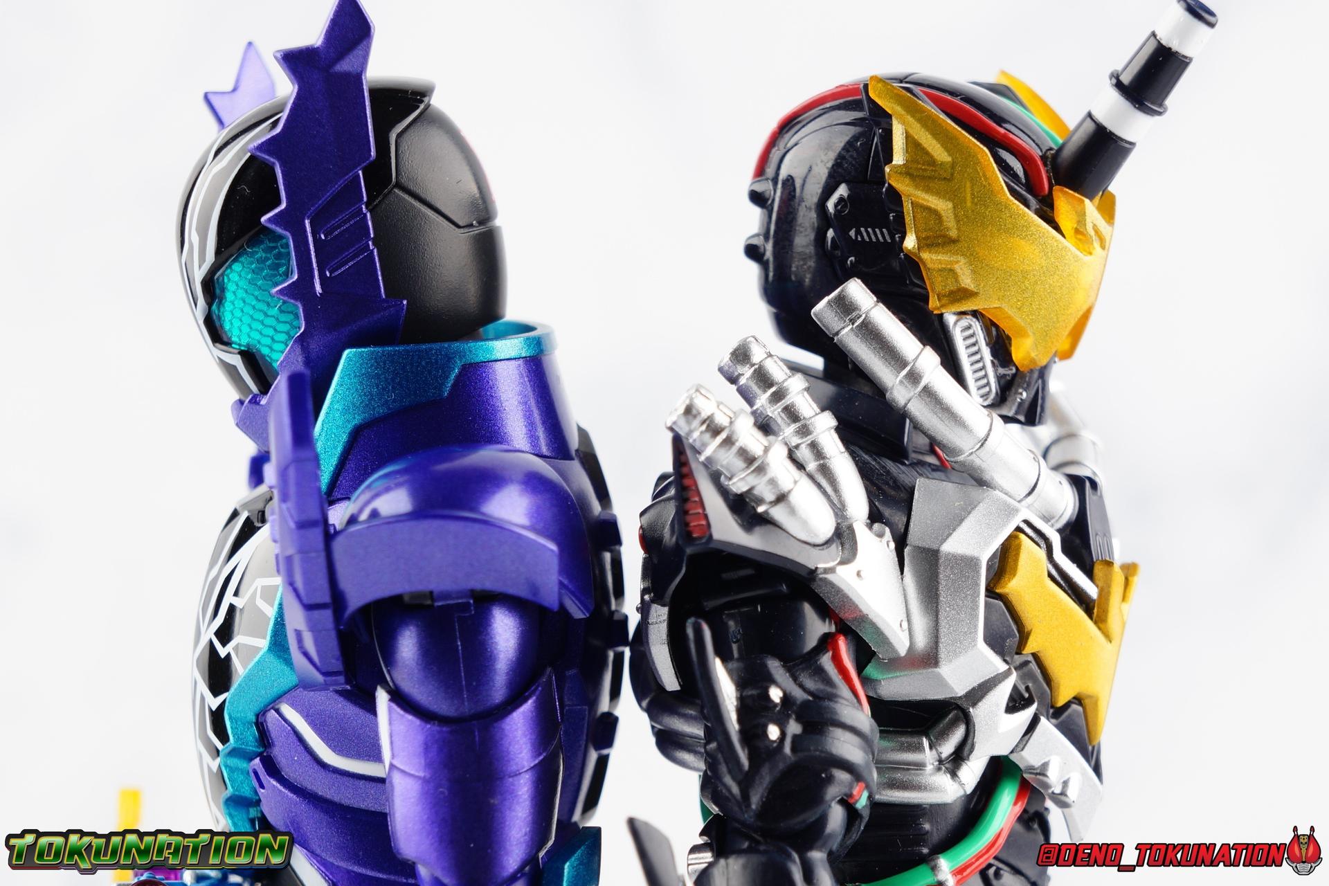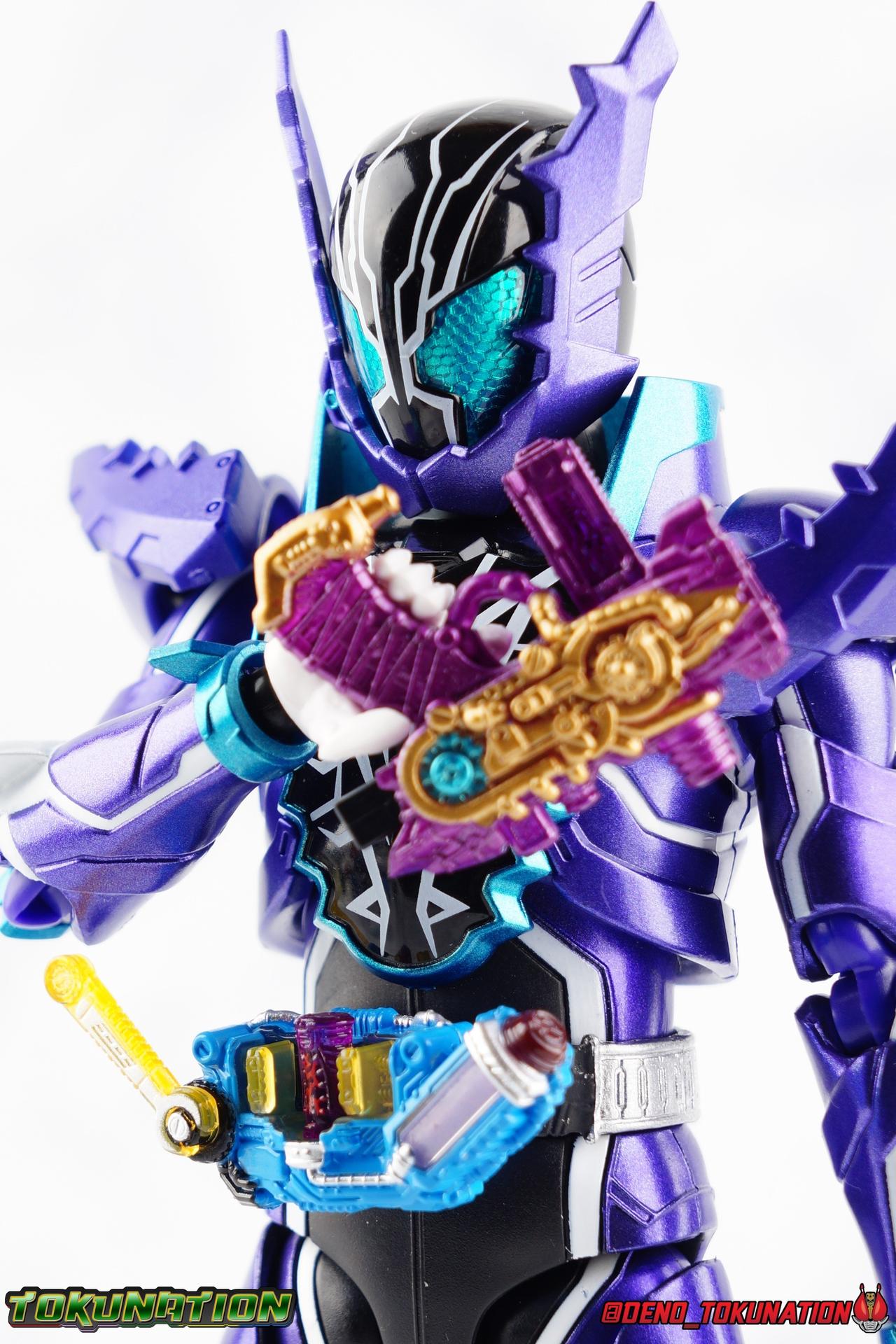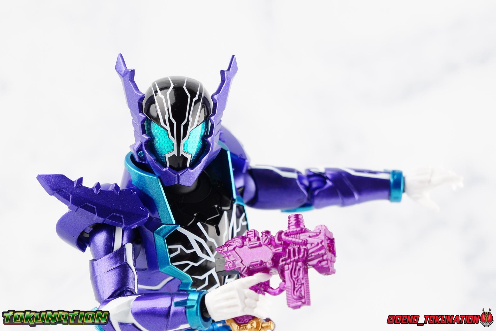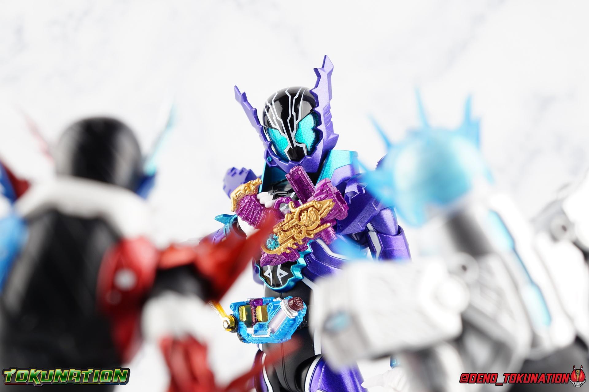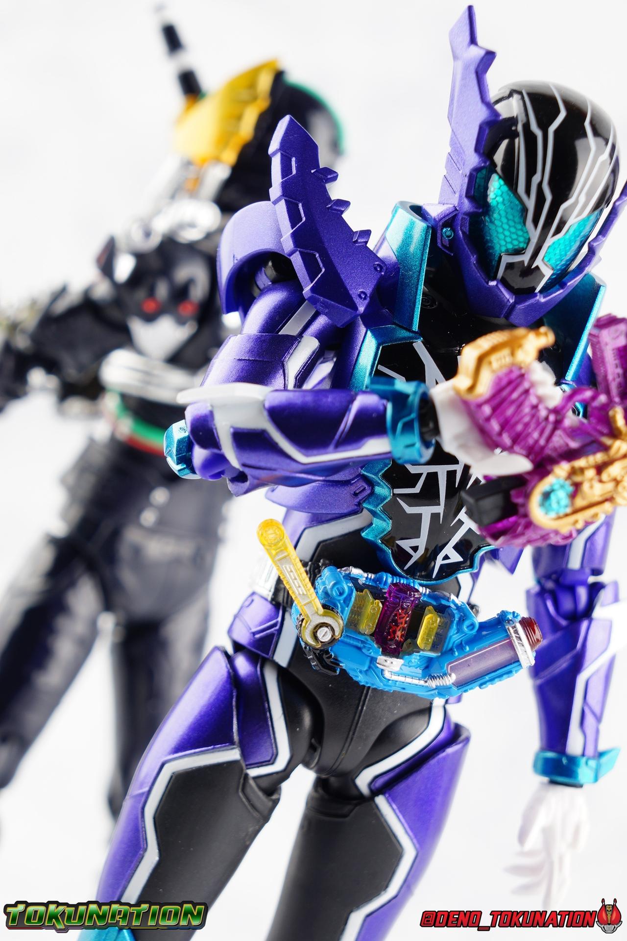 Gentoku Himuro lusted for power as the monstrous Night Rogue. Defeated and broken, he sought refuge in neighboring Seito, only to experience savage physical trials. Gaining power, he was forced into service by Utsumi Nariaki & Blood Stalk. But cured of the Nebula Gas influence, Gentoku remembered what it meant to fight for his country. It was only a matter of time before his heart was free to fight for his people, and his father's memory. Though he once struck fear into our heroes hearts, Gentoku would fight for love and peace as the dangerous Kamen Rider Rogue! Packaging The standard two-tone packaging of the Build line is back with some gorgeous purple and blue shades. Rogue's suit colors have always really worked for me and that no different when it comes to this packaging. Rogue's box is also another of the recent Tamashii releases to feature the blue Bandai Spirits logo as well as the new holofoil Tamashii Nations brand sticker. Main Figure Kamen Rider Rogue is the first new mold the Build line has introduced in a little while. The last truly new mold being the one shared by Cross-Z Charge & Grease. Rogue only has one possible repaint as well, Prime Rogue, which was recently revealed at Tamashii Nations 2018 and could realistically see release unlike *any* other Hyper Battle Video form ever before it. That being said, Bandai really needed to make this mold a winner to justify it's existence, though the character's popularity already ensured that. Rogue is a suit that I've kind of been in love with since it's introduction. The colors pops, the symmetry of the design is a great departure from a lot of what we'd seen from build at the time, and that Crocodile theme is so subtle but so perfect. It was several days after this suits debut in show that I even realized the head was literally a crocodile mouth biting down on it's victim. That kind of understated beauty really works for me. But Rogue's colors are what really hit you first. The purple/teal/white/black assortment puts me in mind of the typical "evil repaint" character we see in lot's of shows and toylines, even though this is an all new mold. The purple is a really nice royal shade with some grit to the finish that shines in the right light. The teal accents are so bright and really accent that purple well, while the black and white break up what would otherwise be a very "G2" color scheme for you Transformers fans out there. Aside from colors the mold itself is pretty excellent. Again it's the subtle qualities of it that work best. Like Rogue's feet feature crocodile claws protruding from the toes, and there are fins on the legs that suggest just as much danger. The toes bend far further than expected, while the ankles don't bend back far enough. The knees are more or less perfect with a good bend to them while the hips leave a bit to be desired in their forward movement. However I do always appreciate it when Bandai gets the little details right. Like the inner part of the hip joint completing the paint details from the thighs. The legs are imperfect, but they look great. The waist features the same Sclash Driver we saw with Cross-Z Charge & Grease. This will also be it's last outing in the toyline, as those 3 riders were it's only users. Of course Rogue is the only one of these three users who does not use a Sclash Jelly to transform. Instead this form is powered by the unique Crocodile Crack Full Bottle. The one included with the figuart has the molded details and red crack down, though it is missing the gold & green paint apps on the tip of the bottle. The upper body is separated into two chunks, the lower torso rotates behind the "cracked" chest. This chest panel extends all the way down past where abs would be and can impact the Driver so jsut be careful not to scratch it. I love the detailing on the front of the torso but do I ever love that segmented mechanical spine along the back of the figure. It just looks fantastic in person. The arms feature more of that crocodile subtlety like protrusions on the knuckles & forearm, and literal crocodile tails on the shoulders. The arms function great, but the shoulder pads are kind of nuisance. Not as bad as Grease or Cross-Z Charge, but they do inhibit outward movement. Rogue's head is still the pinnacle of this suit's design. I know some people think it's a bit off size wise but I think it really hits the nail on the head.Rogue's head of course is modeled on a crocodile biting down on it's victim. the lower right jaw line even features a rider jewel, positioned like the croc's eye, while the teeth line the users head. It's a disturbingly great design that's subtle enough many didn't notice it at first. The teal compound eyes set against this backdrop pop so brightly as well. And we can't forget the last perfect detail to compliment this, the fragile sticker on the back of the head. It was another detail a lot of people didn't notice initially, but it's just such nice a touch and a good little joke regarding the design of the head. I'm really happy to see it on the figuart too. All in all this is an excellent figure that will looks great with your other Build Riders. For some fun I included another pair of shots near the end of the gallery you may enjoy. Rogue is the first Crocodile themed rider in the franchise, so I put him with the first Alligator themed one, Kamen Rider Gaoh! These figure's are separated by nearly 10 years of engineering changes in S.H. Figuarts, and 10 years worth of shows. It's wild what a difference such a short time can make. I thought it was fun, hope you do too. Accessions Rogue Comes with quite a bit honestly: 1 - Remocon Gear. The transformation trinket for Fu Washio/Remocon Bros. Like a Full Bottle, it can interact with the Transteam or the as intended Nebula Steam Gun. But because of the way it's sculpted it won't work with the Twin Breaker, Build Driver, Beat Crosser, etc. 1 - Engine Gear. The transformation trinket for Rai Washio/EngineBros. Lik