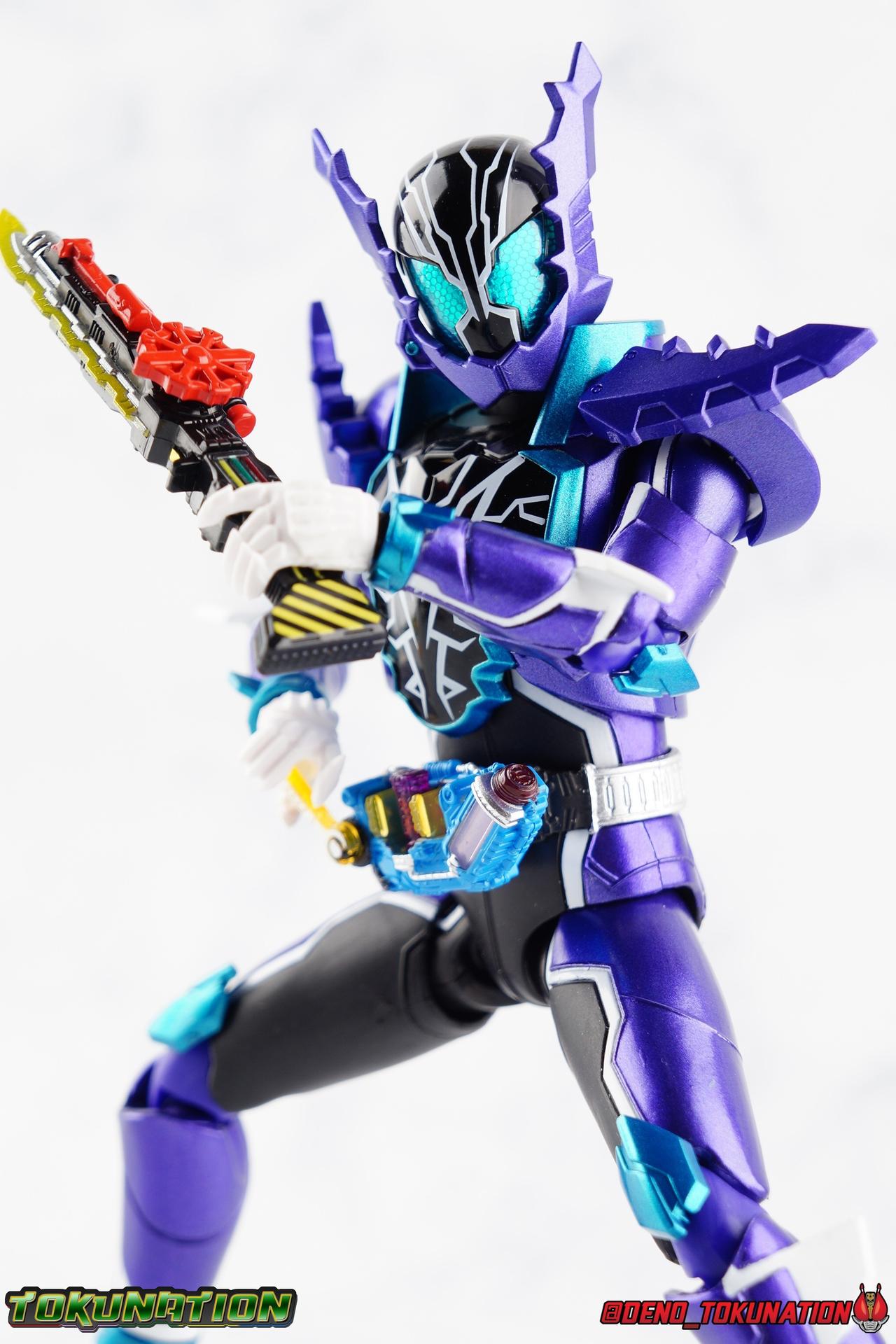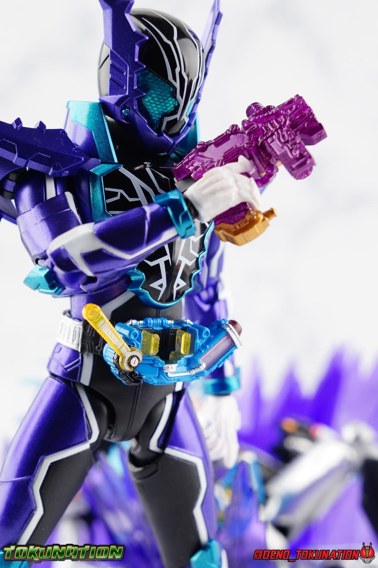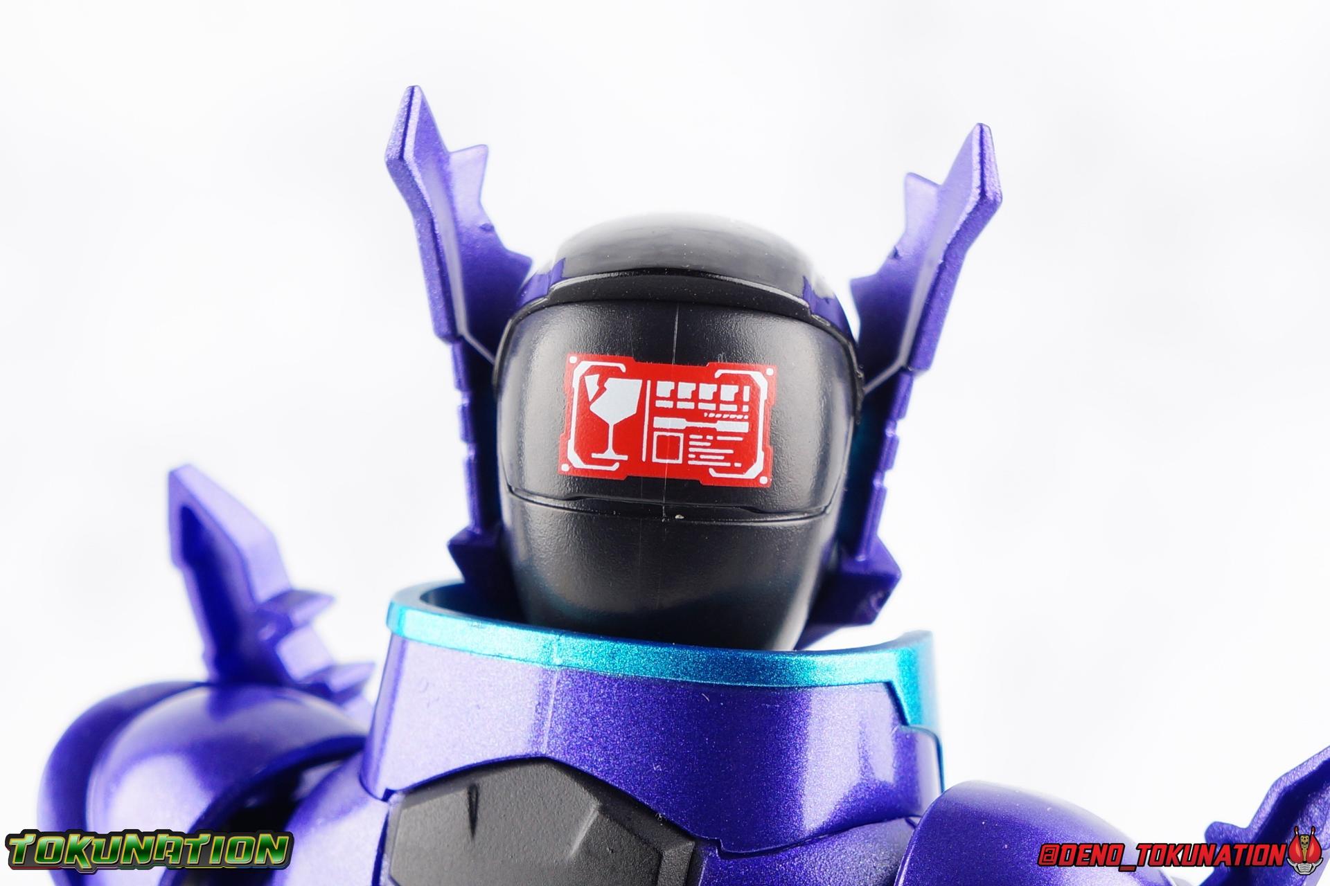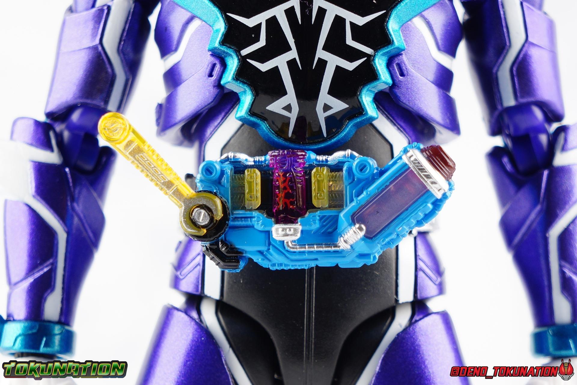 Gentoku Himuro lusted for power as the monstrous Night Rogue. Defeated and broken, he sought refuge in neighboring Seito, only to experience savage physical trials. Gaining power, he was forced into service by Utsumi Nariaki & Blood Stalk. But cured of the Nebula Gas influence, Gentoku remembered what it meant to fight for his country. It was only a matter of time before his heart was free to fight for his people, and his father's memory. Though he once struck fear into our heroes hearts, Gentoku would fight for love and peace as the dangerous Kamen Rider Rogue! Packaging The standard two-tone packaging of the Build line is back with some gorgeous purple and blue shades. Rogue's suit colors have always really worked for me and that no different when it comes to this packaging. Rogue's box is also another of the recent Tamashii releases to feature the blue Bandai Spirits logo as well as the new holofoil Tamashii Nations brand sticker. Main Figure Kamen Rider Rogue is the first new mold the Build line has introduced in a little while. The last truly new mold being the one shared by Cross-Z Charge & Grease. Rogue only has one possible repaint as well, Prime Rogue, which was recently revealed at Tamashii Nations 2018 and could realistically see release unlike *any* other Hyper Battle Video form ever before it. That being said, Bandai really needed to make this mold a winner to justify it's existence, though the character's popularity already ensured that. Rogue is a suit that I've kind of been in love with since it's introduction. The colors pops, the symmetry of the design is a great departure from a lot of what we'd seen from build at the time, and that Crocodile theme is so subtle but so perfect. It was several days after this suits debut in show that I even realized the head was literally a crocodile mouth biting down on it's victim. That kind of understated beauty really works for me. But Rogue's colors are what really hit you first. The purple/teal/white/black assortment puts me in mind of the typical "evil repaint" character we see in lot's of shows and toylines, even though this is an all new mold. The purple is a really nice royal shade with some grit to the finish that shines in the right light. The teal accents are so bright and really accent that purple well, while the black and white break up what would otherwise be a very "G2" color scheme for you Transformers fans out there. Aside from colors the mold itself is pretty excellent. Again it's the subtle qualities of it that work best. Like Rogue's feet feature crocodile claws protruding from the toes, and there are fins on the legs that suggest just as much danger. The toes bend far further than expected, while the ankles don't bend back far enough. The knees are more or less perfect with a good bend to them while the hips leave a bit to be desired in their forward movement. However I do always appreciate it when Bandai gets the little details right. Like the inner part of the hip joint completing the paint details from the thighs. The legs are imperfect, but they look great. The waist features the same Sclash Driver we saw with Cross-Z Charge & Grease. This will also be it's last outing in the toyline, as those 3 riders were it's only users. Of course Rogue is the only one of these three users who does not use a Sclash Jelly to transform. Instead this form is powered by the unique Crocodile Crack Full Bottle. The one included with the figuart has the molded details and red crack down, though it is missing the gold & green paint apps on the tip of the bottle. The upper body is separated into two chunks, the lower torso rotates behind the "cracked" chest. This chest panel extends all the way down past where abs would be and can impact the Driver so jsut be careful not to scratch it. I love the detailing on the front of the torso but do I ever love that segmented mechanical spine along the back of the figure. It just looks fantastic in person. The arms feature more of that crocodile subtlety like protrusions on the knuckles & forearm, and literal crocodile tails on the shoulders. The arms function great, but the shoulder pads are kind of nuisance. Not as bad as Grease or Cross-Z Charge, but they do inhibit outward movement. Rogue's head is still the pinnacle of this suit's design. I know some people think it's a bit off size wise but I think it really hits the nail on the head.Rogue's head of course is modeled on a crocodile biting down on it's victim. the lower right jaw line even features a rider jewel, positioned like the croc's eye, while the teeth line the users head. It's a disturbingly great design that's subtle enough many didn't notice it at first. The teal compound eyes set against this backdrop pop so brightly as well. And we can't forget the last perfect detail to compliment this, the fragile sticker on the back of the head. It was another detail a lot of people didn't notice initially, but it's just such nice a touch and a good little joke regarding the design of the head. I'm really happy to see it on the figuart too. All in all this is an excellent figure that will looks great with your other Build Riders. For some fun I included another pair of shots near the end of the gallery you may enjoy. Rogue is the first Crocodile themed rider in the franchise, so I put him with the first Alligator themed one, Kamen Rider Gaoh! These figure's are separated by nearly 10 years of engineering changes in S.H. Figuarts, and 10 years worth of shows. It's wild what a difference such a short time can make. I thought it was fun, hope you do too. Accessions Rogue Comes with quite a bit honestly: 1 - Remocon Gear. The transformation trinket for Fu Washio/Remocon Bros. Like a Full Bottle, it can interact with the Transteam or the as intended Nebula Steam Gun. But because of the way it's sculpted it won't work with the Twin Breaker, Build Driver, Beat Crosser, etc. 1 - Engine Gear. The transformation trinket for Rai Washio/EngineBros. Lik