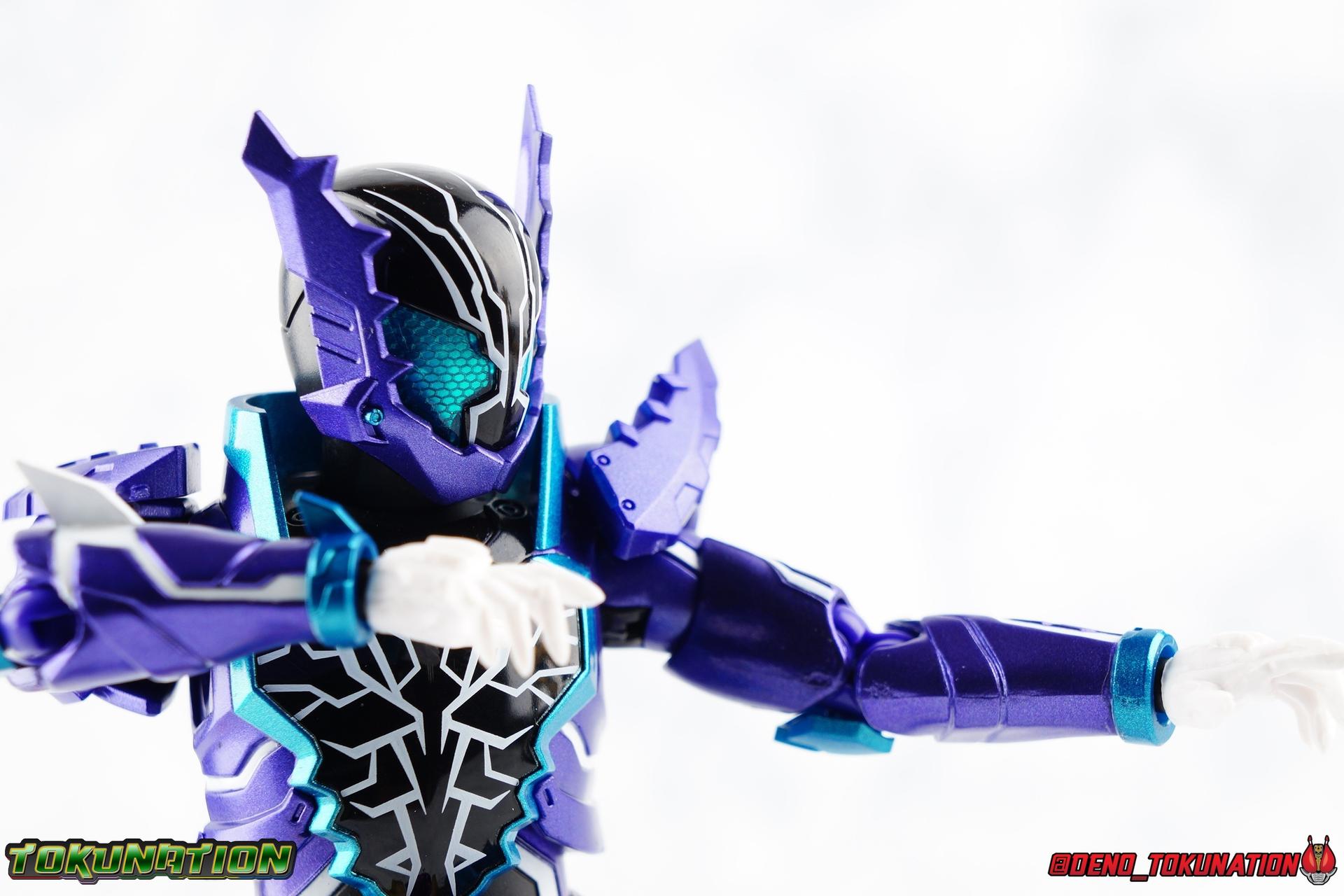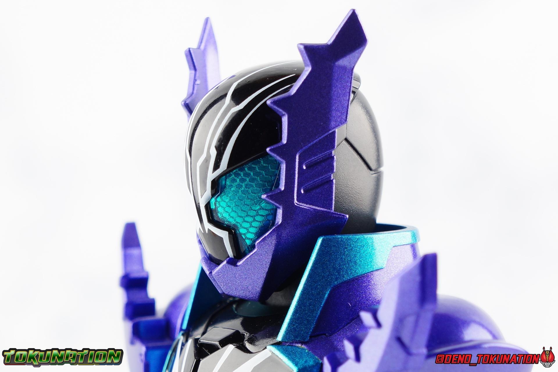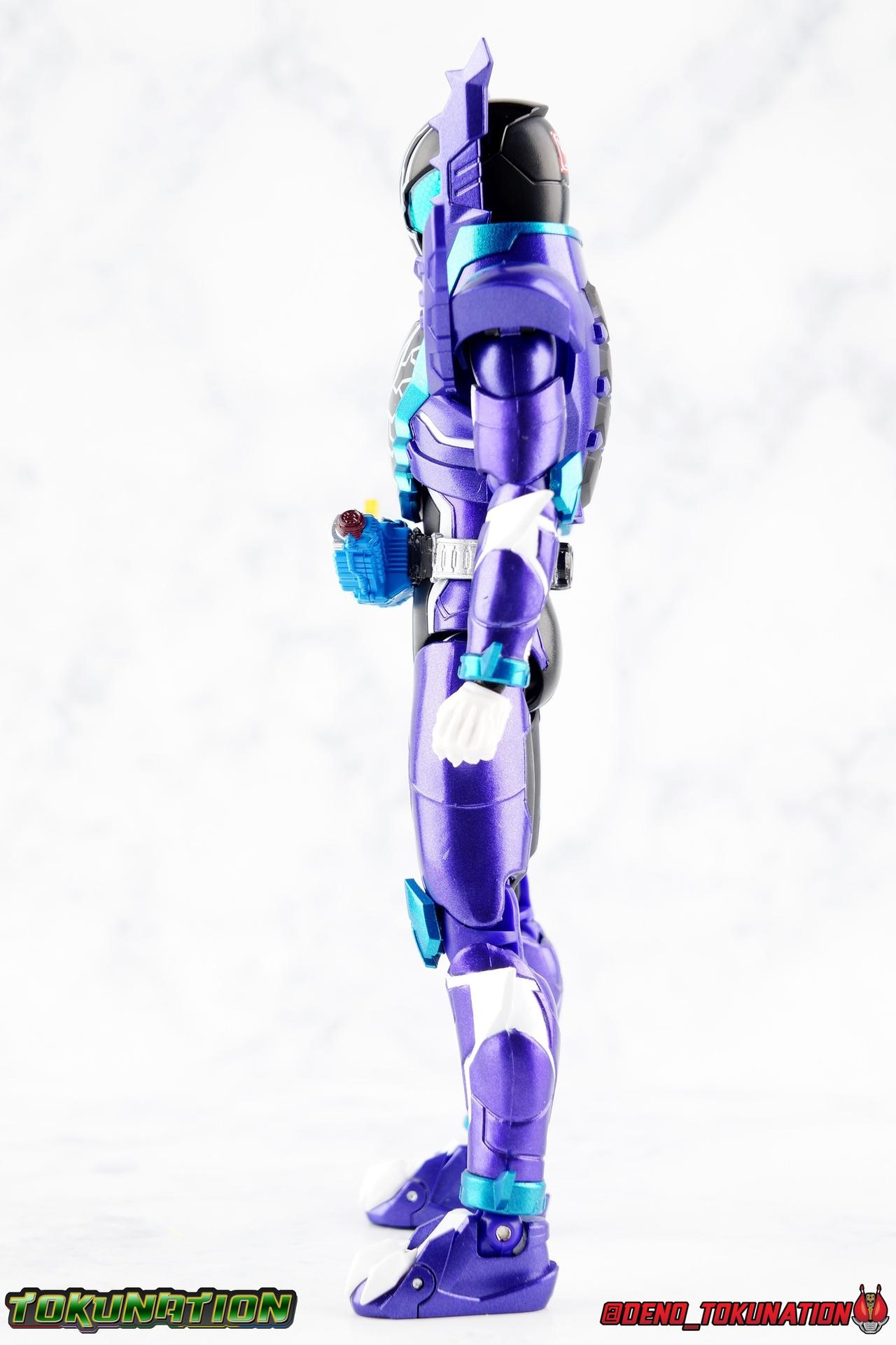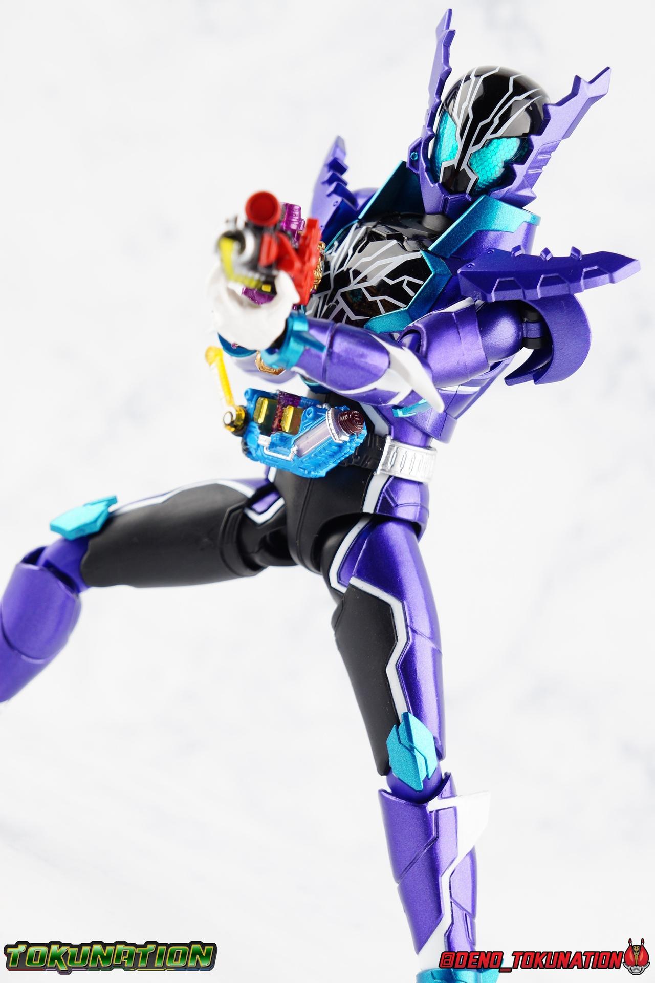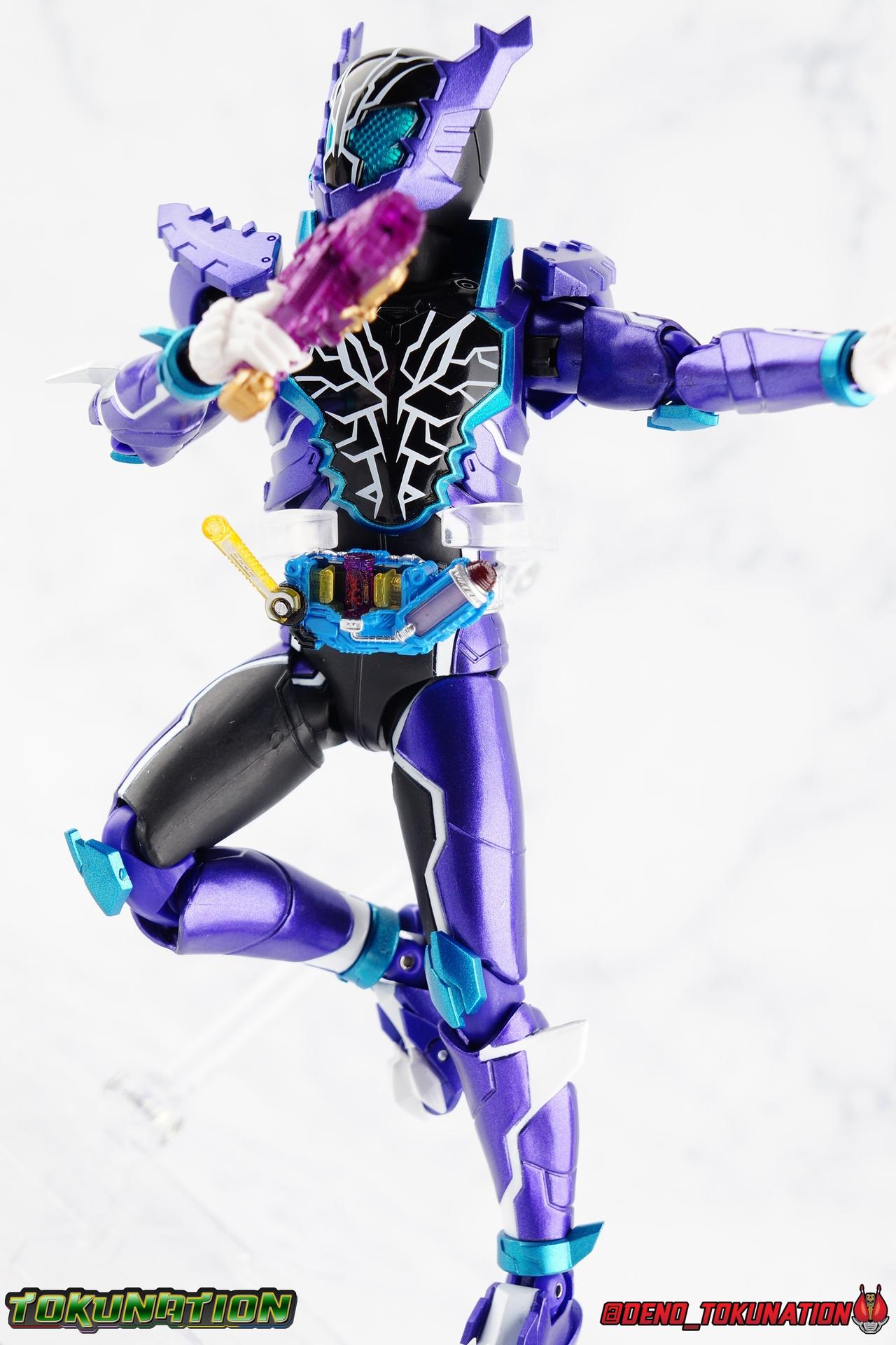 Gentoku Himuro lusted for power as the monstrous Night Rogue. Defeated and broken, he sought refuge in neighboring Seito, only to experience savage physical trials. Gaining power, he was forced into service by Utsumi Nariaki & Blood Stalk. But cured of the Nebula Gas influence, Gentoku remembered what it meant to fight for his country. It was only a matter of time before his heart was free to fight for his people, and his father's memory. Though he once struck fear into our heroes hearts, Gentoku would fight for love and peace as the dangerous Kamen Rider Rogue! Packaging The standard two-tone packaging of the Build line is back with some gorgeous purple and blue shades. Rogue's suit colors have always really worked for me and that no different when it comes to this packaging. Rogue's box is also another of the recent Tamashii releases to feature the blue Bandai Spirits logo as well as the new holofoil Tamashii Nations brand sticker. Main Figure Kamen Rider Rogue is the first new mold the Build line has introduced in a little while. The last truly new mold being the one shared by Cross-Z Charge & Grease. Rogue only has one possible repaint as well, Prime Rogue, which was recently revealed at Tamashii Nations 2018 and could realistically see release unlike *any* other Hyper Battle Video form ever before it. That being said, Bandai really needed to make this mold a winner to justify it's existence, though the character's popularity already ensured that. Rogue is a suit that I've kind of been in love with since it's introduction. The colors pops, the symmetry of the design is a great departure from a lot of what we'd seen from build at the time, and that Crocodile theme is so subtle but so perfect. It was several days after this suits debut in show that I even realized the head was literally a crocodile mouth biting down on it's victim. That kind of understated beauty really works for me. But Rogue's colors are what really hit you first. The purple/teal/white/black assortment puts me in mind of the typical "evil repaint" character we see in lot's of shows and toylines, even though this is an all new mold. The purple is a really nice royal shade with some grit to the finish that shines in the right light. The teal accents are so bright and really accent that purple well, while the black and white break up what would otherwise be a very "G2" color scheme for you Transformers fans out there. Aside from colors the mold itself is pretty excellent. Again it's the subtle qualities of it that work best. Like Rogue's feet feature crocodile claws protruding from the toes, and there are fins on the legs that suggest just as much danger. The toes bend far further than expected, while the ankles don't bend back far enough. The knees are more or less perfect with a good bend to them while the hips leave a bit to be desired in their forward movement. However I do always appreciate it when Bandai gets the little details right. Like the inner part of the hip joint completing the paint details from the thighs. The legs are imperfect, but they look great. The waist features the same Sclash Driver we saw with Cross-Z Charge & Grease. This will also be it's last outing in the toyline, as those 3 riders were it's only users. Of course Rogue is the only one of these three users who does not use a Sclash Jelly to transform. Instead this form is powered by the unique Crocodile Crack Full Bottle. The one included with the figuart has the molded details and red crack down, though it is missing the gold & green paint apps on the tip of the bottle. The upper body is separated into two chunks, the lower torso rotates behind the "cracked" chest. This chest panel extends all the way down past where abs would be and can impact the Driver so jsut be careful not to scratch it. I love the detailing on the front of the torso but do I ever love that segmented mechanical spine along the back of the figure. It just looks fantastic in person. The arms feature more of that crocodile subtlety like protrusions on the knuckles & forearm, and literal crocodile tails on the shoulders. The arms function great, but the shoulder pads are kind of nuisance. Not as bad as Grease or Cross-Z Charge, but they do inhibit outward movement. Rogue's head is still the pinnacle of this suit's design. I know some people think it's a bit off size wise but I think it really hits the nail on the head.Rogue's head of course is modeled on a crocodile biting down on it's victim. the lower right jaw line even features a rider jewel, positioned like the croc's eye, while the teeth line the users head. It's a disturbingly great design that's subtle enough many didn't notice it at first. The teal compound eyes set against this backdrop pop so brightly as well. And we can't forget the last perfect detail to compliment this, the fragile sticker on the back of the head. It was another detail a lot of people didn't notice initially, but it's just such nice a touch and a good little joke regarding the design of the head. I'm really happy to see it on the figuart too. All in all this is an excellent figure that will looks great with your other Build Riders. For some fun I included another pair of shots near the end of the gallery you may enjoy. Rogue is the first Crocodile themed rider in the franchise, so I put him with the first Alligator themed one, Kamen Rider Gaoh! These figure's are separated by nearly 10 years of engineering changes in S.H. Figuarts, and 10 years worth of shows. It's wild what a difference such a short time can make. I thought it was fun, hope you do too. Accessions Rogue Comes with quite a bit honestly: 1 - Remocon Gear. The transformation trinket for Fu Washio/Remocon Bros. Like a Full Bottle, it can interact with the Transteam or the as intended Nebula Steam Gun. But because of the way it's sculpted it won't work with the Twin Breaker, Build Driver, Beat Crosser, etc. 1 - Engine Gear. The transformation trinket for Rai Washio/EngineBros. Lik
