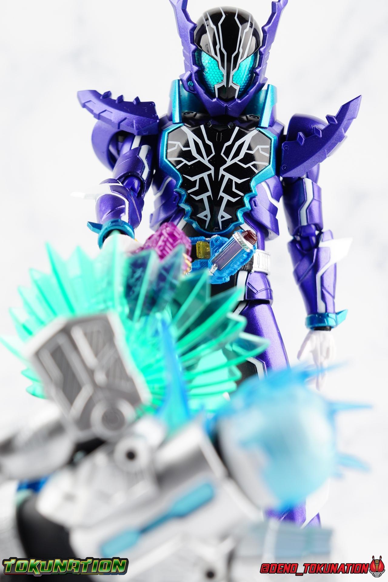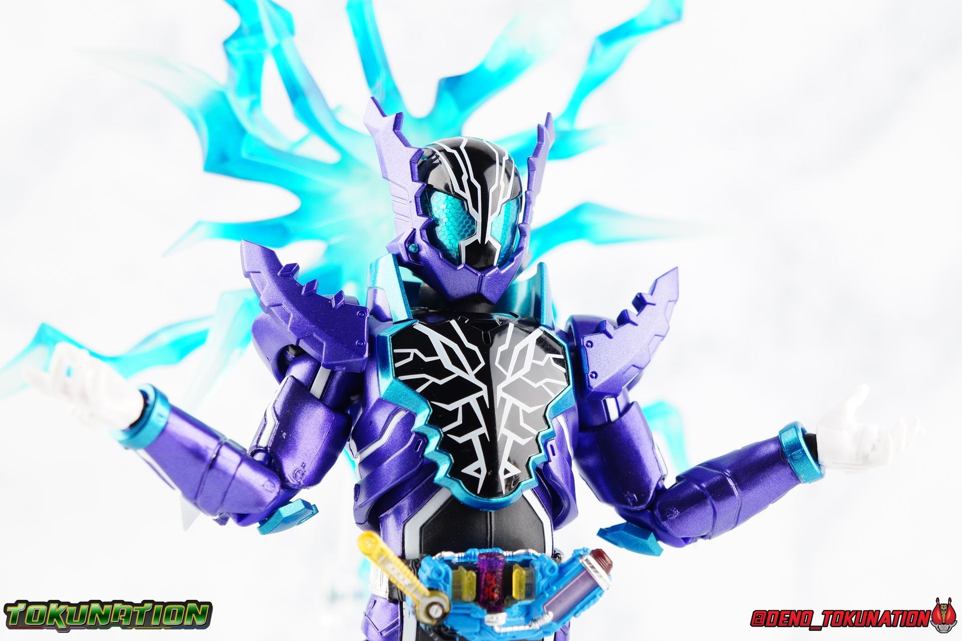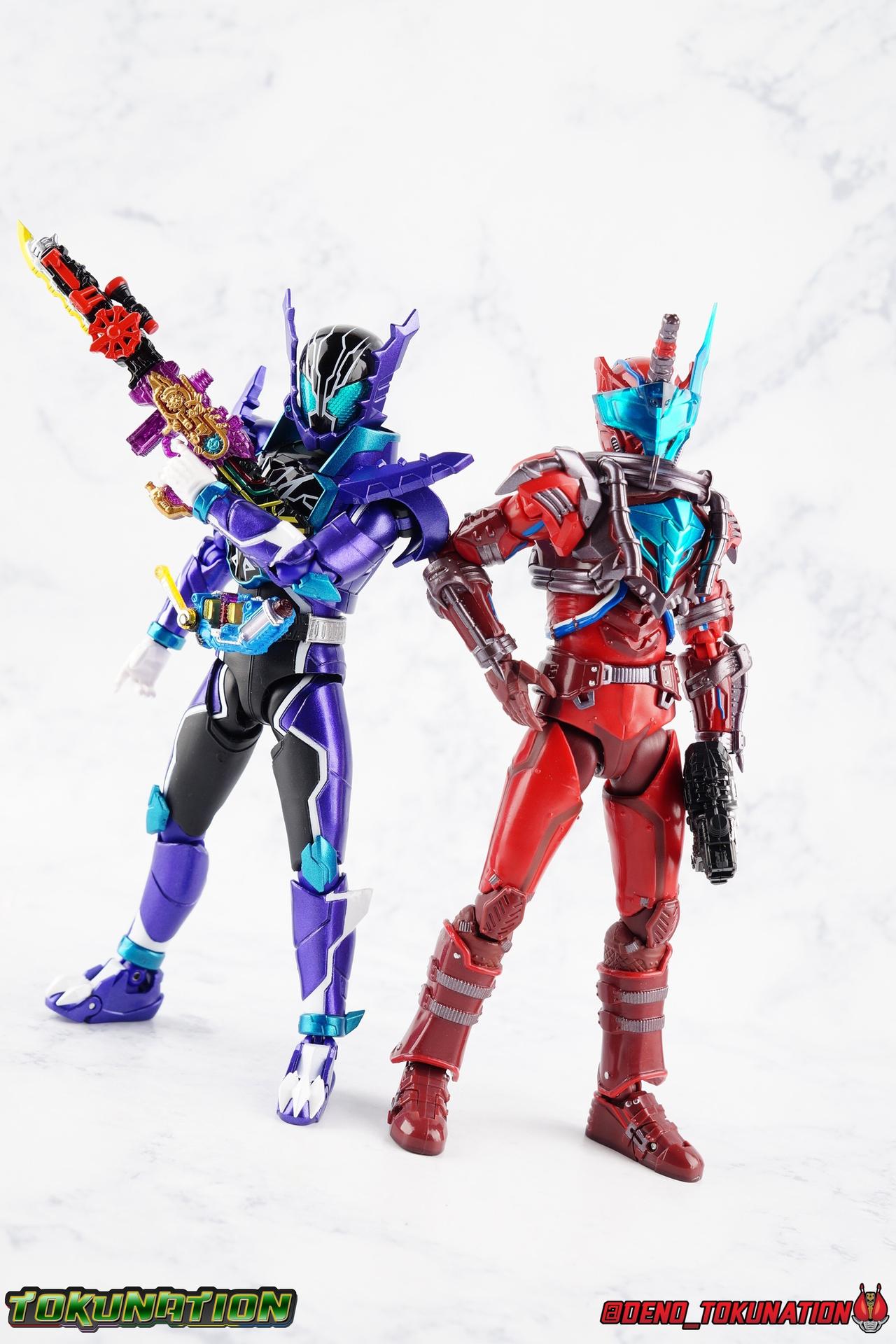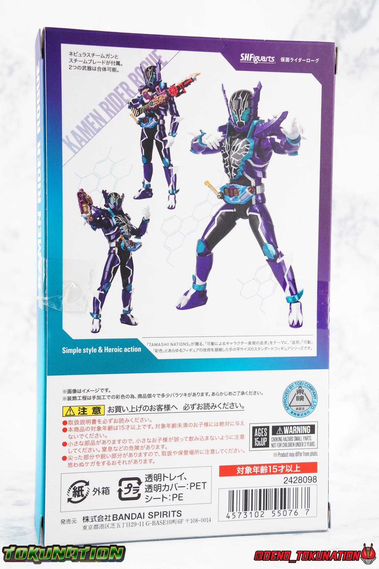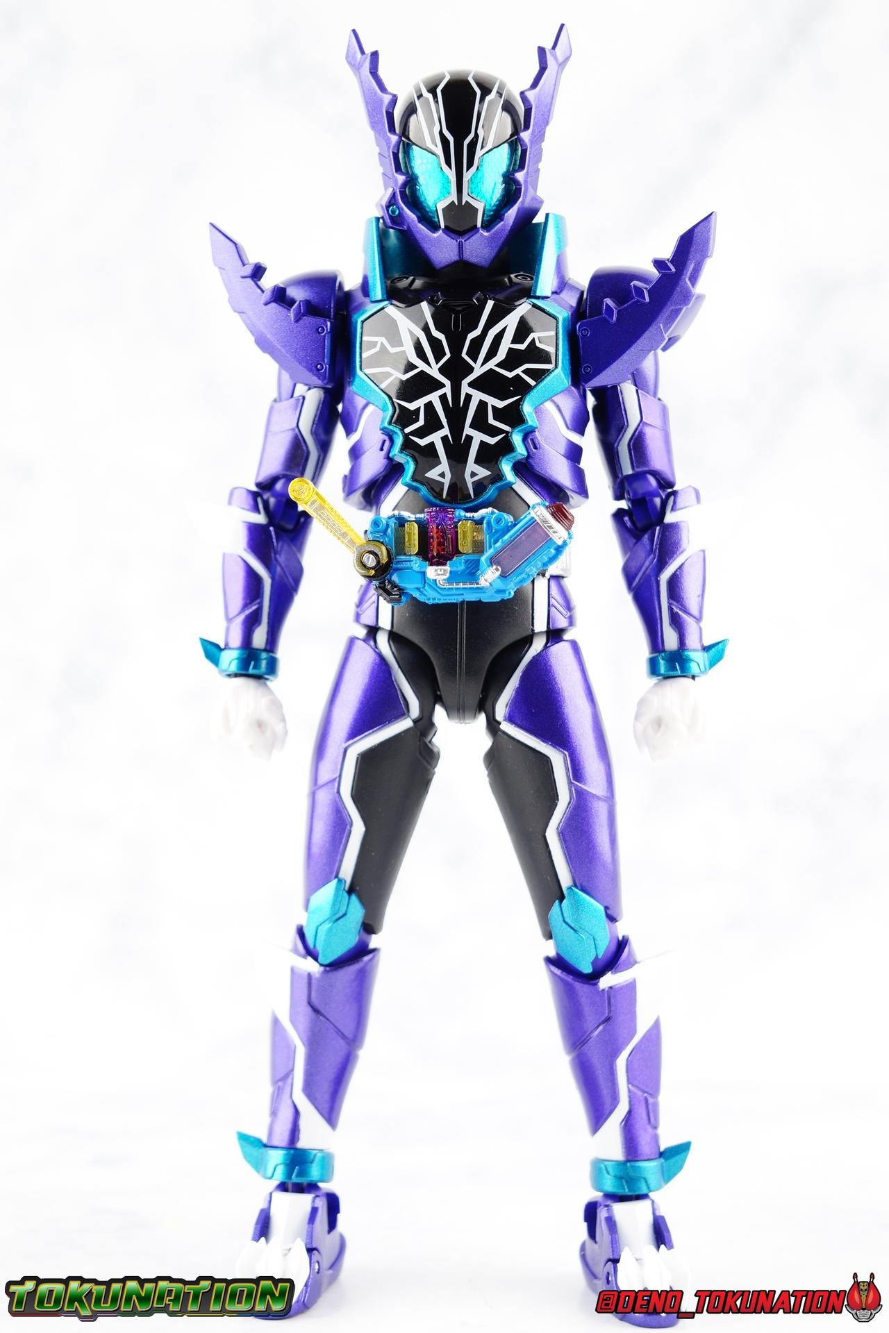 Gentoku Himuro lusted for power as the monstrous Night Rogue. Defeated and broken, he sought refuge in neighboring Seito, only to experience savage physical trials. Gaining power, he was forced into service by Utsumi Nariaki & Blood Stalk. But cured of the Nebula Gas influence, Gentoku remembered what it meant to fight for his country. It was only a matter of time before his heart was free to fight for his people, and his father's memory. Though he once struck fear into our heroes hearts, Gentoku would fight for love and peace as the dangerous Kamen Rider Rogue! Packaging The standard two-tone packaging of the Build line is back with some gorgeous purple and blue shades. Rogue's suit colors have always really worked for me and that no different when it comes to this packaging. Rogue's box is also another of the recent Tamashii releases to feature the blue Bandai Spirits logo as well as the new holofoil Tamashii Nations brand sticker. Main Figure Kamen Rider Rogue is the first new mold the Build line has introduced in a little while. The last truly new mold being the one shared by Cross-Z Charge & Grease. Rogue only has one possible repaint as well, Prime Rogue, which was recently revealed at Tamashii Nations 2018 and could realistically see release unlike *any* other Hyper Battle Video form ever before it. That being said, Bandai really needed to make this mold a winner to justify it's existence, though the character's popularity already ensured that. Rogue is a suit that I've kind of been in love with since it's introduction. The colors pops, the symmetry of the design is a great departure from a lot of what we'd seen from build at the time, and that Crocodile theme is so subtle but so perfect. It was several days after this suits debut in show that I even realized the head was literally a crocodile mouth biting down on it's victim. That kind of understated beauty really works for me. But Rogue's colors are what really hit you first. The purple/teal/white/black assortment puts me in mind of the typical "evil repaint" character we see in lot's of shows and toylines, even though this is an all new mold. The purple is a really nice royal shade with some grit to the finish that shines in the right light. The teal accents are so bright and really accent that purple well, while the black and white break up what would otherwise be a very "G2" color scheme for you Transformers fans out there. Aside from colors the mold itself is pretty excellent. Again it's the subtle qualities of it that work best. Like Rogue's feet feature crocodile claws protruding from the toes, and there are fins on the legs that suggest just as much danger. The toes bend far further than expected, while the ankles don't bend back far enough. The knees are more or less perfect with a good bend to them while the hips leave a bit to be desired in their forward movement. However I do always appreciate it when Bandai gets the little details right. Like the inner part of the hip joint completing the paint details from the thighs. The legs are imperfect, but they look great. The waist features the same Sclash Driver we saw with Cross-Z Charge & Grease. This will also be it's last outing in the toyline, as those 3 riders were it's only users. Of course Rogue is the only one of these three users who does not use a Sclash Jelly to transform. Instead this form is powered by the unique Crocodile Crack Full Bottle. The one included with the figuart has the molded details and red crack down, though it is missing the gold & green paint apps on the tip of the bottle. The upper body is separated into two chunks, the lower torso rotates behind the "cracked" chest. This chest panel extends all the way down past where abs would be and can impact the Driver so jsut be careful not to scratch it. I love the detailing on the front of the torso but do I ever love that segmented mechanical spine along the back of the figure. It just looks fantastic in person. The arms feature more of that crocodile subtlety like protrusions on the knuckles & forearm, and literal crocodile tails on the shoulders. The arms function great, but the shoulder pads are kind of nuisance. Not as bad as Grease or Cross-Z Charge, but they do inhibit outward movement. Rogue's head is still the pinnacle of this suit's design. I know some people think it's a bit off size wise but I think it really hits the nail on the head.Rogue's head of course is modeled on a crocodile biting down on it's victim. the lower right jaw line even features a rider jewel, positioned like the croc's eye, while the teeth line the users head. It's a disturbingly great design that's subtle enough many didn't notice it at first. The teal compound eyes set against this backdrop pop so brightly as well. And we can't forget the last perfect detail to compliment this, the fragile sticker on the back of the head. It was another detail a lot of people didn't notice initially, but it's just such nice a touch and a good little joke regarding the design of the head. I'm really happy to see it on the figuart too. All in all this is an excellent figure that will looks great with your other Build Riders. For some fun I included another pair of shots near the end of the gallery you may enjoy. Rogue is the first Crocodile themed rider in the franchise, so I put him with the first Alligator themed one, Kamen Rider Gaoh! These figure's are separated by nearly 10 years of engineering changes in S.H. Figuarts, and 10 years worth of shows. It's wild what a difference such a short time can make. I thought it was fun, hope you do too. Accessions Rogue Comes with quite a bit honestly: 1 - Remocon Gear. The transformation trinket for Fu Washio/Remocon Bros. Like a Full Bottle, it can interact with the Transteam or the as intended Nebula Steam Gun. But because of the way it's sculpted it won't work with the Twin Breaker, Build Driver, Beat Crosser, etc. 1 - Engine Gear. The transformation trinket for Rai Washio/EngineBros. Lik