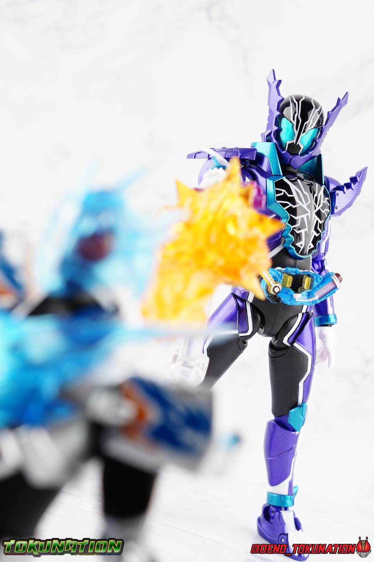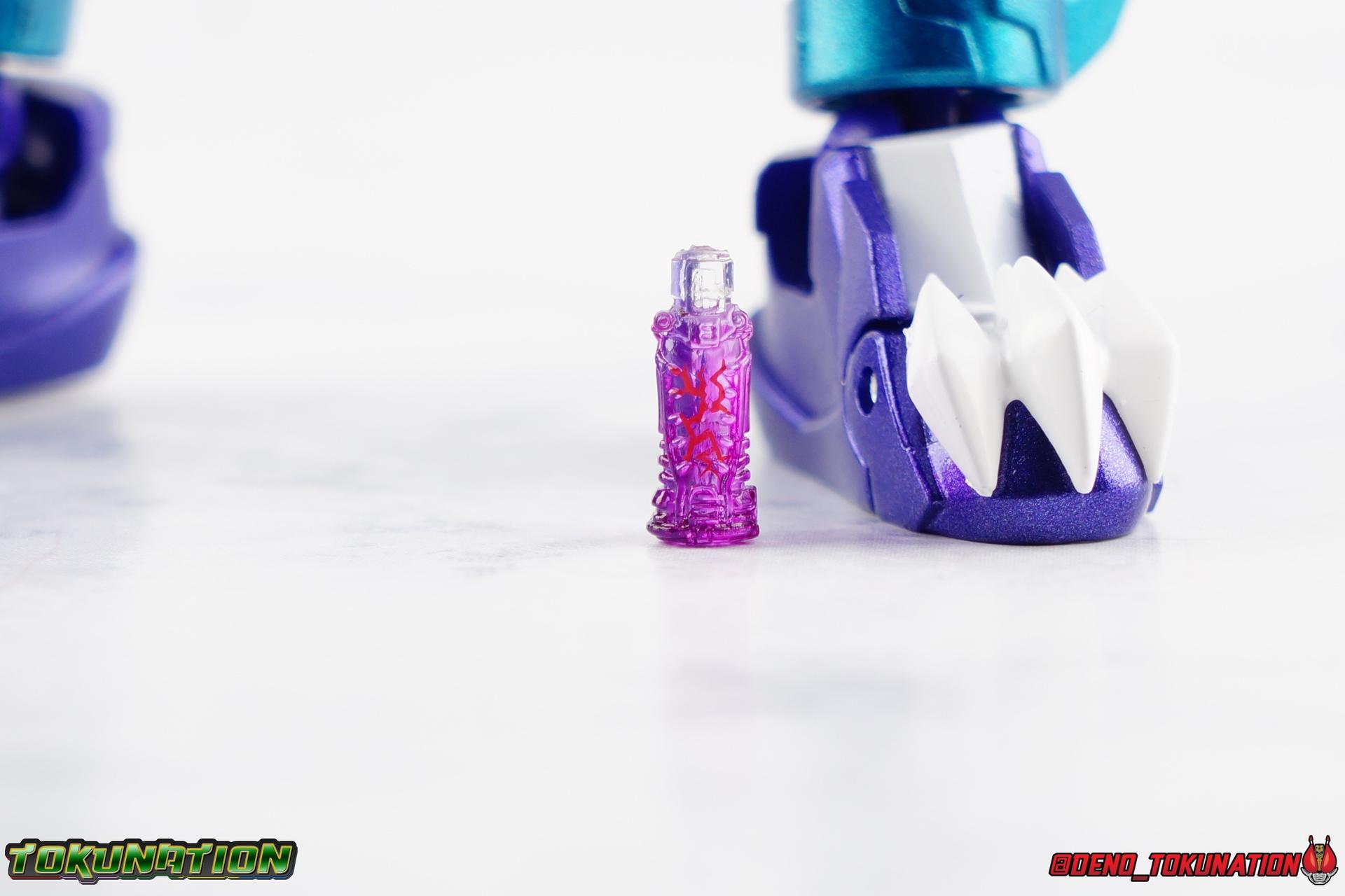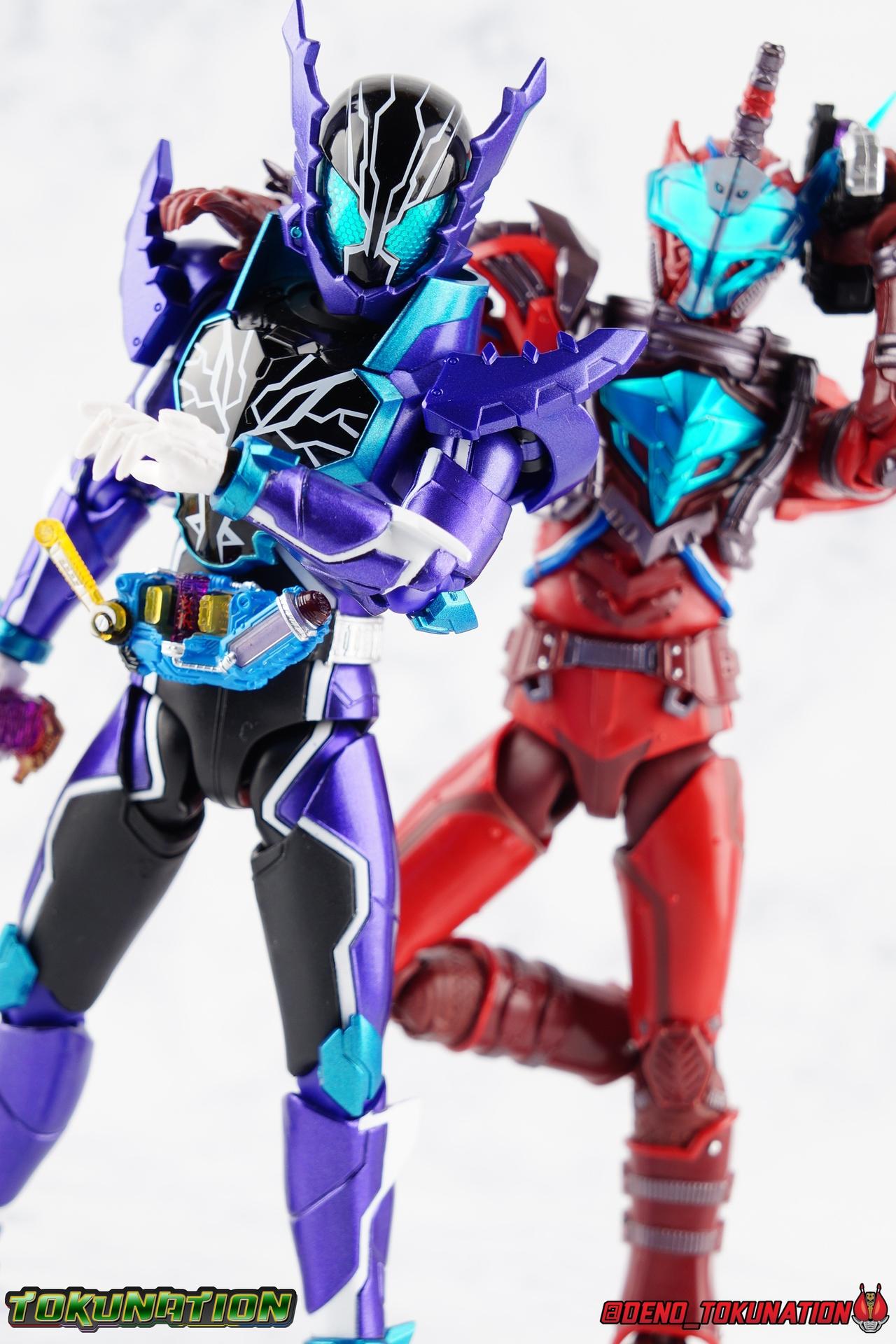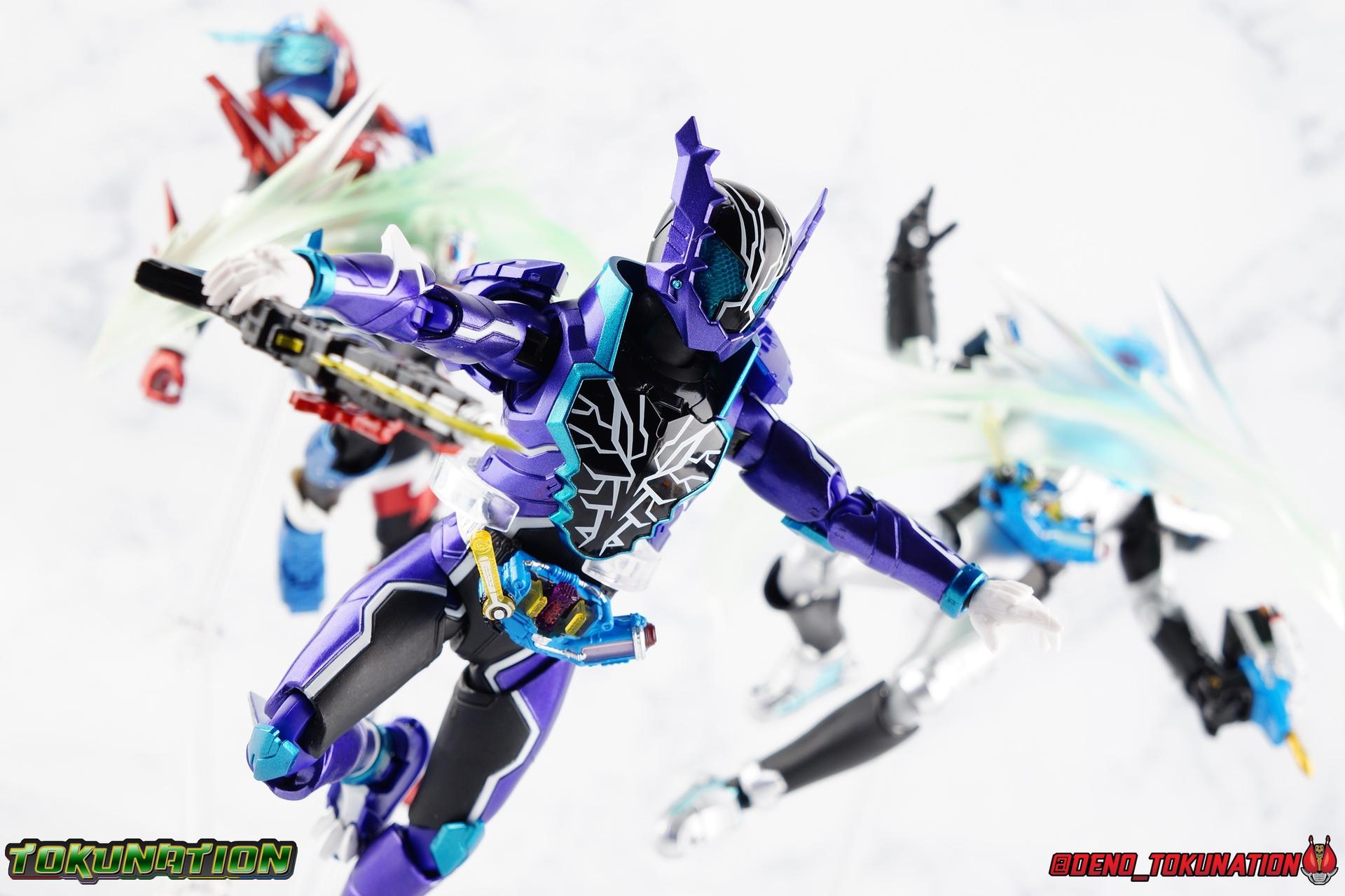Gentoku Himuro lusted for power as the monstrous Night Rogue. Defeated and broken, he sought refuge in neighboring Seito, only to experience savage physical trials. Gaining power, he was forced into service by Utsumi Nariaki & Blood Stalk. But cured of the Nebula Gas influence, Gentoku remembered what it meant to fight for his country. It was only a matter of time before his heart was free to fight for his people, and his father's memory. Though he once struck fear into our heroes hearts, Gentoku would fight for love and peace as the dangerous Kamen Rider Rogue! Packaging The standard two-tone packaging of the Build line is back with some gorgeous purple and blue shades. Rogue's suit colors have always really worked for me and that no different when it comes to this packaging. Rogue's box is also another of the recent Tamashii releases to feature the blue Bandai Spirits logo as well as the new holofoil Tamashii Nations brand sticker. Main Figure Kamen Rider Rogue is the first new mold the Build line has introduced in a little while. The last truly new mold being the one shared by Cross-Z Charge & Grease. Rogue only has one possible repaint as well, Prime Rogue, which was recently revealed at Tamashii Nations 2018 and could realistically see release unlike *any* other Hyper Battle Video form ever before it. That being said, Bandai really needed to make this mold a winner to justify it's existence, though the character's popularity already ensured that. Rogue is a suit that I've kind of been in love with since it's introduction. The colors pops, the symmetry of the design is a great departure from a lot of what we'd seen from build at the time, and that Crocodile theme is so subtle but so perfect. It was several days after this suits debut in show that I even realized the head was literally a crocodile mouth biting down on it's victim. That kind of understated beauty really works for me. But Rogue's colors are what really hit you first. The purple/teal/white/black assortment puts me in mind of the typical "evil repaint" character we see in lot's of shows and toylines, even though this is an all new mold. The purple is a really nice royal shade with some grit to the finish that shines in the right light. The teal accents are so bright and really accent that purple well, while the black and white break up what would otherwise be a very "G2" color scheme for you Transformers fans out there. Aside from colors the mold itself is pretty excellent. Again it's the subtle qualities of it that work best. Like Rogue's feet feature crocodile claws protruding from the toes, and there are fins on the legs that suggest just as much danger. The toes bend far further than expected, while the ankles don't bend back far enough. The knees are more or less perfect with a good bend to them while the hips leave a bit to be desired in their forward movement. However I do always appreciate it when Bandai gets the little details right. Like the inner part of the hip joint completing the paint details from the thighs. The legs are imperfect, but they look great. The waist features the same Sclash Driver we saw with Cross-Z Charge & Grease. This will also be it's last outing in the toyline, as those 3 riders were it's only users. Of course Rogue is the only one of these three users who does not use a Sclash Jelly to transform. Instead this form is powered by the unique Crocodile Crack Full Bottle. The one included with the figuart has the molded details and red crack down, though it is missing the gold & green paint apps on the tip of the bottle. The upper body is separated into two chunks, the lower torso rotates behind the "cracked" chest. This chest panel extends all the way down past where abs would be and can impact the Driver so jsut be careful not to scratch it. I love the detailing on the front of the torso but do I ever love that segmented mechanical spine along the back of the figure. It just looks fantastic in person. The arms feature more of that crocodile subtlety like protrusions on the knuckles & forearm, and literal crocodile tails on the shoulders. The arms function great, but the shoulder pads are kind of nuisance. Not as bad as Grease or Cross-Z Charge, but they do inhibit outward movement. Rogue's head is still the pinnacle of this suit's design. I know some people think it's a bit off size wise but I think it really hits the nail on the head.Rogue's head of course is modeled on a crocodile biting down on it's victim. the lower right jaw line even features a rider jewel, positioned like the croc's eye, while the teeth line the users head. It's a disturbingly great design that's subtle enough many didn't notice it at first. The teal compound eyes set against this backdrop pop so brightly as well. And we can't forget the last perfect detail to compliment this, the fragile sticker on the back of the head. It was another detail a lot of people didn't notice initially, but it's just such nice a touch and a good little joke regarding the design of the head. I'm really happy to see it on the figuart too. All in all this is an excellent figure that will looks great with your other Build Riders. For some fun I included another pair of shots near the end of the gallery you may enjoy. Rogue is the first Crocodile themed rider in the franchise, so I put him with the first Alligator themed one, Kamen Rider Gaoh! These figure's are separated by nearly 10 years of engineering changes in S.H. Figuarts, and 10 years worth of shows. It's wild what a difference such a short time can make. I thought it was fun, hope you do too. Accessions Rogue Comes with quite a bit honestly: 1 - Remocon Gear. The transformation trinket for Fu Washio/Remocon Bros. Like a Full Bottle, it can interact with the Transteam or the as intended Nebula Steam Gun. But because of the way it's sculpted it won't work with the Twin Breaker, Build Driver, Beat Crosser, etc. 1 - Engine Gear. The transformation trinket for Rai Washio/EngineBros. Lik