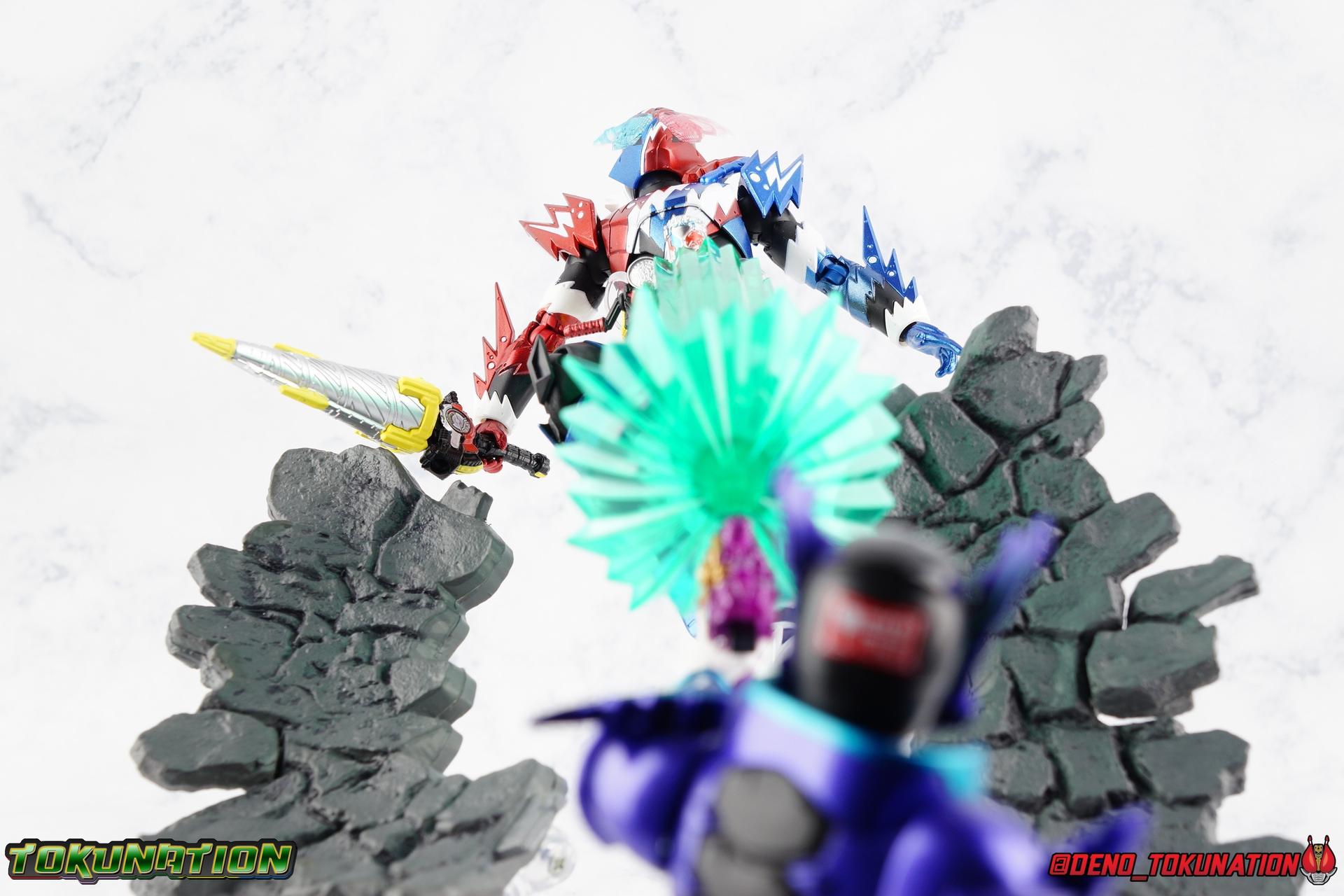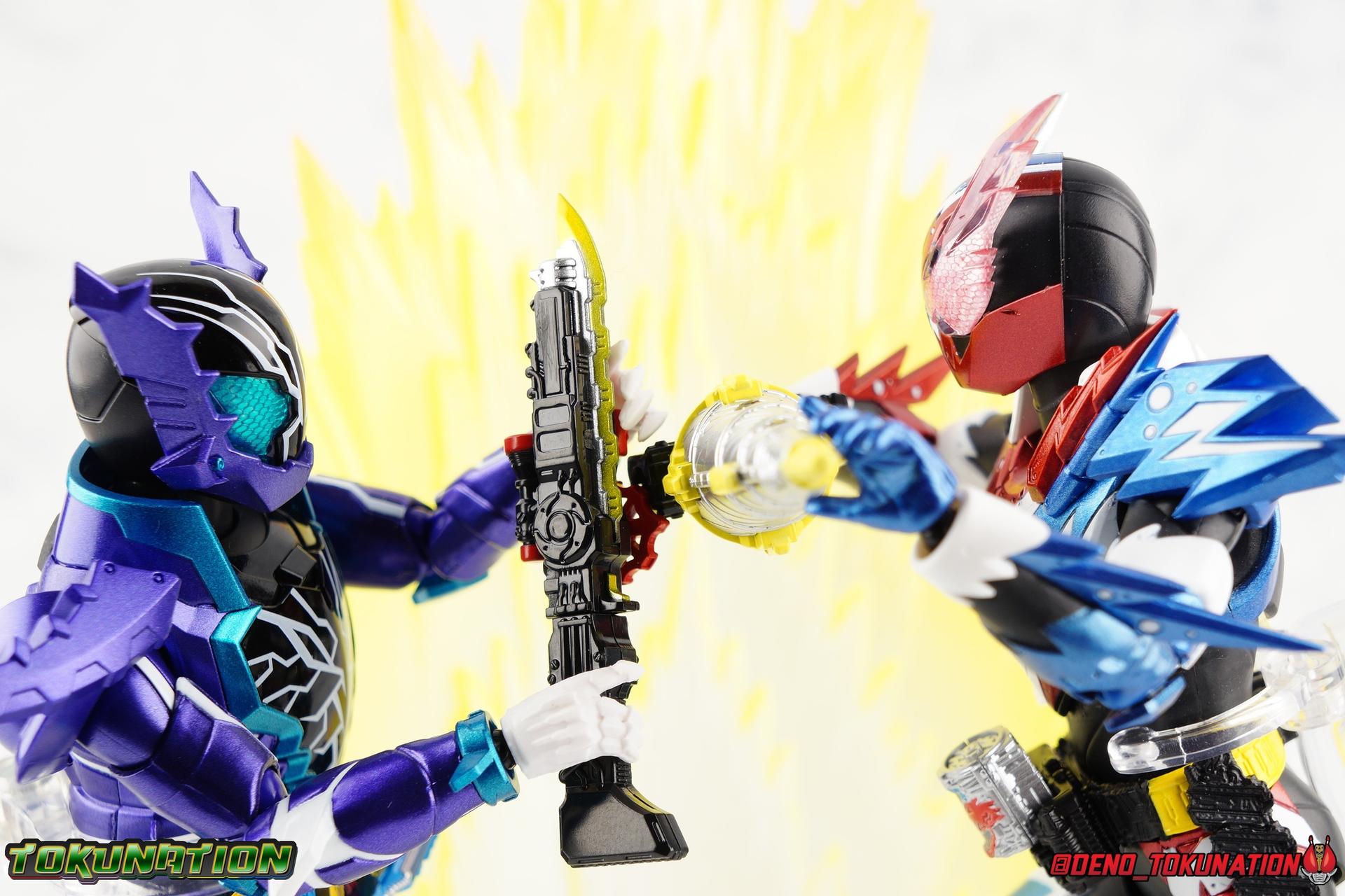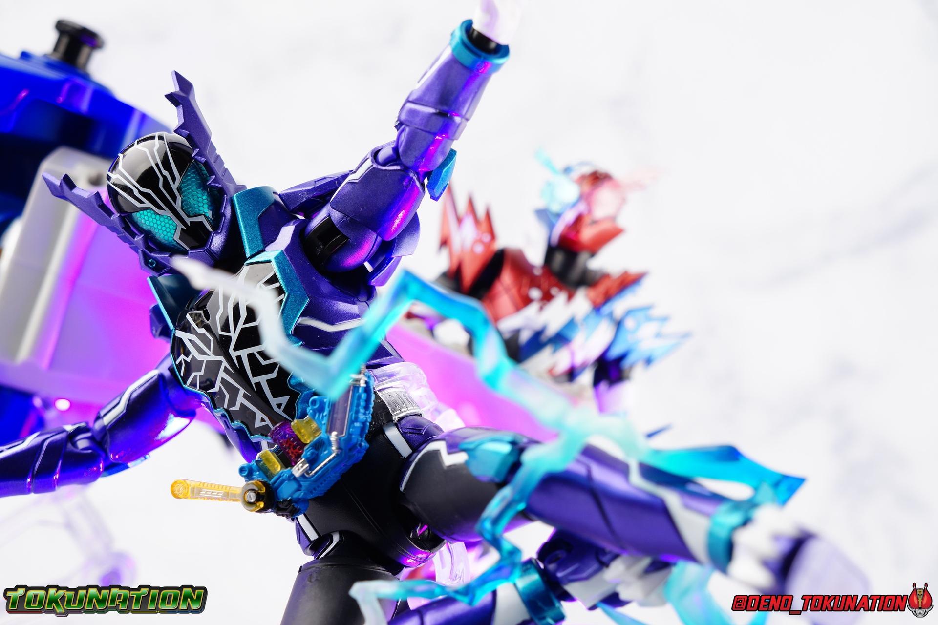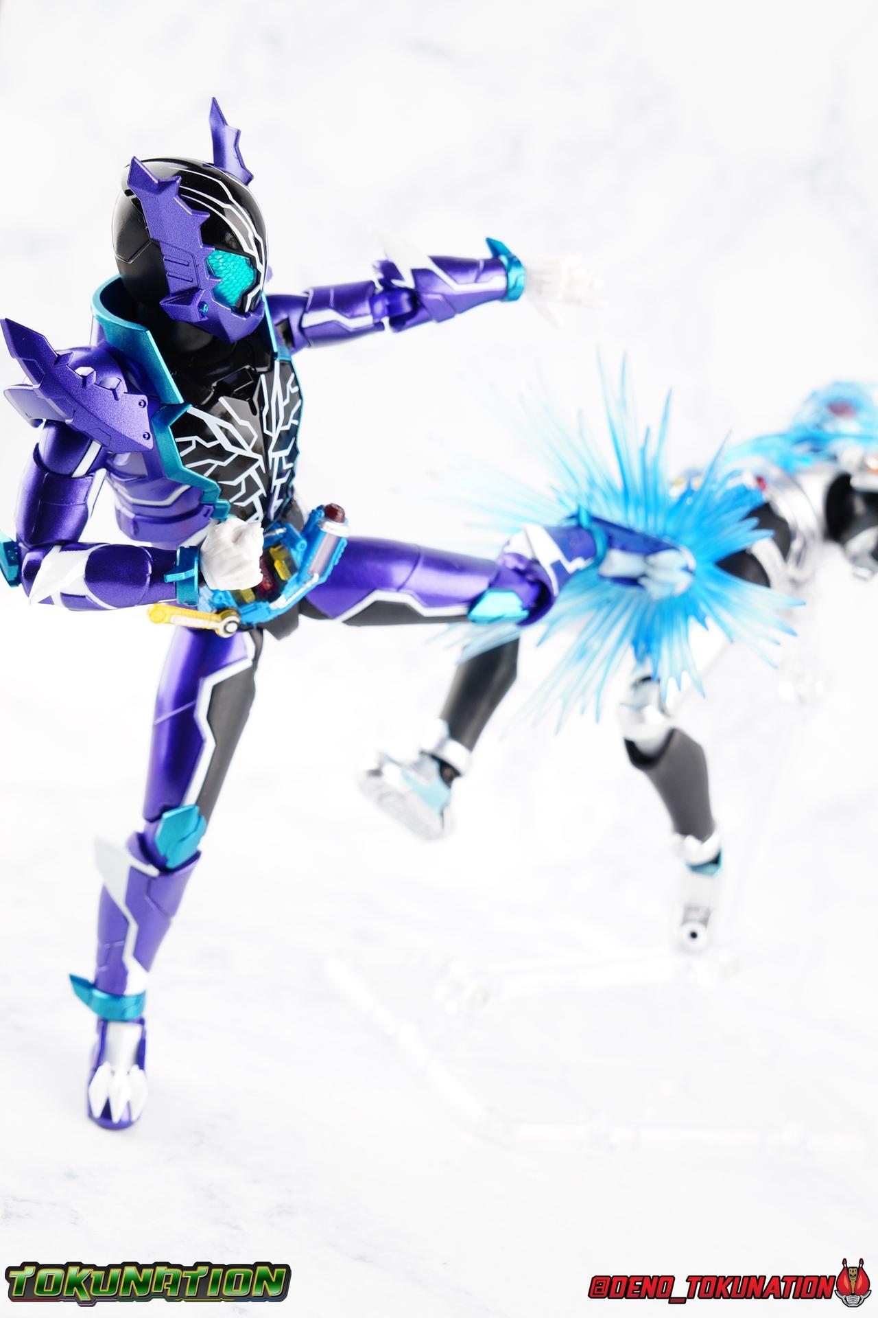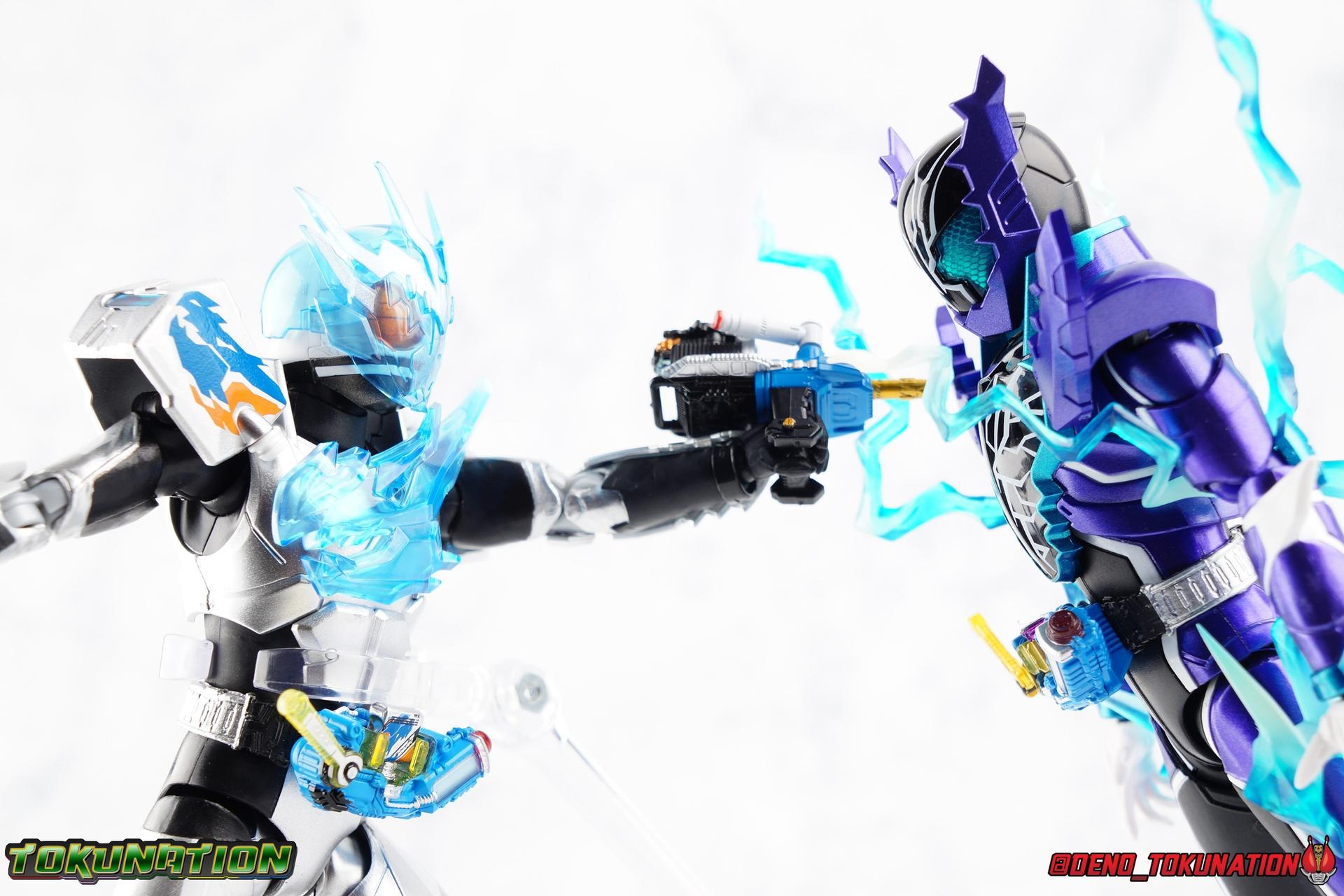 Gentoku Himuro lusted for power as the monstrous Night Rogue. Defeated and broken, he sought refuge in neighboring Seito, only to experience savage physical trials. Gaining power, he was forced into service by Utsumi Nariaki & Blood Stalk. But cured of the Nebula Gas influence, Gentoku remembered what it meant to fight for his country. It was only a matter of time before his heart was free to fight for his people, and his father's memory. Though he once struck fear into our heroes hearts, Gentoku would fight for love and peace as the dangerous Kamen Rider Rogue! Packaging The standard two-tone packaging of the Build line is back with some gorgeous purple and blue shades. Rogue's suit colors have always really worked for me and that no different when it comes to this packaging. Rogue's box is also another of the recent Tamashii releases to feature the blue Bandai Spirits logo as well as the new holofoil Tamashii Nations brand sticker. Main Figure Kamen Rider Rogue is the first new mold the Build line has introduced in a little while. The last truly new mold being the one shared by Cross-Z Charge & Grease. Rogue only has one possible repaint as well, Prime Rogue, which was recently revealed at Tamashii Nations 2018 and could realistically see release unlike *any* other Hyper Battle Video form ever before it. That being said, Bandai really needed to make this mold a winner to justify it's existence, though the character's popularity already ensured that. Rogue is a suit that I've kind of been in love with since it's introduction. The colors pops, the symmetry of the design is a great departure from a lot of what we'd seen from build at the time, and that Crocodile theme is so subtle but so perfect. It was several days after this suits debut in show that I even realized the head was literally a crocodile mouth biting down on it's victim. That kind of understated beauty really works for me. But Rogue's colors are what really hit you first. The purple/teal/white/black assortment puts me in mind of the typical "evil repaint" character we see in lot's of shows and toylines, even though this is an all new mold. The purple is a really nice royal shade with some grit to the finish that shines in the right light. The teal accents are so bright and really accent that purple well, while the black and white break up what would otherwise be a very "G2" color scheme for you Transformers fans out there. Aside from colors the mold itself is pretty excellent. Again it's the subtle qualities of it that work best. Like Rogue's feet feature crocodile claws protruding from the toes, and there are fins on the legs that suggest just as much danger. The toes bend far further than expected, while the ankles don't bend back far enough. The knees are more or less perfect with a good bend to them while the hips leave a bit to be desired in their forward movement. However I do always appreciate it when Bandai gets the little details right. Like the inner part of the hip joint completing the paint details from the thighs. The legs are imperfect, but they look great. The waist features the same Sclash Driver we saw with Cross-Z Charge & Grease. This will also be it's last outing in the toyline, as those 3 riders were it's only users. Of course Rogue is the only one of these three users who does not use a Sclash Jelly to transform. Instead this form is powered by the unique Crocodile Crack Full Bottle. The one included with the figuart has the molded details and red crack down, though it is missing the gold & green paint apps on the tip of the bottle. The upper body is separated into two chunks, the lower torso rotates behind the "cracked" chest. This chest panel extends all the way down past where abs would be and can impact the Driver so jsut be careful not to scratch it. I love the detailing on the front of the torso but do I ever love that segmented mechanical spine along the back of the figure. It just looks fantastic in person. The arms feature more of that crocodile subtlety like protrusions on the knuckles & forearm, and literal crocodile tails on the shoulders. The arms function great, but the shoulder pads are kind of nuisance. Not as bad as Grease or Cross-Z Charge, but they do inhibit outward movement. Rogue's head is still the pinnacle of this suit's design. I know some people think it's a bit off size wise but I think it really hits the nail on the head.Rogue's head of course is modeled on a crocodile biting down on it's victim. the lower right jaw line even features a rider jewel, positioned like the croc's eye, while the teeth line the users head. It's a disturbingly great design that's subtle enough many didn't notice it at first. The teal compound eyes set against this backdrop pop so brightly as well. And we can't forget the last perfect detail to compliment this, the fragile sticker on the back of the head. It was another detail a lot of people didn't notice initially, but it's just such nice a touch and a good little joke regarding the design of the head. I'm really happy to see it on the figuart too. All in all this is an excellent figure that will looks great with your other Build Riders. For some fun I included another pair of shots near the end of the gallery you may enjoy. Rogue is the first Crocodile themed rider in the franchise, so I put him with the first Alligator themed one, Kamen Rider Gaoh! These figure's are separated by nearly 10 years of engineering changes in S.H. Figuarts, and 10 years worth of shows. It's wild what a difference such a short time can make. I thought it was fun, hope you do too. Accessions Rogue Comes with quite a bit honestly: 1 - Remocon Gear. The transformation trinket for Fu Washio/Remocon Bros. Like a Full Bottle, it can interact with the Transteam or the as intended Nebula Steam Gun. But because of the way it's sculpted it won't work with the Twin Breaker, Build Driver, Beat Crosser, etc. 1 - Engine Gear. The transformation trinket for Rai Washio/EngineBros. Lik