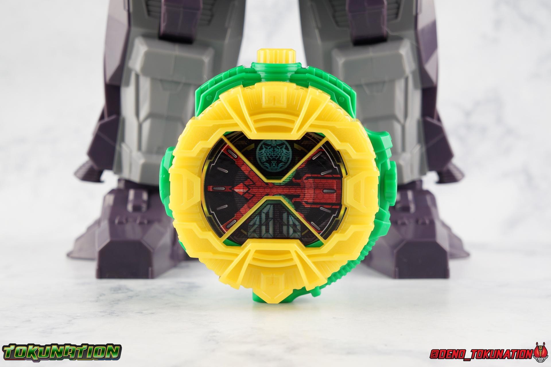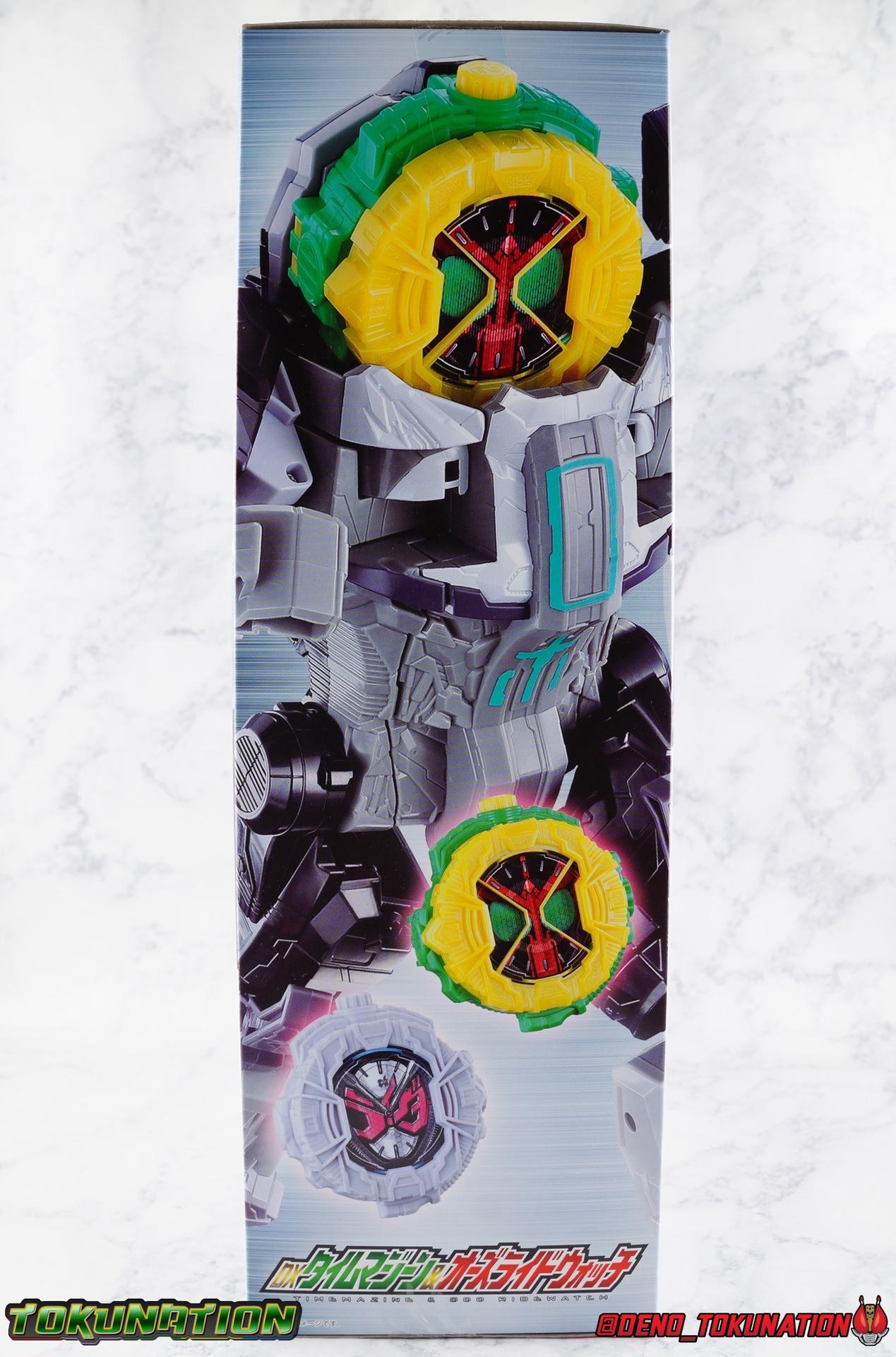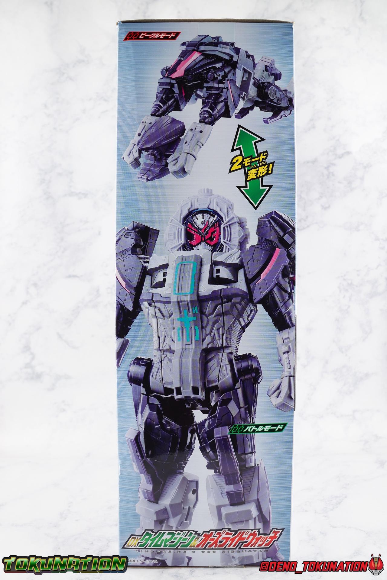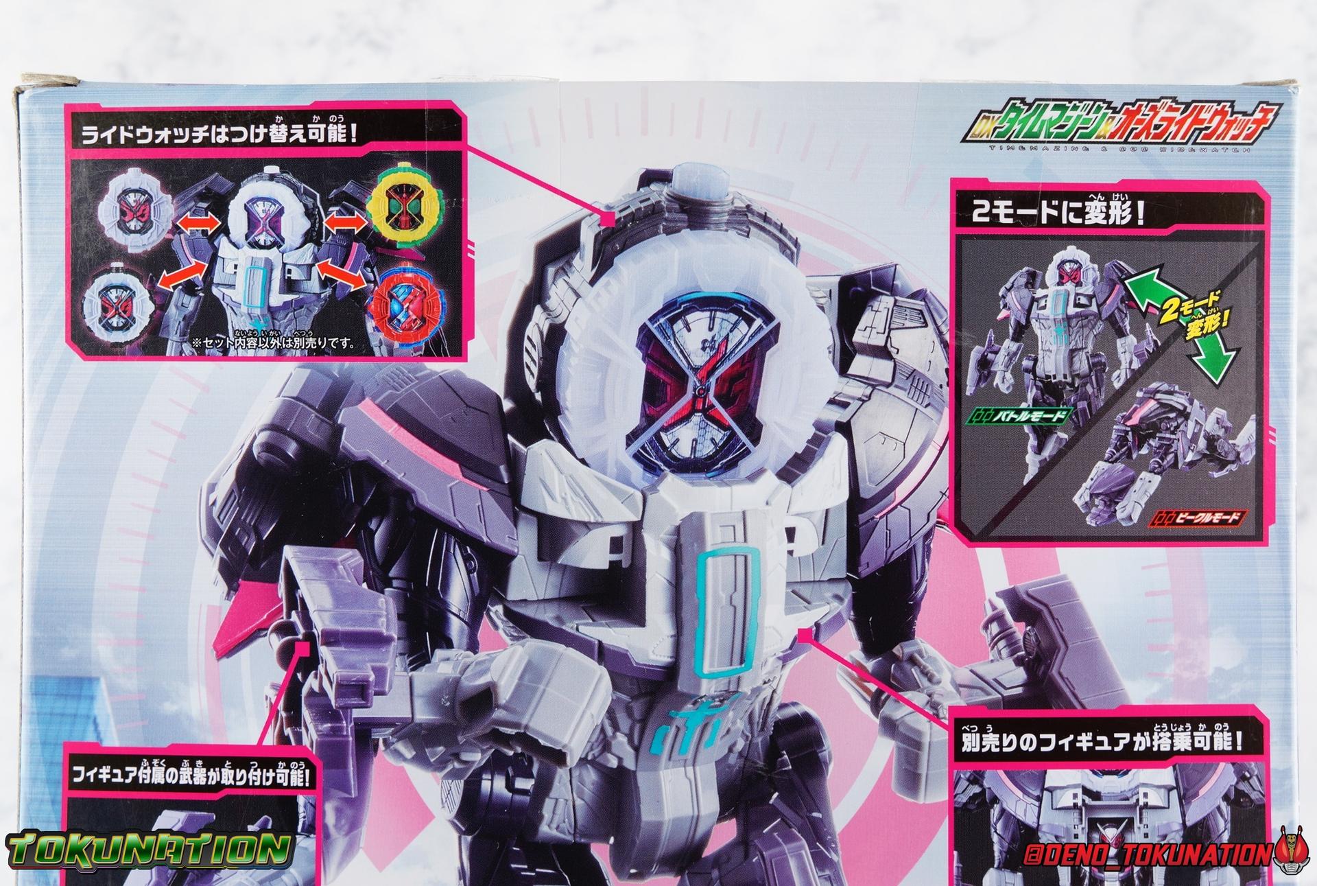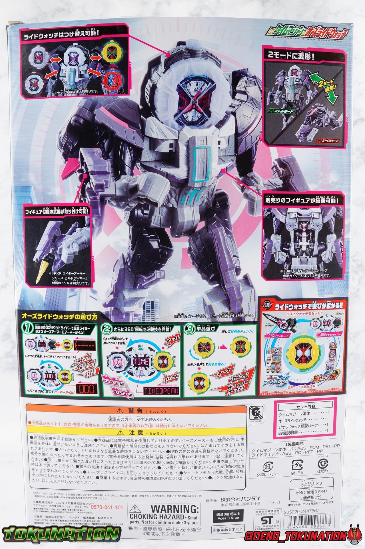 The massive mecha known as the Time Mazine is the last line of defense between the rebels of 2068 & the dark overlord Oma Zi-O. These mass produced defenders have even been known to be used by the Time Jackers... Sougo Tokiwa was given access to one thanks to Tsukuyomi travelling back in time from this bleak future. A means of travel to the eras of the legendary riders that preceded him, Sougo as the present day Kamen Rider Zi-O will gain the powers of the past to save (or dominate) the future! Packaging My favorite thing about DX packaging, toys which I don't handle much these days, is just how wacky and busy it tends to be. Tons of stock photos of various uses for whatever the item is, catch phrases, call outs, and character quotes from the show. There's just a lot going on, and I really like it. But by far the funniest thing about the box is the way it portrays Time Mazine on the back. It looks like a giant robot trying to squeeze it's legs together to hold in a poo frankly. Though, the toy itself tends to look like this in hand a little as well.... In box Time Mazine is all fully assembled, the only packed in separate part being the DX Ride Watch/ Main Figure Oddly enough, the Time Mazine is my first opportunity to handle merchandise from Zi-O. The Rider Kicks Figure line was a total turn off to me once I found out about the size. Figure's that small just have no place in my collection, so even with the armor gimmick, they weren't ever gonna sell me on that. But a giant robot, that turns into a flying time machine, and can swap out faces for Ride Watches? Yeah, I'm down for that. Time Mazine by the way, is a play on words. It's a combination of the english term Time Machine, and the Japanese word Majin/魔神, which means malevolent or demonic god. The "j" works it's way into the new word as a "z" sound. It's a fun play on words I can get behind. Now to start with the figure, this is a big boy. The Mazine will dwarf quite a few of the riders and other various robots in your collection. I included some group images below to show off the scale of this thing, and it's impressive. The Mazine is in it's Robo Mode straight out of the box, and while not perfect, there's a decent amount of articulation in this thing. Some of it isn't very useful, or in fact at all, but as you can see in the images you actually can get some use out of them. Time Mazine has ratcheting hips that can move forward and back by a couple clicks, though they have no outward movement. The thighs feature a pretty strong swivel joint to angle the legs out. The knees bend back to about a 90 degree angle as well. However the feet don't move at all. So while you can get the lower body into some cool poses, many aren't sustainable because the feet can't reach a stable position and the hips can't angle outward at all. The upper body articulation is limited to the head and arms. The arms feature fully rotating (closed) fists, a pretty great elbow bend that incorporates a swivel, and butterfly type shoulder joints. These shoulders work like this because of the Vehicle Mode transformation joints built into them. They can be pushed forward until the arms come parallel to one another and they angle very far up and out as well. Sentai Robos ain't got nothing on this big guy! The chest actually opens up as well. Grab the chest panel just below the face and pull down to reveal a cockpit scaled for Rider Kicks Figures! As I mentioned above, the RKF scale doesn't work for my collection at all, so I didn't have any on hand for the shoot. But some figuarts do tend to work decently well at this scale. The cockpit actually has some little arms that would hold an RKF in place, while the bottom is open ended so the rider's legs can go down into the Mazine's legs. I'm happy to see it scale this way even if it's not quite up to par with the show's portrayal of the cockpit. Time Mazine can also equip weapons from the RKF armors on it's arms, though again, I don't have any to demonstrate that with. The head also has some minor articulation in that it can swivel side to side. The head is in fact a dummy Zi-O Ride Watch. It's actually a hollow on the backside lookalike for the real deal Zi-O watch. It sets a bit further into the head than a proper DX Ride Watch would, plugging directly into the rectangular slot. Luckily DX Ride Watches fit just fine in there, any DX Gashapon or etc Ride Watch will. Literally any of them. The Mazine comes with the DX OOO TaToBa Combo Ride Watch as well, one which looks pretty cool as the head. I also had on hand the DX Den-O Sword Form & Wizard Flame Style Ride Watches during this shoot, so those are shown in the photos as well. Just don't mistake them for coming with Time Mazine. It only comes with the DX OOO watch and the dummy Zi-O watch. Time Mazine of course also has a Vehicle Mode. Though I would *very* generously consider this thing a "vehicle". It's a simple process to transform. Remove any Ride Watch attached, even the dummy one, push the shoulders fully forward, fold the shoulder armor flaps in and tab it together. Then rotate the arms around and tab them together, the whole assembly then rotates back flush to the panel where a Ride Watch would normally go. The final step is sadly the point where I realized they just gave up trying to do something meaningful with this toy. You just slightly bend the knees back so the knee armor/skis are flat on the ground. There you have this "vehicle". I really sincerely hope there's some other big DX vehicle coming that could combine with this thing because that's a pretty silly and useless vehicle mode. Accessories 1 - DX OOO TaToBa Combo Ride Watch. As mentioned above this is the full DX watch. Just pull the plastic tab out of the side to free up the batteries and start making some noise! The face of the watch of course rotates from the year to reveal the rider's full face. Gashapon watches rotate, but not in a way that reveals the face. It would have been nice to ge