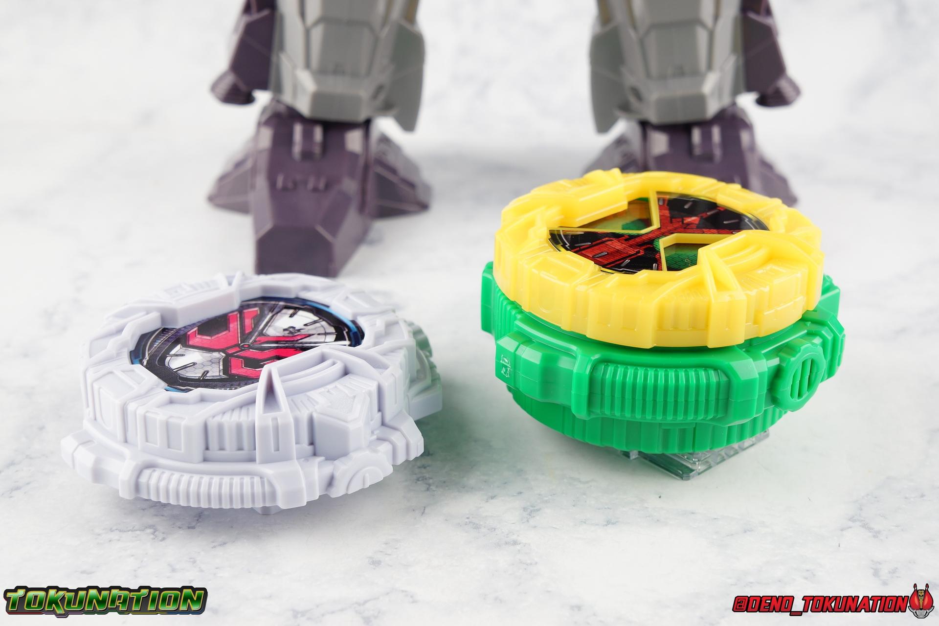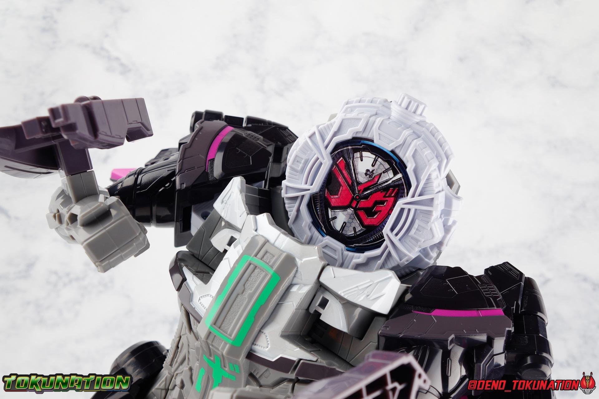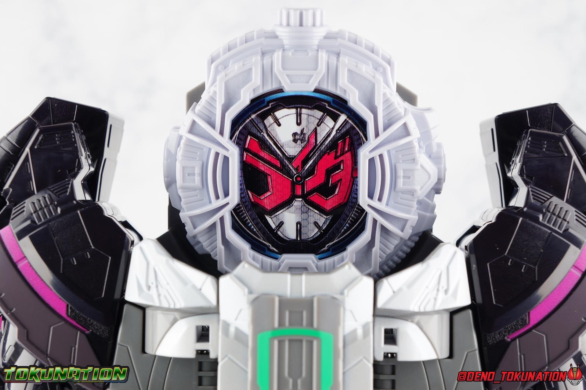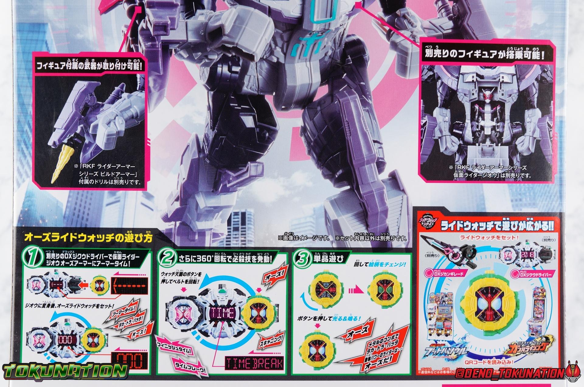 The massive mecha known as the Time Mazine is the last line of defense between the rebels of 2068 & the dark overlord Oma Zi-O. These mass produced defenders have even been known to be used by the Time Jackers... Sougo Tokiwa was given access to one thanks to Tsukuyomi travelling back in time from this bleak future. A means of travel to the eras of the legendary riders that preceded him, Sougo as the present day Kamen Rider Zi-O will gain the powers of the past to save (or dominate) the future! Packaging My favorite thing about DX packaging, toys which I don't handle much these days, is just how wacky and busy it tends to be. Tons of stock photos of various uses for whatever the item is, catch phrases, call outs, and character quotes from the show. There's just a lot going on, and I really like it. But by far the funniest thing about the box is the way it portrays Time Mazine on the back. It looks like a giant robot trying to squeeze it's legs together to hold in a poo frankly. Though, the toy itself tends to look like this in hand a little as well.... In box Time Mazine is all fully assembled, the only packed in separate part being the DX Ride Watch/ Main Figure Oddly enough, the Time Mazine is my first opportunity to handle merchandise from Zi-O. The Rider Kicks Figure line was a total turn off to me once I found out about the size. Figure's that small just have no place in my collection, so even with the armor gimmick, they weren't ever gonna sell me on that. But a giant robot, that turns into a flying time machine, and can swap out faces for Ride Watches? Yeah, I'm down for that. Time Mazine by the way, is a play on words. It's a combination of the english term Time Machine, and the Japanese word Majin/魔神, which means malevolent or demonic god. The "j" works it's way into the new word as a "z" sound. It's a fun play on words I can get behind. Now to start with the figure, this is a big boy. The Mazine will dwarf quite a few of the riders and other various robots in your collection. I included some group images below to show off the scale of this thing, and it's impressive. The Mazine is in it's Robo Mode straight out of the box, and while not perfect, there's a decent amount of articulation in this thing. Some of it isn't very useful, or in fact at all, but as you can see in the images you actually can get some use out of them. Time Mazine has ratcheting hips that can move forward and back by a couple clicks, though they have no outward movement. The thighs feature a pretty strong swivel joint to angle the legs out. The knees bend back to about a 90 degree angle as well. However the feet don't move at all. So while you can get the lower body into some cool poses, many aren't sustainable because the feet can't reach a stable position and the hips can't angle outward at all. The upper body articulation is limited to the head and arms. The arms feature fully rotating (closed) fists, a pretty great elbow bend that incorporates a swivel, and butterfly type shoulder joints. These shoulders work like this because of the Vehicle Mode transformation joints built into them. They can be pushed forward until the arms come parallel to one another and they angle very far up and out as well. Sentai Robos ain't got nothing on this big guy! The chest actually opens up as well. Grab the chest panel just below the face and pull down to reveal a cockpit scaled for Rider Kicks Figures! As I mentioned above, the RKF scale doesn't work for my collection at all, so I didn't have any on hand for the shoot. But some figuarts do tend to work decently well at this scale. The cockpit actually has some little arms that would hold an RKF in place, while the bottom is open ended so the rider's legs can go down into the Mazine's legs. I'm happy to see it scale this way even if it's not quite up to par with the show's portrayal of the cockpit. Time Mazine can also equip weapons from the RKF armors on it's arms, though again, I don't have any to demonstrate that with. The head also has some minor articulation in that it can swivel side to side. The head is in fact a dummy Zi-O Ride Watch. It's actually a hollow on the backside lookalike for the real deal Zi-O watch. It sets a bit further into the head than a proper DX Ride Watch would, plugging directly into the rectangular slot. Luckily DX Ride Watches fit just fine in there, any DX Gashapon or etc Ride Watch will. Literally any of them. The Mazine comes with the DX OOO TaToBa Combo Ride Watch as well, one which looks pretty cool as the head. I also had on hand the DX Den-O Sword Form & Wizard Flame Style Ride Watches during this shoot, so those are shown in the photos as well. Just don't mistake them for coming with Time Mazine. It only comes with the DX OOO watch and the dummy Zi-O watch. Time Mazine of course also has a Vehicle Mode. Though I would *very* generously consider this thing a "vehicle". It's a simple process to transform. Remove any Ride Watch attached, even the dummy one, push the shoulders fully forward, fold the shoulder armor flaps in and tab it together. Then rotate the arms around and tab them together, the whole assembly then rotates back flush to the panel where a Ride Watch would normally go. The final step is sadly the point where I realized they just gave up trying to do something meaningful with this toy. You just slightly bend the knees back so the knee armor/skis are flat on the ground. There you have this "vehicle". I really sincerely hope there's some other big DX vehicle coming that could combine with this thing because that's a pretty silly and useless vehicle mode. Accessories 1 - DX OOO TaToBa Combo Ride Watch. As mentioned above this is the full DX watch. Just pull the plastic tab out of the side to free up the batteries and start making some noise! The face of the watch of course rotates from the year to reveal the rider's full face. Gashapon watches rotate, but not in a way that reveals the face. It would have been nice to ge