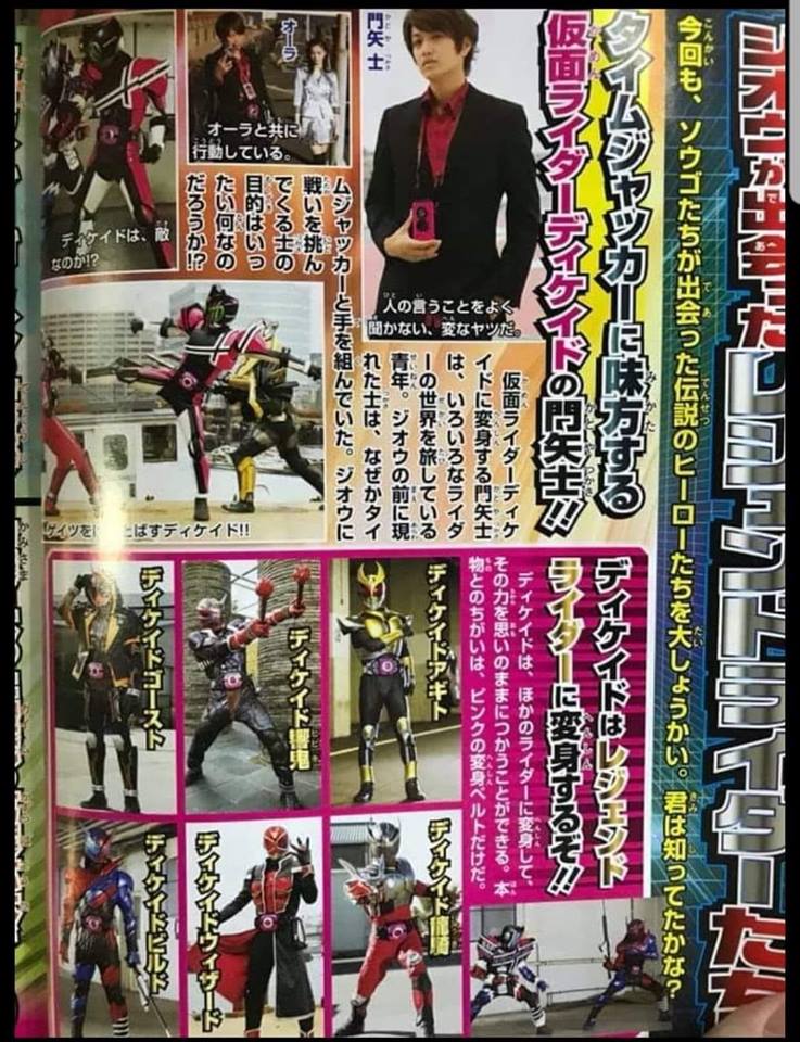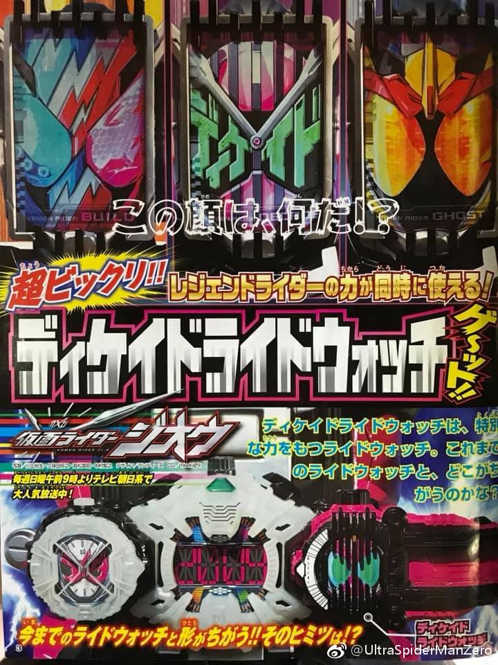 - Decade Ride Watch harnesses the power of Kamen Rider Decade - Decade Armor allows Zi-O to simultaneously use other rider powers by attaching an additional ride watch to the Decade Ride Watch - W Armor allows Zi-O to hurl swift kick and punch moves towards the enemy - Ride Heisaber is a sword exclusive to Decade Armor, attaching a ride watch to it will boost its sharpness - Another Kuuga will be a giant foe - Tsukasa for unknown reasons has allied with the Timejackers, and will be operating with Aura(new Timejacker I assume)
