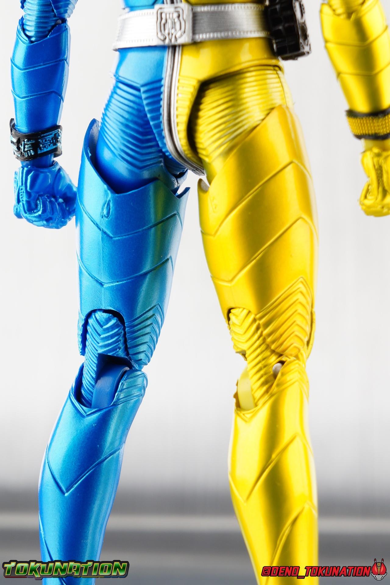 In order to save the young Asuka, who mistakes W for her Papa, Shotaro & Phillip took on the Anomalocaris Dopant. To save Asuka from the monster's tight grip, W used the elastic powers of Luna and sure shooting of Trigger to change the direction of his blasts and stop the Dopant as Kamen Rider W Luna/Trigger! Though this form doesn't have a debut with much fanfare, it'se a really fantastic color and ability combo that we've not seen in rider much before. Packaging The familiar Shinkocchou Seihou slip cover box makes another appearance! Nothing can be said about it this time that hasn't been said before. It's gotten a bit stale over time but it's still a pleasing type of collector's box. However, the benefit of Joker having been a Tamashii Nations event exclusive is that it got a bit of extra packaging fan fare. The anniversary slipcover around the regular Seihou box may be a bit monotone, but it's welcome change to what these releases normally have. Main Figure As with the previous line of Kamen Rider W figuarts, the Seihou releases rely heavily on repaints. Luna/Trigger is just the latest such, soon to be followed up by Heat/Metal. The nice thing about the almost straight repaints of these figures, is that we know exactly what to expect when it comes to W releases now. As with base Cyclone/Joker W, as well as Skull, Fang/Joker, & Joker that's true excellence. Feel free to peruse my review below, but it will be very similar in wording to my previous W related reviews due to the absence of radical changes. This mold has accurately recreated the suits you've seen in numerous episodes and movies down to their finest details. I've said this many times with Shinkoccouh Seihou releases, but I truly think the W body is the peak of engineering in the line so far (though I will be reviewing Wizard Flame Style this month....). But the W mold narrowly beats out other such examples of excellence like Garo & Kabuto Hyper Form. In every conceivable way these are fantastic figuarts though. For a frame of reference, the original W Figuarts were largely a product of their time. The contrast between the old line, and what we have now, is stark. For starters the S.S. release of Luna/Trigger nails the details and coloring. The original L/T figuart had far from accurate colors, more of a mustard yellow and icey blue, but colors imperfections were prevalent and often accepted early in the line. This go around, both halves are gorgeously painted though. The body itself is physically unchanged though aside from the always differnet chest, ankle & wrist details which always corespond to the memory on that half of the body. The figure functions identically the previous outings of the mold as well. If you've seen the C/J, Skull, Joker F/J or even the Eternal review, then you know what you're in for again. This mold works in every way that it must. It has not disappointed, even now, after many repeated uses. So I really don't have much of anything to say about functionality, please feel free to peruse any of those previous reviews for a more in depth look at how the figure functions. Now onto the Double Driver! This belt is still the crowning achievement of W Seihou line. A functional belt at this scale blows me away and simultaneously manages to frustrate me to no end. This figuart includes the Luna & Trigger Memories packed as a separate accessories, rather than in the Driver, so as not to lose them. I lose them very, very, often when shooting galleries of W figures. Just be extremely careful as the fit is quite loose in the Double Driver. Though this time around I only seem to have trouble with Trigger, as Luna stays in quite snugly. I think perhaps one of the few physical issues I may have with this figure is the head. The compound eyes seem a bit off to me. Almost like they're just too dark to see properly. In the group shot I took of C/J, L/T, & F/J together, it's apparent just how much brighter the eyes on C/J were. But I'm just not sure, Luna/Trigger's eyes just look off to me. This minor shortcoming aside this is still another excellent outing of this mold, and because this figure is a repaint of the magnificent Seihou W mold, it has the functionality spot. Seihou Luna/Trigger has the articulation to pull off everything it's known for in show *(though not necessarily the parts for it), and the proper sculpting for the joints needed for it to look perfect while doing so. The extending knee joints that look like a natural expansion of the costume, the near seamless thigh swivels, the way the upper arms & shoulder come together and separate just as you need, and the miraculous way the upper torso is designed. This figure just looks stunning in hand. I think these colors may pop even more than the previous several outings of the mold. The various Seihou W releases just have a way of doing that. I have an irrational desire to own all of these W variant even when I don't actually like the show. It's wacky. Accessories As with other W releases (mostly), Luna/Trigger comes with all the necessities: 6 - sets of hands. A wonderful smattering of options to choose from, these are all just repaints of hands that came with Cyclone/Joker, Fang/Joker, Joker, and Skull. Pretty much everything you're gonna need. 2 - Gaia Memories. 1 Luna, 1 Trigger. Same mold as any other memory, exquisite paint apps on each. Just as easy to lose as every other Gaia Memory you've ever handled. 1 - Trigger Magnum. Unlike the now ancient original Luna/Trigger figuart, this Magnum is fully functional. The original figure came with two Magnums, one for each mode. Whereas this one has a properly rotating Maximum Drive slot to differentiate it's two modes, Normal & Maximum. Memories stick in the slot much better than the Driver. 3 - Memory Gadgets. 1 Spider Shock. This one is set in Spider Mode Permanently and does not have the watch mode. This version can be plugged on the to back of the Magnum and allows W to shoot nets at his enemies. The othe