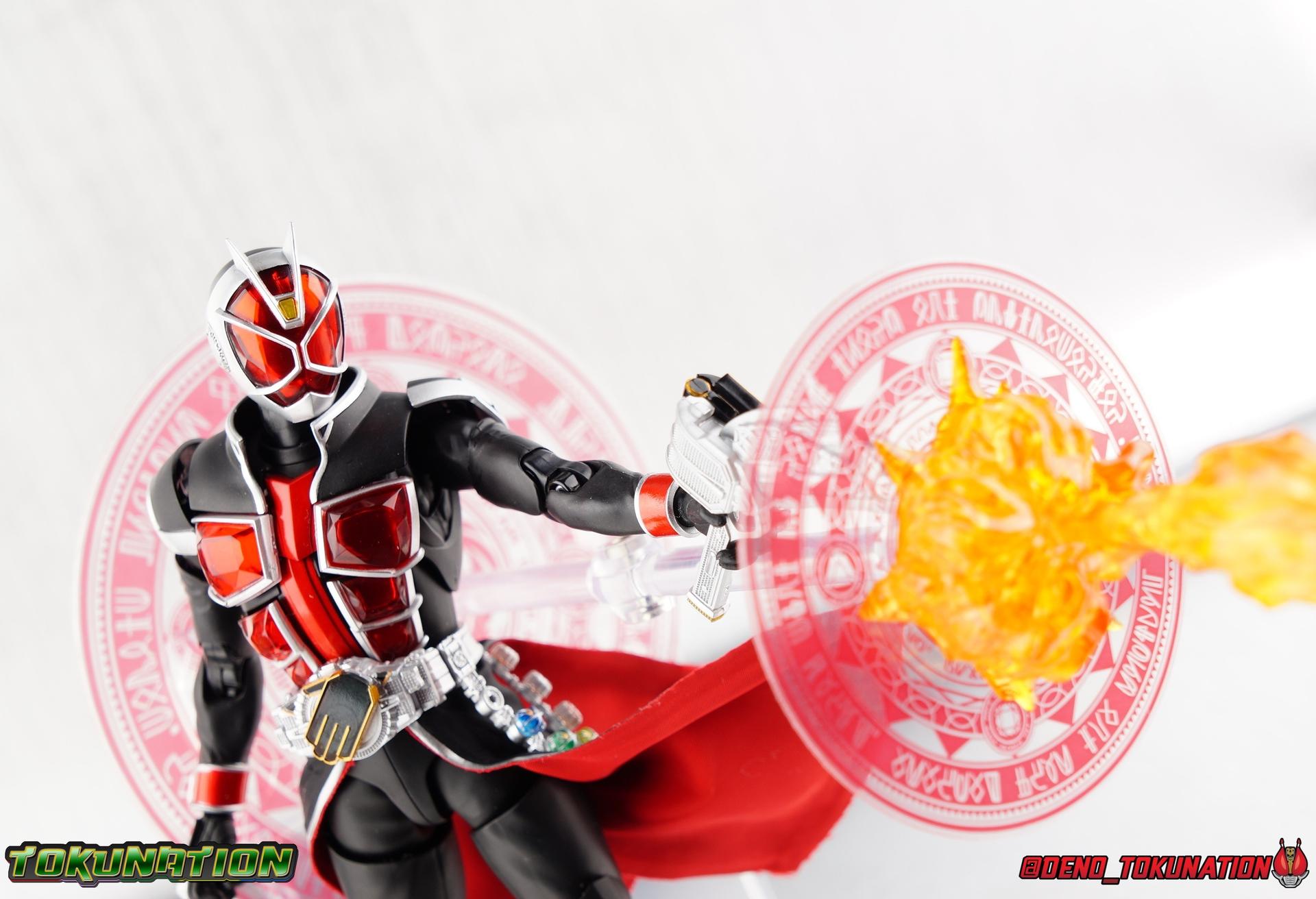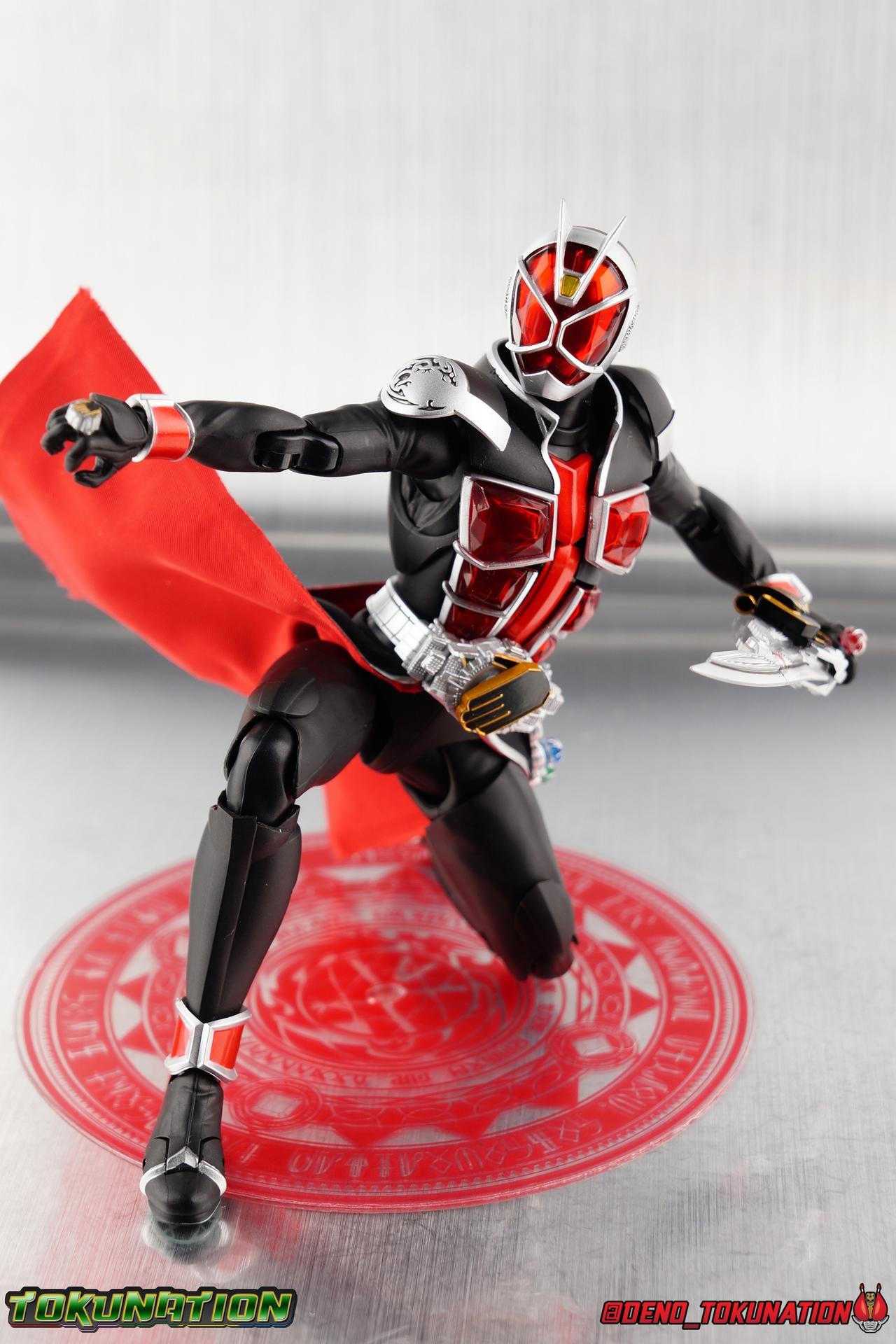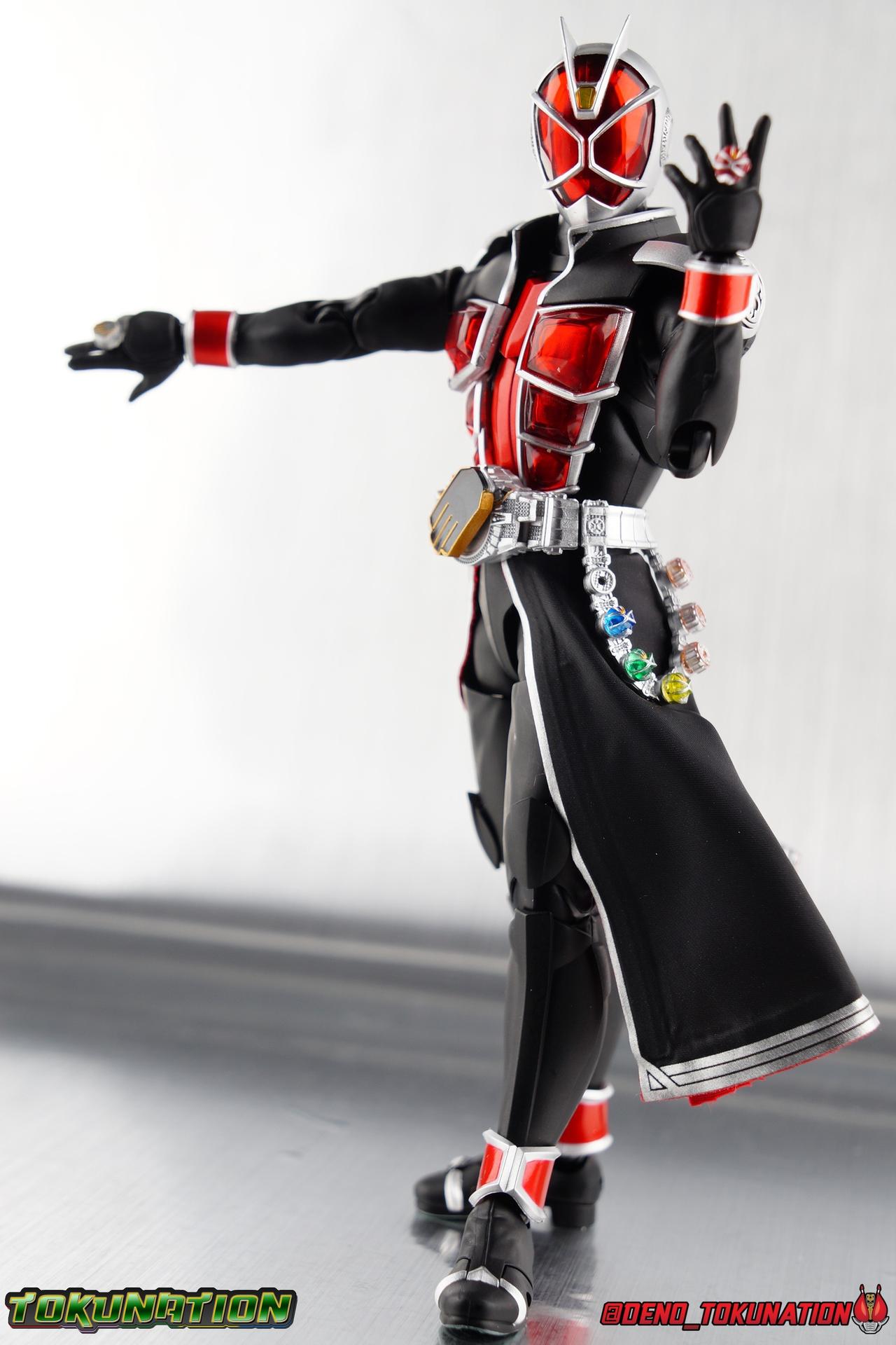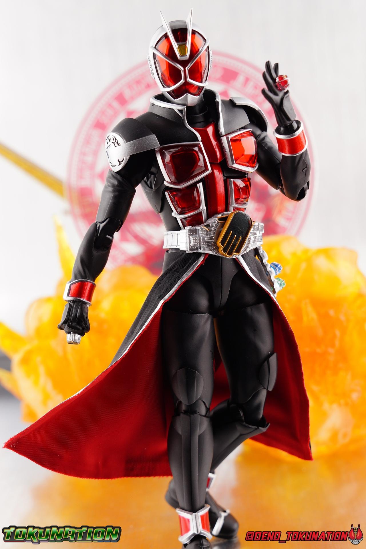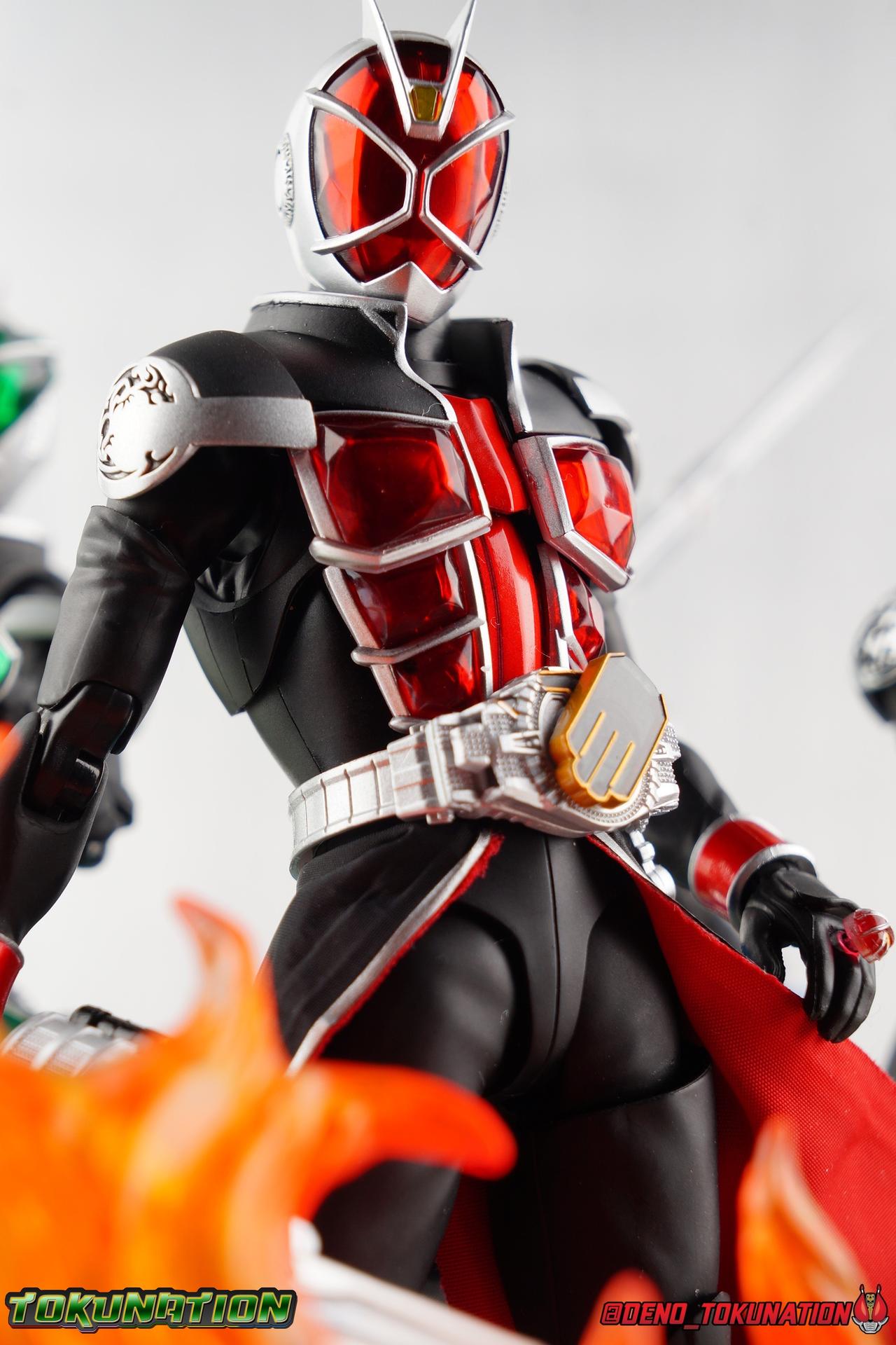 Haruto Soma was the only survivor of a dark Solar Eclipse ritual which saw the creation of a legion of monsters known as Phantoms. Assuming the likeness and identities of those humans they emerged from, Phantom's invade the world of humans and use magic to wreak havoc. Only one man can stop them, the one who faced despair head on in the light of the eclipse and emerged to gain the power of magic from his hope. Haruto Soma became Kamen Rider Wizard! Believe it or not, 2012-13 is the home of one of my favorite rider shows, Kamen Rider Wizard. The show gets derided often, but I've never felt that way about it. It was entertaining, had good music, a really enjoyable cast, some great twists along the way, and probably the most sensible and organic suit design and evolution of any series other than Kuuga. It's good stuff, and I've been waiting years for a new line of figures to properly represent it. Now that Shinkocchou Seihou has really taken off as a subline of premium renewals, and after having been shown off at multiple events leading up to it's release, Kamen Rider Wizard Flame Style has been reborn! ** This is a massive 100+ image gallery spread across the first 3 posts of this thread. Be sure to check it all out! Packaging The familiar Shinkocchou Seihou slip cover box makes another appearance! Not much can be said about it this time that hasn't been said before. It's gotten a bit stale (to me) over time but it's still a pleasing type of collector's box. Wizard features the now standard Bandai Spirits blue logo as well as the holofoil Tamashii Nations brand sticker. Main Figure Where to start? The original SHF Wizard has been spoken ill of for years. Essentially from the time it was released, pretty much forever. And rightfully so. Original Wizard was plagued by a number of issues including, a driver that perpetually fell off, incorrectly shaped and colored suit details, a stumpy torso, clown shoes, and just generally squashed and distorted proportions overall. Seihou Wizard goes above and beyond fixing every single one of these issues. For starters Seihou Wizard is a gorgeous figure, even statically posed. Just straight out the box standing upright, this thing looks gorgeous. This is a figure than looks like a suit on display at a Toei event. They've really and truly nailed this one. Looking at the figure, you can see that the legs are about the same length as the original, which is to say the original had a ridiculously short and stumpy torso. The Seihou's legs are thicker and more muscular over all, and are thankfully articulated much better. The hips now feature a thigh swivel, though one that's weirdly limited to roughly a quarter turn in either direction. In another course correction the new knee joint is designed so that the knee cap armor is above it, rather than the middle, giving the legs a more accurate look when posed. The feet and ankles have likewise been designed with full function in mind. The ankle tilts are far more free while the actual feet are no longer clown sized, Thanks to new toe bends they function better as well, and the details on the sole of the shoes has been fully sculpted and painted this time as well. Of course the biggest improvement of this entire release is the Wizard Robes. These are absolutely wonderful, and something that was sorely missing from literally every Wizard Figuart before this. And has sorely been missing from other recent releases like Kamen Rider Cronus. These new robes are actually two halves of fabric that are glued together with a poseable wire running along the entire contour. I will say that the edges of the fabric have some fraying to them that bothers me, but at this scale I think this has been done as well as possible. The wire allows the robes to be posed in really fantastic ways, making it look naturally windswept or tussled as necessary. I think the photos speak for themselves, these are the ideal way to recreate Wizard's Robes, and are far better than the rubbery plastic interchangeable bits the old one had. On the waist is of course the Wizard Driver, which I'm happy to report is fully functional. The sliding mechanism has been recreated so that when you simultaneously move the blocks on either side of the face, that the driver hand spins accordingly. The Ring Holder on the left hip is also quite the highlight. All of Wizard's standard Rings are included as separate accessories (which I'll detail further below) and can be plugged into the belt. Each time you change the ring on the corresponding hand, you can plug it safely and snugly into the holder for storage. The upper body is a real marvel as well. As you can see, the way it's designed is a total reversal of the original. Instead of a tiny ab section floating below a bulky chest, the entire torso is two more properly sized halves. The jewels lining the exterior of these pieces can slide up or down slightly, in particular those along the chest. Much like how Seihou Amazon & Kabuto have pectoral parts that move to accommodate the rest of the way the body moves. The entire assembly adds up to a way more useful and functional figure than we ever had before. As with everything else, the arms are far superior to what came before them. A bit longer and more evenly proportioned to the main body, Wizard's arms feature a bicep swivel as well as a far better elbow joint that allows you to bring the arm in right up against the body. The sculpted in fabric style detailing is also done a bit differently this time, and makes things look much more natural than before. The only odd thing I can say about them, is that Wizard does not come with close fists attached. In fact, he only come with one closed (right) fist at all. The standard hands he has out of box are relaxed open hands. That's just a new thing, Figuarts pretty much always come with closed fists attached so that was a bit strange. No matter what hands you're using with Wizard, every single one of them has a small peg hole t