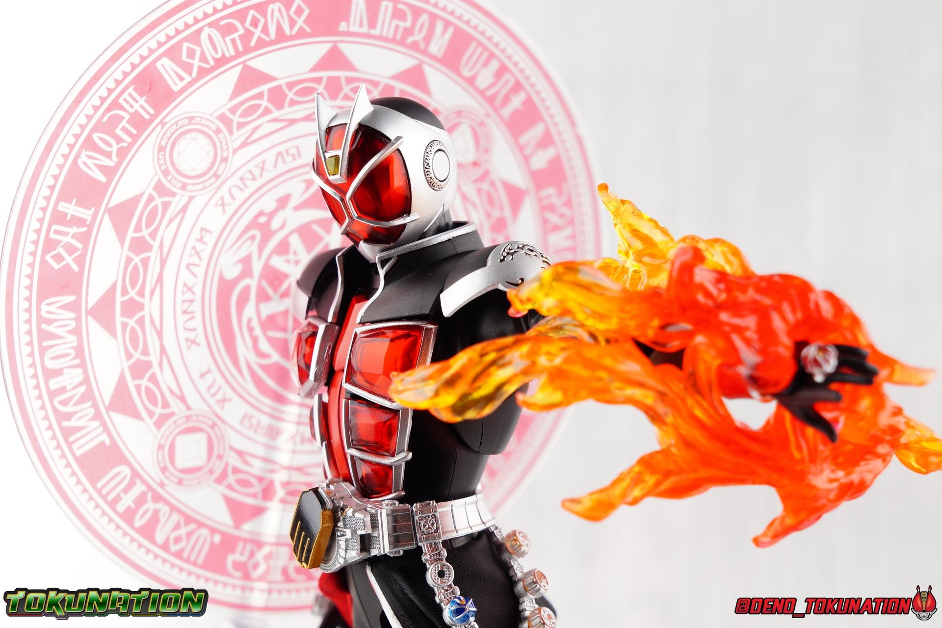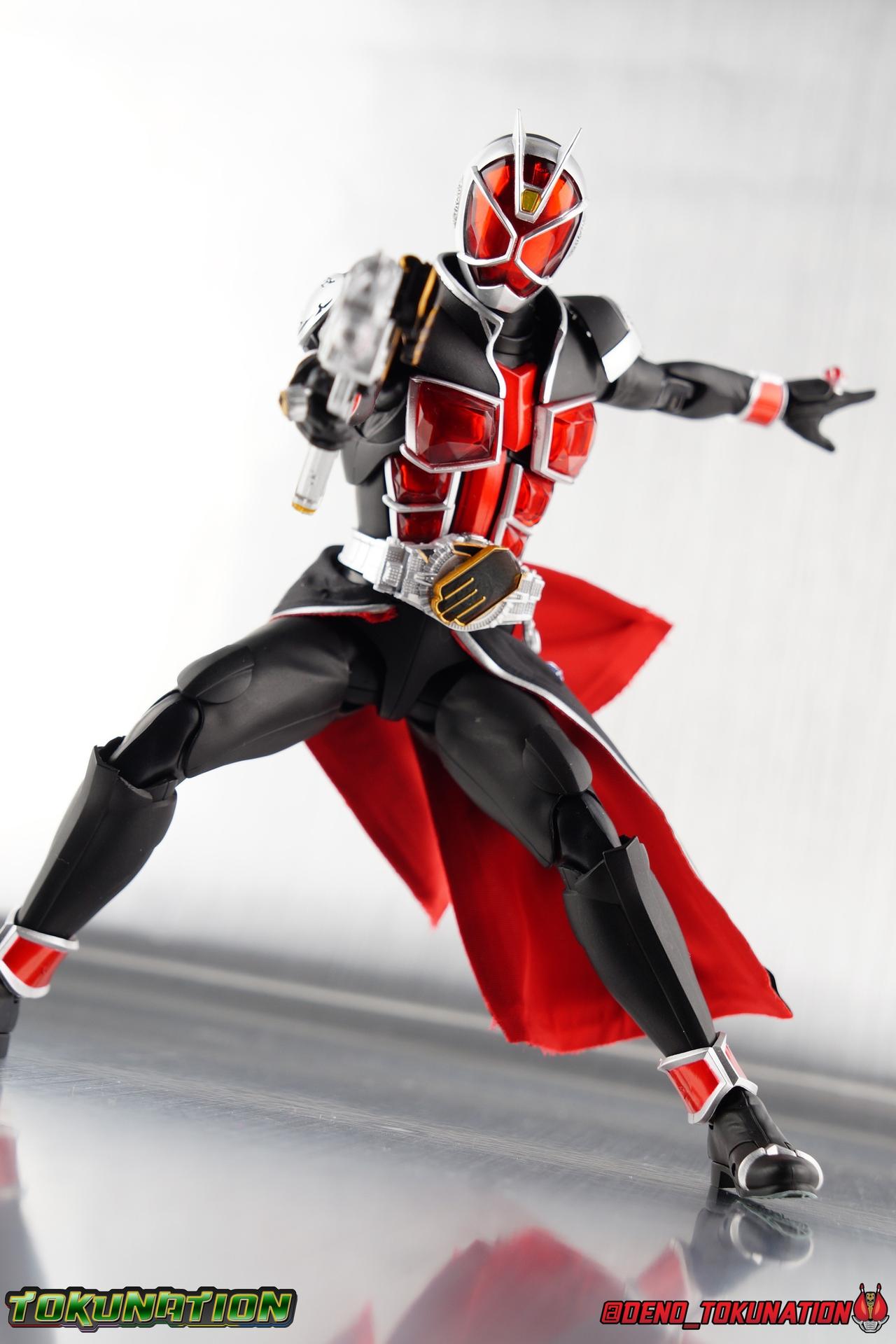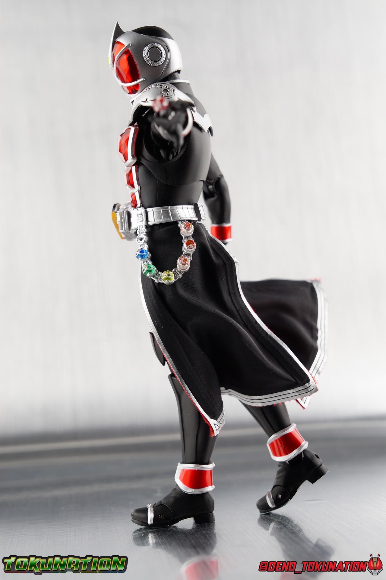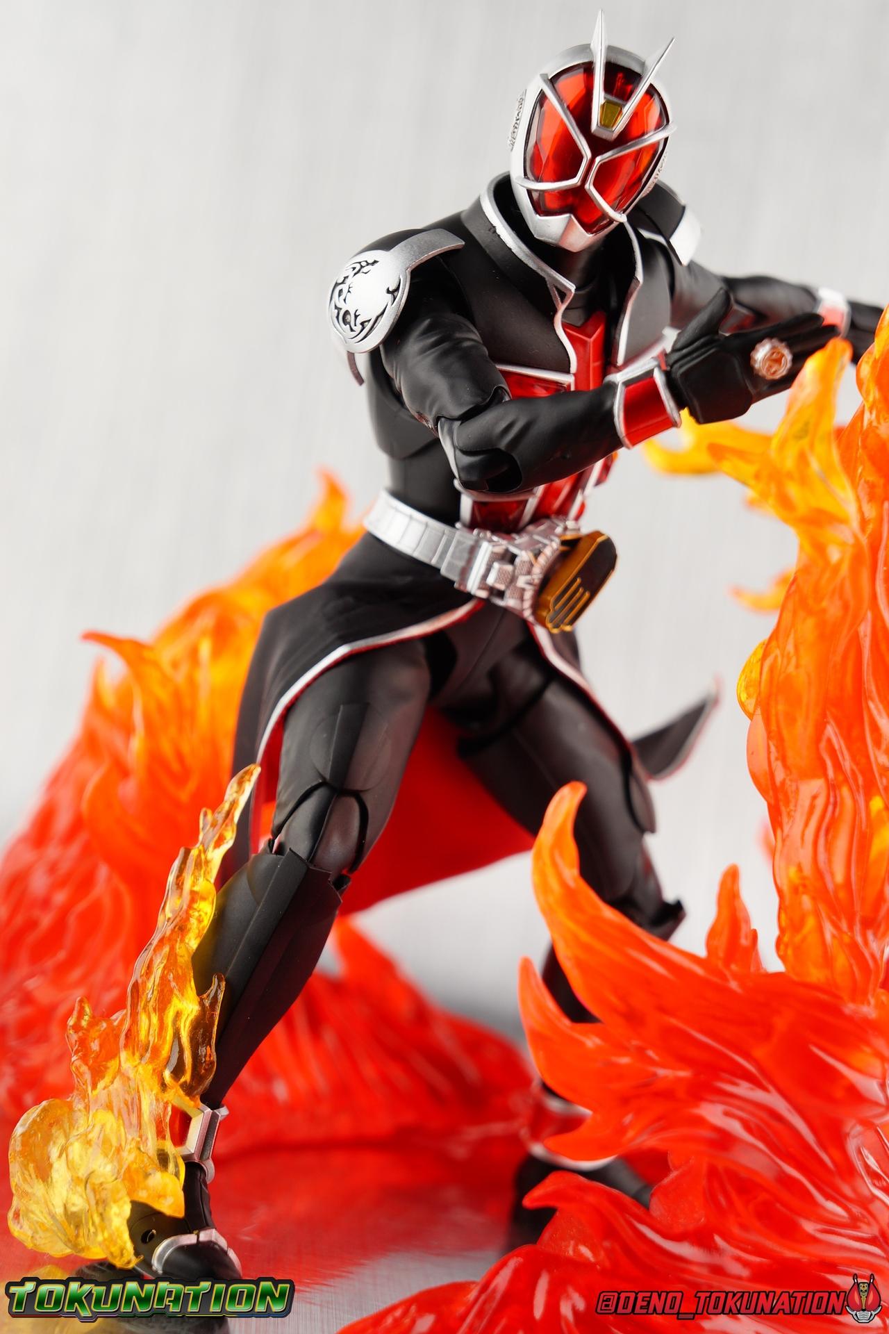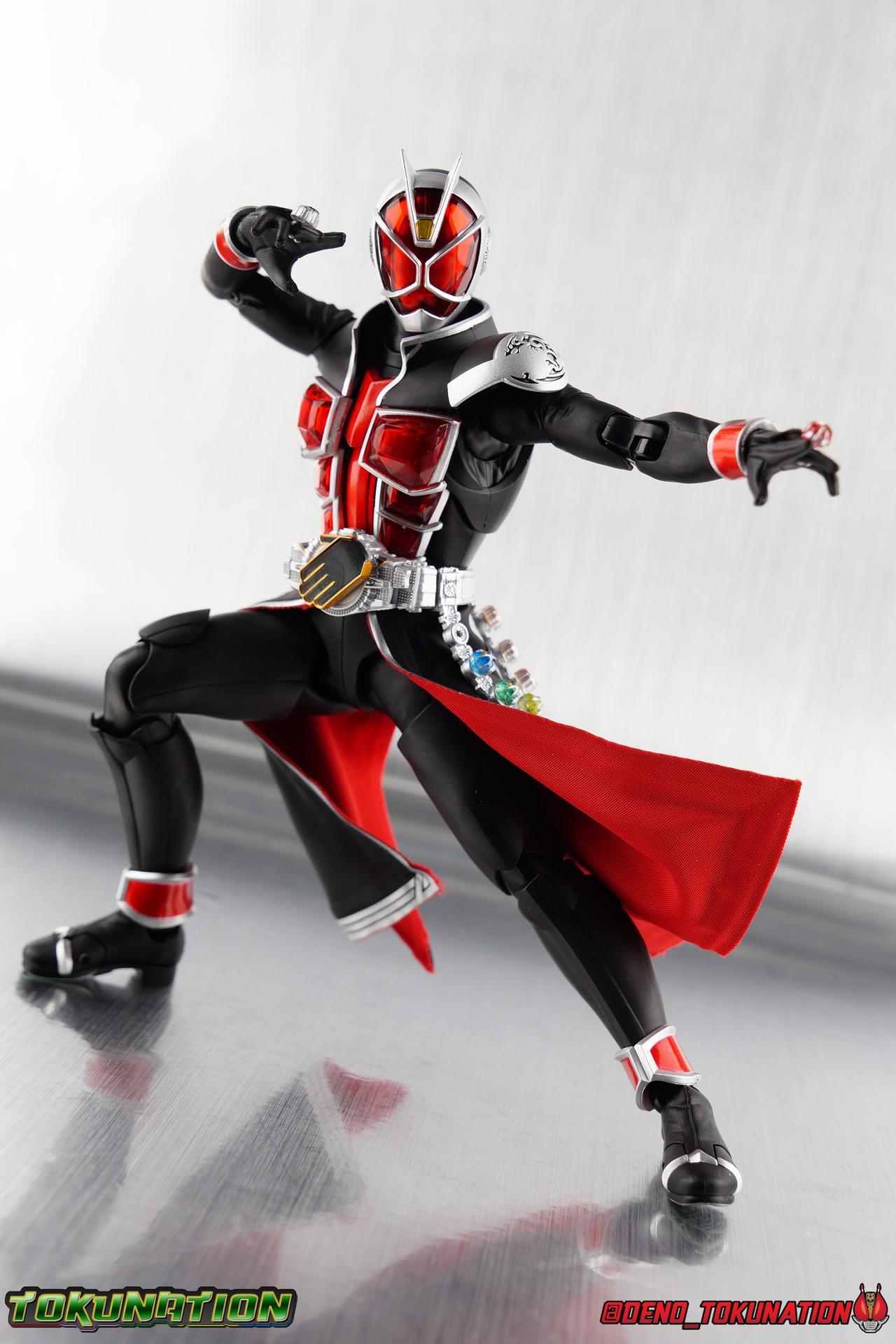 Haruto Soma was the only survivor of a dark Solar Eclipse ritual which saw the creation of a legion of monsters known as Phantoms. Assuming the likeness and identities of those humans they emerged from, Phantom's invade the world of humans and use magic to wreak havoc. Only one man can stop them, the one who faced despair head on in the light of the eclipse and emerged to gain the power of magic from his hope. Haruto Soma became Kamen Rider Wizard! Believe it or not, 2012-13 is the home of one of my favorite rider shows, Kamen Rider Wizard. The show gets derided often, but I've never felt that way about it. It was entertaining, had good music, a really enjoyable cast, some great twists along the way, and probably the most sensible and organic suit design and evolution of any series other than Kuuga. It's good stuff, and I've been waiting years for a new line of figures to properly represent it. Now that Shinkocchou Seihou has really taken off as a subline of premium renewals, and after having been shown off at multiple events leading up to it's release, Kamen Rider Wizard Flame Style has been reborn! ** This is a massive 100+ image gallery spread across the first 3 posts of this thread. Be sure to check it all out! Packaging The familiar Shinkocchou Seihou slip cover box makes another appearance! Not much can be said about it this time that hasn't been said before. It's gotten a bit stale (to me) over time but it's still a pleasing type of collector's box. Wizard features the now standard Bandai Spirits blue logo as well as the holofoil Tamashii Nations brand sticker. Main Figure Where to start? The original SHF Wizard has been spoken ill of for years. Essentially from the time it was released, pretty much forever. And rightfully so. Original Wizard was plagued by a number of issues including, a driver that perpetually fell off, incorrectly shaped and colored suit details, a stumpy torso, clown shoes, and just generally squashed and distorted proportions overall. Seihou Wizard goes above and beyond fixing every single one of these issues. For starters Seihou Wizard is a gorgeous figure, even statically posed. Just straight out the box standing upright, this thing looks gorgeous. This is a figure than looks like a suit on display at a Toei event. They've really and truly nailed this one. Looking at the figure, you can see that the legs are about the same length as the original, which is to say the original had a ridiculously short and stumpy torso. The Seihou's legs are thicker and more muscular over all, and are thankfully articulated much better. The hips now feature a thigh swivel, though one that's weirdly limited to roughly a quarter turn in either direction. In another course correction the new knee joint is designed so that the knee cap armor is above it, rather than the middle, giving the legs a more accurate look when posed. The feet and ankles have likewise been designed with full function in mind. The ankle tilts are far more free while the actual feet are no longer clown sized, Thanks to new toe bends they function better as well, and the details on the sole of the shoes has been fully sculpted and painted this time as well. Of course the biggest improvement of this entire release is the Wizard Robes. These are absolutely wonderful, and something that was sorely missing from literally every Wizard Figuart before this. And has sorely been missing from other recent releases like Kamen Rider Cronus. These new robes are actually two halves of fabric that are glued together with a poseable wire running along the entire contour. I will say that the edges of the fabric have some fraying to them that bothers me, but at this scale I think this has been done as well as possible. The wire allows the robes to be posed in really fantastic ways, making it look naturally windswept or tussled as necessary. I think the photos speak for themselves, these are the ideal way to recreate Wizard's Robes, and are far better than the rubbery plastic interchangeable bits the old one had. On the waist is of course the Wizard Driver, which I'm happy to report is fully functional. The sliding mechanism has been recreated so that when you simultaneously move the blocks on either side of the face, that the driver hand spins accordingly. The Ring Holder on the left hip is also quite the highlight. All of Wizard's standard Rings are included as separate accessories (which I'll detail further below) and can be plugged into the belt. Each time you change the ring on the corresponding hand, you can plug it safely and snugly into the holder for storage. The upper body is a real marvel as well. As you can see, the way it's designed is a total reversal of the original. Instead of a tiny ab section floating below a bulky chest, the entire torso is two more properly sized halves. The jewels lining the exterior of these pieces can slide up or down slightly, in particular those along the chest. Much like how Seihou Amazon & Kabuto have pectoral parts that move to accommodate the rest of the way the body moves. The entire assembly adds up to a way more useful and functional figure than we ever had before. As with everything else, the arms are far superior to what came before them. A bit longer and more evenly proportioned to the main body, Wizard's arms feature a bicep swivel as well as a far better elbow joint that allows you to bring the arm in right up against the body. The sculpted in fabric style detailing is also done a bit differently this time, and makes things look much more natural than before. The only odd thing I can say about them, is that Wizard does not come with close fists attached. In fact, he only come with one closed (right) fist at all. The standard hands he has out of box are relaxed open hands. That's just a new thing, Figuarts pretty much always come with closed fists attached so that was a bit strange. No matter what hands you're using with Wizard, every single one of them has a small peg hole t