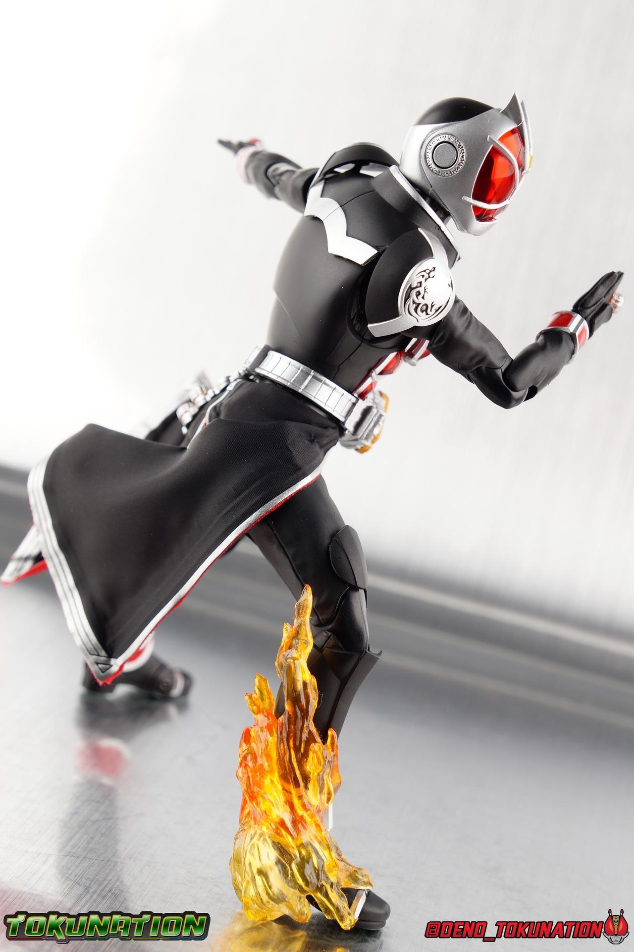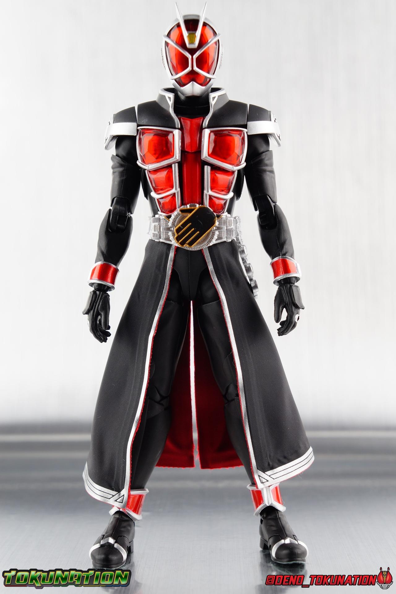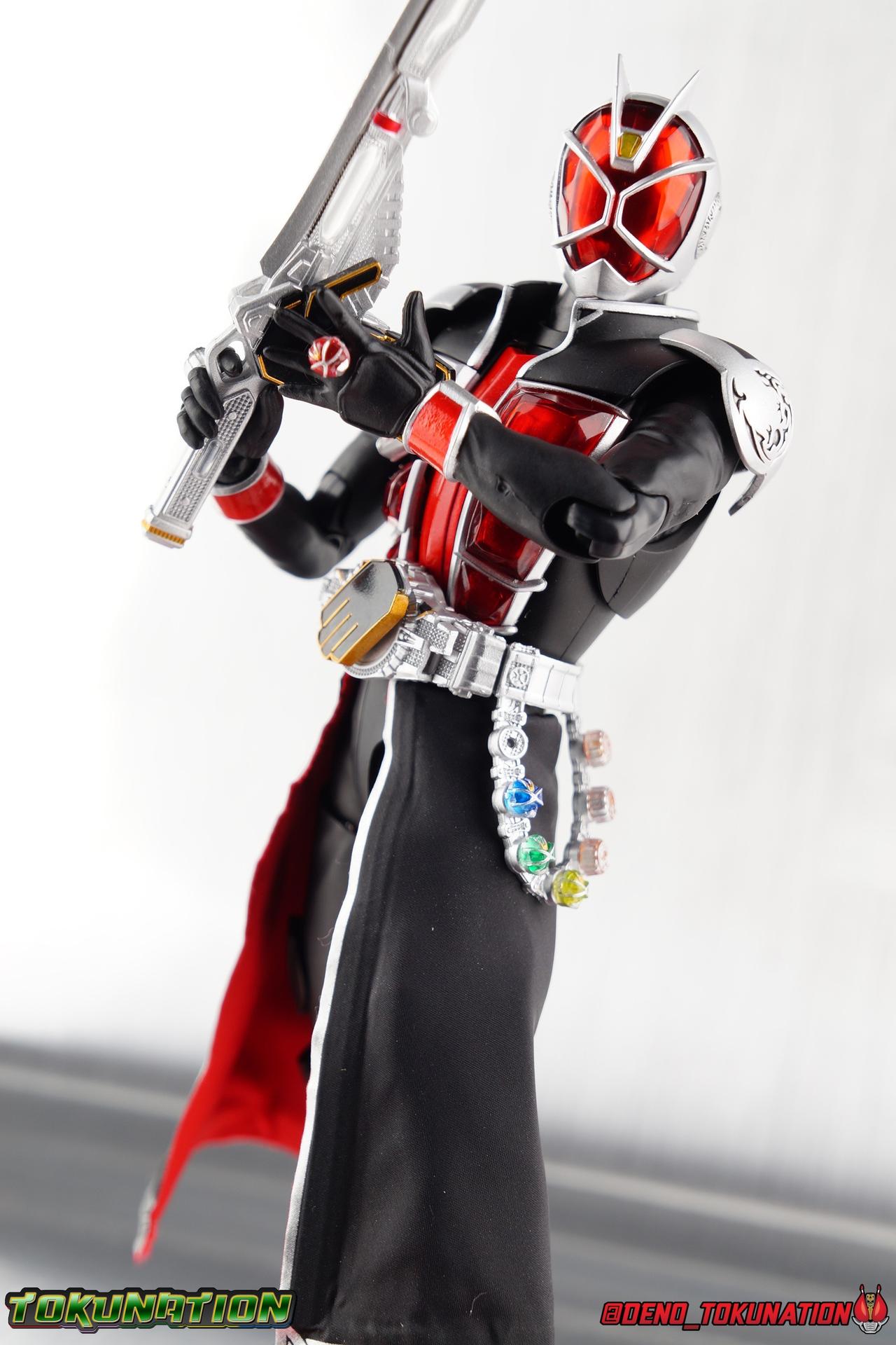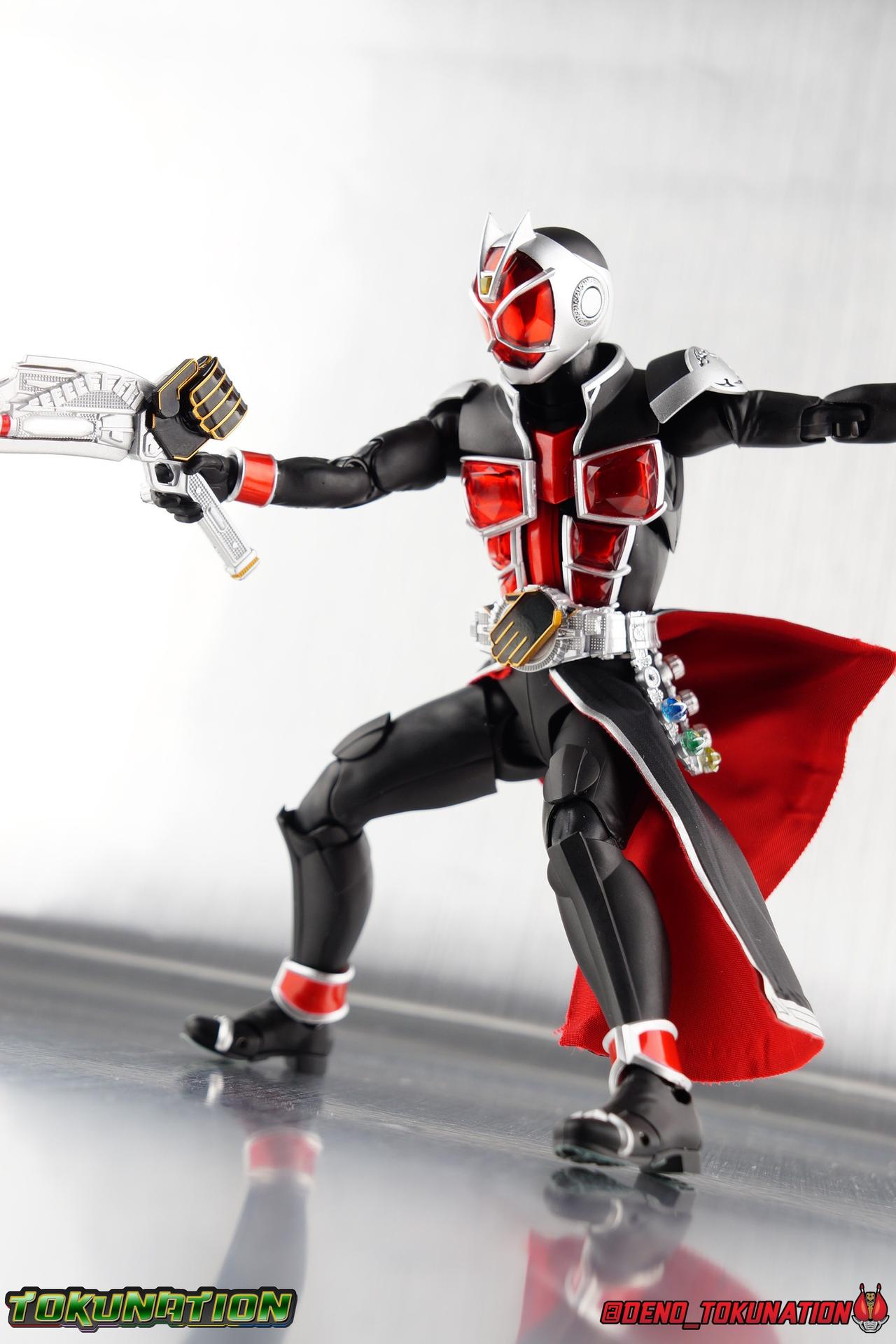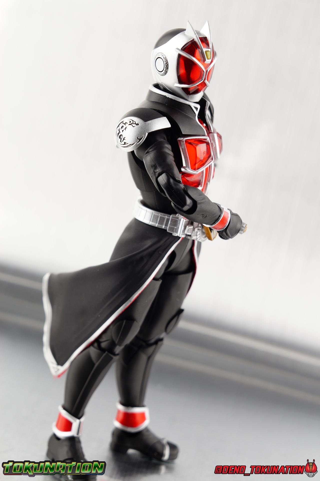 Haruto Soma was the only survivor of a dark Solar Eclipse ritual which saw the creation of a legion of monsters known as Phantoms. Assuming the likeness and identities of those humans they emerged from, Phantom's invade the world of humans and use magic to wreak havoc. Only one man can stop them, the one who faced despair head on in the light of the eclipse and emerged to gain the power of magic from his hope. Haruto Soma became Kamen Rider Wizard! Believe it or not, 2012-13 is the home of one of my favorite rider shows, Kamen Rider Wizard. The show gets derided often, but I've never felt that way about it. It was entertaining, had good music, a really enjoyable cast, some great twists along the way, and probably the most sensible and organic suit design and evolution of any series other than Kuuga. It's good stuff, and I've been waiting years for a new line of figures to properly represent it. Now that Shinkocchou Seihou has really taken off as a subline of premium renewals, and after having been shown off at multiple events leading up to it's release, Kamen Rider Wizard Flame Style has been reborn! ** This is a massive 100+ image gallery spread across the first 3 posts of this thread. Be sure to check it all out! Packaging The familiar Shinkocchou Seihou slip cover box makes another appearance! Not much can be said about it this time that hasn't been said before. It's gotten a bit stale (to me) over time but it's still a pleasing type of collector's box. Wizard features the now standard Bandai Spirits blue logo as well as the holofoil Tamashii Nations brand sticker. Main Figure Where to start? The original SHF Wizard has been spoken ill of for years. Essentially from the time it was released, pretty much forever. And rightfully so. Original Wizard was plagued by a number of issues including, a driver that perpetually fell off, incorrectly shaped and colored suit details, a stumpy torso, clown shoes, and just generally squashed and distorted proportions overall. Seihou Wizard goes above and beyond fixing every single one of these issues. For starters Seihou Wizard is a gorgeous figure, even statically posed. Just straight out the box standing upright, this thing looks gorgeous. This is a figure than looks like a suit on display at a Toei event. They've really and truly nailed this one. Looking at the figure, you can see that the legs are about the same length as the original, which is to say the original had a ridiculously short and stumpy torso. The Seihou's legs are thicker and more muscular over all, and are thankfully articulated much better. The hips now feature a thigh swivel, though one that's weirdly limited to roughly a quarter turn in either direction. In another course correction the new knee joint is designed so that the knee cap armor is above it, rather than the middle, giving the legs a more accurate look when posed. The feet and ankles have likewise been designed with full function in mind. The ankle tilts are far more free while the actual feet are no longer clown sized, Thanks to new toe bends they function better as well, and the details on the sole of the shoes has been fully sculpted and painted this time as well. Of course the biggest improvement of this entire release is the Wizard Robes. These are absolutely wonderful, and something that was sorely missing from literally every Wizard Figuart before this. And has sorely been missing from other recent releases like Kamen Rider Cronus. These new robes are actually two halves of fabric that are glued together with a poseable wire running along the entire contour. I will say that the edges of the fabric have some fraying to them that bothers me, but at this scale I think this has been done as well as possible. The wire allows the robes to be posed in really fantastic ways, making it look naturally windswept or tussled as necessary. I think the photos speak for themselves, these are the ideal way to recreate Wizard's Robes, and are far better than the rubbery plastic interchangeable bits the old one had. On the waist is of course the Wizard Driver, which I'm happy to report is fully functional. The sliding mechanism has been recreated so that when you simultaneously move the blocks on either side of the face, that the driver hand spins accordingly. The Ring Holder on the left hip is also quite the highlight. All of Wizard's standard Rings are included as separate accessories (which I'll detail further below) and can be plugged into the belt. Each time you change the ring on the corresponding hand, you can plug it safely and snugly into the holder for storage. The upper body is a real marvel as well. As you can see, the way it's designed is a total reversal of the original. Instead of a tiny ab section floating below a bulky chest, the entire torso is two more properly sized halves. The jewels lining the exterior of these pieces can slide up or down slightly, in particular those along the chest. Much like how Seihou Amazon & Kabuto have pectoral parts that move to accommodate the rest of the way the body moves. The entire assembly adds up to a way more useful and functional figure than we ever had before. As with everything else, the arms are far superior to what came before them. A bit longer and more evenly proportioned to the main body, Wizard's arms feature a bicep swivel as well as a far better elbow joint that allows you to bring the arm in right up against the body. The sculpted in fabric style detailing is also done a bit differently this time, and makes things look much more natural than before. The only odd thing I can say about them, is that Wizard does not come with close fists attached. In fact, he only come with one closed (right) fist at all. The standard hands he has out of box are relaxed open hands. That's just a new thing, Figuarts pretty much always come with closed fists attached so that was a bit strange. No matter what hands you're using with Wizard, every single one of them has a small peg hole t