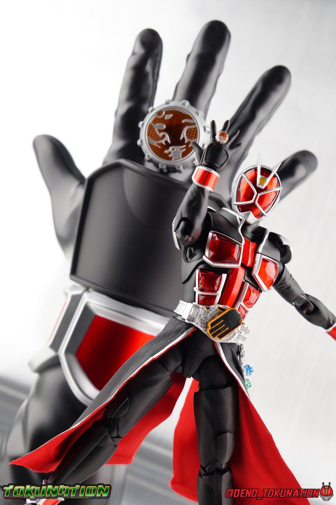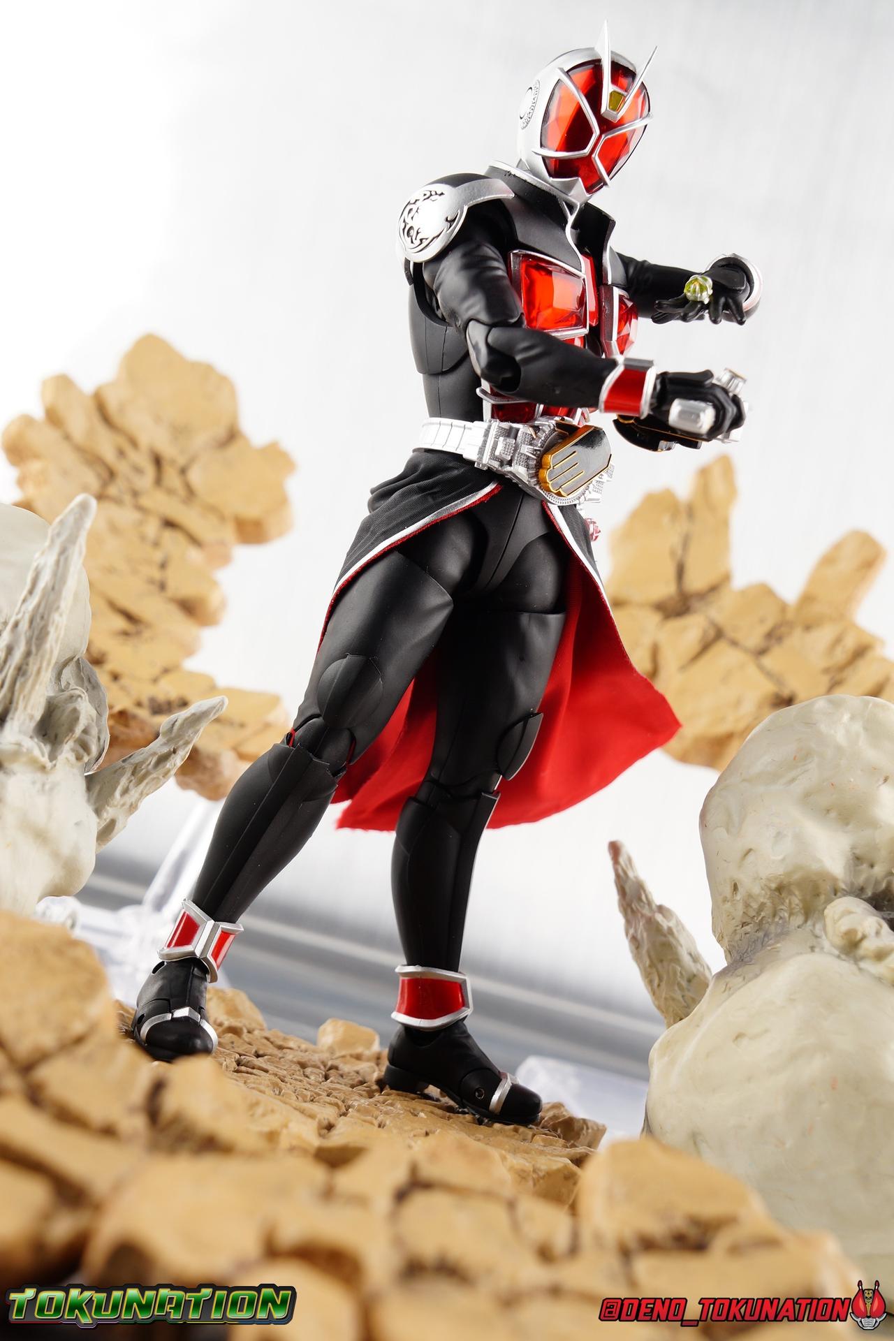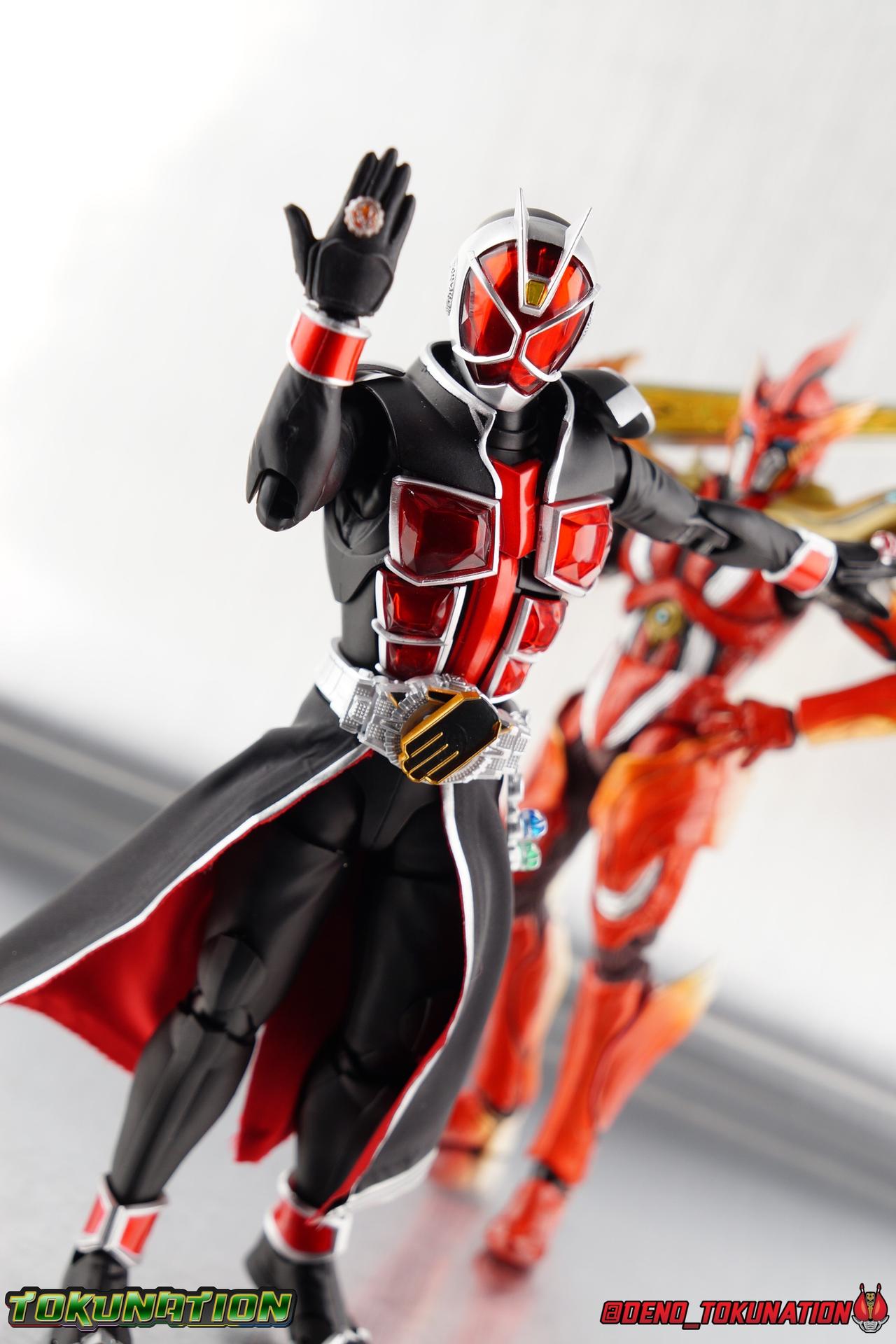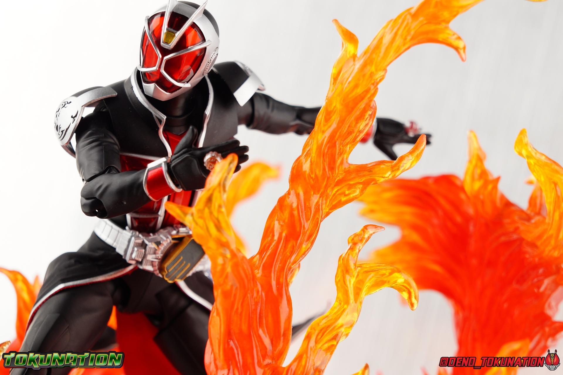 Haruto Soma was the only survivor of a dark Solar Eclipse ritual which saw the creation of a legion of monsters known as Phantoms. Assuming the likeness and identities of those humans they emerged from, Phantom's invade the world of humans and use magic to wreak havoc. Only one man can stop them, the one who faced despair head on in the light of the eclipse and emerged to gain the power of magic from his hope. Haruto Soma became Kamen Rider Wizard! Believe it or not, 2012-13 is the home of one of my favorite rider shows, Kamen Rider Wizard. The show gets derided often, but I've never felt that way about it. It was entertaining, had good music, a really enjoyable cast, some great twists along the way, and probably the most sensible and organic suit design and evolution of any series other than Kuuga. It's good stuff, and I've been waiting years for a new line of figures to properly represent it. Now that Shinkocchou Seihou has really taken off as a subline of premium renewals, and after having been shown off at multiple events leading up to it's release, Kamen Rider Wizard Flame Style has been reborn! ** This is a massive 100+ image gallery spread across the first 3 posts of this thread. Be sure to check it all out! Packaging The familiar Shinkocchou Seihou slip cover box makes another appearance! Not much can be said about it this time that hasn't been said before. It's gotten a bit stale (to me) over time but it's still a pleasing type of collector's box. Wizard features the now standard Bandai Spirits blue logo as well as the holofoil Tamashii Nations brand sticker. Main Figure Where to start? The original SHF Wizard has been spoken ill of for years. Essentially from the time it was released, pretty much forever. And rightfully so. Original Wizard was plagued by a number of issues including, a driver that perpetually fell off, incorrectly shaped and colored suit details, a stumpy torso, clown shoes, and just generally squashed and distorted proportions overall. Seihou Wizard goes above and beyond fixing every single one of these issues. For starters Seihou Wizard is a gorgeous figure, even statically posed. Just straight out the box standing upright, this thing looks gorgeous. This is a figure than looks like a suit on display at a Toei event. They've really and truly nailed this one. Looking at the figure, you can see that the legs are about the same length as the original, which is to say the original had a ridiculously short and stumpy torso. The Seihou's legs are thicker and more muscular over all, and are thankfully articulated much better. The hips now feature a thigh swivel, though one that's weirdly limited to roughly a quarter turn in either direction. In another course correction the new knee joint is designed so that the knee cap armor is above it, rather than the middle, giving the legs a more accurate look when posed. The feet and ankles have likewise been designed with full function in mind. The ankle tilts are far more free while the actual feet are no longer clown sized, Thanks to new toe bends they function better as well, and the details on the sole of the shoes has been fully sculpted and painted this time as well. Of course the biggest improvement of this entire release is the Wizard Robes. These are absolutely wonderful, and something that was sorely missing from literally every Wizard Figuart before this. And has sorely been missing from other recent releases like Kamen Rider Cronus. These new robes are actually two halves of fabric that are glued together with a poseable wire running along the entire contour. I will say that the edges of the fabric have some fraying to them that bothers me, but at this scale I think this has been done as well as possible. The wire allows the robes to be posed in really fantastic ways, making it look naturally windswept or tussled as necessary. I think the photos speak for themselves, these are the ideal way to recreate Wizard's Robes, and are far better than the rubbery plastic interchangeable bits the old one had. On the waist is of course the Wizard Driver, which I'm happy to report is fully functional. The sliding mechanism has been recreated so that when you simultaneously move the blocks on either side of the face, that the driver hand spins accordingly. The Ring Holder on the left hip is also quite the highlight. All of Wizard's standard Rings are included as separate accessories (which I'll detail further below) and can be plugged into the belt. Each time you change the ring on the corresponding hand, you can plug it safely and snugly into the holder for storage. The upper body is a real marvel as well. As you can see, the way it's designed is a total reversal of the original. Instead of a tiny ab section floating below a bulky chest, the entire torso is two more properly sized halves. The jewels lining the exterior of these pieces can slide up or down slightly, in particular those along the chest. Much like how Seihou Amazon & Kabuto have pectoral parts that move to accommodate the rest of the way the body moves. The entire assembly adds up to a way more useful and functional figure than we ever had before. As with everything else, the arms are far superior to what came before them. A bit longer and more evenly proportioned to the main body, Wizard's arms feature a bicep swivel as well as a far better elbow joint that allows you to bring the arm in right up against the body. The sculpted in fabric style detailing is also done a bit differently this time, and makes things look much more natural than before. The only odd thing I can say about them, is that Wizard does not come with close fists attached. In fact, he only come with one closed (right) fist at all. The standard hands he has out of box are relaxed open hands. That's just a new thing, Figuarts pretty much always come with closed fists attached so that was a bit strange. No matter what hands you're using with Wizard, every single one of them has a small peg hole t