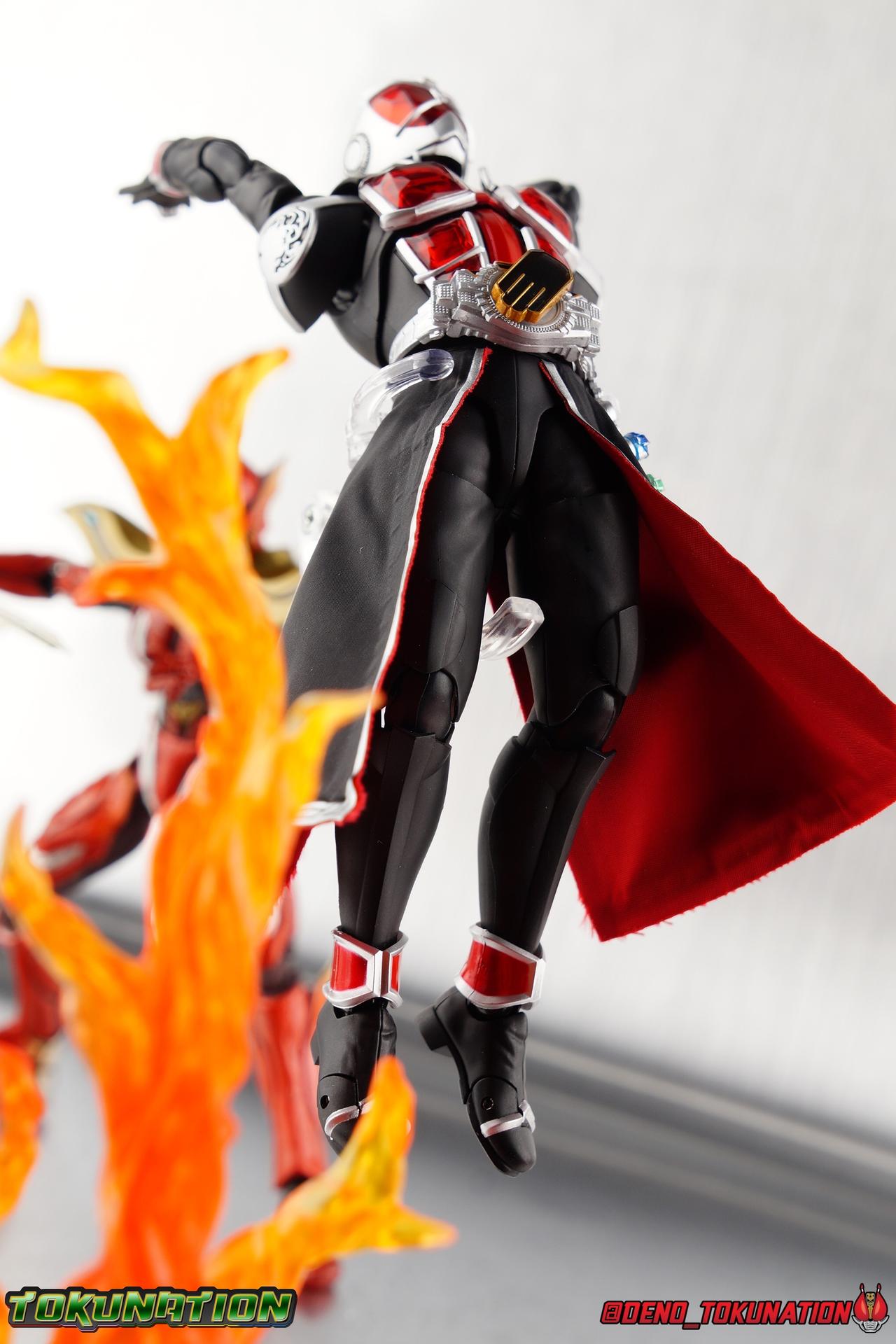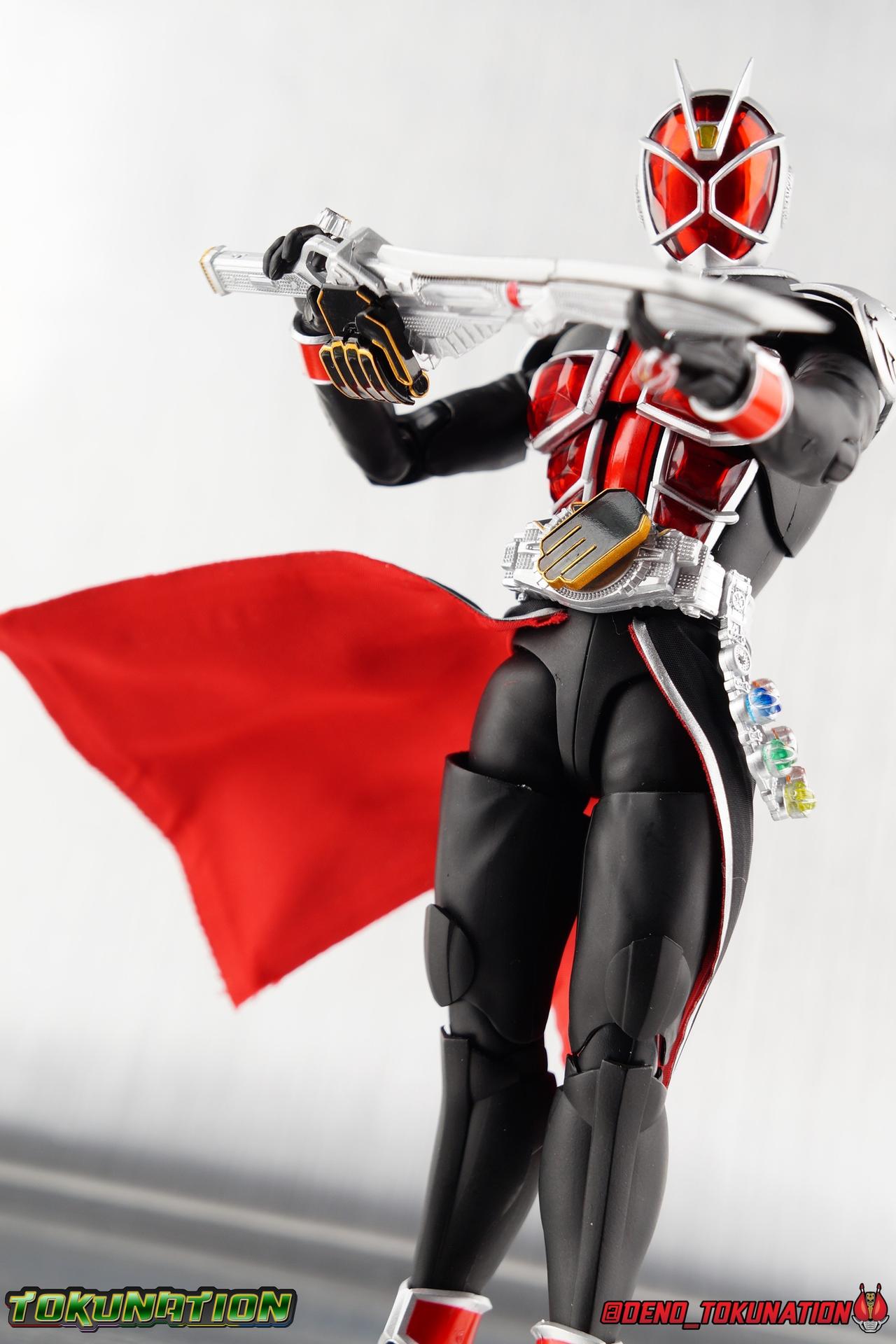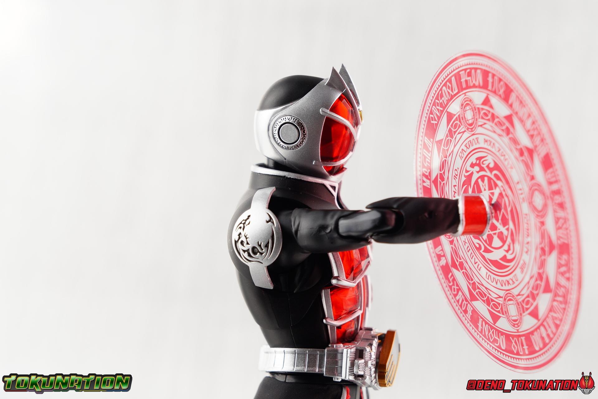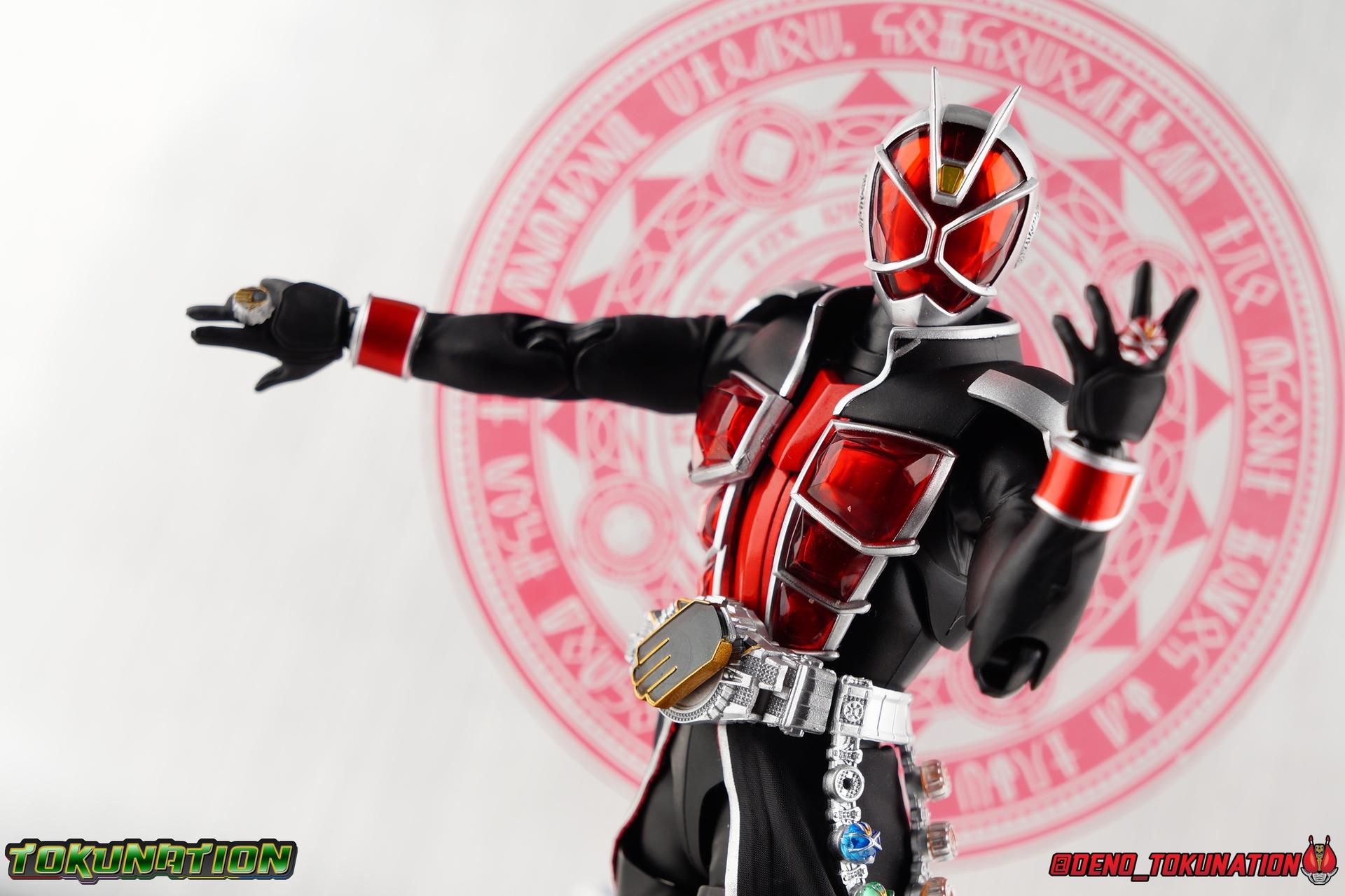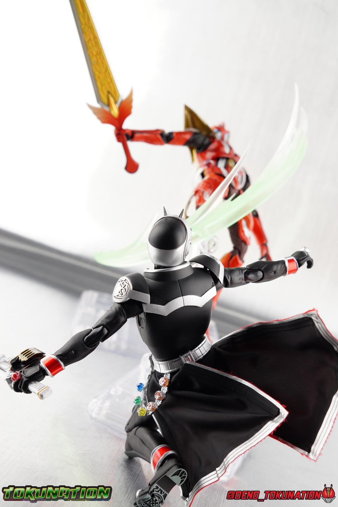 Haruto Soma was the only survivor of a dark Solar Eclipse ritual which saw the creation of a legion of monsters known as Phantoms. Assuming the likeness and identities of those humans they emerged from, Phantom's invade the world of humans and use magic to wreak havoc. Only one man can stop them, the one who faced despair head on in the light of the eclipse and emerged to gain the power of magic from his hope. Haruto Soma became Kamen Rider Wizard! Believe it or not, 2012-13 is the home of one of my favorite rider shows, Kamen Rider Wizard. The show gets derided often, but I've never felt that way about it. It was entertaining, had good music, a really enjoyable cast, some great twists along the way, and probably the most sensible and organic suit design and evolution of any series other than Kuuga. It's good stuff, and I've been waiting years for a new line of figures to properly represent it. Now that Shinkocchou Seihou has really taken off as a subline of premium renewals, and after having been shown off at multiple events leading up to it's release, Kamen Rider Wizard Flame Style has been reborn! ** This is a massive 100+ image gallery spread across the first 3 posts of this thread. Be sure to check it all out! Packaging The familiar Shinkocchou Seihou slip cover box makes another appearance! Not much can be said about it this time that hasn't been said before. It's gotten a bit stale (to me) over time but it's still a pleasing type of collector's box. Wizard features the now standard Bandai Spirits blue logo as well as the holofoil Tamashii Nations brand sticker. Main Figure Where to start? The original SHF Wizard has been spoken ill of for years. Essentially from the time it was released, pretty much forever. And rightfully so. Original Wizard was plagued by a number of issues including, a driver that perpetually fell off, incorrectly shaped and colored suit details, a stumpy torso, clown shoes, and just generally squashed and distorted proportions overall. Seihou Wizard goes above and beyond fixing every single one of these issues. For starters Seihou Wizard is a gorgeous figure, even statically posed. Just straight out the box standing upright, this thing looks gorgeous. This is a figure than looks like a suit on display at a Toei event. They've really and truly nailed this one. Looking at the figure, you can see that the legs are about the same length as the original, which is to say the original had a ridiculously short and stumpy torso. The Seihou's legs are thicker and more muscular over all, and are thankfully articulated much better. The hips now feature a thigh swivel, though one that's weirdly limited to roughly a quarter turn in either direction. In another course correction the new knee joint is designed so that the knee cap armor is above it, rather than the middle, giving the legs a more accurate look when posed. The feet and ankles have likewise been designed with full function in mind. The ankle tilts are far more free while the actual feet are no longer clown sized, Thanks to new toe bends they function better as well, and the details on the sole of the shoes has been fully sculpted and painted this time as well. Of course the biggest improvement of this entire release is the Wizard Robes. These are absolutely wonderful, and something that was sorely missing from literally every Wizard Figuart before this. And has sorely been missing from other recent releases like Kamen Rider Cronus. These new robes are actually two halves of fabric that are glued together with a poseable wire running along the entire contour. I will say that the edges of the fabric have some fraying to them that bothers me, but at this scale I think this has been done as well as possible. The wire allows the robes to be posed in really fantastic ways, making it look naturally windswept or tussled as necessary. I think the photos speak for themselves, these are the ideal way to recreate Wizard's Robes, and are far better than the rubbery plastic interchangeable bits the old one had. On the waist is of course the Wizard Driver, which I'm happy to report is fully functional. The sliding mechanism has been recreated so that when you simultaneously move the blocks on either side of the face, that the driver hand spins accordingly. The Ring Holder on the left hip is also quite the highlight. All of Wizard's standard Rings are included as separate accessories (which I'll detail further below) and can be plugged into the belt. Each time you change the ring on the corresponding hand, you can plug it safely and snugly into the holder for storage. The upper body is a real marvel as well. As you can see, the way it's designed is a total reversal of the original. Instead of a tiny ab section floating below a bulky chest, the entire torso is two more properly sized halves. The jewels lining the exterior of these pieces can slide up or down slightly, in particular those along the chest. Much like how Seihou Amazon & Kabuto have pectoral parts that move to accommodate the rest of the way the body moves. The entire assembly adds up to a way more useful and functional figure than we ever had before. As with everything else, the arms are far superior to what came before them. A bit longer and more evenly proportioned to the main body, Wizard's arms feature a bicep swivel as well as a far better elbow joint that allows you to bring the arm in right up against the body. The sculpted in fabric style detailing is also done a bit differently this time, and makes things look much more natural than before. The only odd thing I can say about them, is that Wizard does not come with close fists attached. In fact, he only come with one closed (right) fist at all. The standard hands he has out of box are relaxed open hands. That's just a new thing, Figuarts pretty much always come with closed fists attached so that was a bit strange. No matter what hands you're using with Wizard, every single one of them has a small peg hole t