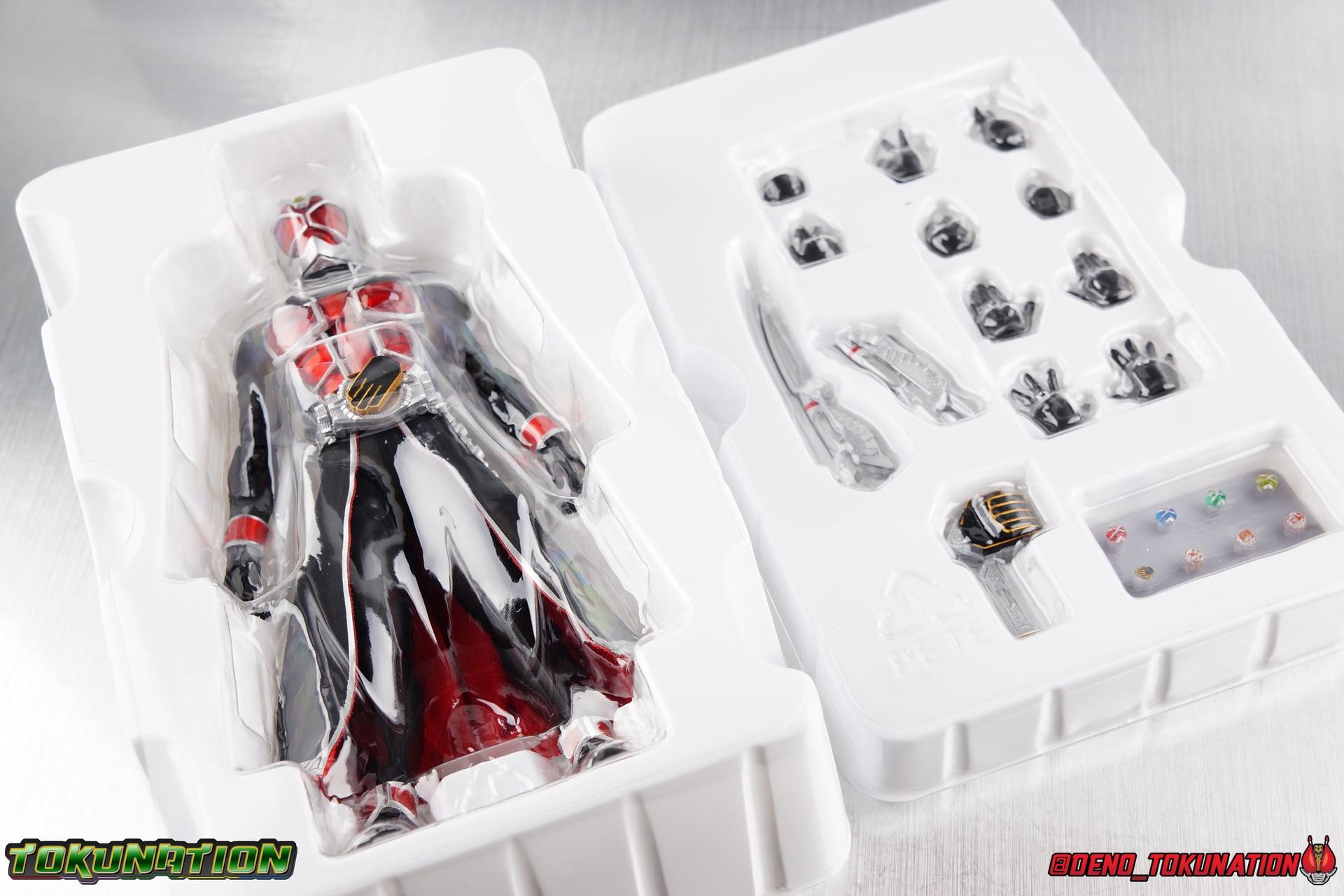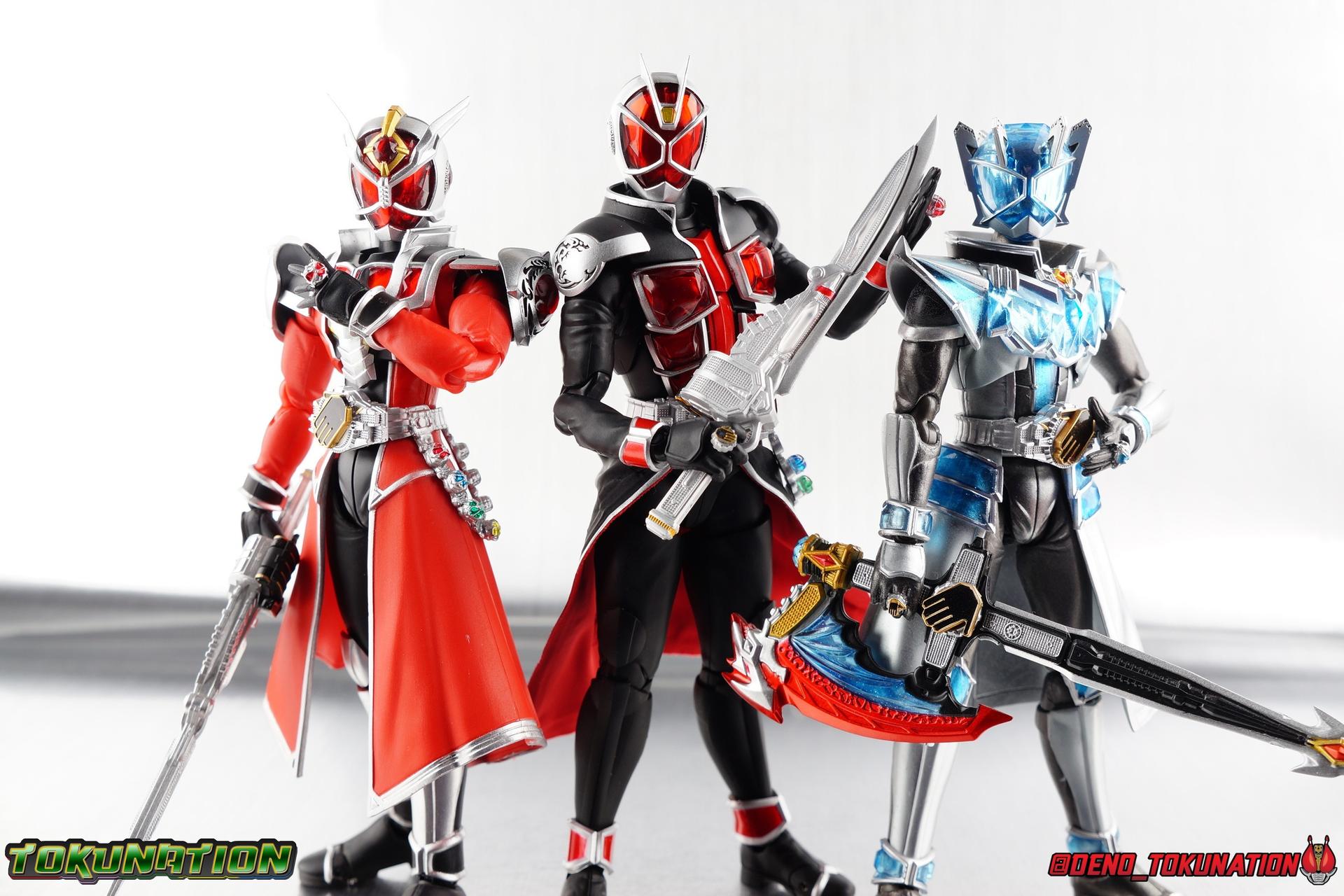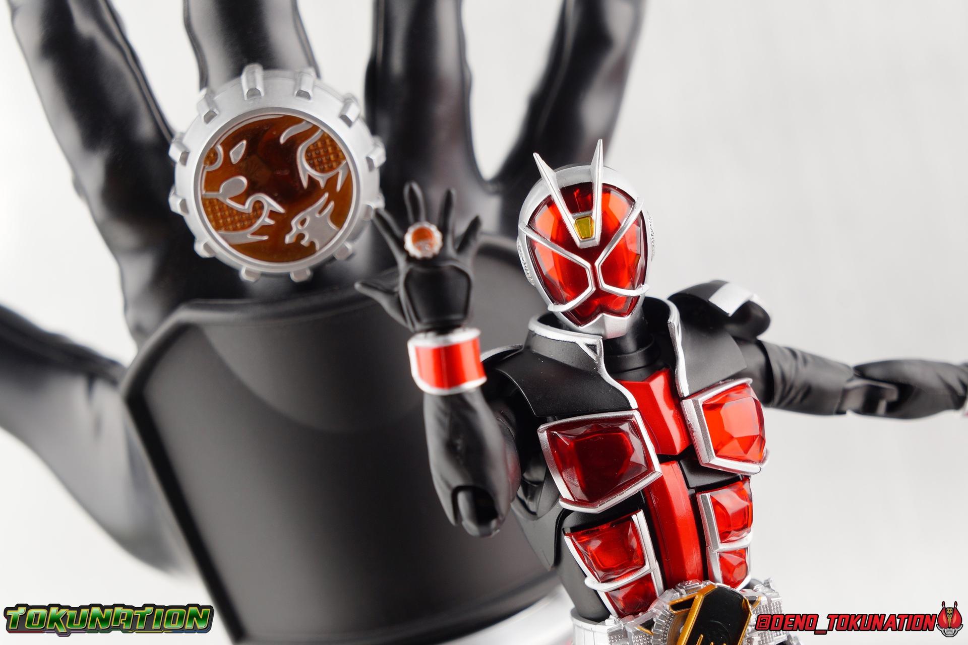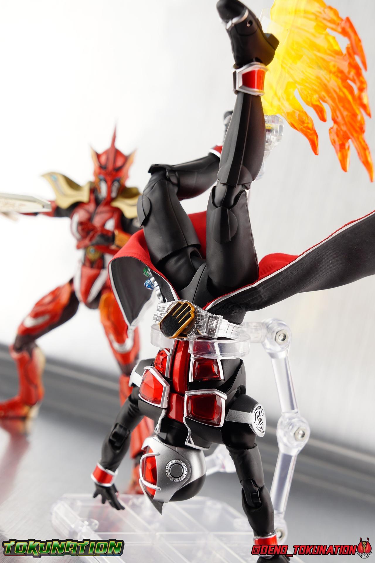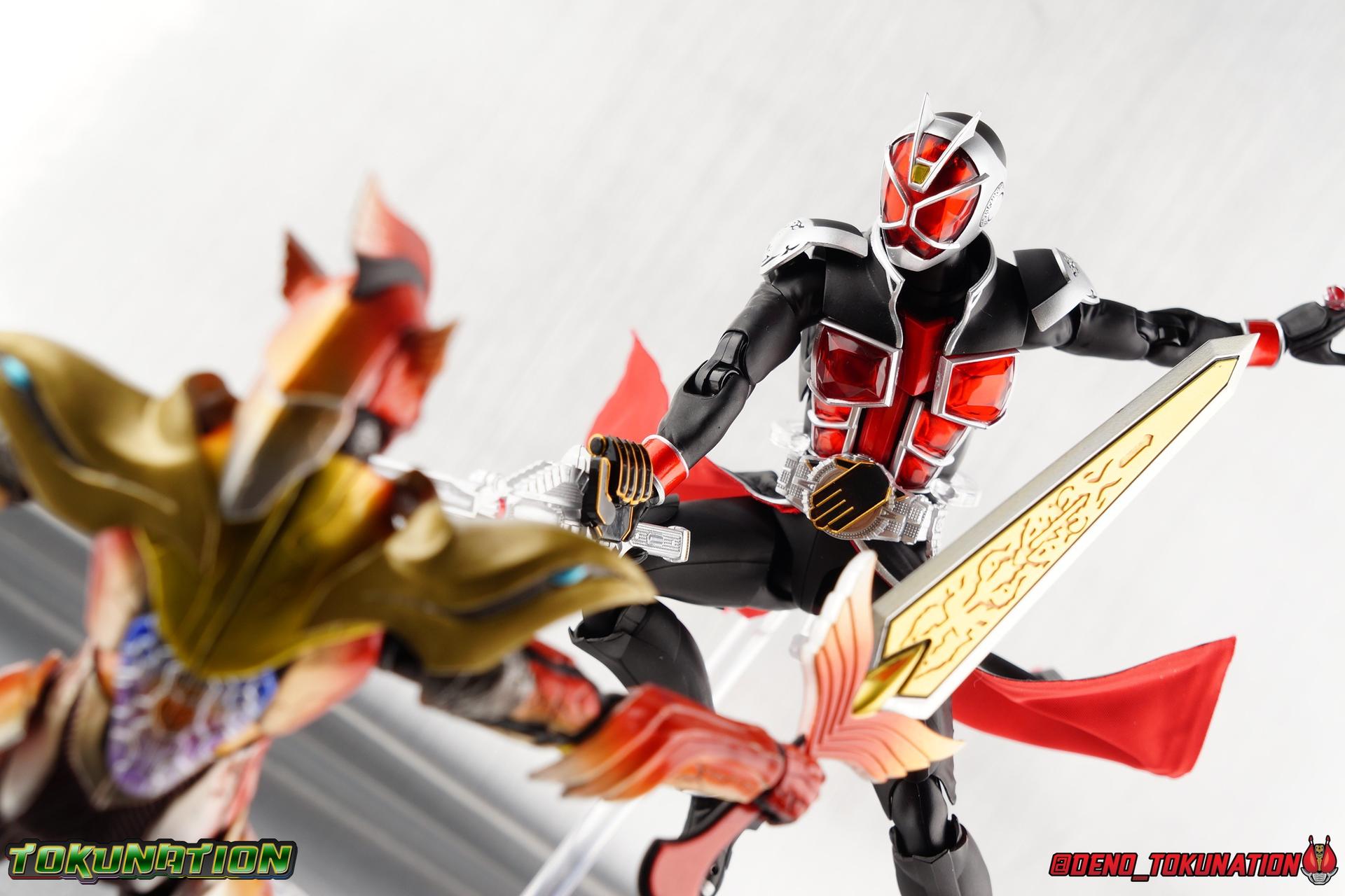 Haruto Soma was the only survivor of a dark Solar Eclipse ritual which saw the creation of a legion of monsters known as Phantoms. Assuming the likeness and identities of those humans they emerged from, Phantom's invade the world of humans and use magic to wreak havoc. Only one man can stop them, the one who faced despair head on in the light of the eclipse and emerged to gain the power of magic from his hope. Haruto Soma became Kamen Rider Wizard! Believe it or not, 2012-13 is the home of one of my favorite rider shows, Kamen Rider Wizard. The show gets derided often, but I've never felt that way about it. It was entertaining, had good music, a really enjoyable cast, some great twists along the way, and probably the most sensible and organic suit design and evolution of any series other than Kuuga. It's good stuff, and I've been waiting years for a new line of figures to properly represent it. Now that Shinkocchou Seihou has really taken off as a subline of premium renewals, and after having been shown off at multiple events leading up to it's release, Kamen Rider Wizard Flame Style has been reborn! ** This is a massive 100+ image gallery spread across the first 3 posts of this thread. Be sure to check it all out! Packaging The familiar Shinkocchou Seihou slip cover box makes another appearance! Not much can be said about it this time that hasn't been said before. It's gotten a bit stale (to me) over time but it's still a pleasing type of collector's box. Wizard features the now standard Bandai Spirits blue logo as well as the holofoil Tamashii Nations brand sticker. Main Figure Where to start? The original SHF Wizard has been spoken ill of for years. Essentially from the time it was released, pretty much forever. And rightfully so. Original Wizard was plagued by a number of issues including, a driver that perpetually fell off, incorrectly shaped and colored suit details, a stumpy torso, clown shoes, and just generally squashed and distorted proportions overall. Seihou Wizard goes above and beyond fixing every single one of these issues. For starters Seihou Wizard is a gorgeous figure, even statically posed. Just straight out the box standing upright, this thing looks gorgeous. This is a figure than looks like a suit on display at a Toei event. They've really and truly nailed this one. Looking at the figure, you can see that the legs are about the same length as the original, which is to say the original had a ridiculously short and stumpy torso. The Seihou's legs are thicker and more muscular over all, and are thankfully articulated much better. The hips now feature a thigh swivel, though one that's weirdly limited to roughly a quarter turn in either direction. In another course correction the new knee joint is designed so that the knee cap armor is above it, rather than the middle, giving the legs a more accurate look when posed. The feet and ankles have likewise been designed with full function in mind. The ankle tilts are far more free while the actual feet are no longer clown sized, Thanks to new toe bends they function better as well, and the details on the sole of the shoes has been fully sculpted and painted this time as well. Of course the biggest improvement of this entire release is the Wizard Robes. These are absolutely wonderful, and something that was sorely missing from literally every Wizard Figuart before this. And has sorely been missing from other recent releases like Kamen Rider Cronus. These new robes are actually two halves of fabric that are glued together with a poseable wire running along the entire contour. I will say that the edges of the fabric have some fraying to them that bothers me, but at this scale I think this has been done as well as possible. The wire allows the robes to be posed in really fantastic ways, making it look naturally windswept or tussled as necessary. I think the photos speak for themselves, these are the ideal way to recreate Wizard's Robes, and are far better than the rubbery plastic interchangeable bits the old one had. On the waist is of course the Wizard Driver, which I'm happy to report is fully functional. The sliding mechanism has been recreated so that when you simultaneously move the blocks on either side of the face, that the driver hand spins accordingly. The Ring Holder on the left hip is also quite the highlight. All of Wizard's standard Rings are included as separate accessories (which I'll detail further below) and can be plugged into the belt. Each time you change the ring on the corresponding hand, you can plug it safely and snugly into the holder for storage. The upper body is a real marvel as well. As you can see, the way it's designed is a total reversal of the original. Instead of a tiny ab section floating below a bulky chest, the entire torso is two more properly sized halves. The jewels lining the exterior of these pieces can slide up or down slightly, in particular those along the chest. Much like how Seihou Amazon & Kabuto have pectoral parts that move to accommodate the rest of the way the body moves. The entire assembly adds up to a way more useful and functional figure than we ever had before. As with everything else, the arms are far superior to what came before them. A bit longer and more evenly proportioned to the main body, Wizard's arms feature a bicep swivel as well as a far better elbow joint that allows you to bring the arm in right up against the body. The sculpted in fabric style detailing is also done a bit differently this time, and makes things look much more natural than before. The only odd thing I can say about them, is that Wizard does not come with close fists attached. In fact, he only come with one closed (right) fist at all. The standard hands he has out of box are relaxed open hands. That's just a new thing, Figuarts pretty much always come with closed fists attached so that was a bit strange. No matter what hands you're using with Wizard, every single one of them has a small peg hole t