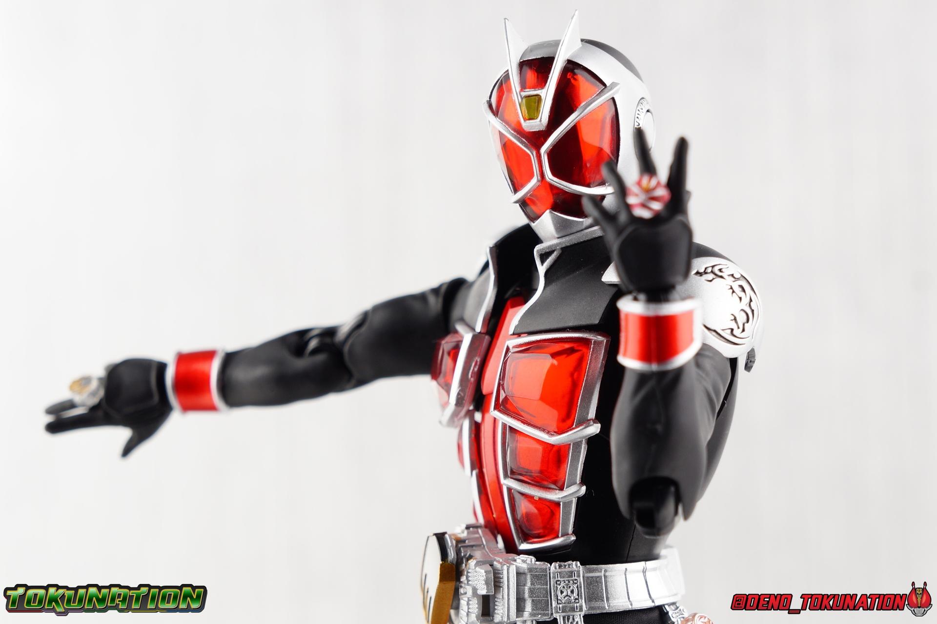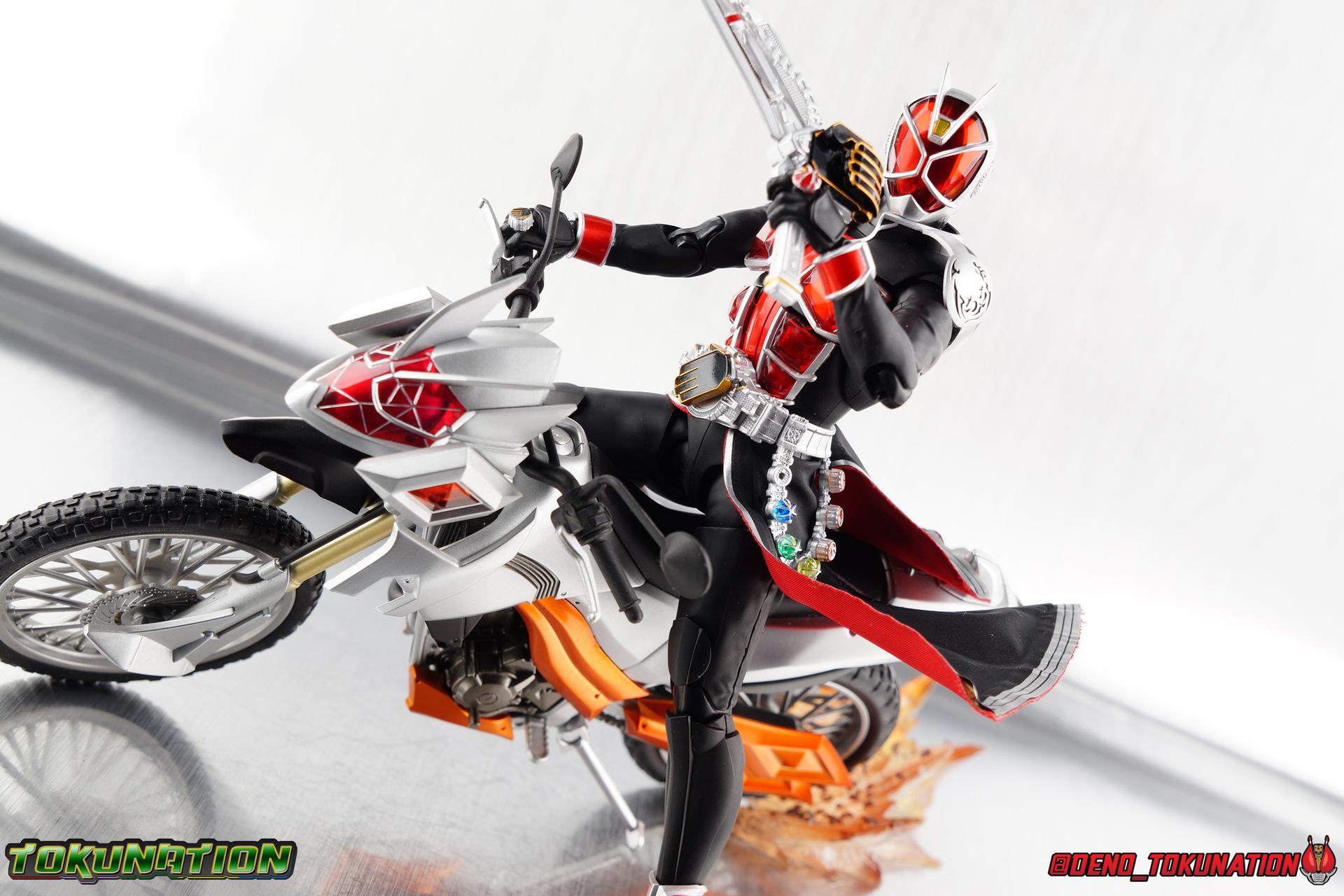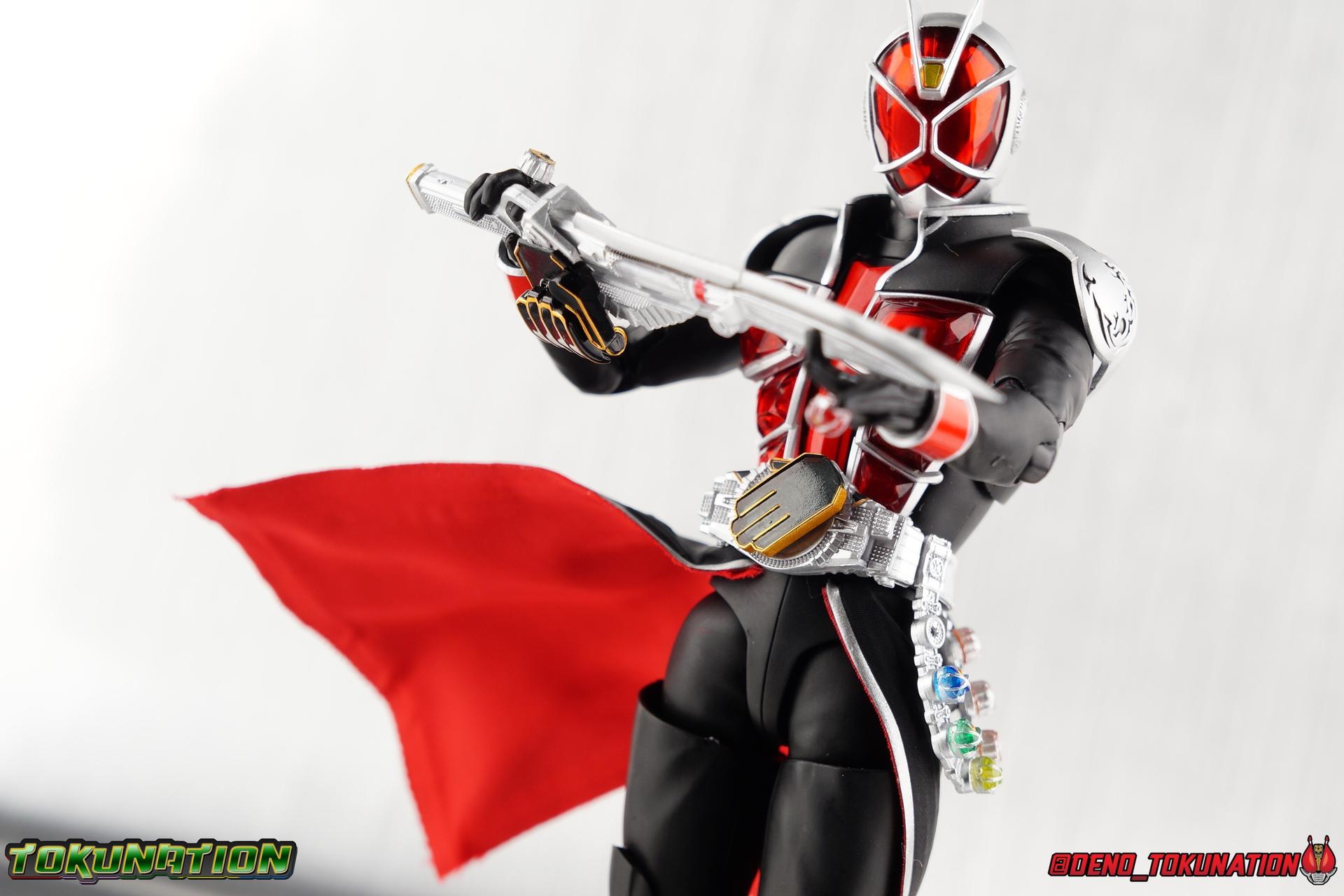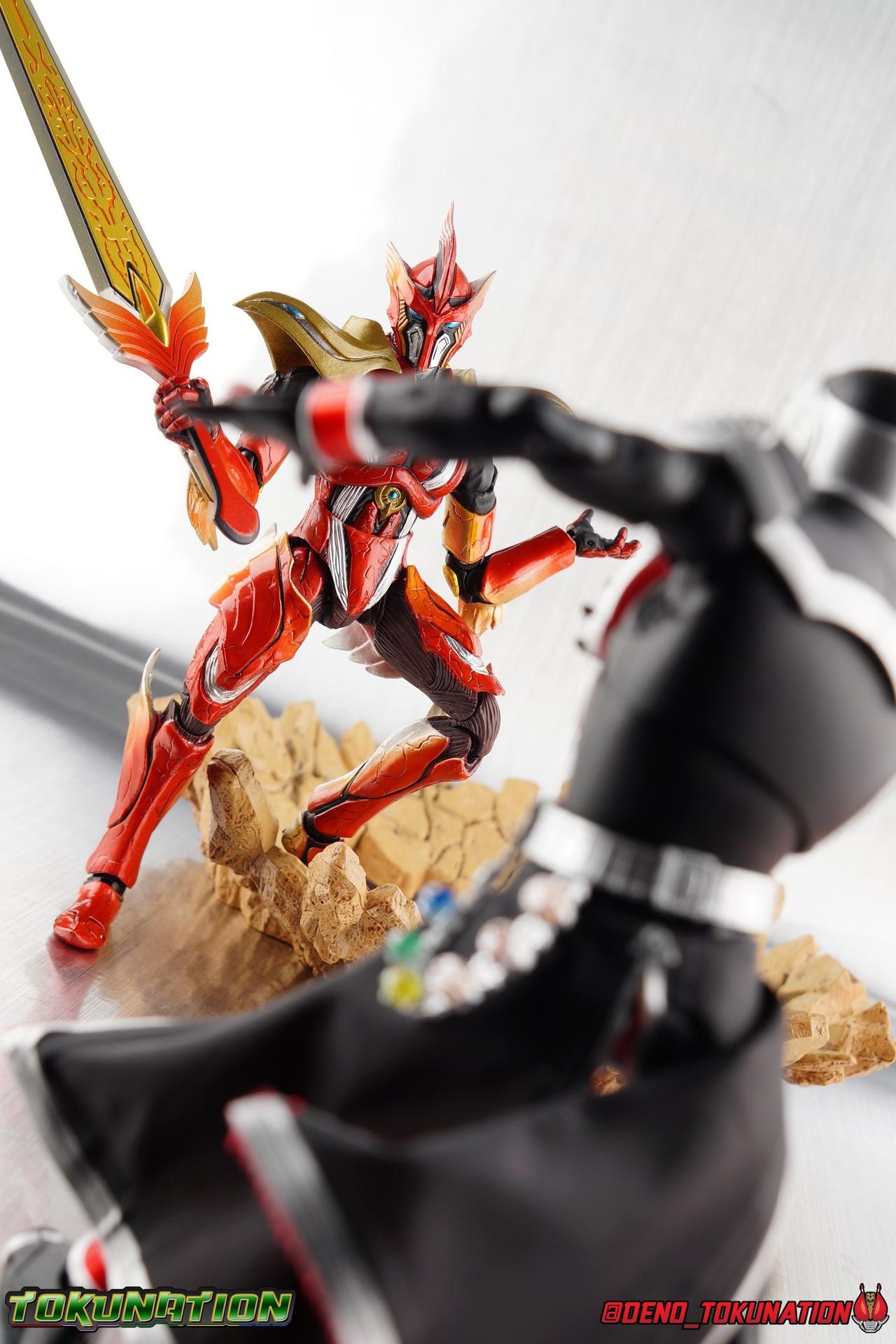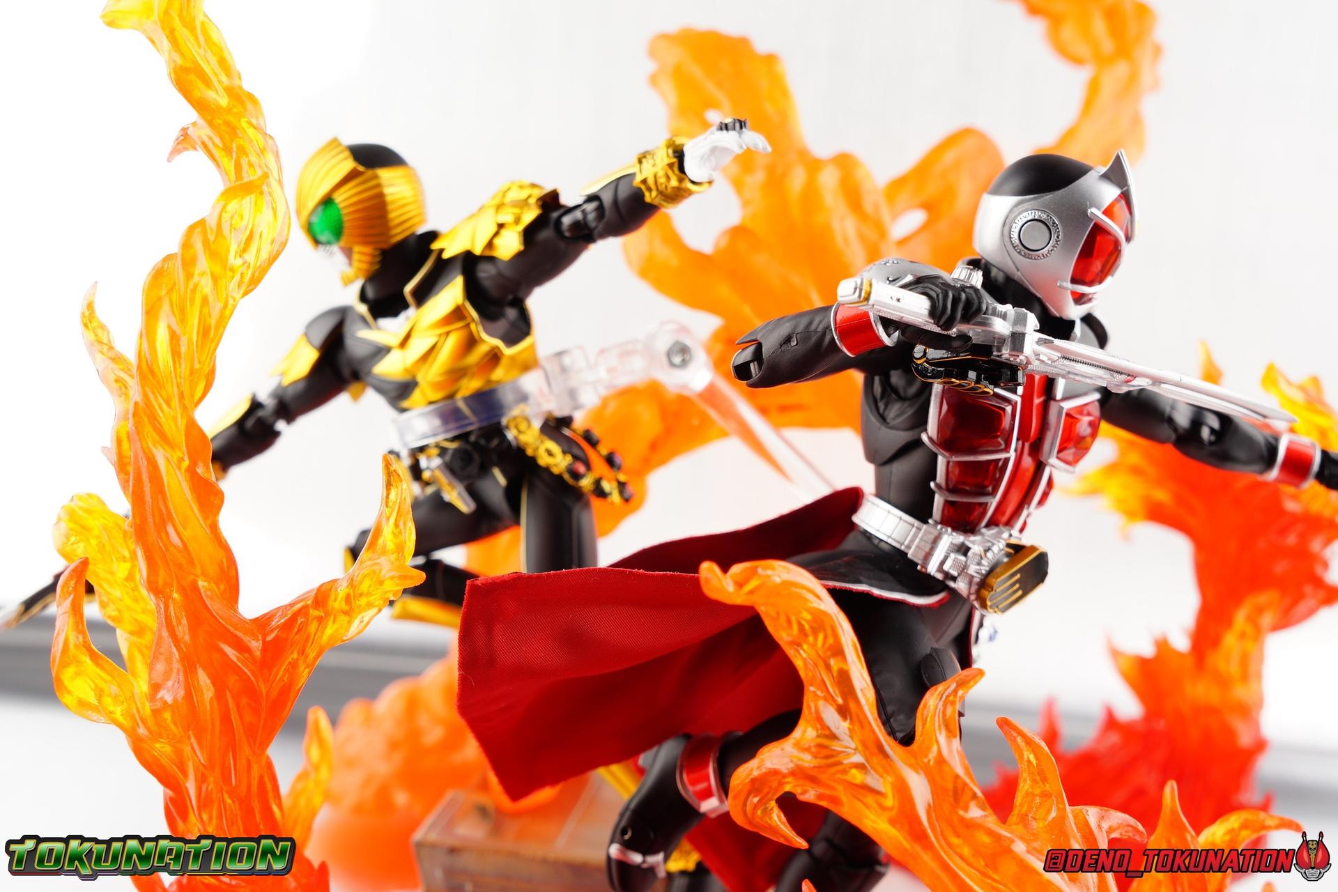 Haruto Soma was the only survivor of a dark Solar Eclipse ritual which saw the creation of a legion of monsters known as Phantoms. Assuming the likeness and identities of those humans they emerged from, Phantom's invade the world of humans and use magic to wreak havoc. Only one man can stop them, the one who faced despair head on in the light of the eclipse and emerged to gain the power of magic from his hope. Haruto Soma became Kamen Rider Wizard! Believe it or not, 2012-13 is the home of one of my favorite rider shows, Kamen Rider Wizard. The show gets derided often, but I've never felt that way about it. It was entertaining, had good music, a really enjoyable cast, some great twists along the way, and probably the most sensible and organic suit design and evolution of any series other than Kuuga. It's good stuff, and I've been waiting years for a new line of figures to properly represent it. Now that Shinkocchou Seihou has really taken off as a subline of premium renewals, and after having been shown off at multiple events leading up to it's release, Kamen Rider Wizard Flame Style has been reborn! ** This is a massive 100+ image gallery spread across the first 3 posts of this thread. Be sure to check it all out! Packaging The familiar Shinkocchou Seihou slip cover box makes another appearance! Not much can be said about it this time that hasn't been said before. It's gotten a bit stale (to me) over time but it's still a pleasing type of collector's box. Wizard features the now standard Bandai Spirits blue logo as well as the holofoil Tamashii Nations brand sticker. Main Figure Where to start? The original SHF Wizard has been spoken ill of for years. Essentially from the time it was released, pretty much forever. And rightfully so. Original Wizard was plagued by a number of issues including, a driver that perpetually fell off, incorrectly shaped and colored suit details, a stumpy torso, clown shoes, and just generally squashed and distorted proportions overall. Seihou Wizard goes above and beyond fixing every single one of these issues. For starters Seihou Wizard is a gorgeous figure, even statically posed. Just straight out the box standing upright, this thing looks gorgeous. This is a figure than looks like a suit on display at a Toei event. They've really and truly nailed this one. Looking at the figure, you can see that the legs are about the same length as the original, which is to say the original had a ridiculously short and stumpy torso. The Seihou's legs are thicker and more muscular over all, and are thankfully articulated much better. The hips now feature a thigh swivel, though one that's weirdly limited to roughly a quarter turn in either direction. In another course correction the new knee joint is designed so that the knee cap armor is above it, rather than the middle, giving the legs a more accurate look when posed. The feet and ankles have likewise been designed with full function in mind. The ankle tilts are far more free while the actual feet are no longer clown sized, Thanks to new toe bends they function better as well, and the details on the sole of the shoes has been fully sculpted and painted this time as well. Of course the biggest improvement of this entire release is the Wizard Robes. These are absolutely wonderful, and something that was sorely missing from literally every Wizard Figuart before this. And has sorely been missing from other recent releases like Kamen Rider Cronus. These new robes are actually two halves of fabric that are glued together with a poseable wire running along the entire contour. I will say that the edges of the fabric have some fraying to them that bothers me, but at this scale I think this has been done as well as possible. The wire allows the robes to be posed in really fantastic ways, making it look naturally windswept or tussled as necessary. I think the photos speak for themselves, these are the ideal way to recreate Wizard's Robes, and are far better than the rubbery plastic interchangeable bits the old one had. On the waist is of course the Wizard Driver, which I'm happy to report is fully functional. The sliding mechanism has been recreated so that when you simultaneously move the blocks on either side of the face, that the driver hand spins accordingly. The Ring Holder on the left hip is also quite the highlight. All of Wizard's standard Rings are included as separate accessories (which I'll detail further below) and can be plugged into the belt. Each time you change the ring on the corresponding hand, you can plug it safely and snugly into the holder for storage. The upper body is a real marvel as well. As you can see, the way it's designed is a total reversal of the original. Instead of a tiny ab section floating below a bulky chest, the entire torso is two more properly sized halves. The jewels lining the exterior of these pieces can slide up or down slightly, in particular those along the chest. Much like how Seihou Amazon & Kabuto have pectoral parts that move to accommodate the rest of the way the body moves. The entire assembly adds up to a way more useful and functional figure than we ever had before. As with everything else, the arms are far superior to what came before them. A bit longer and more evenly proportioned to the main body, Wizard's arms feature a bicep swivel as well as a far better elbow joint that allows you to bring the arm in right up against the body. The sculpted in fabric style detailing is also done a bit differently this time, and makes things look much more natural than before. The only odd thing I can say about them, is that Wizard does not come with close fists attached. In fact, he only come with one closed (right) fist at all. The standard hands he has out of box are relaxed open hands. That's just a new thing, Figuarts pretty much always come with closed fists attached so that was a bit strange. No matter what hands you're using with Wizard, every single one of them has a small peg hole t