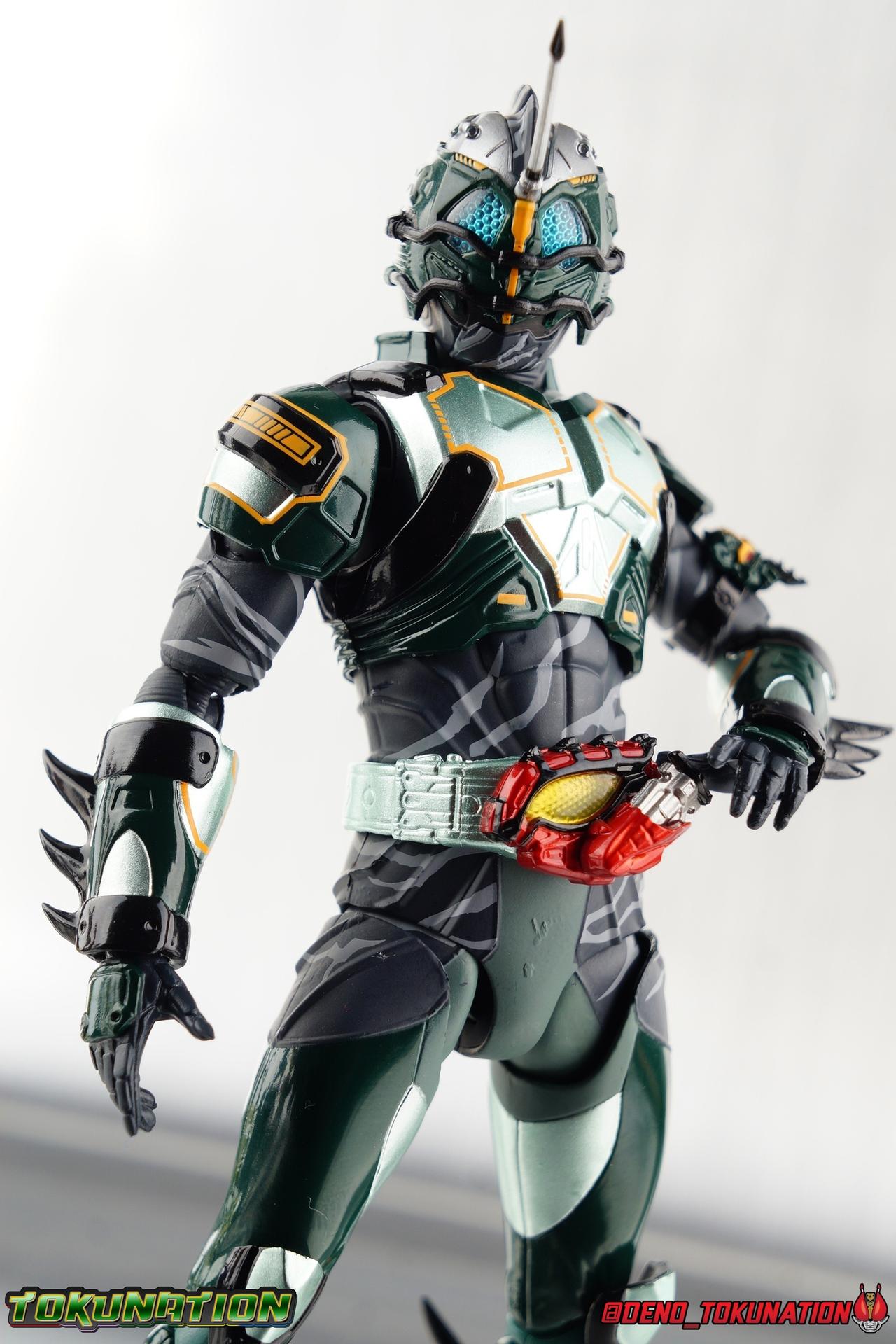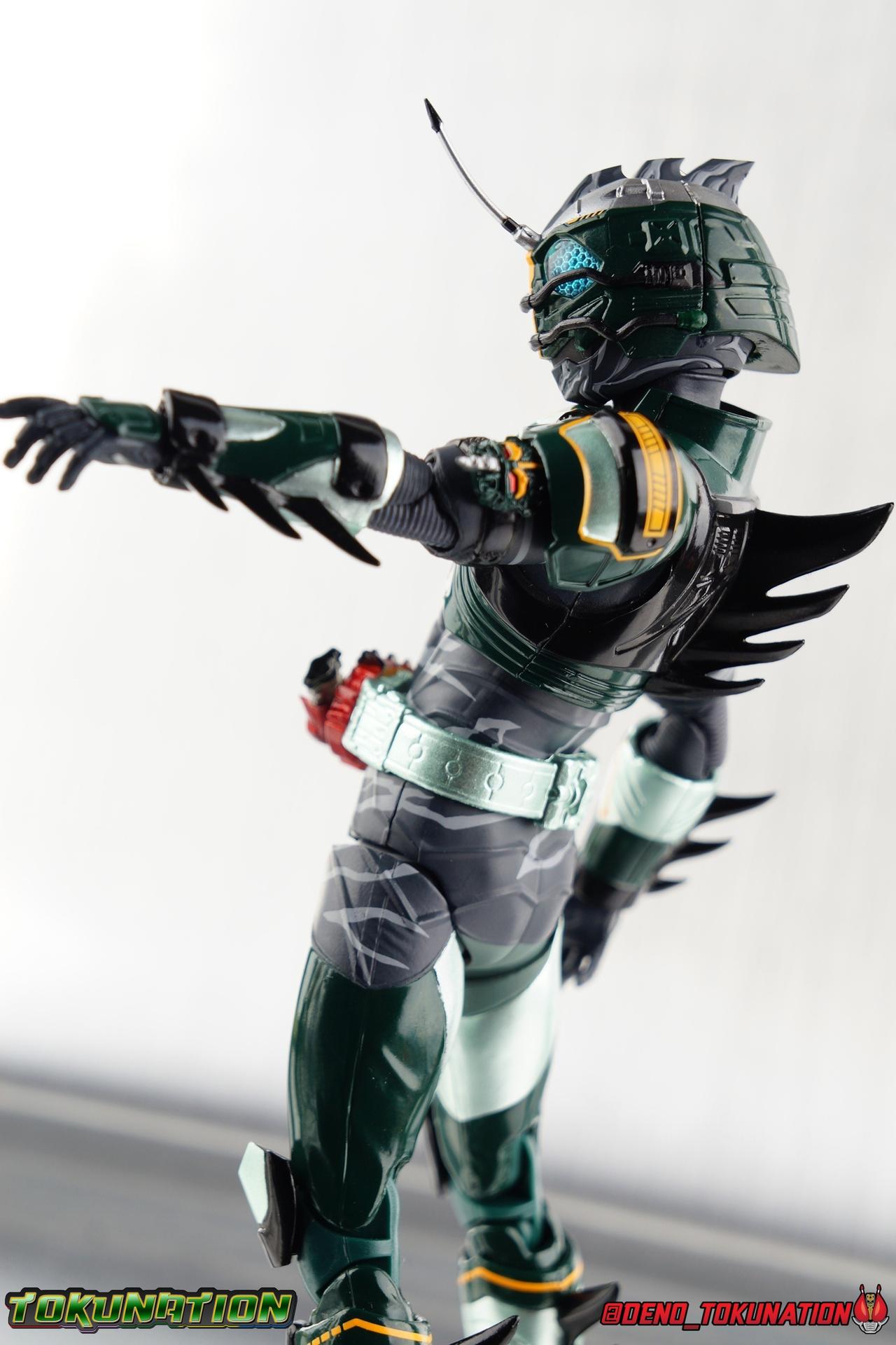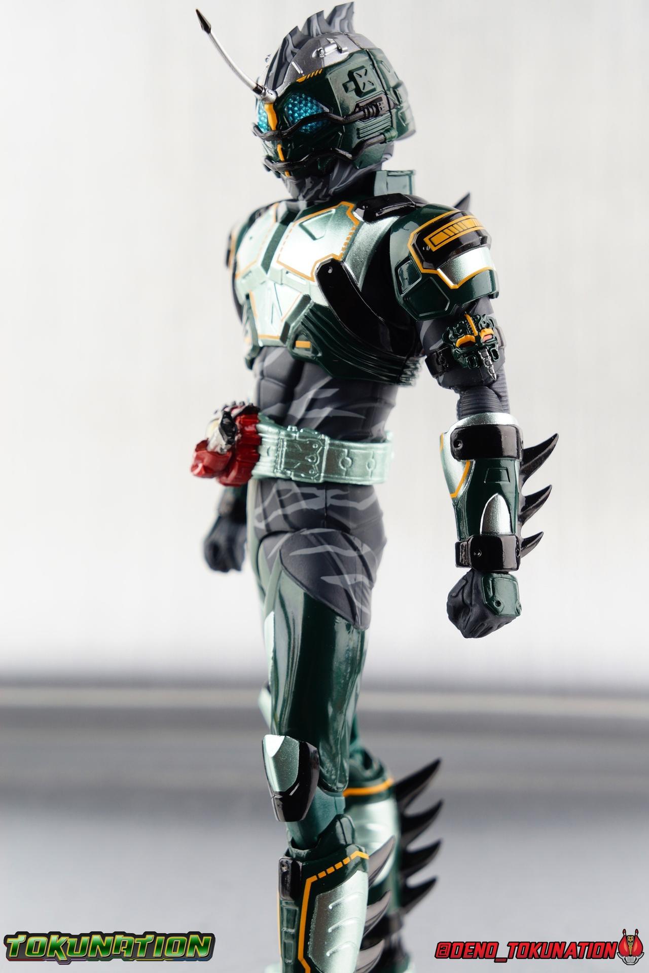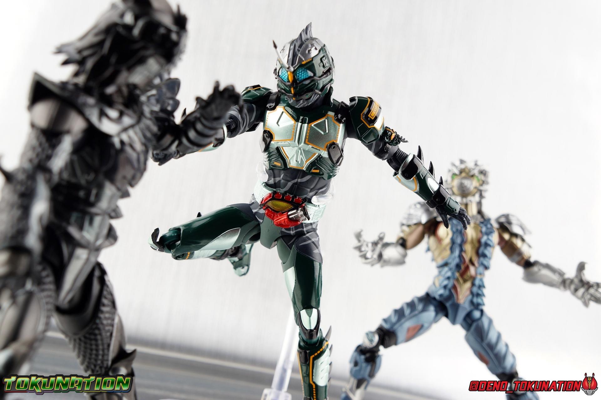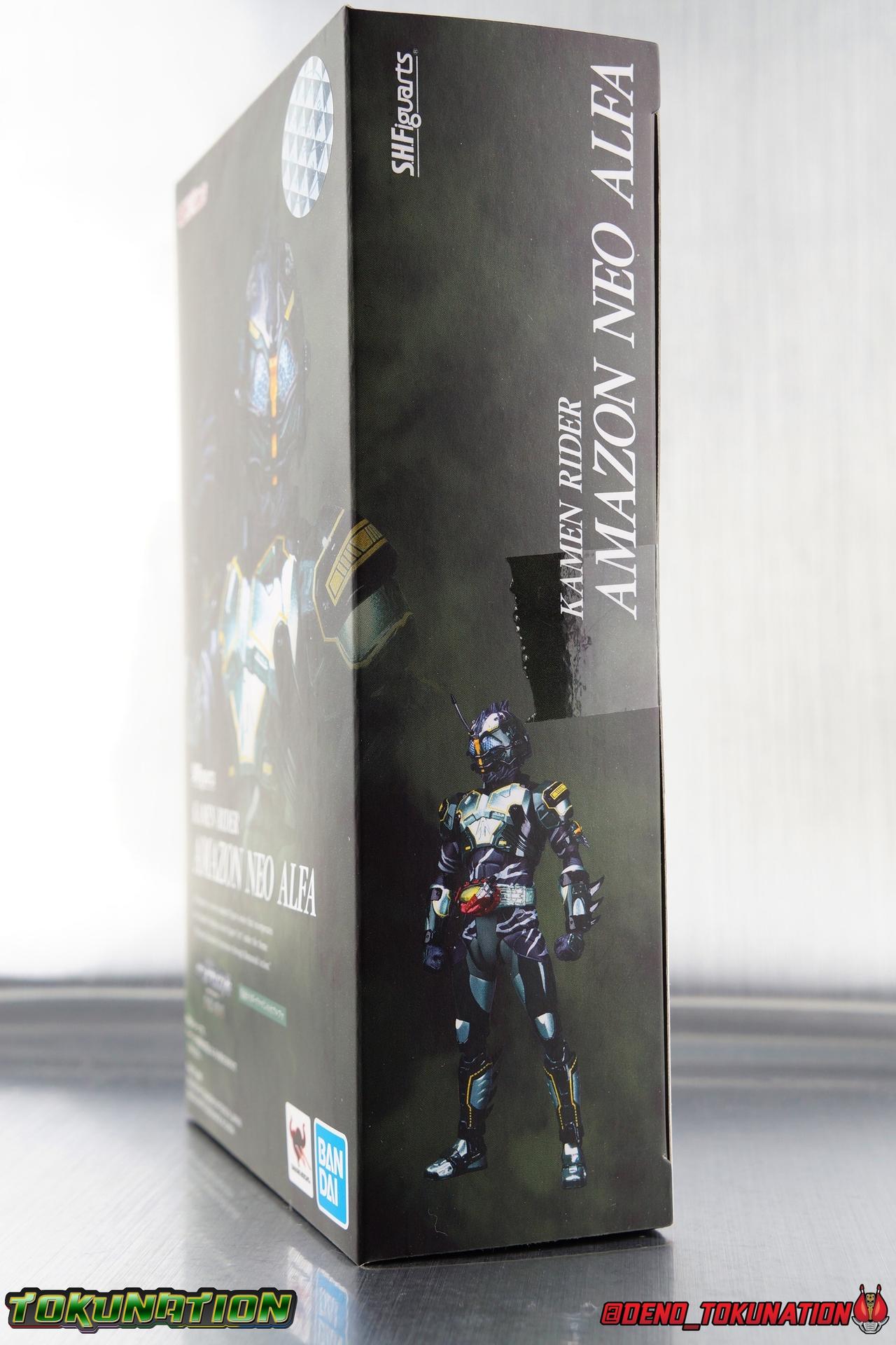 ** Spoilers for Amazons The Last Judgement abound in this review. Read at your own risk! Two years on from Neo's death, Omega is hunted. Haruka and Mizuki have barely escaped 4C when they cross paths with an unusual home for children and a man named Midou. Little do they know, this place is merely a buffet, but not for Amazons. For humans. A new terrifying iteration of the Sigma Project has been undertaken, and the discovery of what keeps it going, will shake Haruka to his core. As the hunters become the hunted, the man named Midou proclaims himself Neo Alpha, the one to surpass Jin Takayama and the original madness of the Amazon Cells. Packaging Just as the Amazons that preceded him, Neo Alpha comes in a pretty dark box with some great stock photos. Alpha's color scheme is pretty dark as well however so everything tends to blend together a lot unfortunately. As with regular Alpha, the name is spelled as "Alfa" on the box. In Jin/Alpha's case the name Alpha is relative to Haruka's Omega. Midou sees himself as the better version of Jin, hence his self naming as Neo Alpha. Regardless, it should be "Alpha" not "Alfa". It's just a bad romanization. Main Figure The end is nigh for the creatures known as Amazons. And sadly, it would seem the same can be said for their figuarts as well. As of the writing of this review, no further Amazons figures have been confirmed for release. In fact the only displayed prototypes seen since the dual reveal of Crow Amazon & Neo Alpha, were the Last Judgement Ver. Alpha & Omega. Neither of which have been seen for some time. So it's fitting that Neo Alpha ends the line as it currently stands, especially considering his well, violent, death. You're probably familiar with this figure already, that is if you own Amazon Neo. Neo was absolutely one of my favorite release in the Amazons line. It was a really great mold that changed things up from previous releases, and it helped that the design deviated to a more armored & cybernetic look. I also enjoyed how elements of the design were borrowed for New Omega. Neo Alpha takes the Neo mold and really militarizes the design. Which in the context of the film's story, makes so much sense when you think about the job Midou is tasked with. In the same way that Neo was decked out in some gorgeous metallic blue and brushed silver, a color scheme that really sold me on the figure, Neo Alpha sells me so hard with the finer details of the paint scheme. Using quite a few more paint applications than usual, Neo Alpha features 4 distinct shades of green both metallic and glossy. There's some bright yellow pin-striping that really offsets the varying greens and glossy blacks nicely as well. The best details however are the alternating gray camo stripes that cover the abdomen hips and arms. These bits are patterned the same way as Neo's red and blue, but the subtlety of the grays really works well with the various greens and yellows of the suit. The various Alpha & Omega releases, and to a lesser extent Sigma as well as Mole & Crow all had faults that irked me. But the Neo mold was a real winner to me. Unlike the others, most of the articulation is solidly intact with this design. Despite the bulk of the armor carried over to Neo Alpha, the figure is very free to move. The ankles are unobstructed so you can get nice solid balance from them. Their forward motion is limited only by the bottom of the shin armor, but not terribly so. The knees are really perfect. Unlike with Omega where the leg fins limited the legs to 90 degree angles, Neo Alpha is free to move because the shin armor can rotate the fins away from the back of the leg. I'm still not super in love with the drop down hips the two Neo's feature, but they aren't a huge detractor in their cases. Now this is a really odd thing for this figure, but more so the character in the film. Neo Alpha has the Neo Amazons Driver attached to his belt, with an Ampule molded into it just like New Omega & Neo. However, in The Last Judgement, Midou only uses his unique Amazons Register attached to the left arm to transform. In much the same way that Iyu/Crow did. Only using the driver to summon his weapon arm. I can only assume a Driver was incorporated into his design simply as a way to set him apart from standard Amazons and make him a rider like the other 4, and I can get that. But he's already a remold of the Neo suit in both mediums, so the Driver was unnecessary to communicate his rider-ness. It's just weird. The upper body is engineered in such a way that it allows you to arch the back up and lean him forward for really savage and animal like poses, though it does expose a gap on his back side when done. The arms are free of most obstruction thanks to some great shoulder pad design, swivel biceps, and rotating forearm guards. My only real gripe with the arms is that the fist pegs are a little tight, and the hands a little difficult to exchange, mostly on the left arm which features the unique Militant Amazons Register. Amazon Neo Alpha does however deviate from the original Neo in one big way, the head. Taking inspiration for this design from a monitor lizard, Neo Alpha has a much more elongated and pronounced head than his predecessor. The new sort of bucket style head features really pretty blue compound eyes, a first for Amazons, and also has some admittedly oddly placed face guards that seem to emulate a football helmet a bit. The most striking piece of the helmet is the very elongated and fragile horn. The figure is packaged sideways in box because of it. So just be careful. As you can see I've assembled all of the Amazons together in this gallery for a big family photo and some comparisons. There's a shot in there as well where you'll notice a silver Amazon Neo as well. Don't let me deceive you, that's not an official figure. It's a custom Amazon Neo Sigma that was made by @Gigabeetle and made it's way to me. I just wanted to give him a brief little spotlight because Neo Sigma is