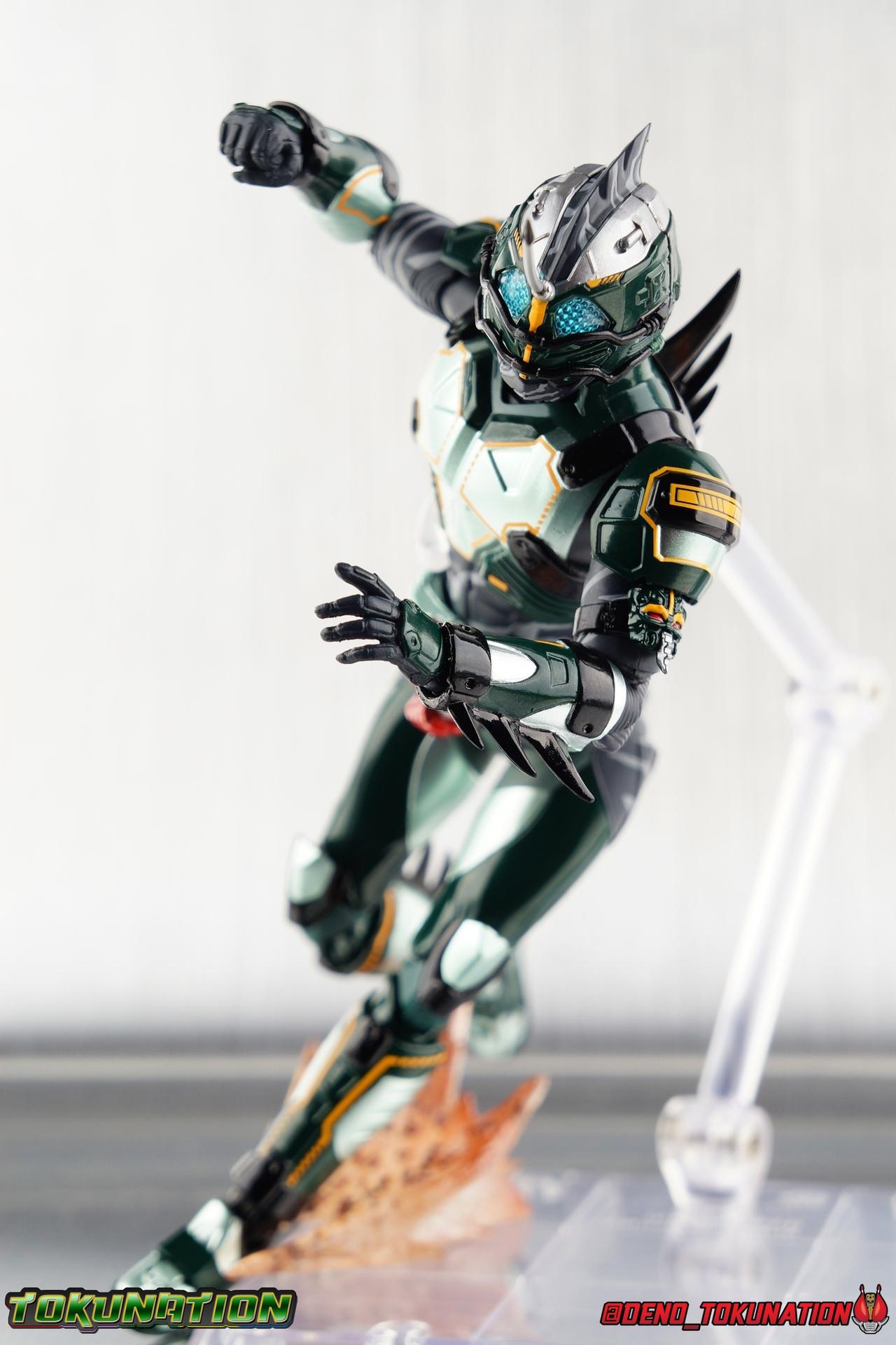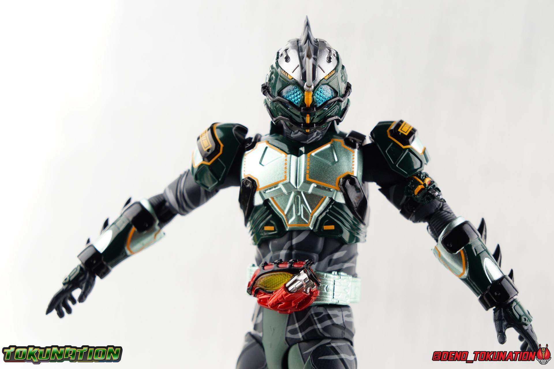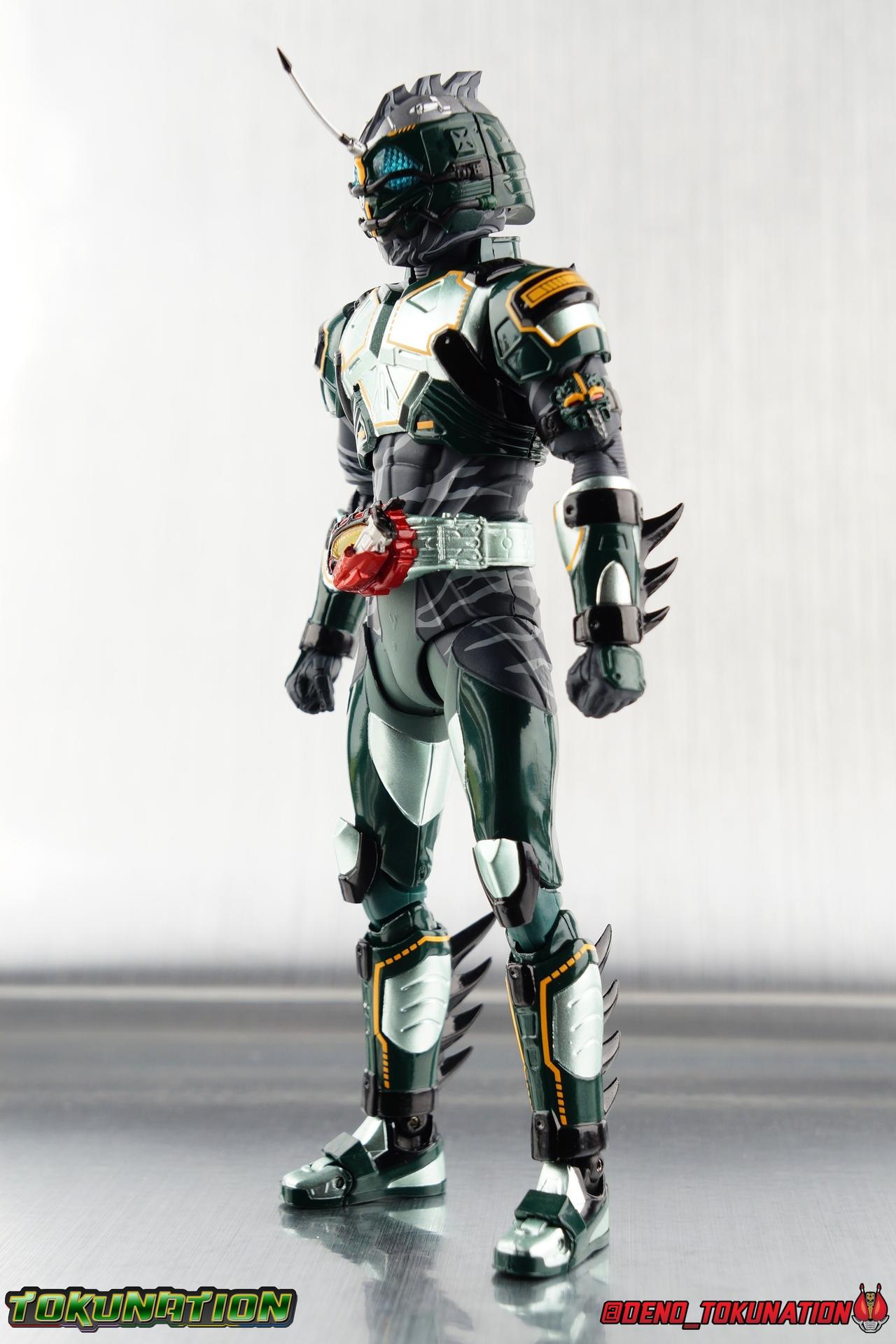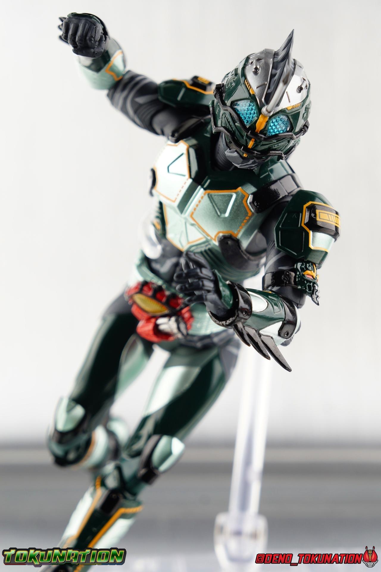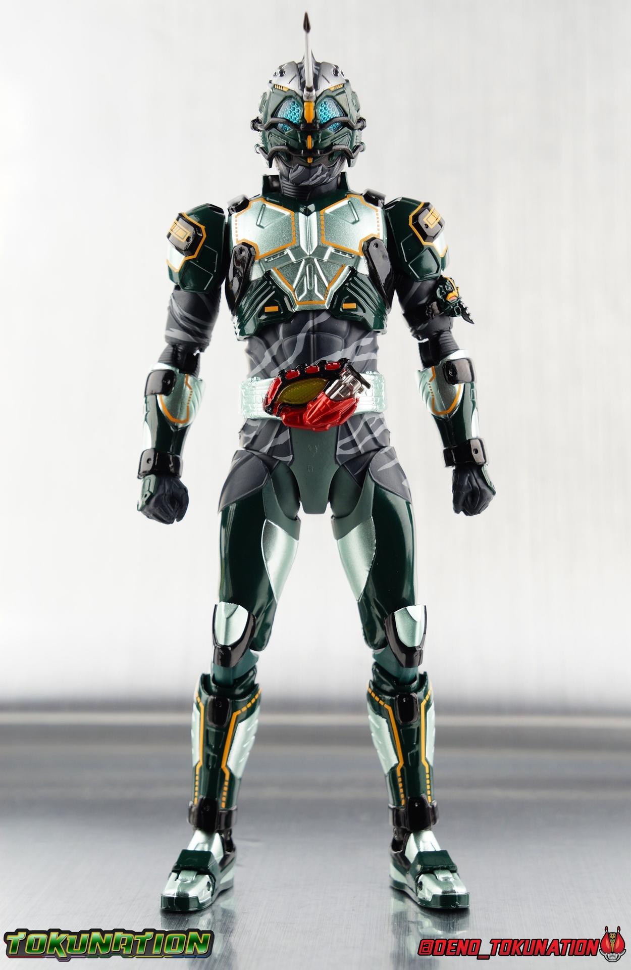 ** Spoilers for Amazons The Last Judgement abound in this review. Read at your own risk! Two years on from Neo's death, Omega is hunted. Haruka and Mizuki have barely escaped 4C when they cross paths with an unusual home for children and a man named Midou. Little do they know, this place is merely a buffet, but not for Amazons. For humans. A new terrifying iteration of the Sigma Project has been undertaken, and the discovery of what keeps it going, will shake Haruka to his core. As the hunters become the hunted, the man named Midou proclaims himself Neo Alpha, the one to surpass Jin Takayama and the original madness of the Amazon Cells. Packaging Just as the Amazons that preceded him, Neo Alpha comes in a pretty dark box with some great stock photos. Alpha's color scheme is pretty dark as well however so everything tends to blend together a lot unfortunately. As with regular Alpha, the name is spelled as "Alfa" on the box. In Jin/Alpha's case the name Alpha is relative to Haruka's Omega. Midou sees himself as the better version of Jin, hence his self naming as Neo Alpha. Regardless, it should be "Alpha" not "Alfa". It's just a bad romanization. Main Figure The end is nigh for the creatures known as Amazons. And sadly, it would seem the same can be said for their figuarts as well. As of the writing of this review, no further Amazons figures have been confirmed for release. In fact the only displayed prototypes seen since the dual reveal of Crow Amazon & Neo Alpha, were the Last Judgement Ver. Alpha & Omega. Neither of which have been seen for some time. So it's fitting that Neo Alpha ends the line as it currently stands, especially considering his well, violent, death. You're probably familiar with this figure already, that is if you own Amazon Neo. Neo was absolutely one of my favorite release in the Amazons line. It was a really great mold that changed things up from previous releases, and it helped that the design deviated to a more armored & cybernetic look. I also enjoyed how elements of the design were borrowed for New Omega. Neo Alpha takes the Neo mold and really militarizes the design. Which in the context of the film's story, makes so much sense when you think about the job Midou is tasked with. In the same way that Neo was decked out in some gorgeous metallic blue and brushed silver, a color scheme that really sold me on the figure, Neo Alpha sells me so hard with the finer details of the paint scheme. Using quite a few more paint applications than usual, Neo Alpha features 4 distinct shades of green both metallic and glossy. There's some bright yellow pin-striping that really offsets the varying greens and glossy blacks nicely as well. The best details however are the alternating gray camo stripes that cover the abdomen hips and arms. These bits are patterned the same way as Neo's red and blue, but the subtlety of the grays really works well with the various greens and yellows of the suit. The various Alpha & Omega releases, and to a lesser extent Sigma as well as Mole & Crow all had faults that irked me. But the Neo mold was a real winner to me. Unlike the others, most of the articulation is solidly intact with this design. Despite the bulk of the armor carried over to Neo Alpha, the figure is very free to move. The ankles are unobstructed so you can get nice solid balance from them. Their forward motion is limited only by the bottom of the shin armor, but not terribly so. The knees are really perfect. Unlike with Omega where the leg fins limited the legs to 90 degree angles, Neo Alpha is free to move because the shin armor can rotate the fins away from the back of the leg. I'm still not super in love with the drop down hips the two Neo's feature, but they aren't a huge detractor in their cases. Now this is a really odd thing for this figure, but more so the character in the film. Neo Alpha has the Neo Amazons Driver attached to his belt, with an Ampule molded into it just like New Omega & Neo. However, in The Last Judgement, Midou only uses his unique Amazons Register attached to the left arm to transform. In much the same way that Iyu/Crow did. Only using the driver to summon his weapon arm. I can only assume a Driver was incorporated into his design simply as a way to set him apart from standard Amazons and make him a rider like the other 4, and I can get that. But he's already a remold of the Neo suit in both mediums, so the Driver was unnecessary to communicate his rider-ness. It's just weird. The upper body is engineered in such a way that it allows you to arch the back up and lean him forward for really savage and animal like poses, though it does expose a gap on his back side when done. The arms are free of most obstruction thanks to some great shoulder pad design, swivel biceps, and rotating forearm guards. My only real gripe with the arms is that the fist pegs are a little tight, and the hands a little difficult to exchange, mostly on the left arm which features the unique Militant Amazons Register. Amazon Neo Alpha does however deviate from the original Neo in one big way, the head. Taking inspiration for this design from a monitor lizard, Neo Alpha has a much more elongated and pronounced head than his predecessor. The new sort of bucket style head features really pretty blue compound eyes, a first for Amazons, and also has some admittedly oddly placed face guards that seem to emulate a football helmet a bit. The most striking piece of the helmet is the very elongated and fragile horn. The figure is packaged sideways in box because of it. So just be careful. As you can see I've assembled all of the Amazons together in this gallery for a big family photo and some comparisons. There's a shot in there as well where you'll notice a silver Amazon Neo as well. Don't let me deceive you, that's not an official figure. It's a custom Amazon Neo Sigma that was made by @Gigabeetle and made it's way to me. I just wanted to give him a brief little spotlight because Neo Sigma is