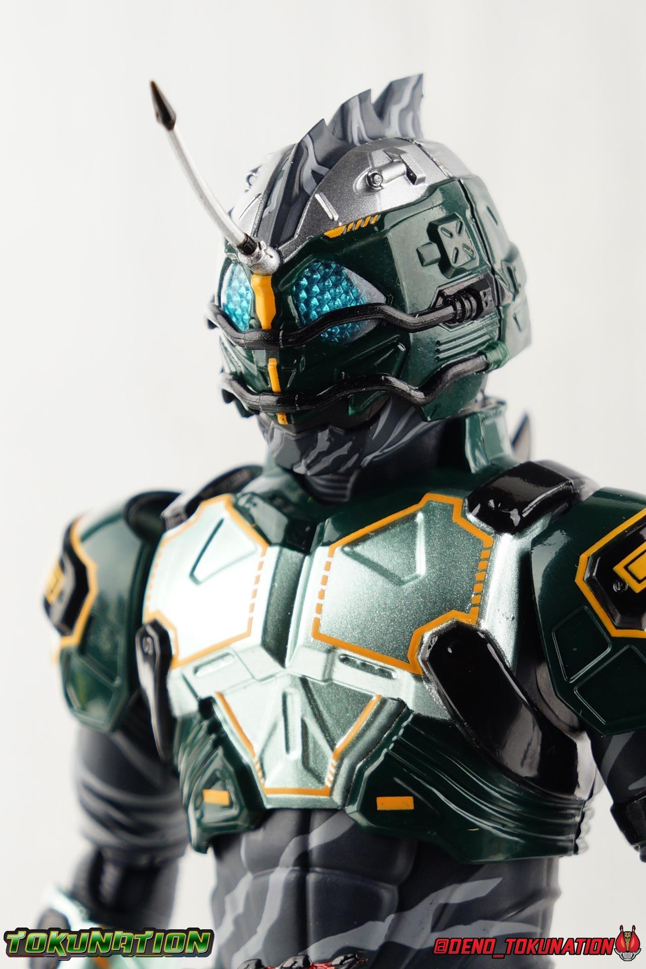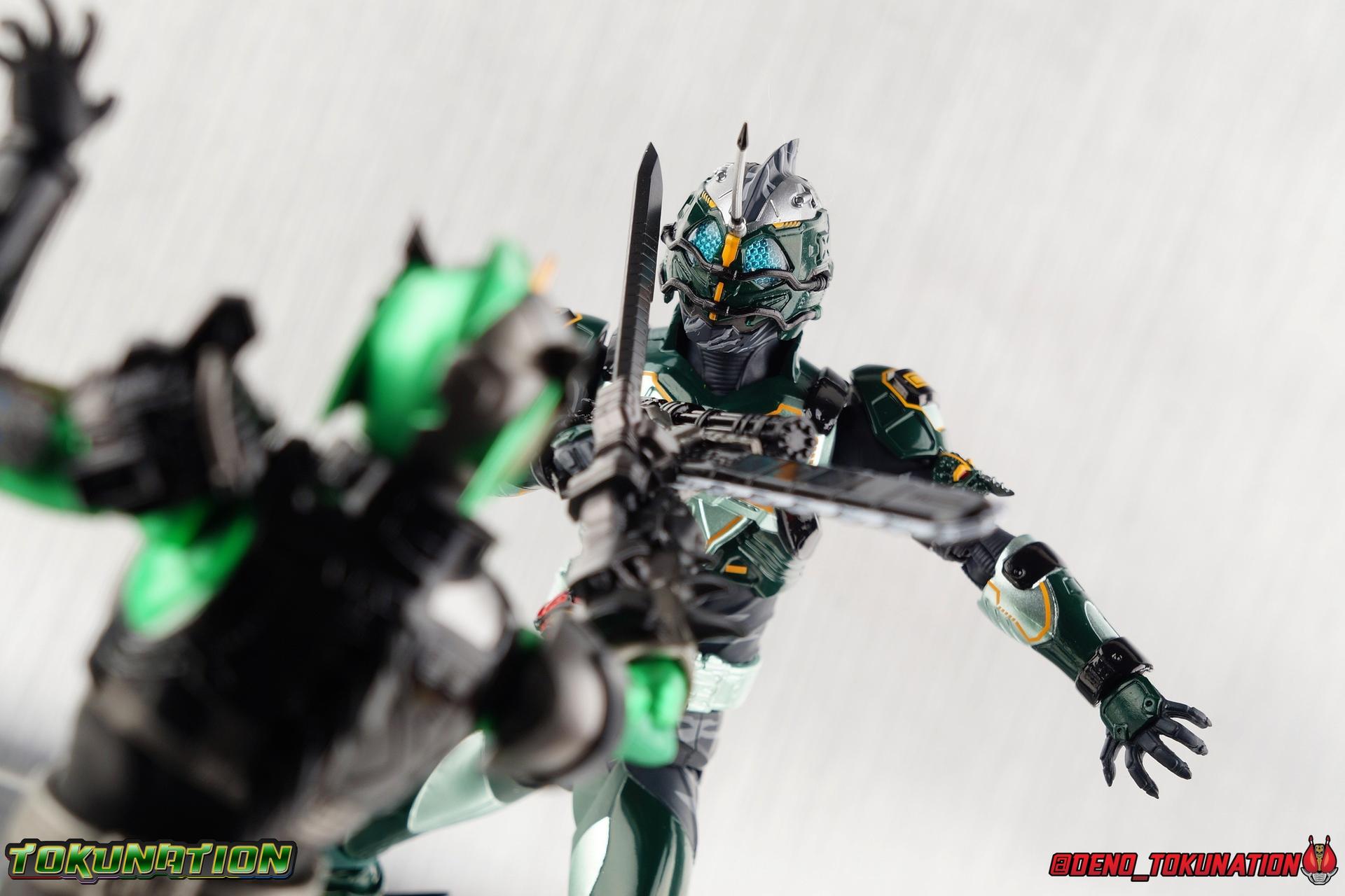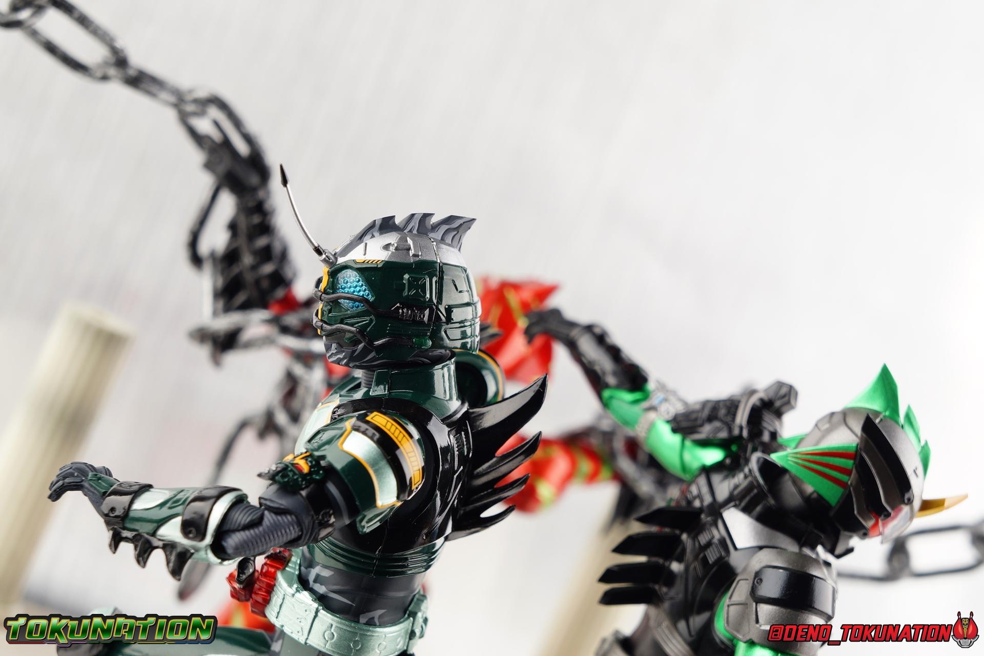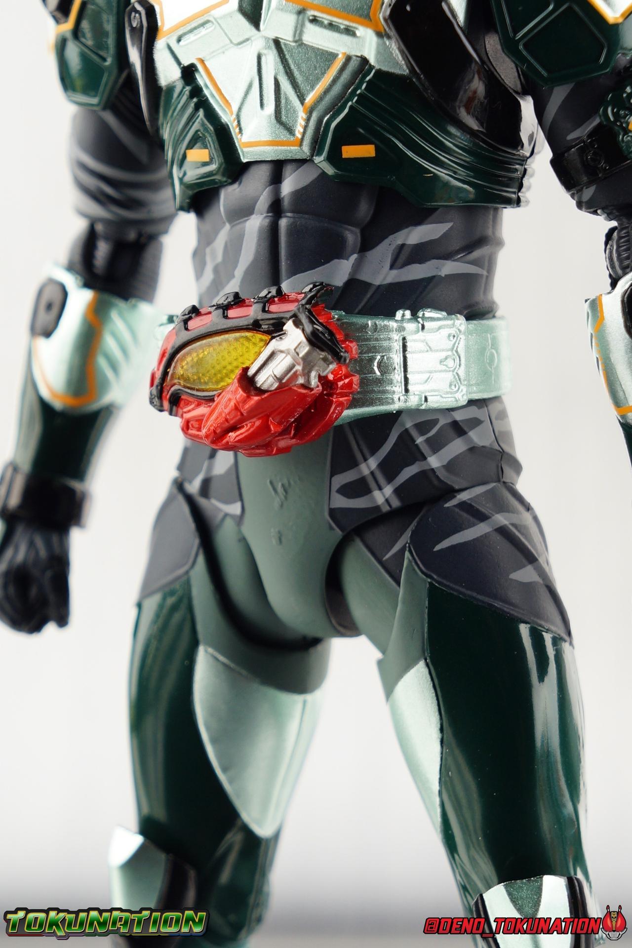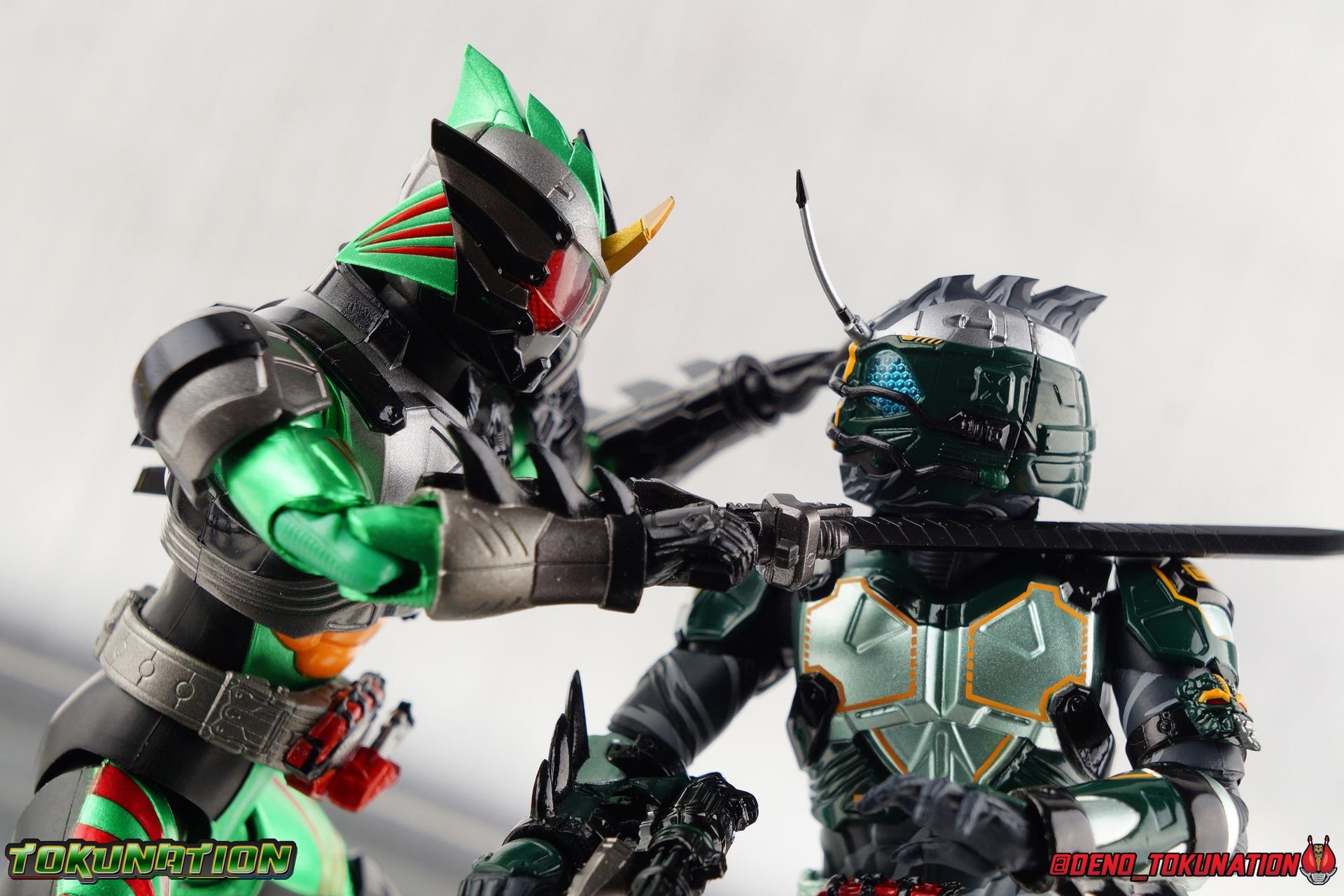 ** Spoilers for Amazons The Last Judgement abound in this review. Read at your own risk! Two years on from Neo's death, Omega is hunted. Haruka and Mizuki have barely escaped 4C when they cross paths with an unusual home for children and a man named Midou. Little do they know, this place is merely a buffet, but not for Amazons. For humans. A new terrifying iteration of the Sigma Project has been undertaken, and the discovery of what keeps it going, will shake Haruka to his core. As the hunters become the hunted, the man named Midou proclaims himself Neo Alpha, the one to surpass Jin Takayama and the original madness of the Amazon Cells. Packaging Just as the Amazons that preceded him, Neo Alpha comes in a pretty dark box with some great stock photos. Alpha's color scheme is pretty dark as well however so everything tends to blend together a lot unfortunately. As with regular Alpha, the name is spelled as "Alfa" on the box. In Jin/Alpha's case the name Alpha is relative to Haruka's Omega. Midou sees himself as the better version of Jin, hence his self naming as Neo Alpha. Regardless, it should be "Alpha" not "Alfa". It's just a bad romanization. Main Figure The end is nigh for the creatures known as Amazons. And sadly, it would seem the same can be said for their figuarts as well. As of the writing of this review, no further Amazons figures have been confirmed for release. In fact the only displayed prototypes seen since the dual reveal of Crow Amazon & Neo Alpha, were the Last Judgement Ver. Alpha & Omega. Neither of which have been seen for some time. So it's fitting that Neo Alpha ends the line as it currently stands, especially considering his well, violent, death. You're probably familiar with this figure already, that is if you own Amazon Neo. Neo was absolutely one of my favorite release in the Amazons line. It was a really great mold that changed things up from previous releases, and it helped that the design deviated to a more armored & cybernetic look. I also enjoyed how elements of the design were borrowed for New Omega. Neo Alpha takes the Neo mold and really militarizes the design. Which in the context of the film's story, makes so much sense when you think about the job Midou is tasked with. In the same way that Neo was decked out in some gorgeous metallic blue and brushed silver, a color scheme that really sold me on the figure, Neo Alpha sells me so hard with the finer details of the paint scheme. Using quite a few more paint applications than usual, Neo Alpha features 4 distinct shades of green both metallic and glossy. There's some bright yellow pin-striping that really offsets the varying greens and glossy blacks nicely as well. The best details however are the alternating gray camo stripes that cover the abdomen hips and arms. These bits are patterned the same way as Neo's red and blue, but the subtlety of the grays really works well with the various greens and yellows of the suit. The various Alpha & Omega releases, and to a lesser extent Sigma as well as Mole & Crow all had faults that irked me. But the Neo mold was a real winner to me. Unlike the others, most of the articulation is solidly intact with this design. Despite the bulk of the armor carried over to Neo Alpha, the figure is very free to move. The ankles are unobstructed so you can get nice solid balance from them. Their forward motion is limited only by the bottom of the shin armor, but not terribly so. The knees are really perfect. Unlike with Omega where the leg fins limited the legs to 90 degree angles, Neo Alpha is free to move because the shin armor can rotate the fins away from the back of the leg. I'm still not super in love with the drop down hips the two Neo's feature, but they aren't a huge detractor in their cases. Now this is a really odd thing for this figure, but more so the character in the film. Neo Alpha has the Neo Amazons Driver attached to his belt, with an Ampule molded into it just like New Omega & Neo. However, in The Last Judgement, Midou only uses his unique Amazons Register attached to the left arm to transform. In much the same way that Iyu/Crow did. Only using the driver to summon his weapon arm. I can only assume a Driver was incorporated into his design simply as a way to set him apart from standard Amazons and make him a rider like the other 4, and I can get that. But he's already a remold of the Neo suit in both mediums, so the Driver was unnecessary to communicate his rider-ness. It's just weird. The upper body is engineered in such a way that it allows you to arch the back up and lean him forward for really savage and animal like poses, though it does expose a gap on his back side when done. The arms are free of most obstruction thanks to some great shoulder pad design, swivel biceps, and rotating forearm guards. My only real gripe with the arms is that the fist pegs are a little tight, and the hands a little difficult to exchange, mostly on the left arm which features the unique Militant Amazons Register. Amazon Neo Alpha does however deviate from the original Neo in one big way, the head. Taking inspiration for this design from a monitor lizard, Neo Alpha has a much more elongated and pronounced head than his predecessor. The new sort of bucket style head features really pretty blue compound eyes, a first for Amazons, and also has some admittedly oddly placed face guards that seem to emulate a football helmet a bit. The most striking piece of the helmet is the very elongated and fragile horn. The figure is packaged sideways in box because of it. So just be careful. As you can see I've assembled all of the Amazons together in this gallery for a big family photo and some comparisons. There's a shot in there as well where you'll notice a silver Amazon Neo as well. Don't let me deceive you, that's not an official figure. It's a custom Amazon Neo Sigma that was made by @Gigabeetle and made it's way to me. I just wanted to give him a brief little spotlight because Neo Sigma is