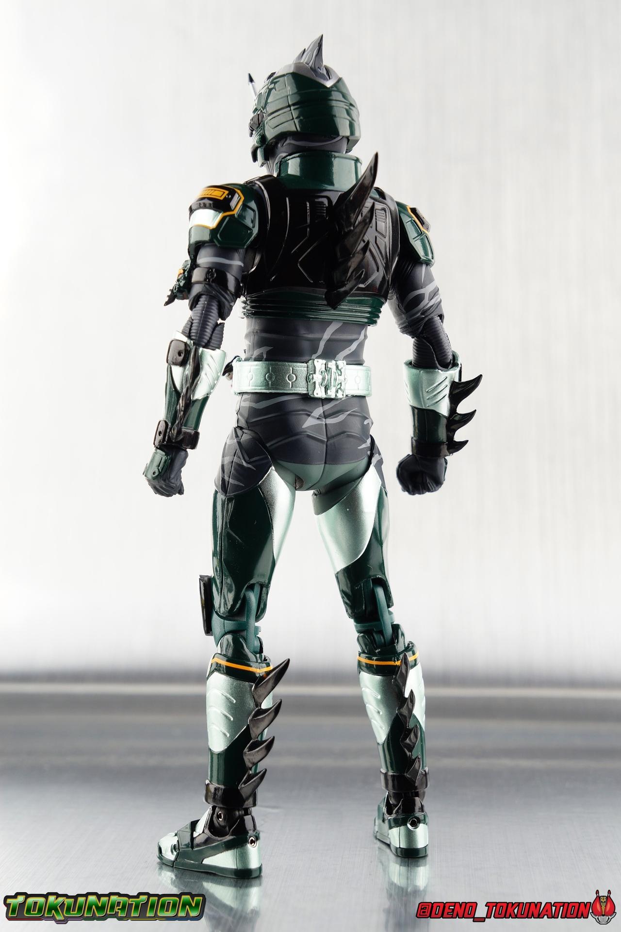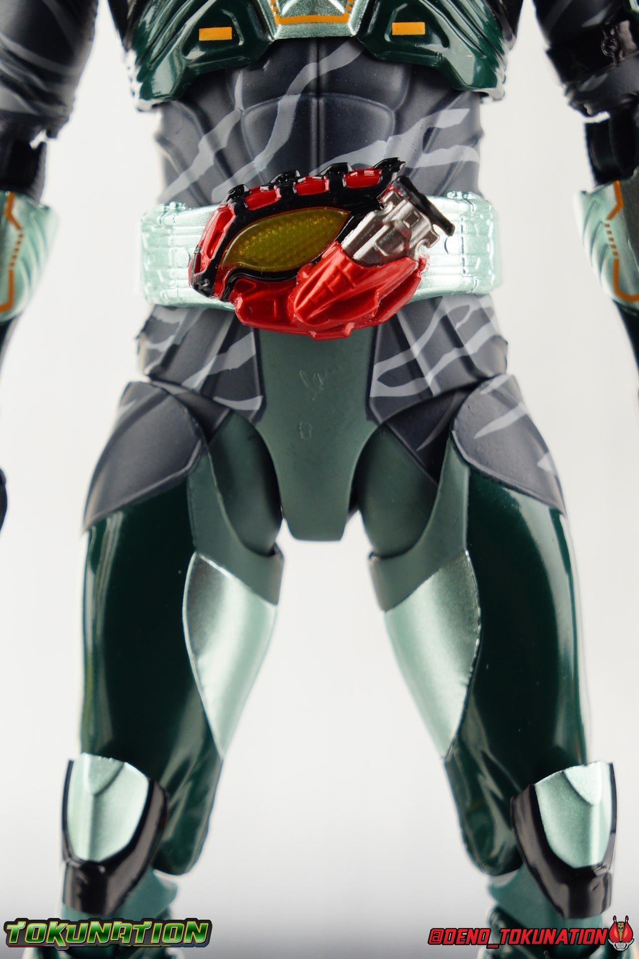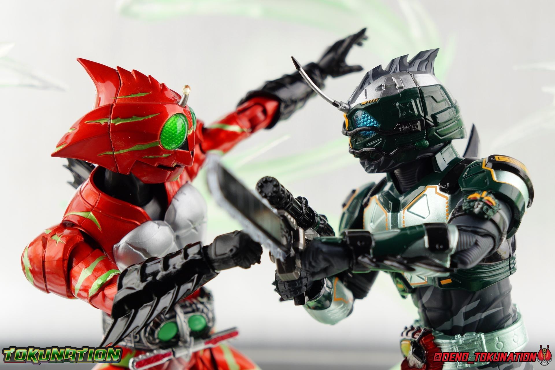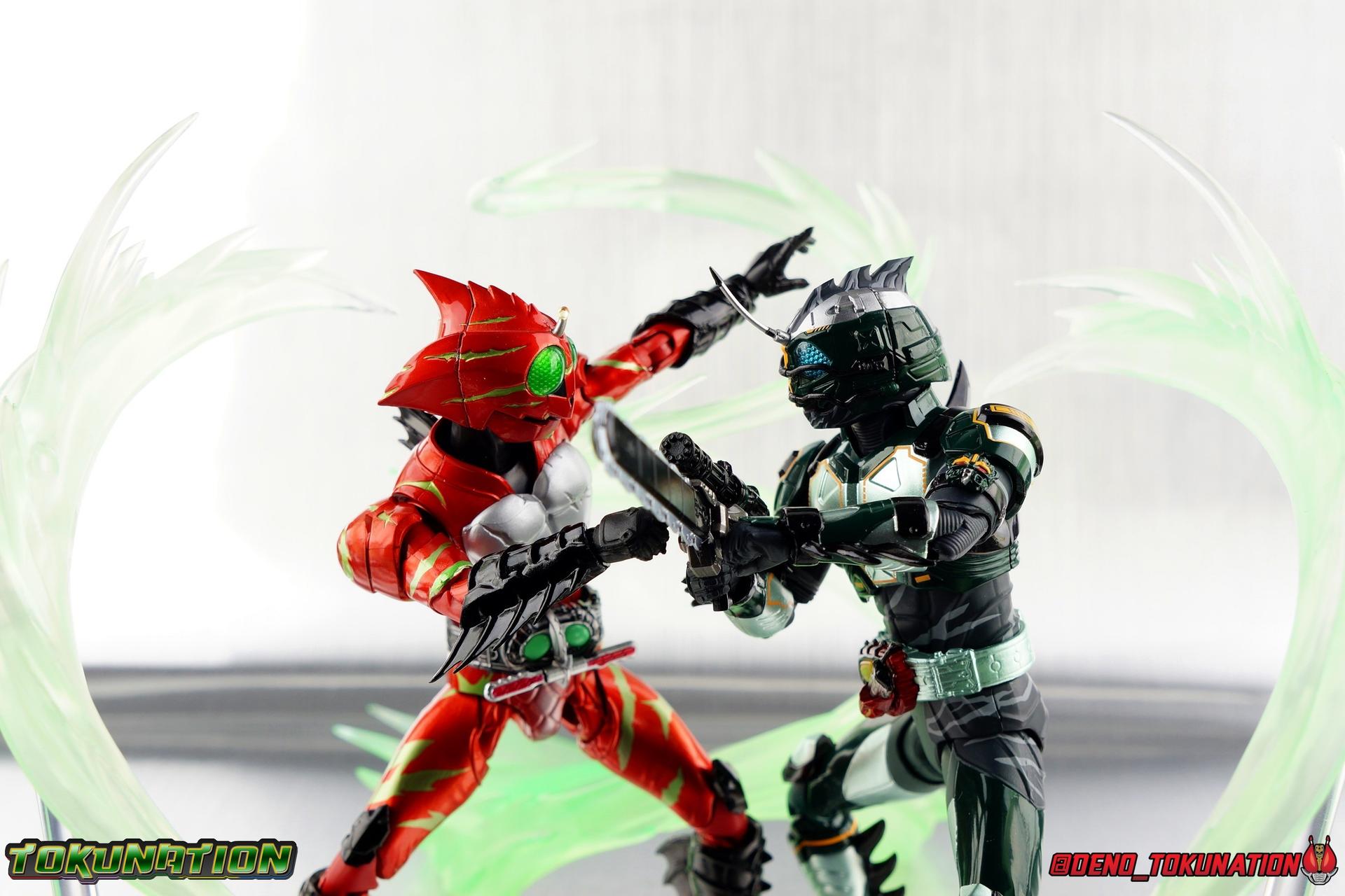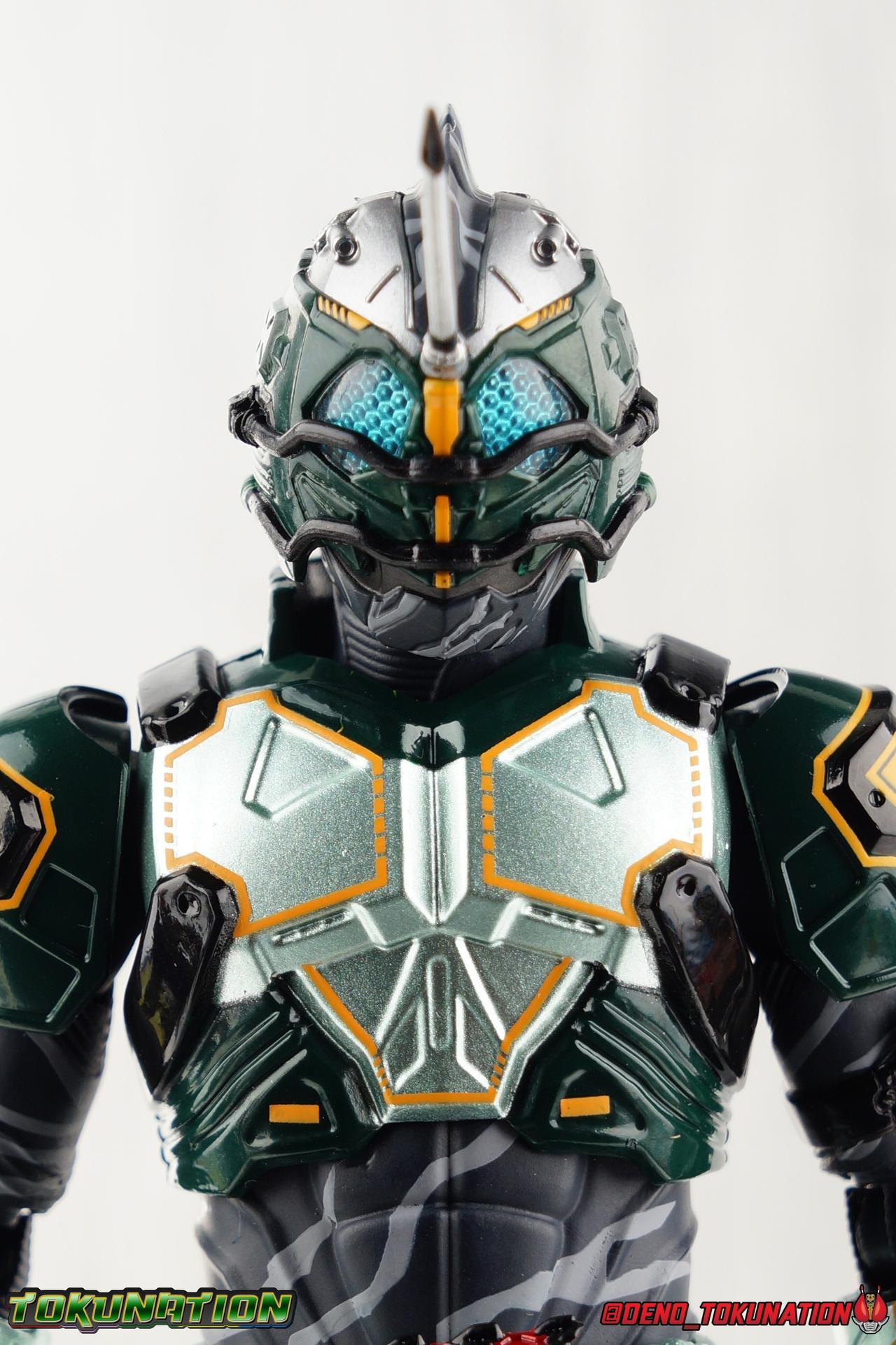 ** Spoilers for Amazons The Last Judgement abound in this review. Read at your own risk! Two years on from Neo's death, Omega is hunted. Haruka and Mizuki have barely escaped 4C when they cross paths with an unusual home for children and a man named Midou. Little do they know, this place is merely a buffet, but not for Amazons. For humans. A new terrifying iteration of the Sigma Project has been undertaken, and the discovery of what keeps it going, will shake Haruka to his core. As the hunters become the hunted, the man named Midou proclaims himself Neo Alpha, the one to surpass Jin Takayama and the original madness of the Amazon Cells. Packaging Just as the Amazons that preceded him, Neo Alpha comes in a pretty dark box with some great stock photos. Alpha's color scheme is pretty dark as well however so everything tends to blend together a lot unfortunately. As with regular Alpha, the name is spelled as "Alfa" on the box. In Jin/Alpha's case the name Alpha is relative to Haruka's Omega. Midou sees himself as the better version of Jin, hence his self naming as Neo Alpha. Regardless, it should be "Alpha" not "Alfa". It's just a bad romanization. Main Figure The end is nigh for the creatures known as Amazons. And sadly, it would seem the same can be said for their figuarts as well. As of the writing of this review, no further Amazons figures have been confirmed for release. In fact the only displayed prototypes seen since the dual reveal of Crow Amazon & Neo Alpha, were the Last Judgement Ver. Alpha & Omega. Neither of which have been seen for some time. So it's fitting that Neo Alpha ends the line as it currently stands, especially considering his well, violent, death. You're probably familiar with this figure already, that is if you own Amazon Neo. Neo was absolutely one of my favorite release in the Amazons line. It was a really great mold that changed things up from previous releases, and it helped that the design deviated to a more armored & cybernetic look. I also enjoyed how elements of the design were borrowed for New Omega. Neo Alpha takes the Neo mold and really militarizes the design. Which in the context of the film's story, makes so much sense when you think about the job Midou is tasked with. In the same way that Neo was decked out in some gorgeous metallic blue and brushed silver, a color scheme that really sold me on the figure, Neo Alpha sells me so hard with the finer details of the paint scheme. Using quite a few more paint applications than usual, Neo Alpha features 4 distinct shades of green both metallic and glossy. There's some bright yellow pin-striping that really offsets the varying greens and glossy blacks nicely as well. The best details however are the alternating gray camo stripes that cover the abdomen hips and arms. These bits are patterned the same way as Neo's red and blue, but the subtlety of the grays really works well with the various greens and yellows of the suit. The various Alpha & Omega releases, and to a lesser extent Sigma as well as Mole & Crow all had faults that irked me. But the Neo mold was a real winner to me. Unlike the others, most of the articulation is solidly intact with this design. Despite the bulk of the armor carried over to Neo Alpha, the figure is very free to move. The ankles are unobstructed so you can get nice solid balance from them. Their forward motion is limited only by the bottom of the shin armor, but not terribly so. The knees are really perfect. Unlike with Omega where the leg fins limited the legs to 90 degree angles, Neo Alpha is free to move because the shin armor can rotate the fins away from the back of the leg. I'm still not super in love with the drop down hips the two Neo's feature, but they aren't a huge detractor in their cases. Now this is a really odd thing for this figure, but more so the character in the film. Neo Alpha has the Neo Amazons Driver attached to his belt, with an Ampule molded into it just like New Omega & Neo. However, in The Last Judgement, Midou only uses his unique Amazons Register attached to the left arm to transform. In much the same way that Iyu/Crow did. Only using the driver to summon his weapon arm. I can only assume a Driver was incorporated into his design simply as a way to set him apart from standard Amazons and make him a rider like the other 4, and I can get that. But he's already a remold of the Neo suit in both mediums, so the Driver was unnecessary to communicate his rider-ness. It's just weird. The upper body is engineered in such a way that it allows you to arch the back up and lean him forward for really savage and animal like poses, though it does expose a gap on his back side when done. The arms are free of most obstruction thanks to some great shoulder pad design, swivel biceps, and rotating forearm guards. My only real gripe with the arms is that the fist pegs are a little tight, and the hands a little difficult to exchange, mostly on the left arm which features the unique Militant Amazons Register. Amazon Neo Alpha does however deviate from the original Neo in one big way, the head. Taking inspiration for this design from a monitor lizard, Neo Alpha has a much more elongated and pronounced head than his predecessor. The new sort of bucket style head features really pretty blue compound eyes, a first for Amazons, and also has some admittedly oddly placed face guards that seem to emulate a football helmet a bit. The most striking piece of the helmet is the very elongated and fragile horn. The figure is packaged sideways in box because of it. So just be careful. As you can see I've assembled all of the Amazons together in this gallery for a big family photo and some comparisons. There's a shot in there as well where you'll notice a silver Amazon Neo as well. Don't let me deceive you, that's not an official figure. It's a custom Amazon Neo Sigma that was made by @Gigabeetle and made it's way to me. I just wanted to give him a brief little spotlight because Neo Sigma is