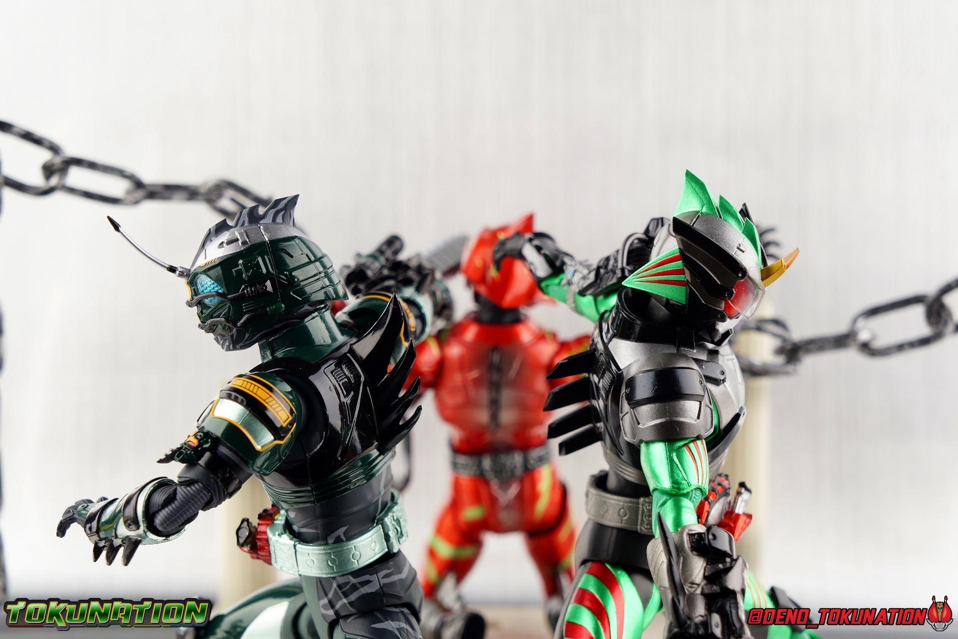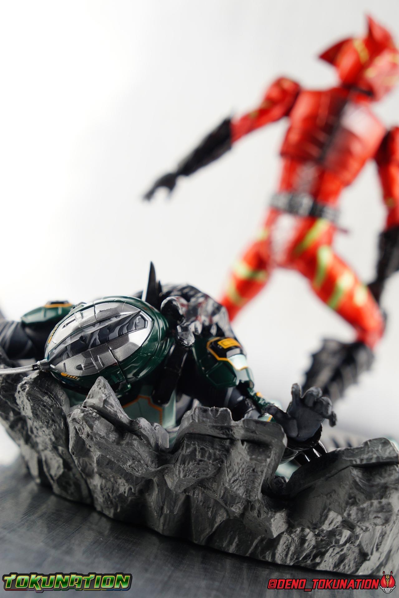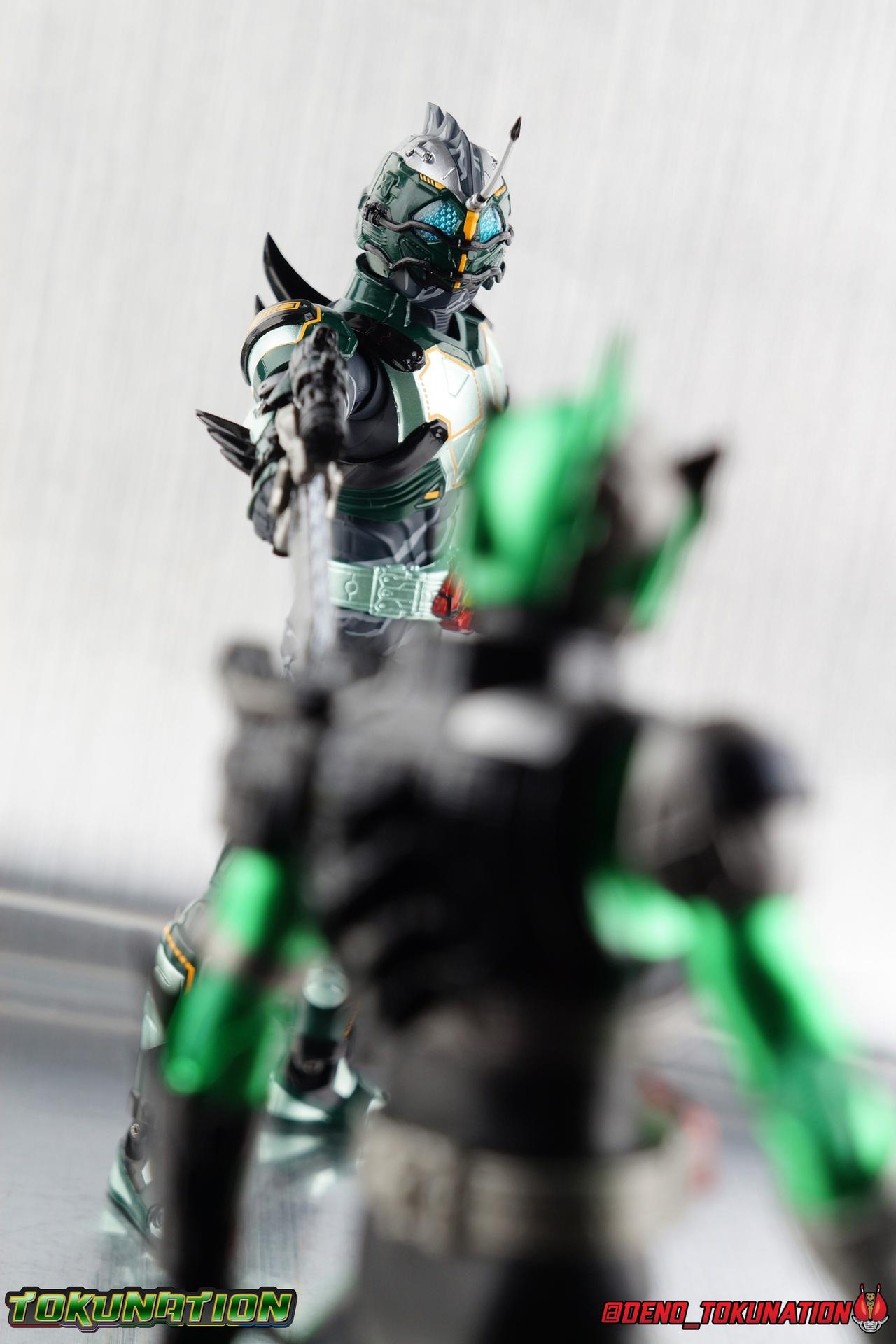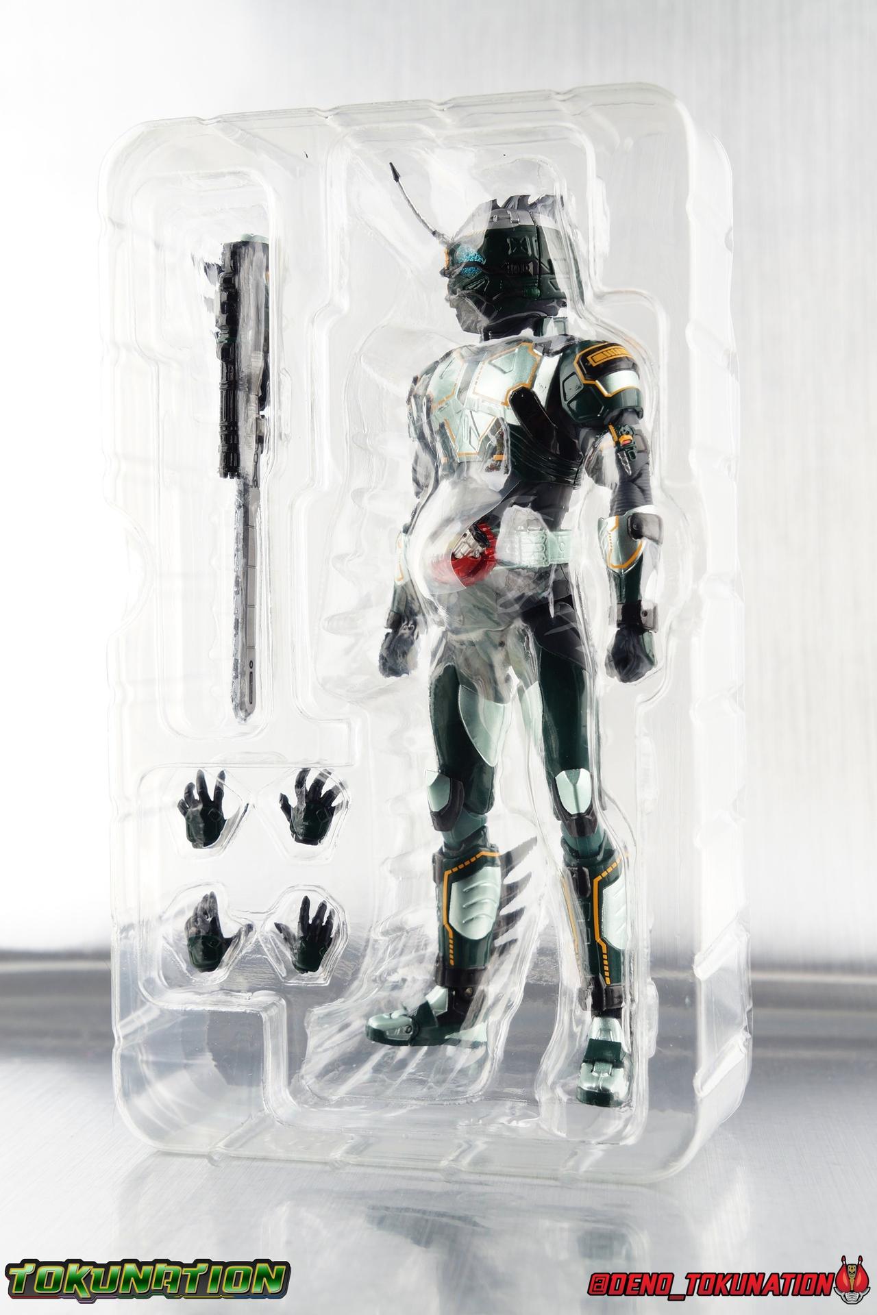 ** Spoilers for Amazons The Last Judgement abound in this review. Read at your own risk! Two years on from Neo's death, Omega is hunted. Haruka and Mizuki have barely escaped 4C when they cross paths with an unusual home for children and a man named Midou. Little do they know, this place is merely a buffet, but not for Amazons. For humans. A new terrifying iteration of the Sigma Project has been undertaken, and the discovery of what keeps it going, will shake Haruka to his core. As the hunters become the hunted, the man named Midou proclaims himself Neo Alpha, the one to surpass Jin Takayama and the original madness of the Amazon Cells. Packaging Just as the Amazons that preceded him, Neo Alpha comes in a pretty dark box with some great stock photos. Alpha's color scheme is pretty dark as well however so everything tends to blend together a lot unfortunately. As with regular Alpha, the name is spelled as "Alfa" on the box. In Jin/Alpha's case the name Alpha is relative to Haruka's Omega. Midou sees himself as the better version of Jin, hence his self naming as Neo Alpha. Regardless, it should be "Alpha" not "Alfa". It's just a bad romanization. Main Figure The end is nigh for the creatures known as Amazons. And sadly, it would seem the same can be said for their figuarts as well. As of the writing of this review, no further Amazons figures have been confirmed for release. In fact the only displayed prototypes seen since the dual reveal of Crow Amazon & Neo Alpha, were the Last Judgement Ver. Alpha & Omega. Neither of which have been seen for some time. So it's fitting that Neo Alpha ends the line as it currently stands, especially considering his well, violent, death. You're probably familiar with this figure already, that is if you own Amazon Neo. Neo was absolutely one of my favorite release in the Amazons line. It was a really great mold that changed things up from previous releases, and it helped that the design deviated to a more armored & cybernetic look. I also enjoyed how elements of the design were borrowed for New Omega. Neo Alpha takes the Neo mold and really militarizes the design. Which in the context of the film's story, makes so much sense when you think about the job Midou is tasked with. In the same way that Neo was decked out in some gorgeous metallic blue and brushed silver, a color scheme that really sold me on the figure, Neo Alpha sells me so hard with the finer details of the paint scheme. Using quite a few more paint applications than usual, Neo Alpha features 4 distinct shades of green both metallic and glossy. There's some bright yellow pin-striping that really offsets the varying greens and glossy blacks nicely as well. The best details however are the alternating gray camo stripes that cover the abdomen hips and arms. These bits are patterned the same way as Neo's red and blue, but the subtlety of the grays really works well with the various greens and yellows of the suit. The various Alpha & Omega releases, and to a lesser extent Sigma as well as Mole & Crow all had faults that irked me. But the Neo mold was a real winner to me. Unlike the others, most of the articulation is solidly intact with this design. Despite the bulk of the armor carried over to Neo Alpha, the figure is very free to move. The ankles are unobstructed so you can get nice solid balance from them. Their forward motion is limited only by the bottom of the shin armor, but not terribly so. The knees are really perfect. Unlike with Omega where the leg fins limited the legs to 90 degree angles, Neo Alpha is free to move because the shin armor can rotate the fins away from the back of the leg. I'm still not super in love with the drop down hips the two Neo's feature, but they aren't a huge detractor in their cases. Now this is a really odd thing for this figure, but more so the character in the film. Neo Alpha has the Neo Amazons Driver attached to his belt, with an Ampule molded into it just like New Omega & Neo. However, in The Last Judgement, Midou only uses his unique Amazons Register attached to the left arm to transform. In much the same way that Iyu/Crow did. Only using the driver to summon his weapon arm. I can only assume a Driver was incorporated into his design simply as a way to set him apart from standard Amazons and make him a rider like the other 4, and I can get that. But he's already a remold of the Neo suit in both mediums, so the Driver was unnecessary to communicate his rider-ness. It's just weird. The upper body is engineered in such a way that it allows you to arch the back up and lean him forward for really savage and animal like poses, though it does expose a gap on his back side when done. The arms are free of most obstruction thanks to some great shoulder pad design, swivel biceps, and rotating forearm guards. My only real gripe with the arms is that the fist pegs are a little tight, and the hands a little difficult to exchange, mostly on the left arm which features the unique Militant Amazons Register. Amazon Neo Alpha does however deviate from the original Neo in one big way, the head. Taking inspiration for this design from a monitor lizard, Neo Alpha has a much more elongated and pronounced head than his predecessor. The new sort of bucket style head features really pretty blue compound eyes, a first for Amazons, and also has some admittedly oddly placed face guards that seem to emulate a football helmet a bit. The most striking piece of the helmet is the very elongated and fragile horn. The figure is packaged sideways in box because of it. So just be careful. As you can see I've assembled all of the Amazons together in this gallery for a big family photo and some comparisons. There's a shot in there as well where you'll notice a silver Amazon Neo as well. Don't let me deceive you, that's not an official figure. It's a custom Amazon Neo Sigma that was made by @Gigabeetle and made it's way to me. I just wanted to give him a brief little spotlight because Neo Sigma is